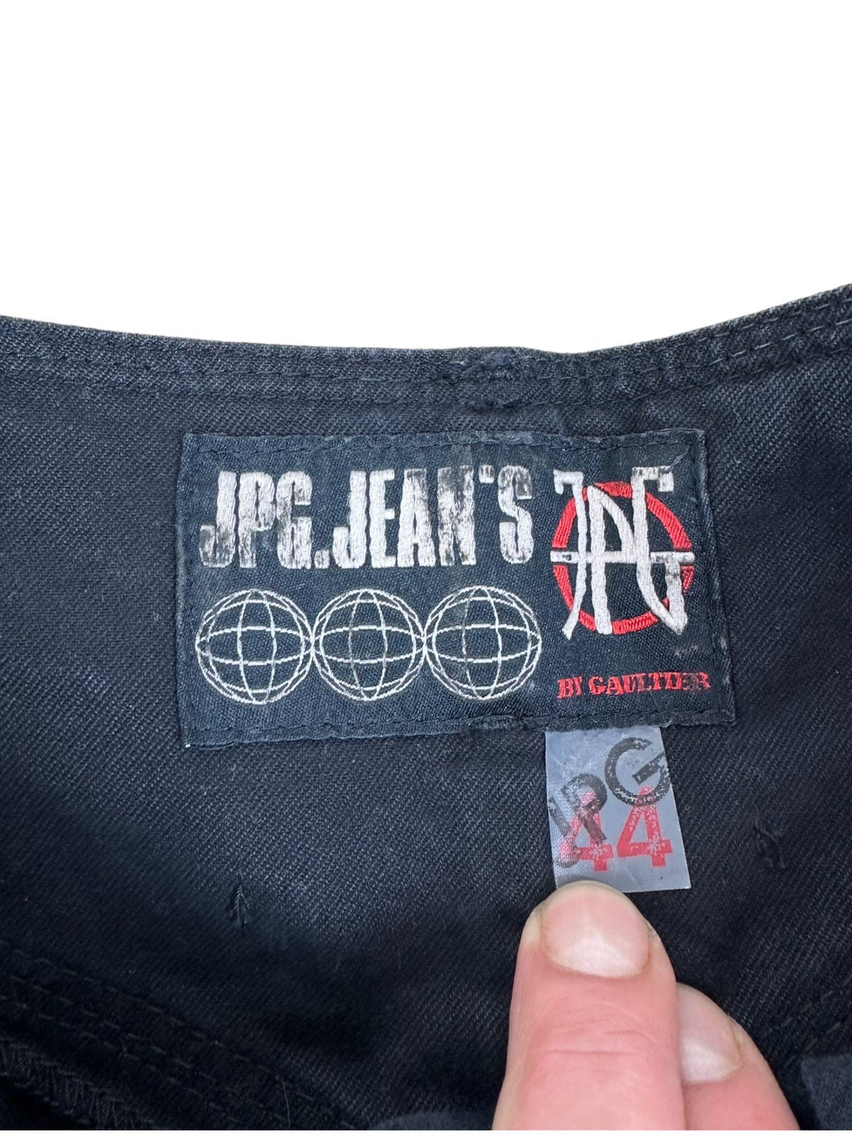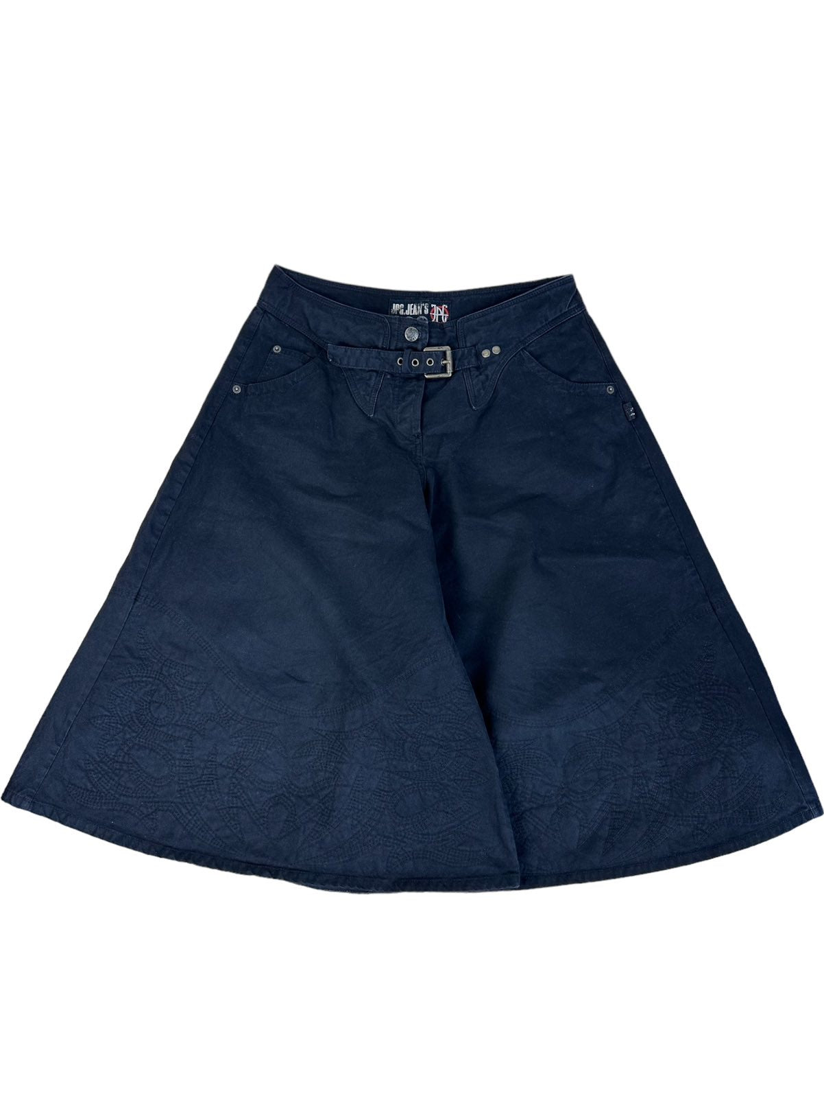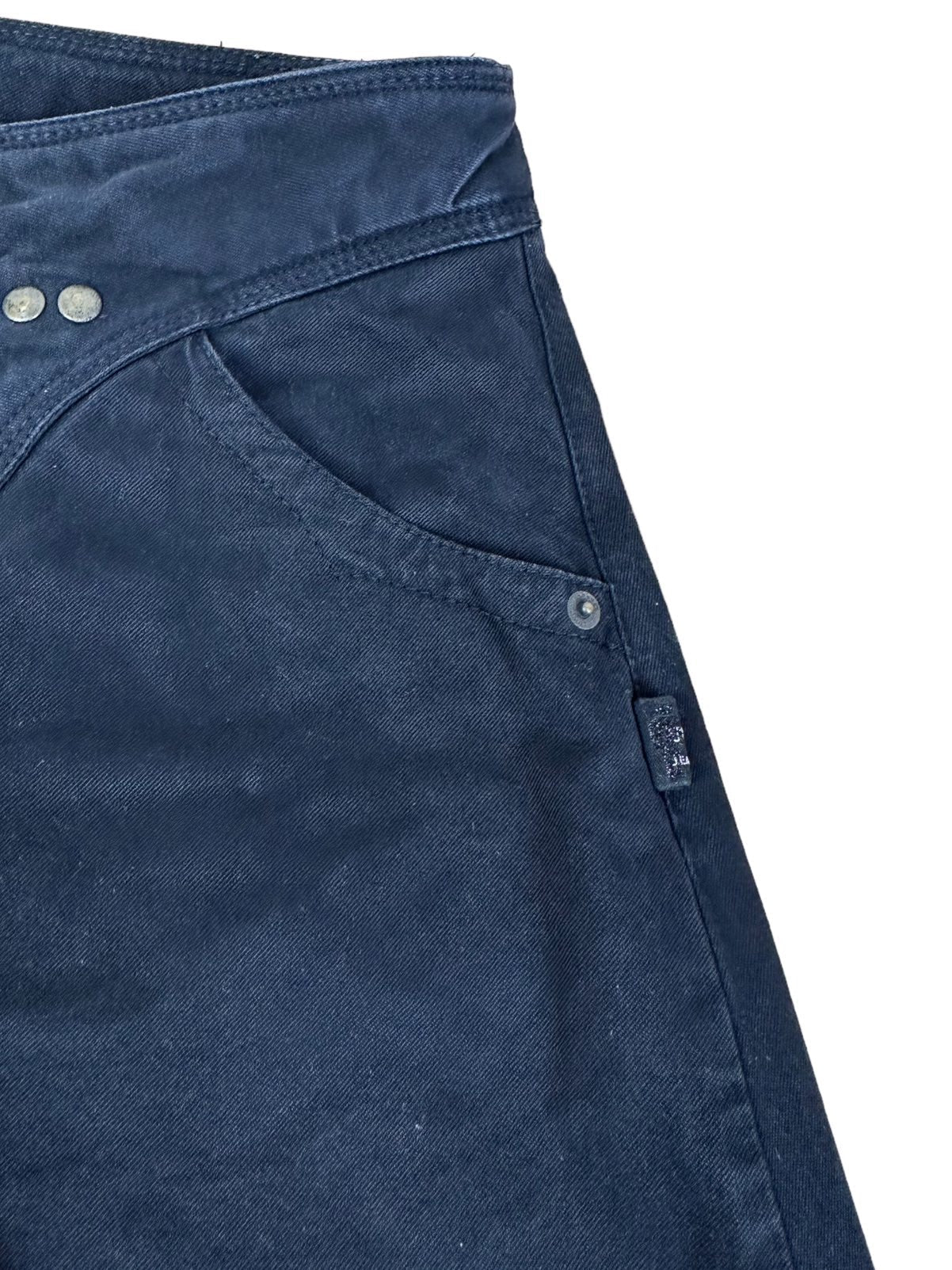Jean Paul Gaultier jeans gonna pantalone vintage in denim nero a vita bassa con chiusura a bottoni in metallo sul davanti e fibbia applicata. Ricamo tono su tono sulla larghezza del profilo finale. Tg.44