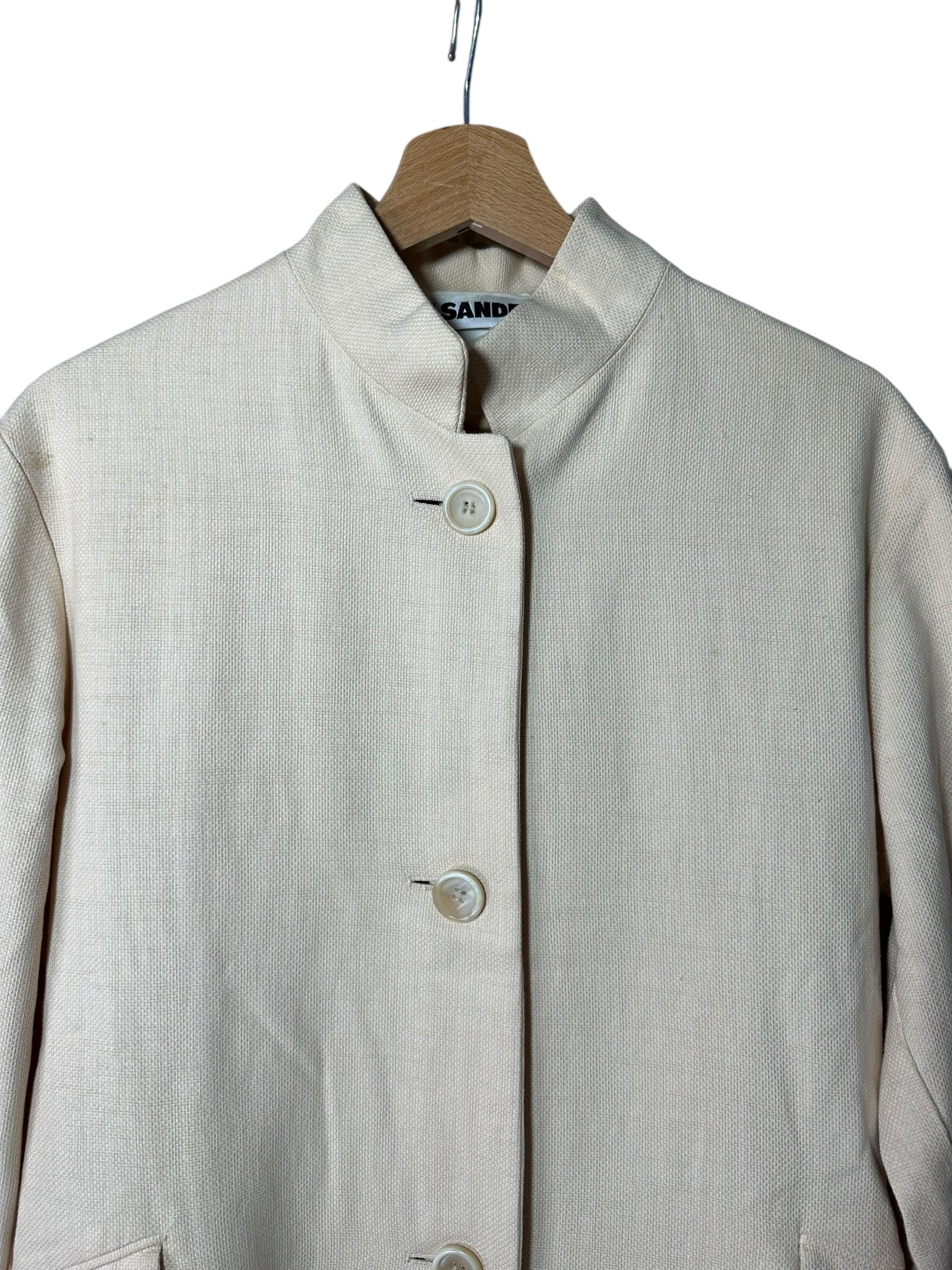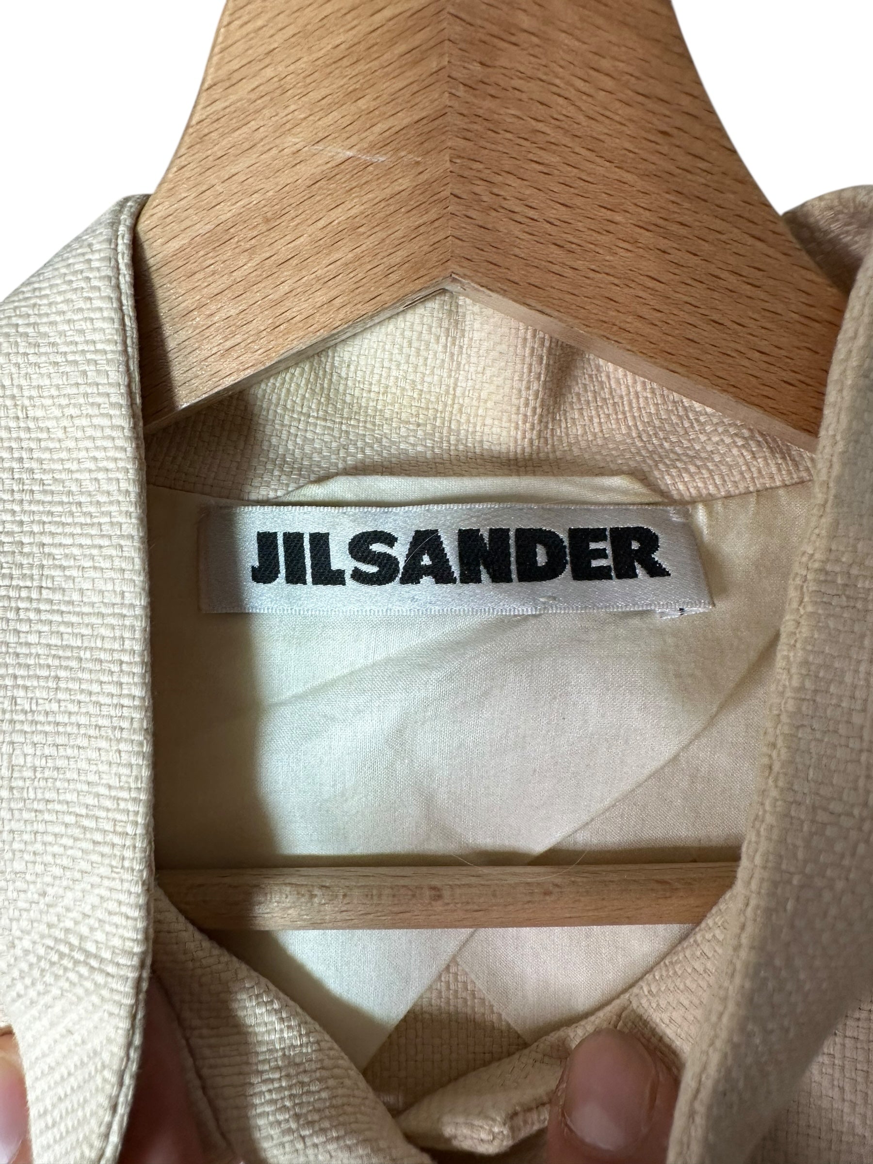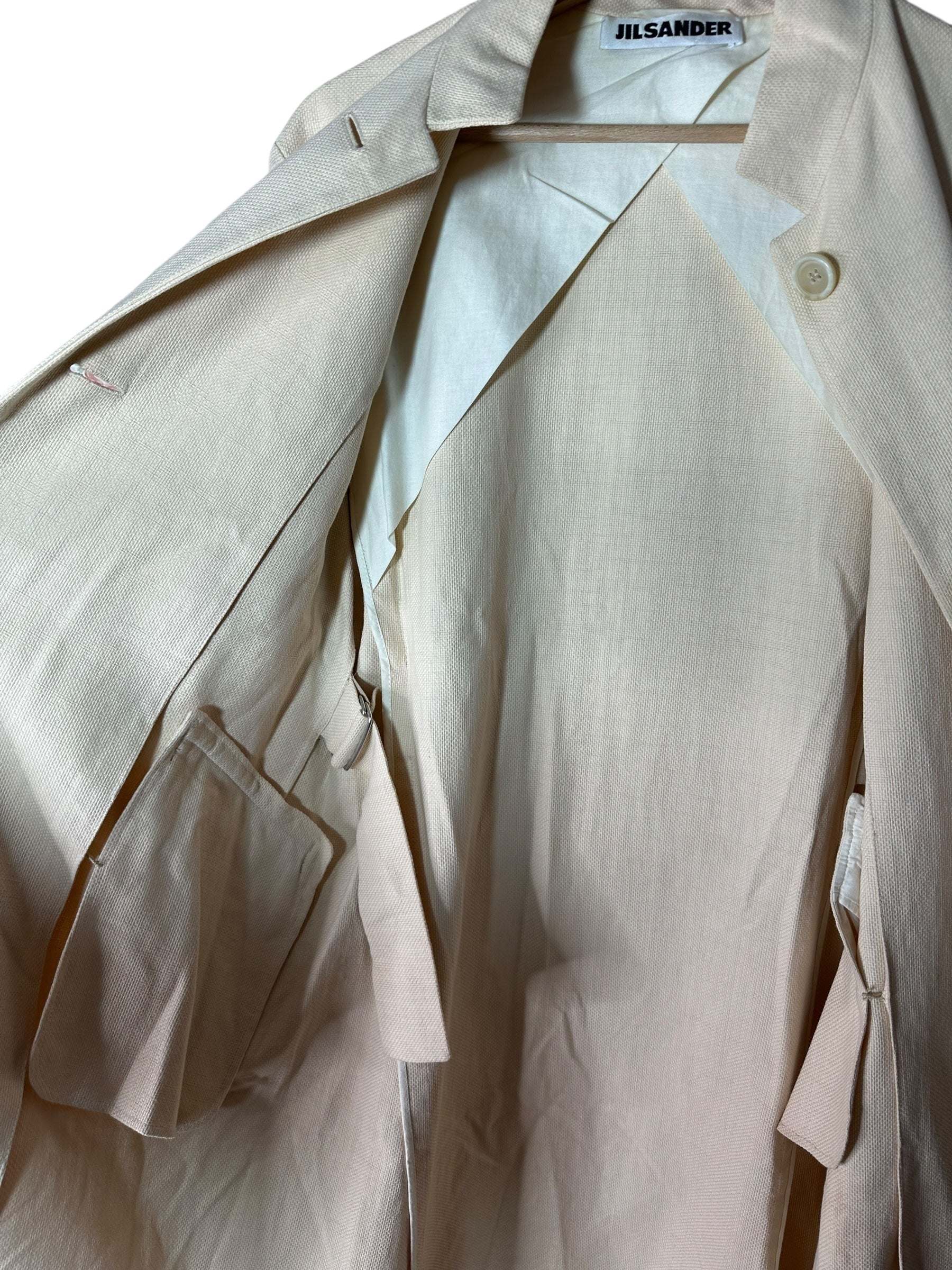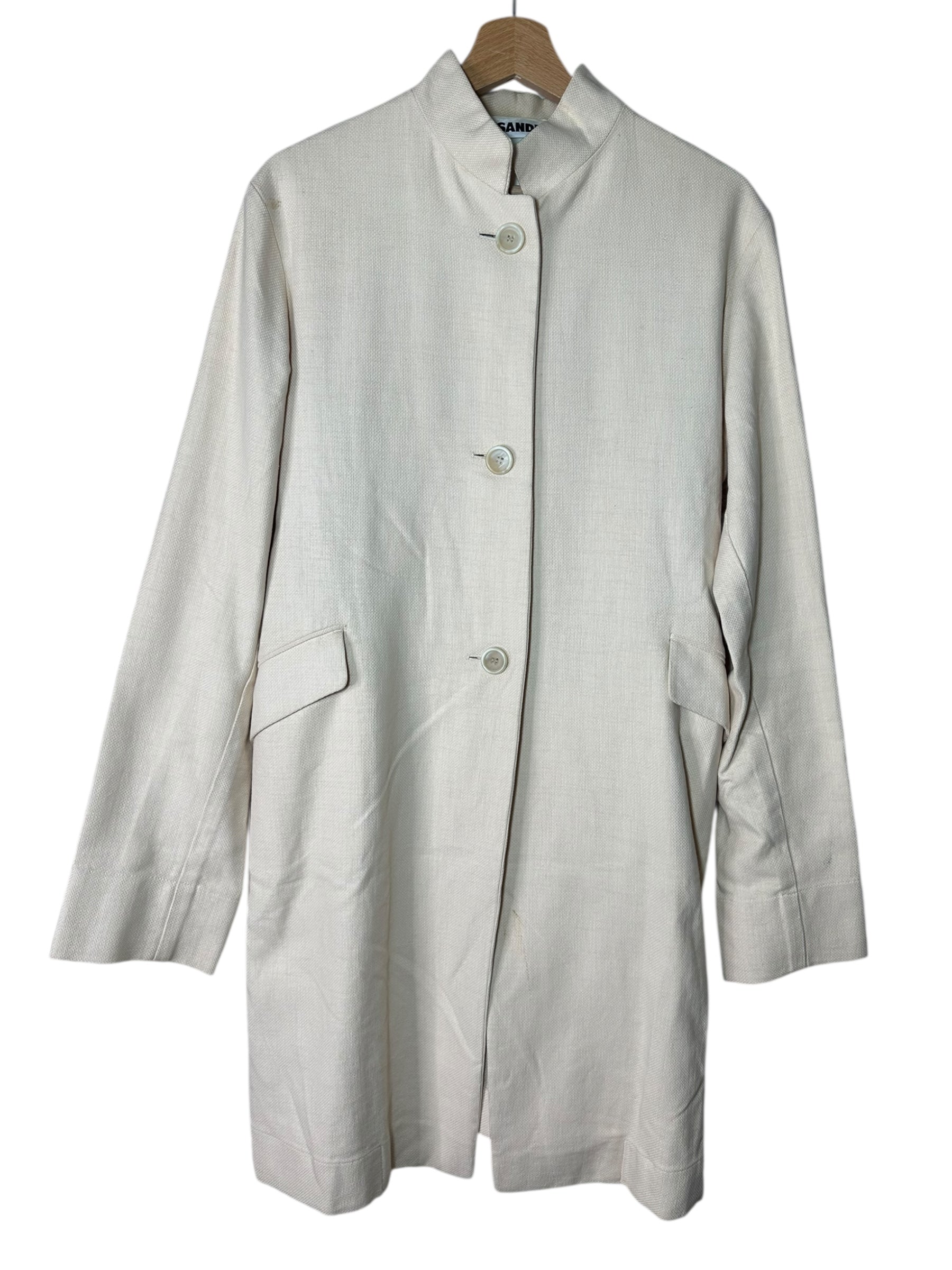 Cappottino firmato Jil Sander, realizzato in un raffinato tessuto strutturato color panna, dalla linea minimalista e rigorosa tipica della maison. Il modello è caratterizzato da una silhouette dritta, colletto alla coreana e chiusura frontale con tre bottoni. Le due ampie tasche frontali a pattina e la cintura interna regolabile con fibbia metallica valorizzano la funzionalità del capo, completato da una fodera tono su tono.