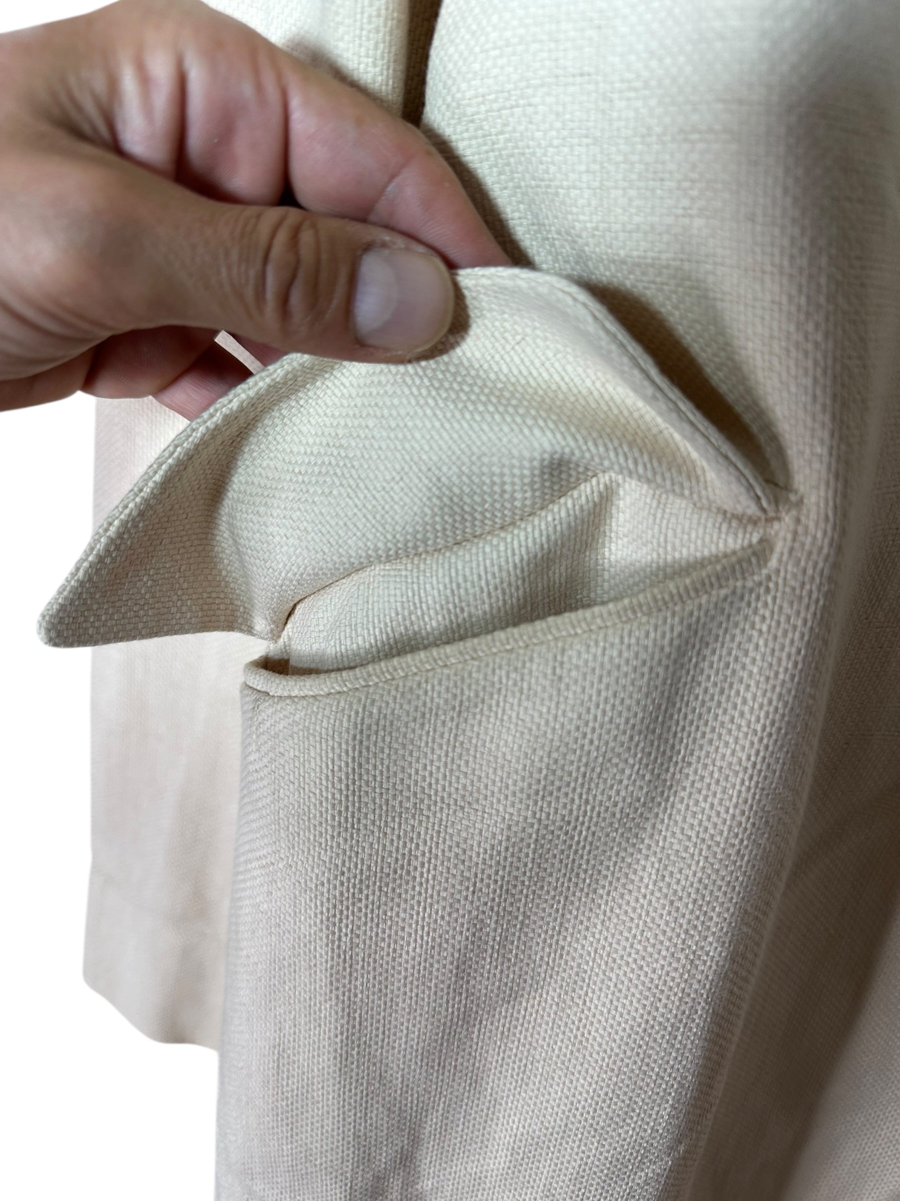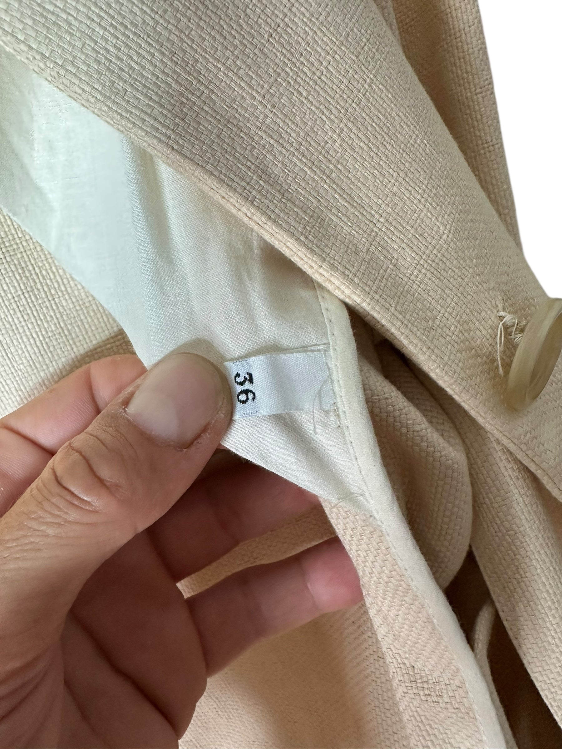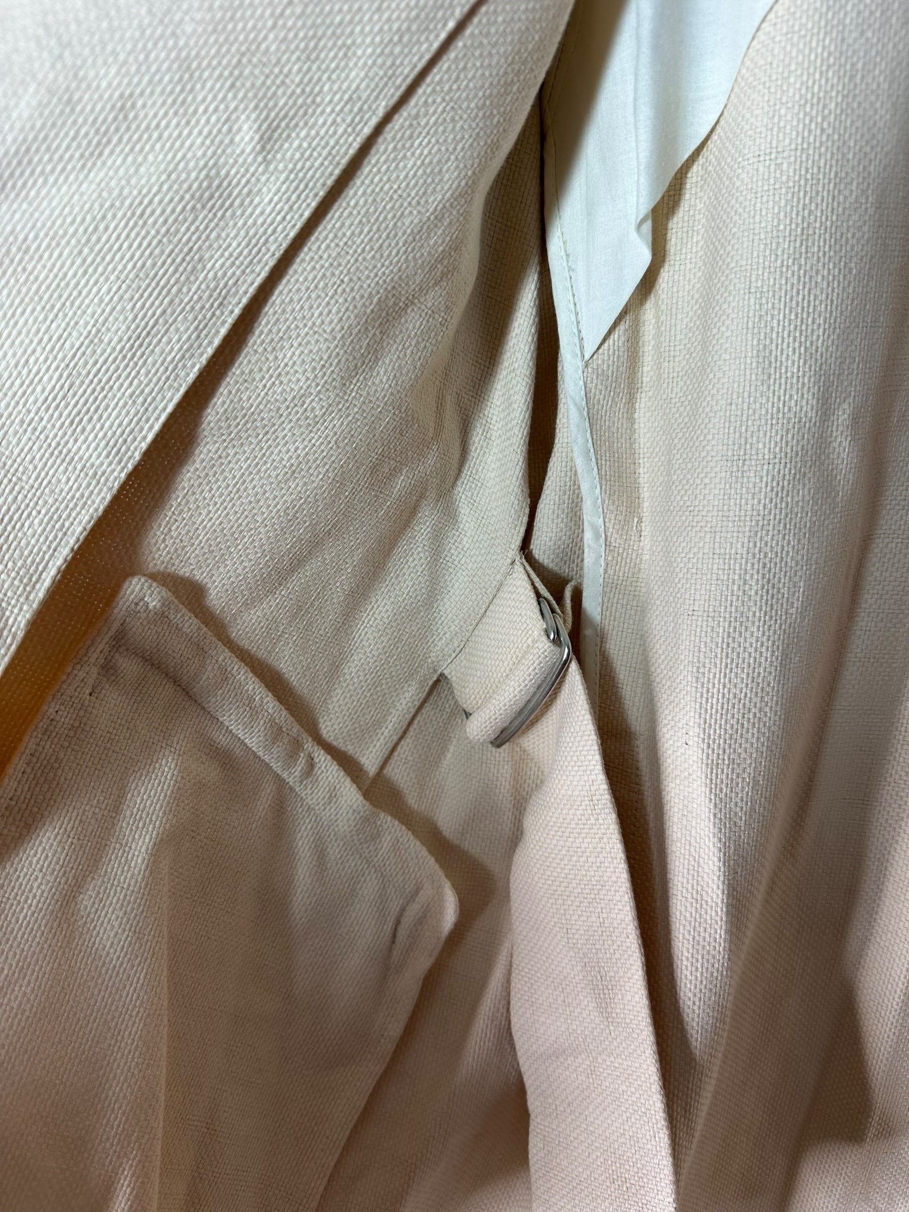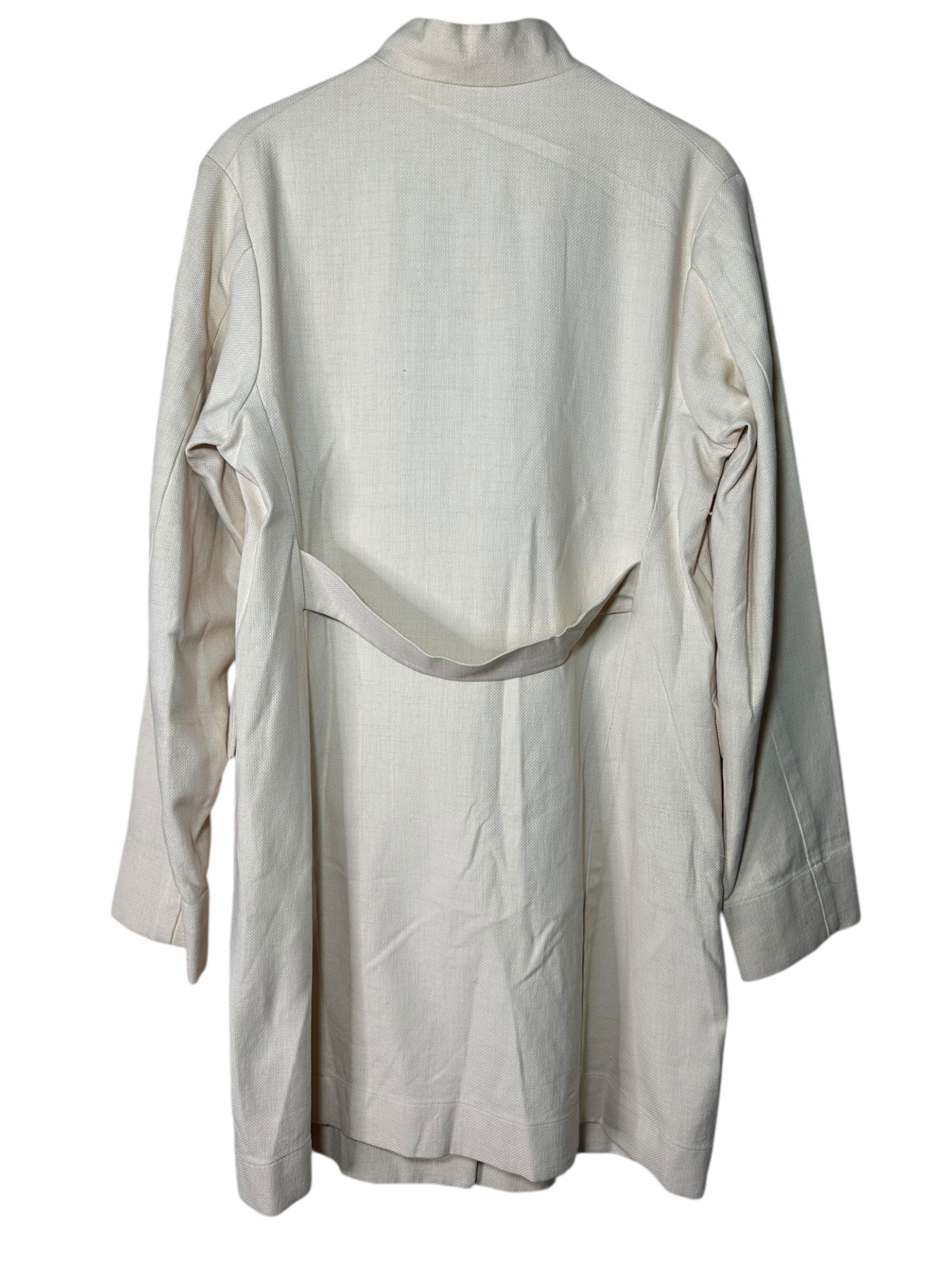 Cappottino firmato Jil Sander, realizzato in un raffinato tessuto strutturato color panna, dalla linea minimalista e rigorosa tipica della maison. Il modello è caratterizzato da una silhouette dritta, colletto alla coreana e chiusura frontale con tre bottoni. Le due ampie tasche frontali a pattina e la cintura interna regolabile con fibbia metallica valorizzano la funzionalità del capo, completato da una fodera tono su tono.