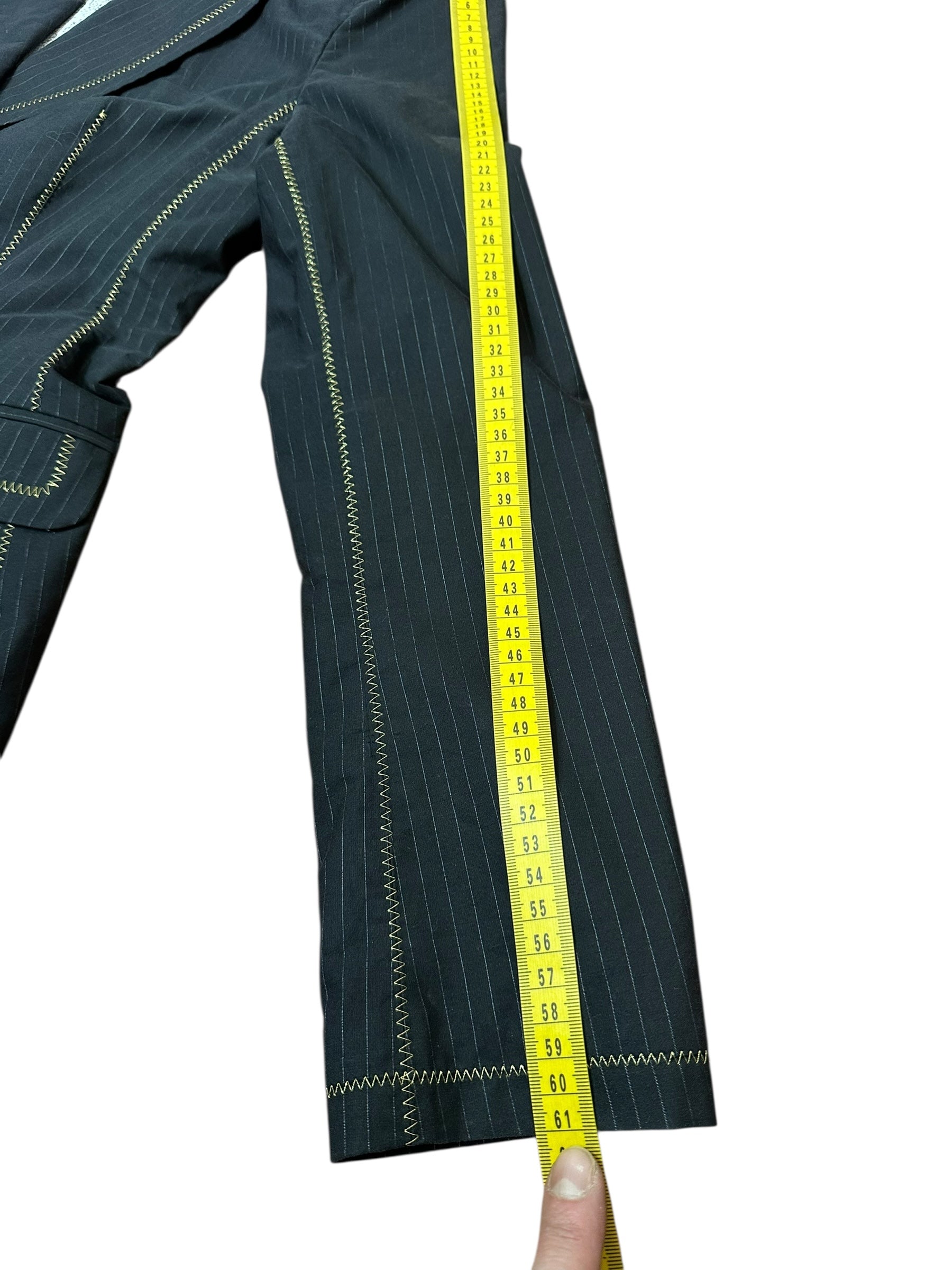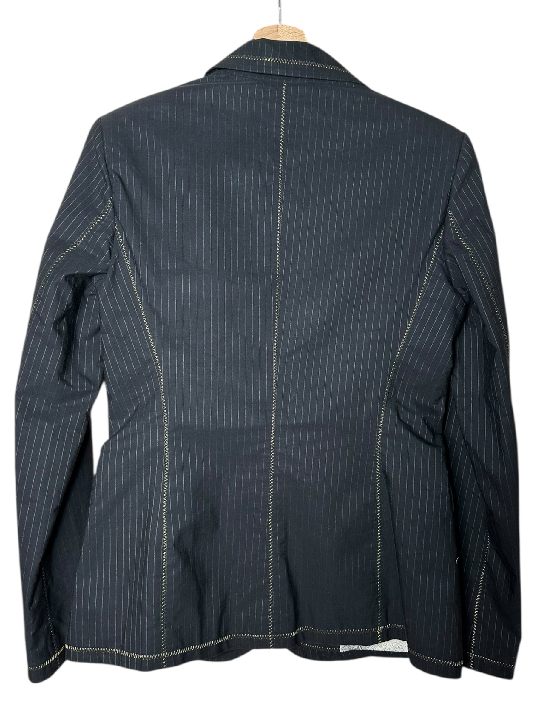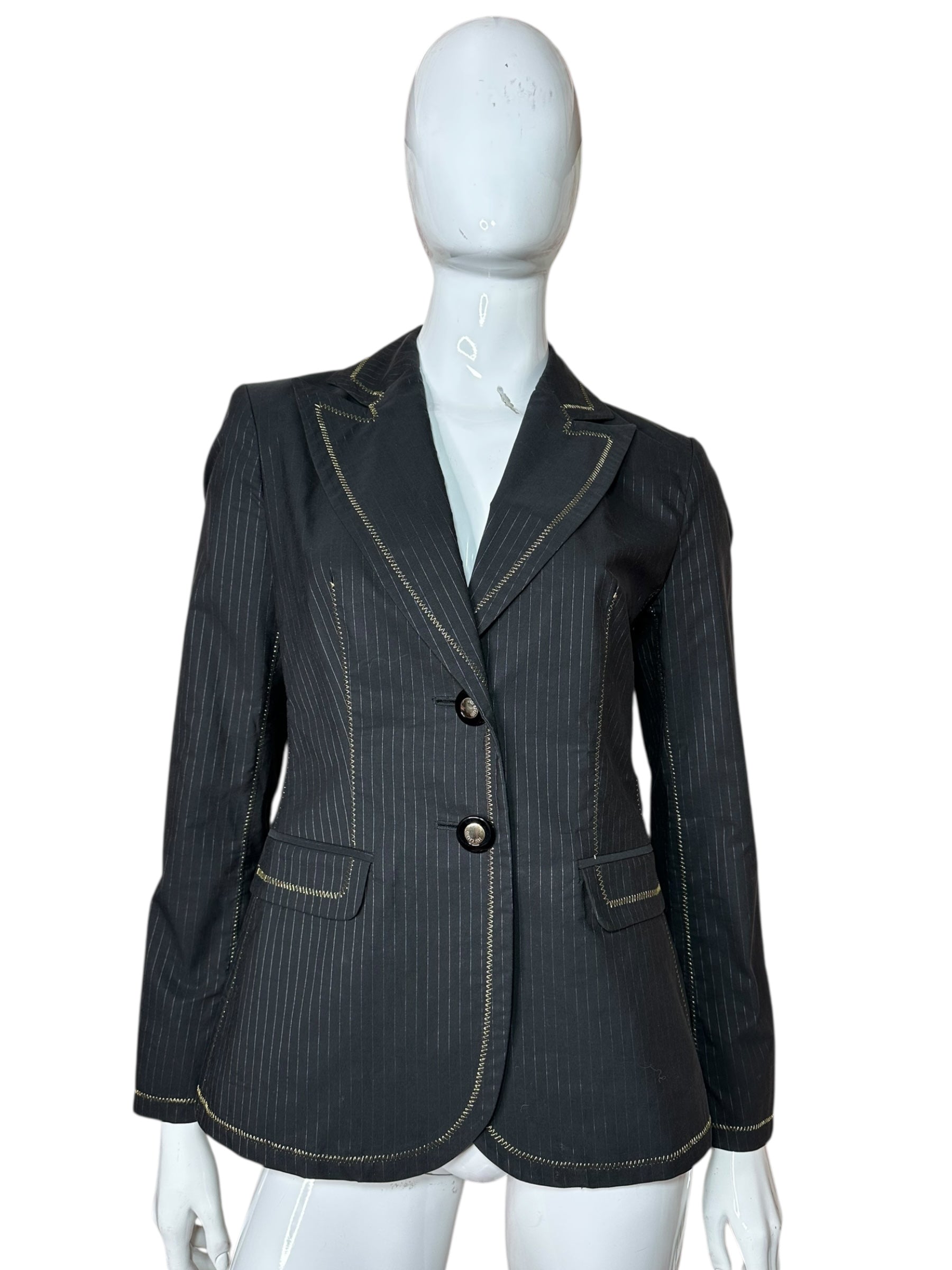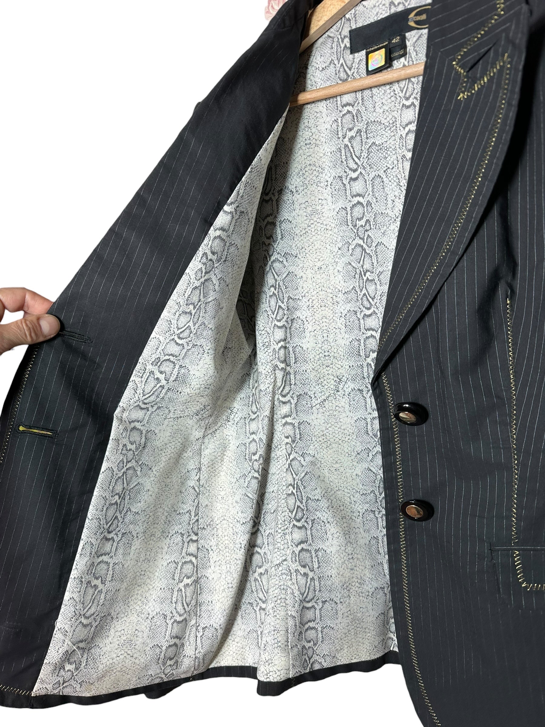 Blazer vintage firmato Just Cavalli, caratterizzato da elegante fantasia gessata su fondo scuro e da distintive cuciture decorative a contrasto che definiscono e valorizzano la struttura del capo. Modello dalla linea femminile e leggermente sagomata, con rever classico, chiusura frontale con bottoni logati Just Cavalli e tasche anteriori con patta.
