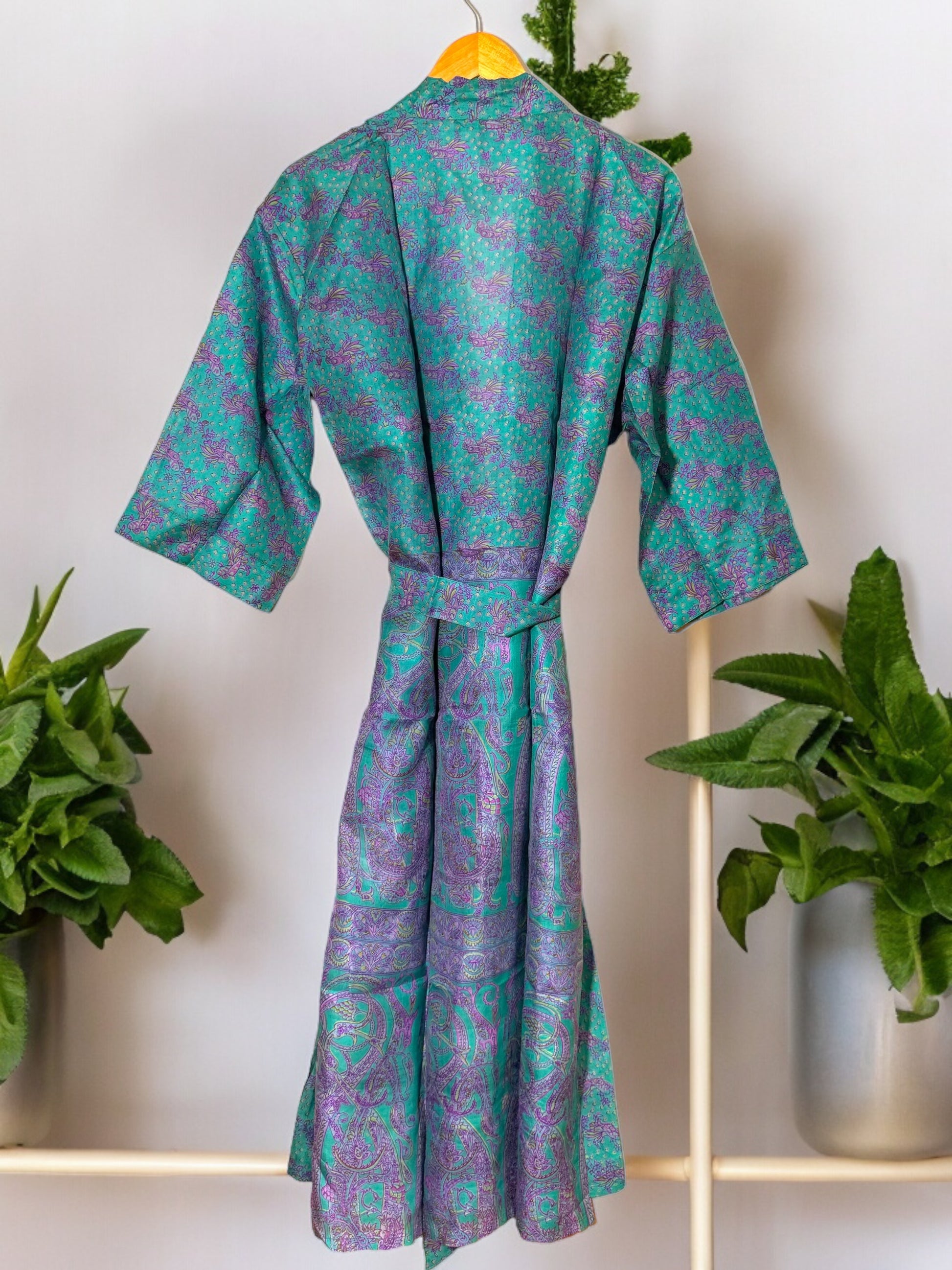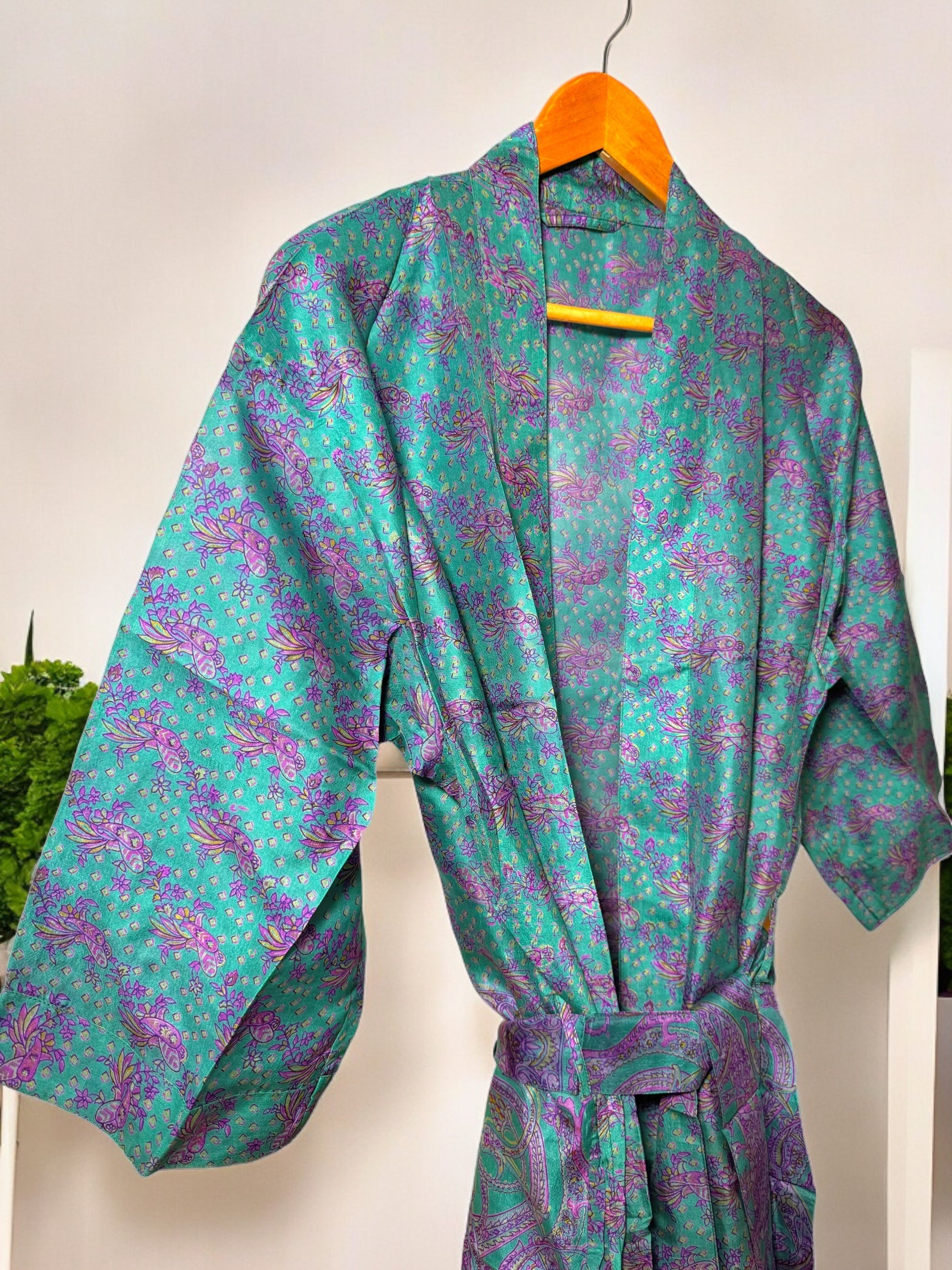 Kimono in seta vintage, con tasche e magnifica stampa. Taglia unica.