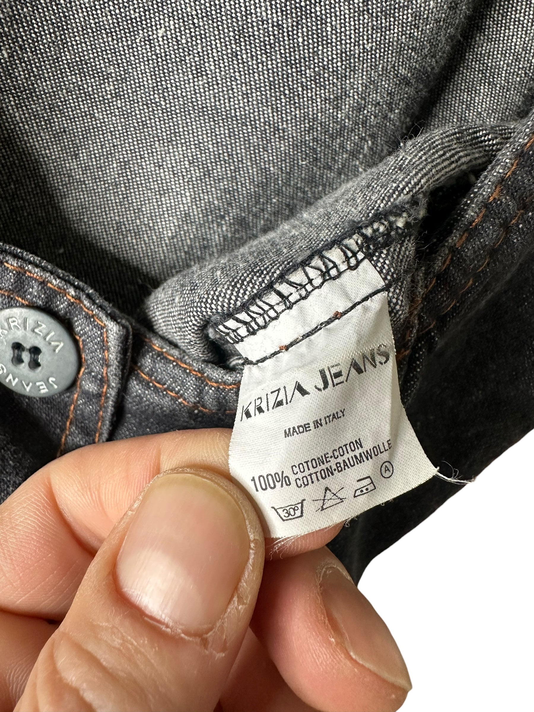 Jumpsuit vintage firmata Krizia Jeans, realizzata in denim di cotone dal lavaggio grigio scuro, dal carattere deciso ma ben equilibrato. Il modello presenta una linea strutturata sul busto con apertura frontale a bottoni logati Krizia Jeans, scollo ampio squadrato e spalline larghe.