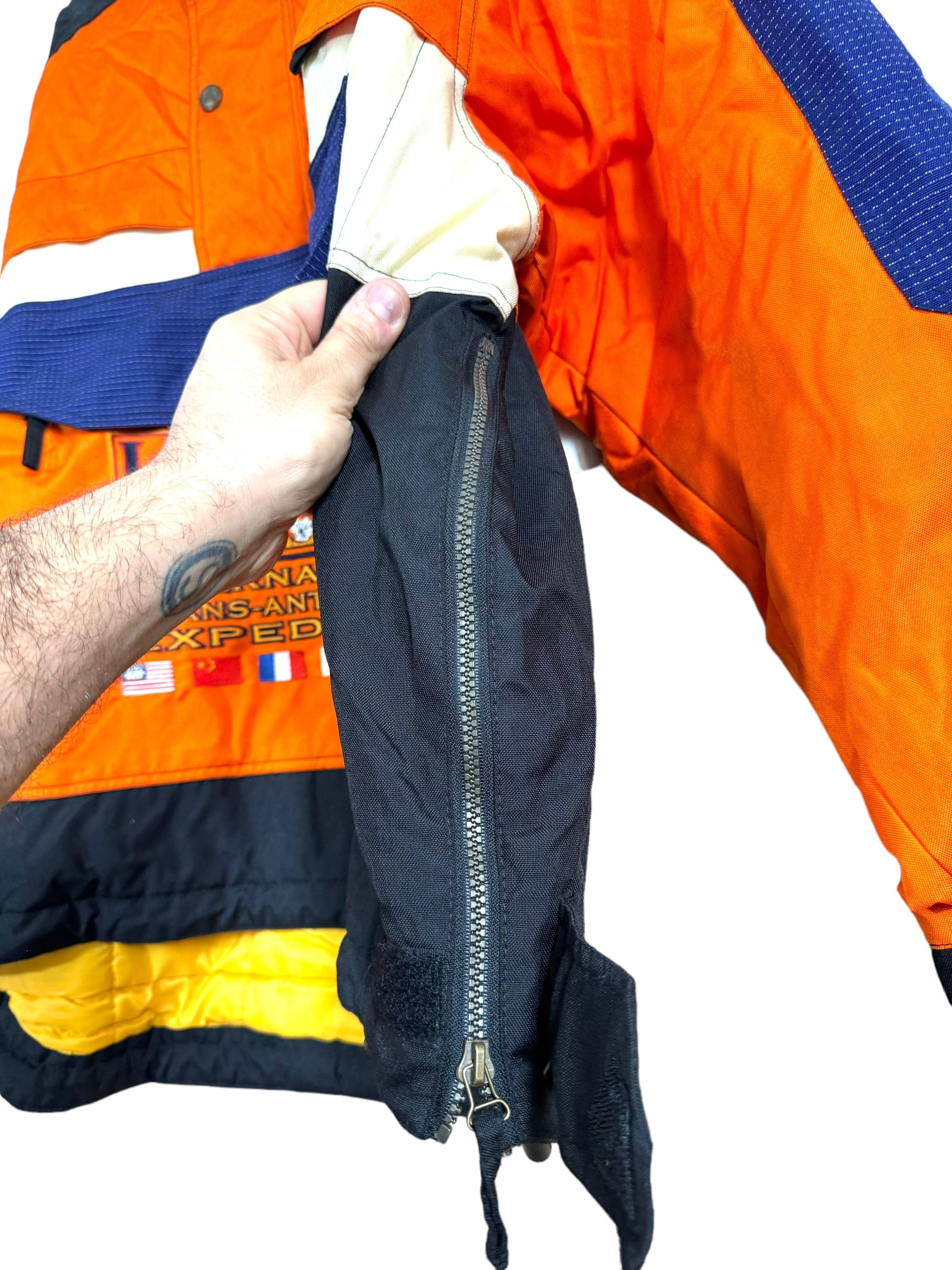 Ladakh giacca tecnica imbottita vintage streetwear, con tascone sul davanti con zip coperta da aletta, zip laterali sui fianchi che permette di aprirla, il retro é più lungo del davanti.