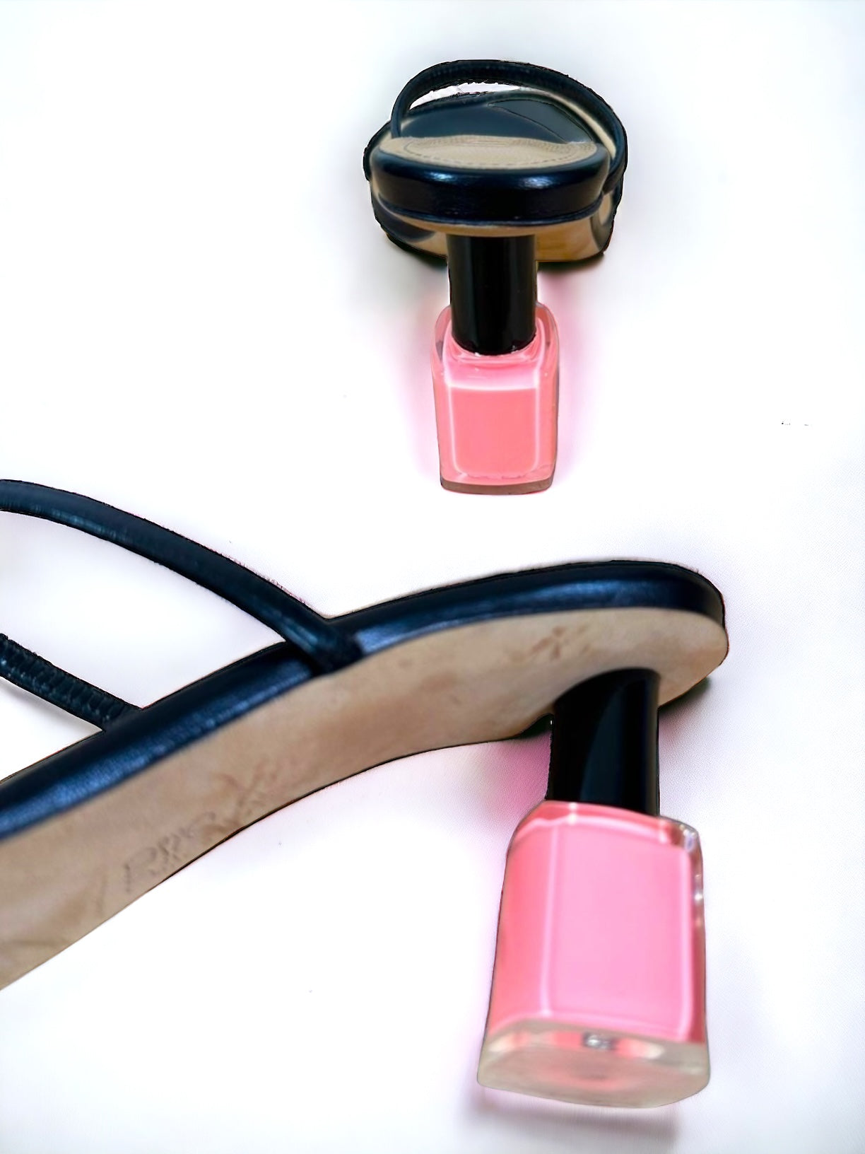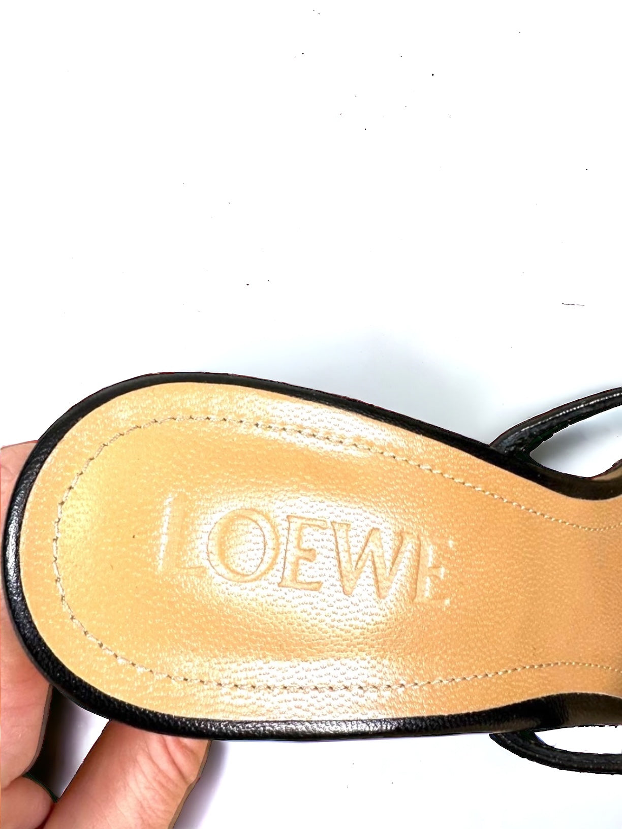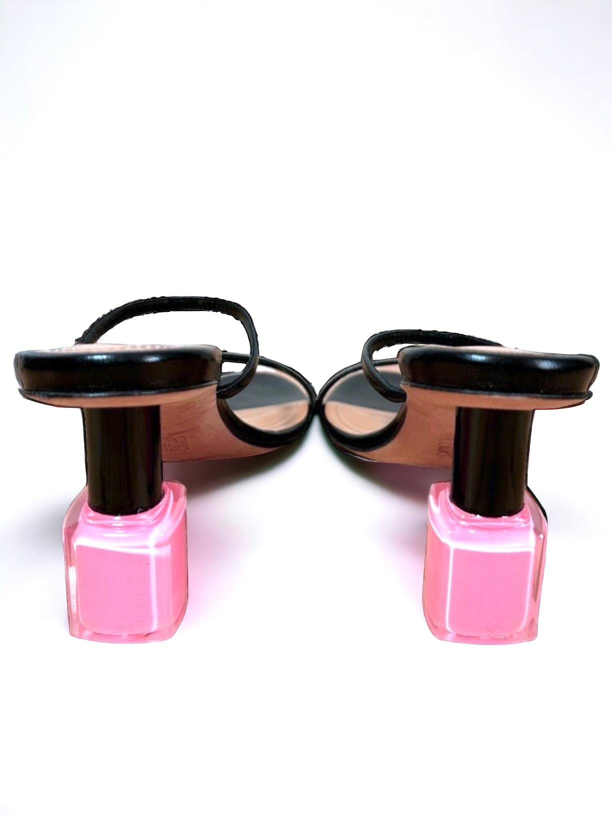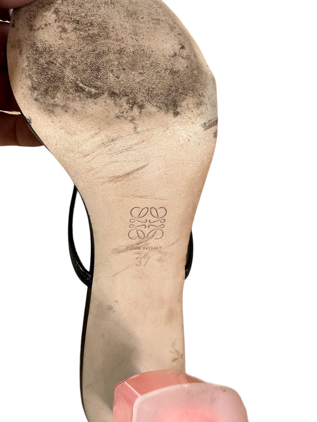 Loewe sandalo alla schiava in pelle nera con tacco a forma di smalto rosa. Segni di usura sulla suola. N. 37 Articolo di seconda mano, non vendono spedito con scatola.