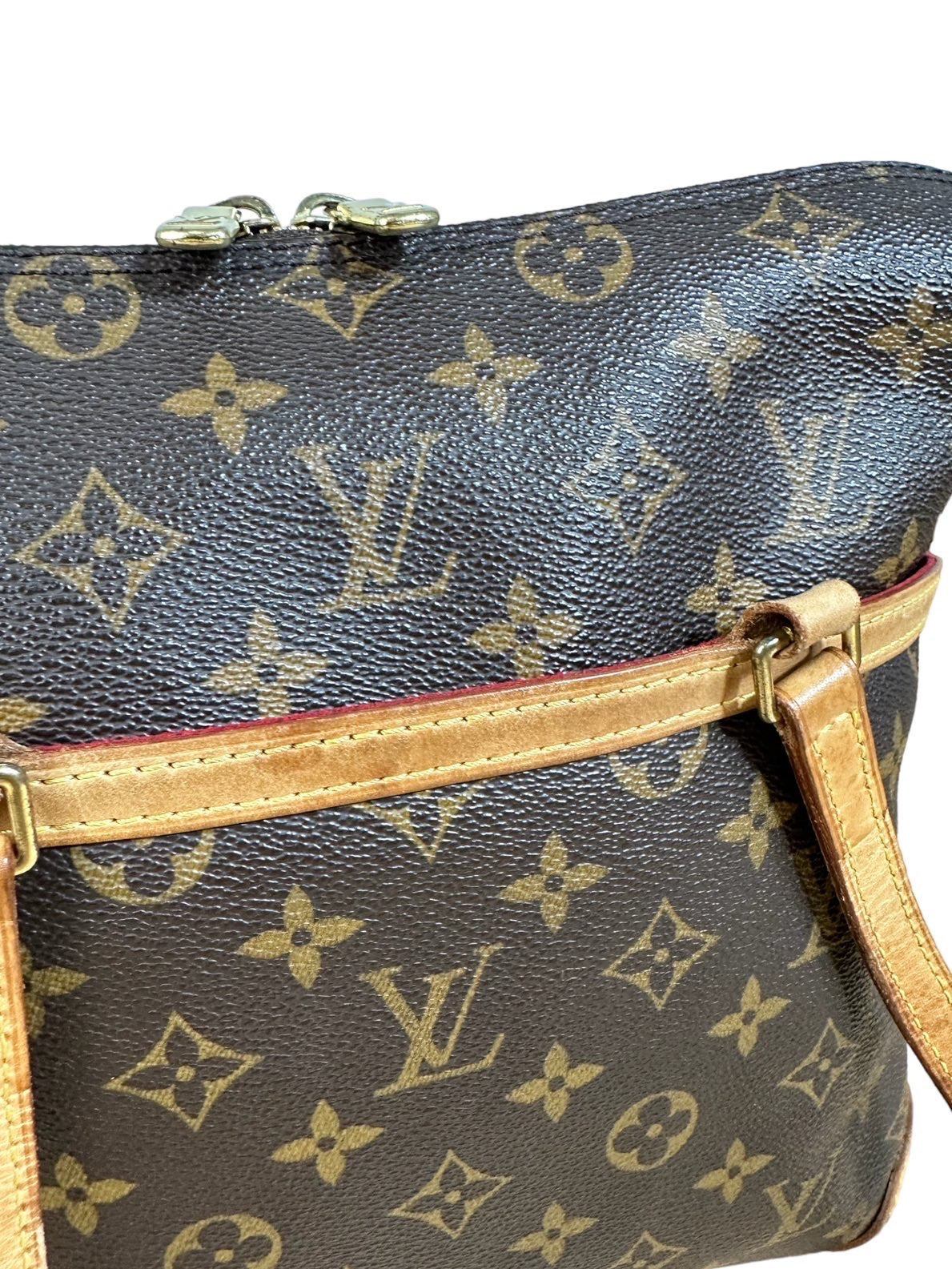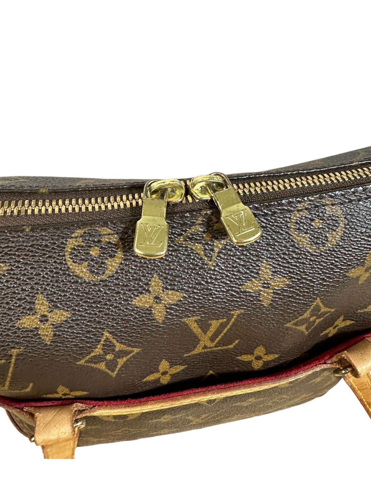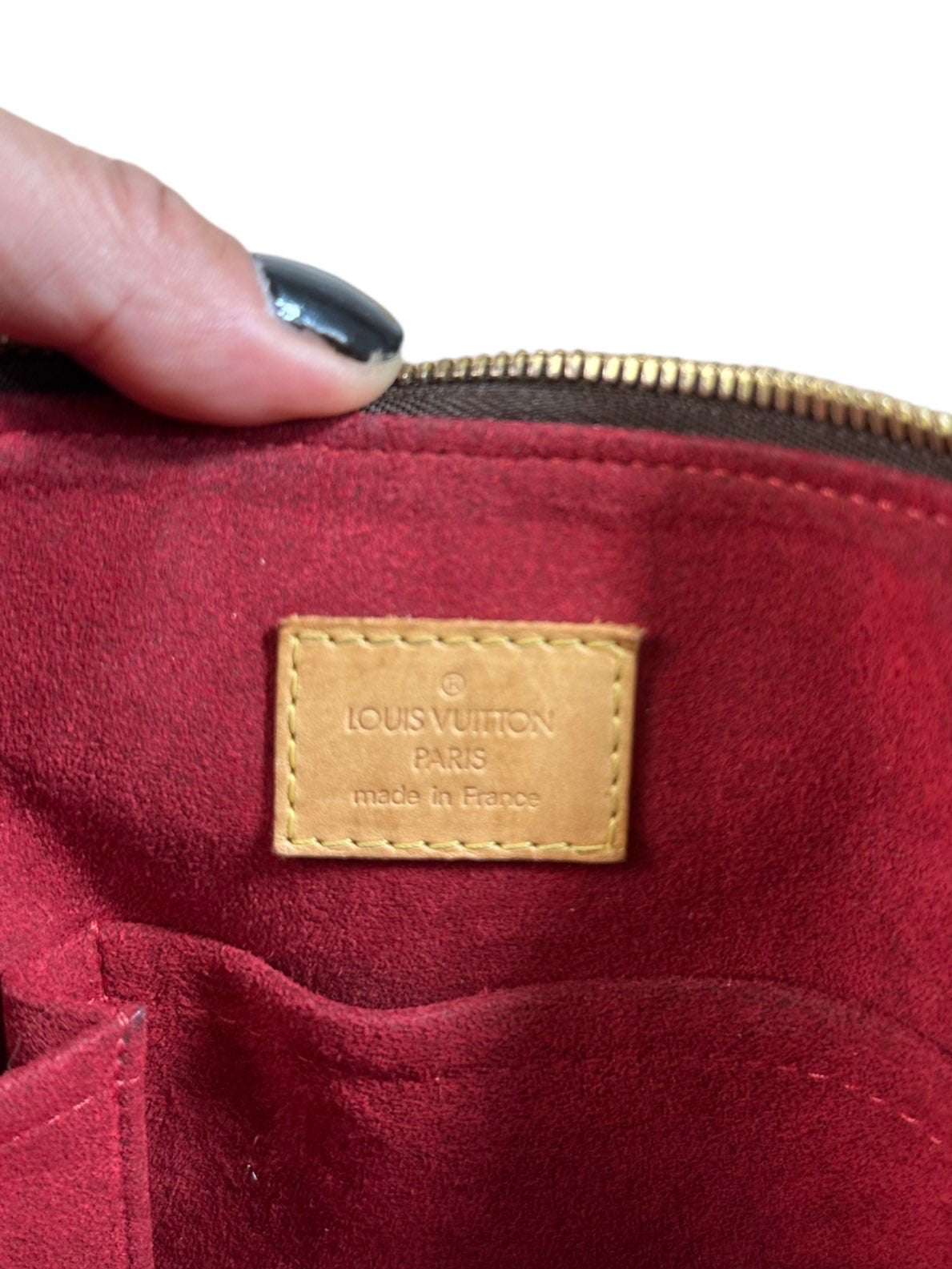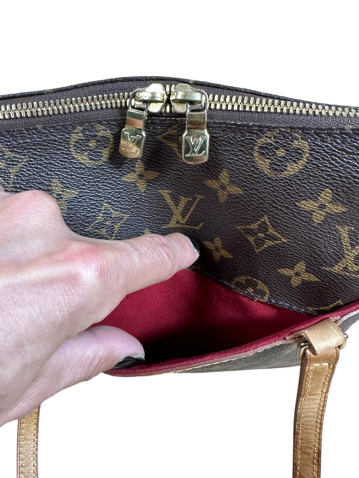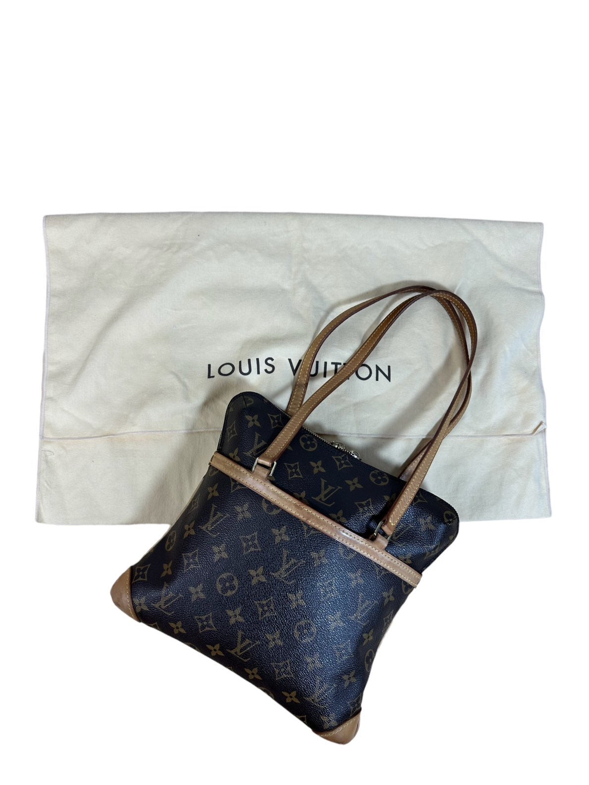 Louis Vuitton borsa Coussin vintage in tela monogram con manici e profili in vacchetta. Dispone di una tasca sul davanti e un ampio spazio interno con due taschini. Lievissimi segni di usata sulla vacchetta nella parte frontale all’altezza del taschino e sugli angoli (poco visibili). Codice seriale marchiato ma visibile con luce naturale.