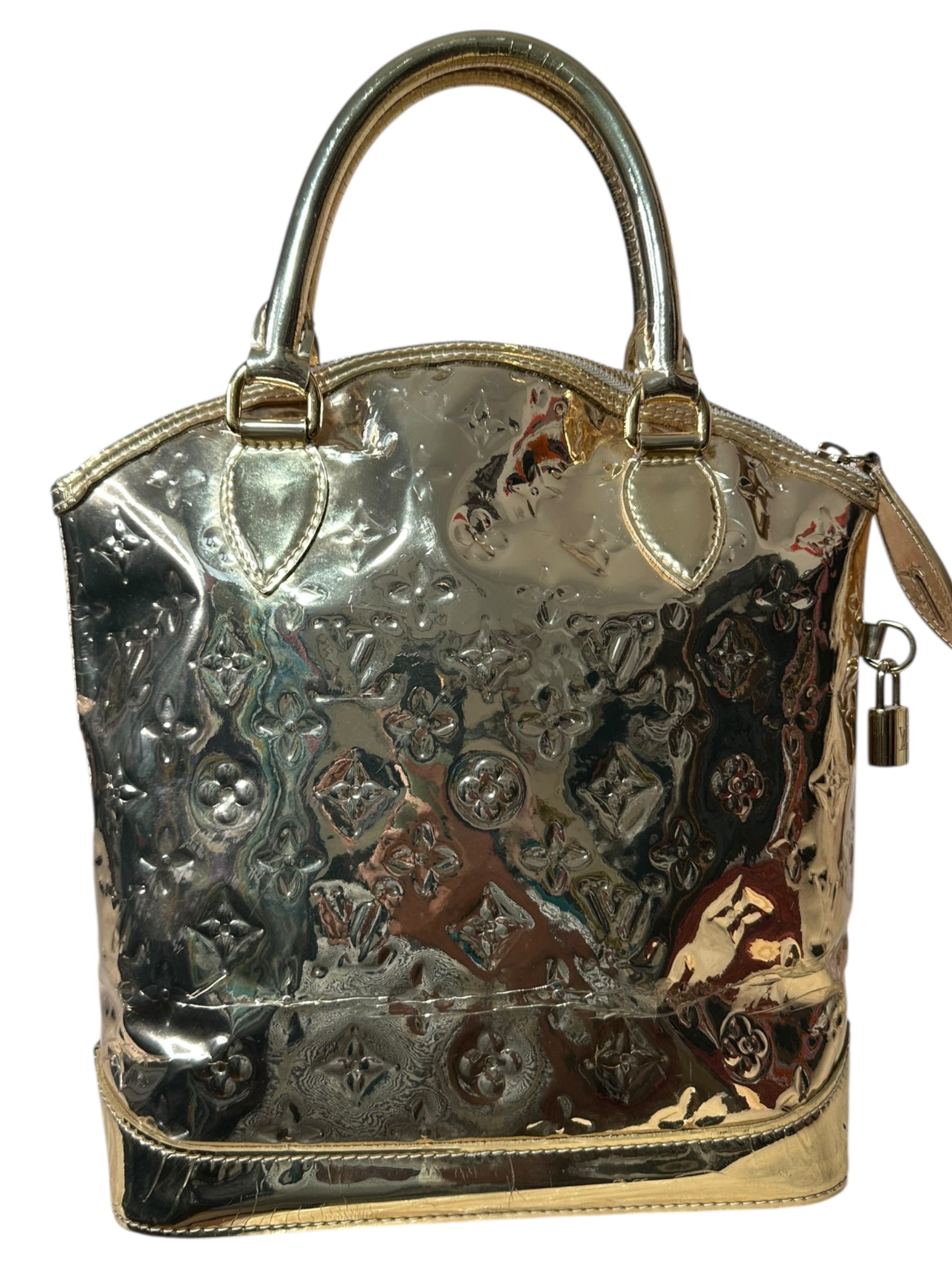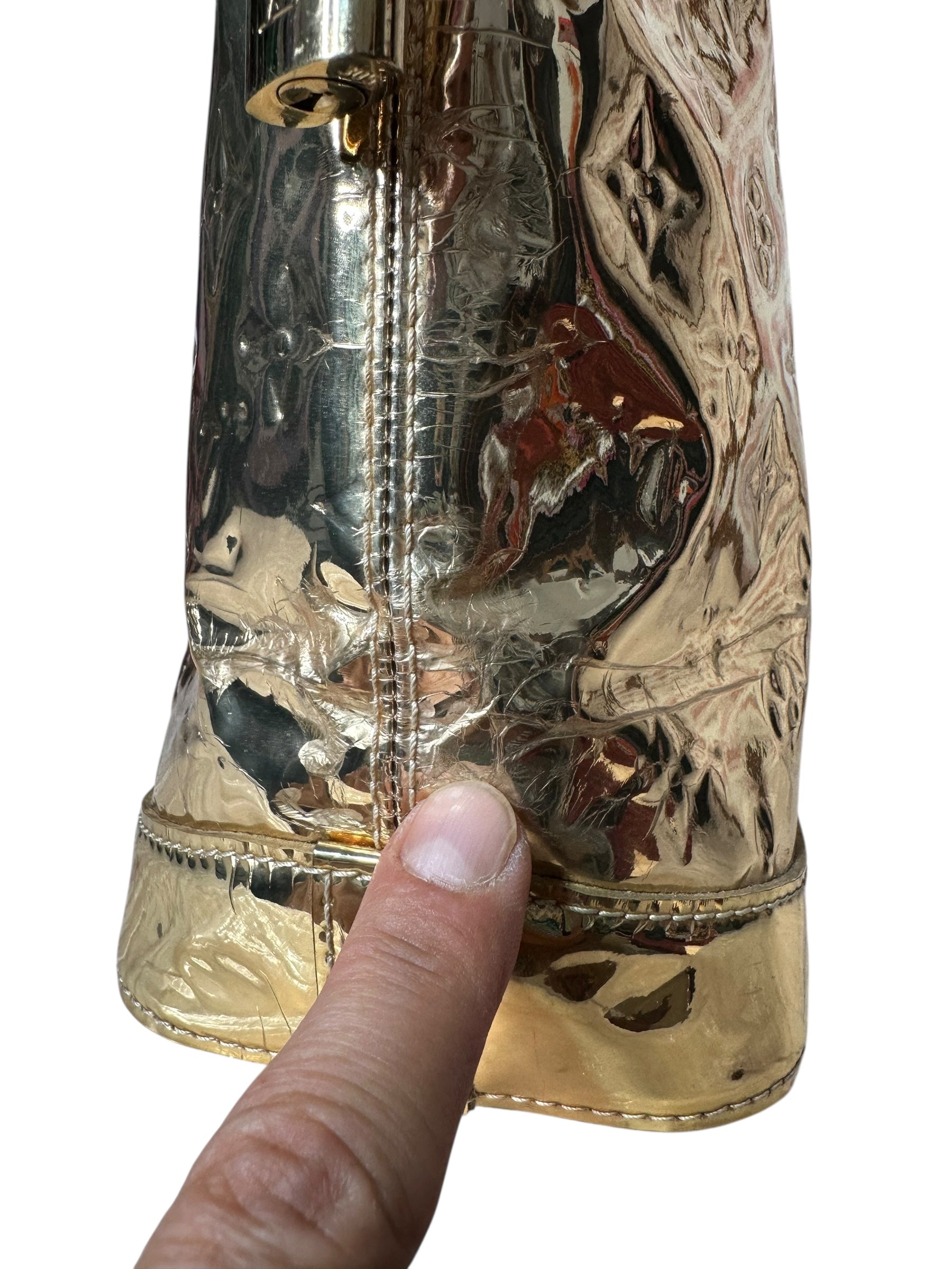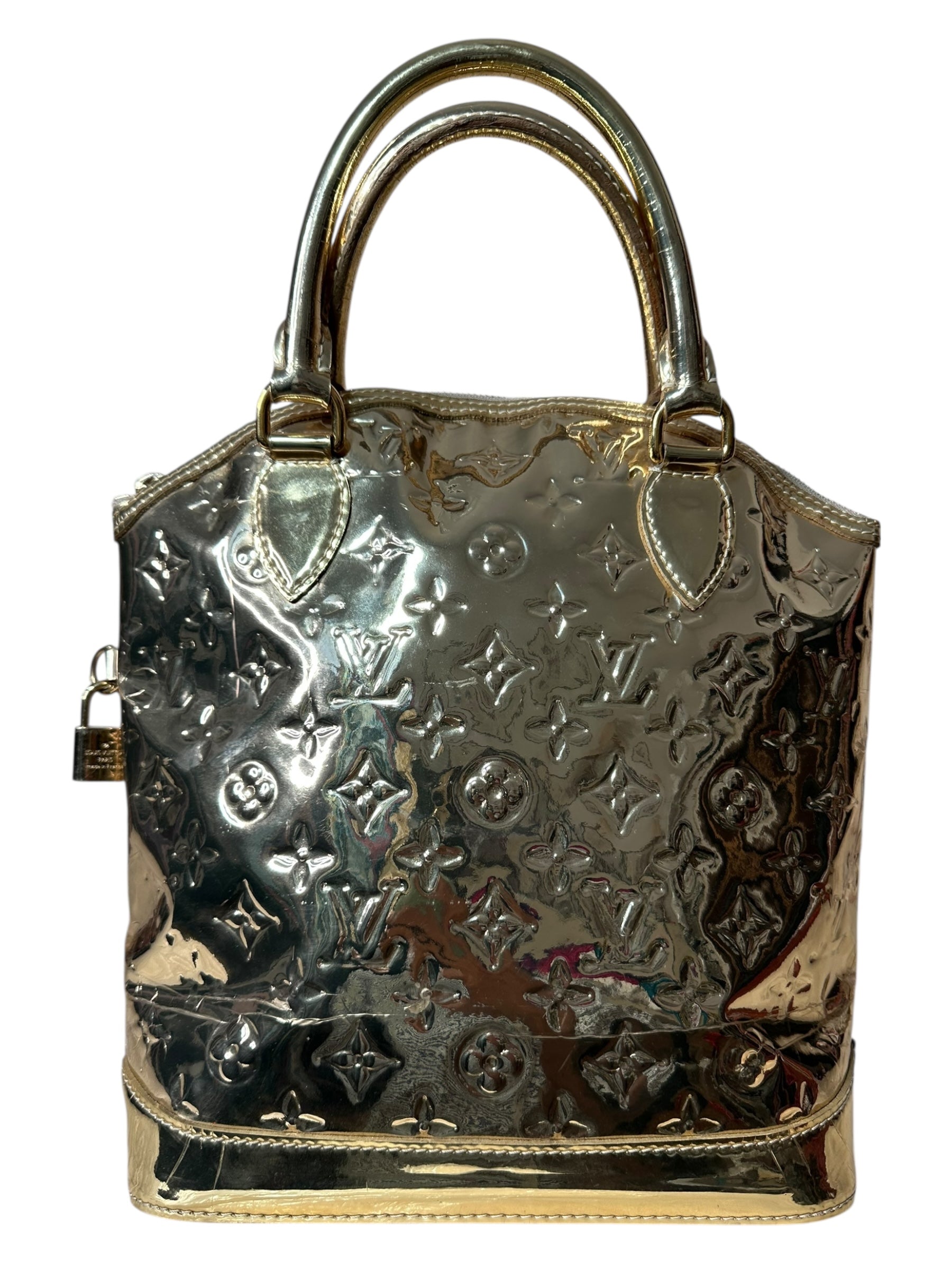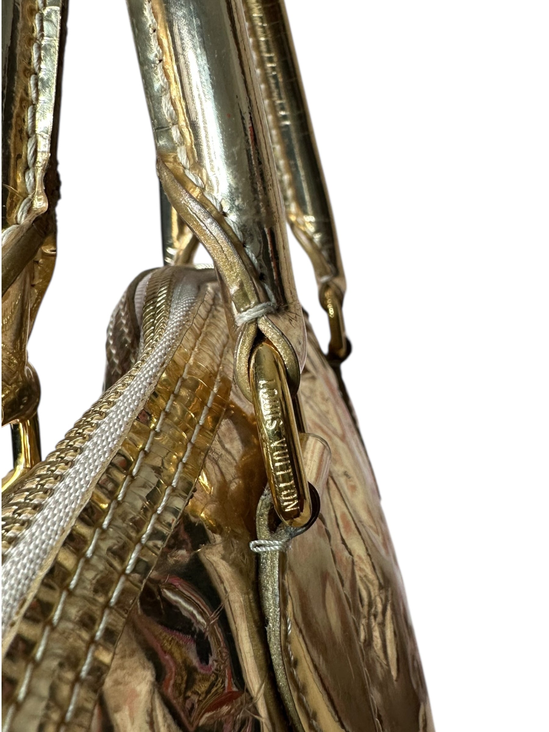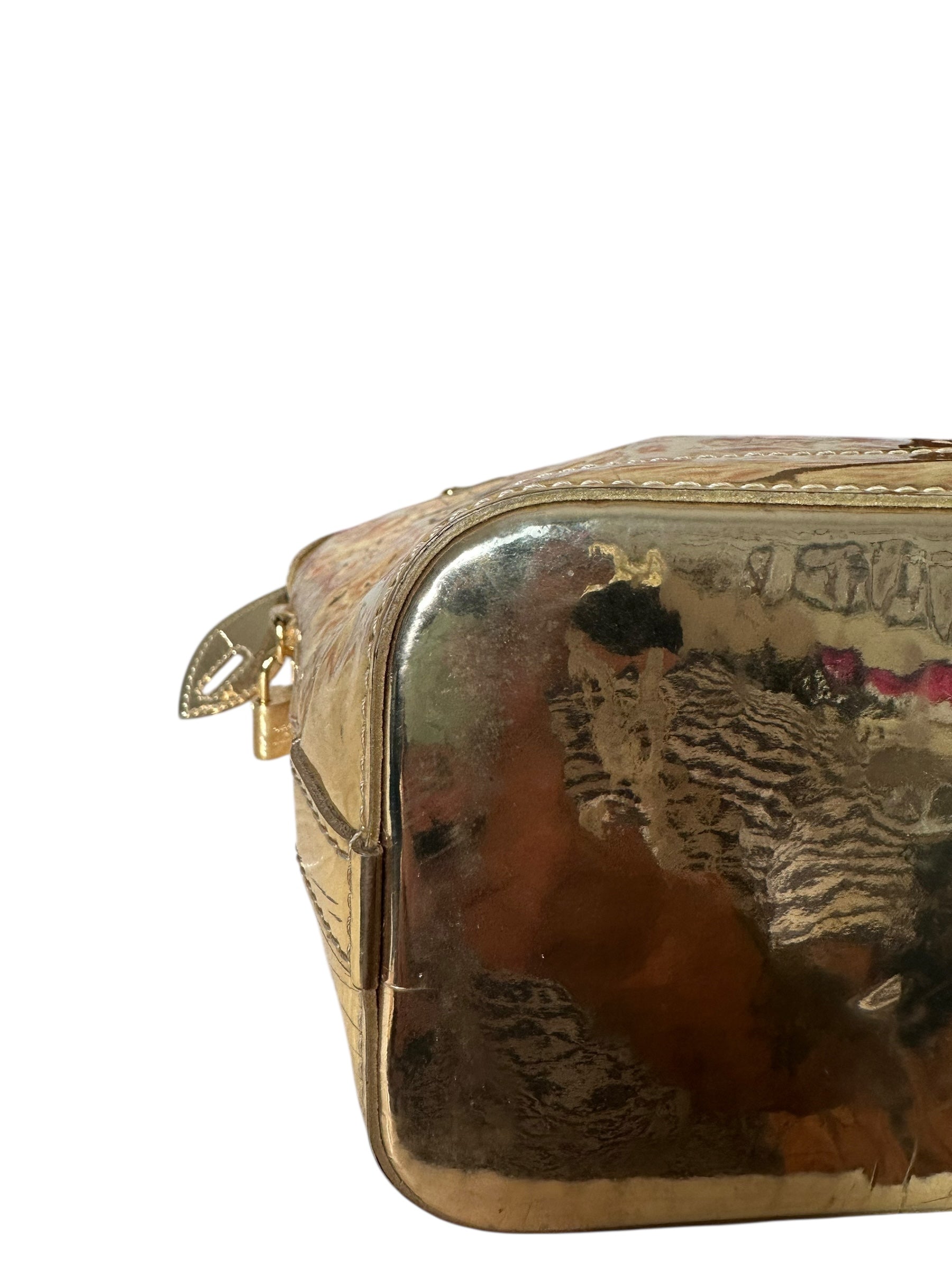 Materiale: Monogram verniciato lucido color oro, con dettagli in metallo dorato (lucchetto, anelli e zip)
