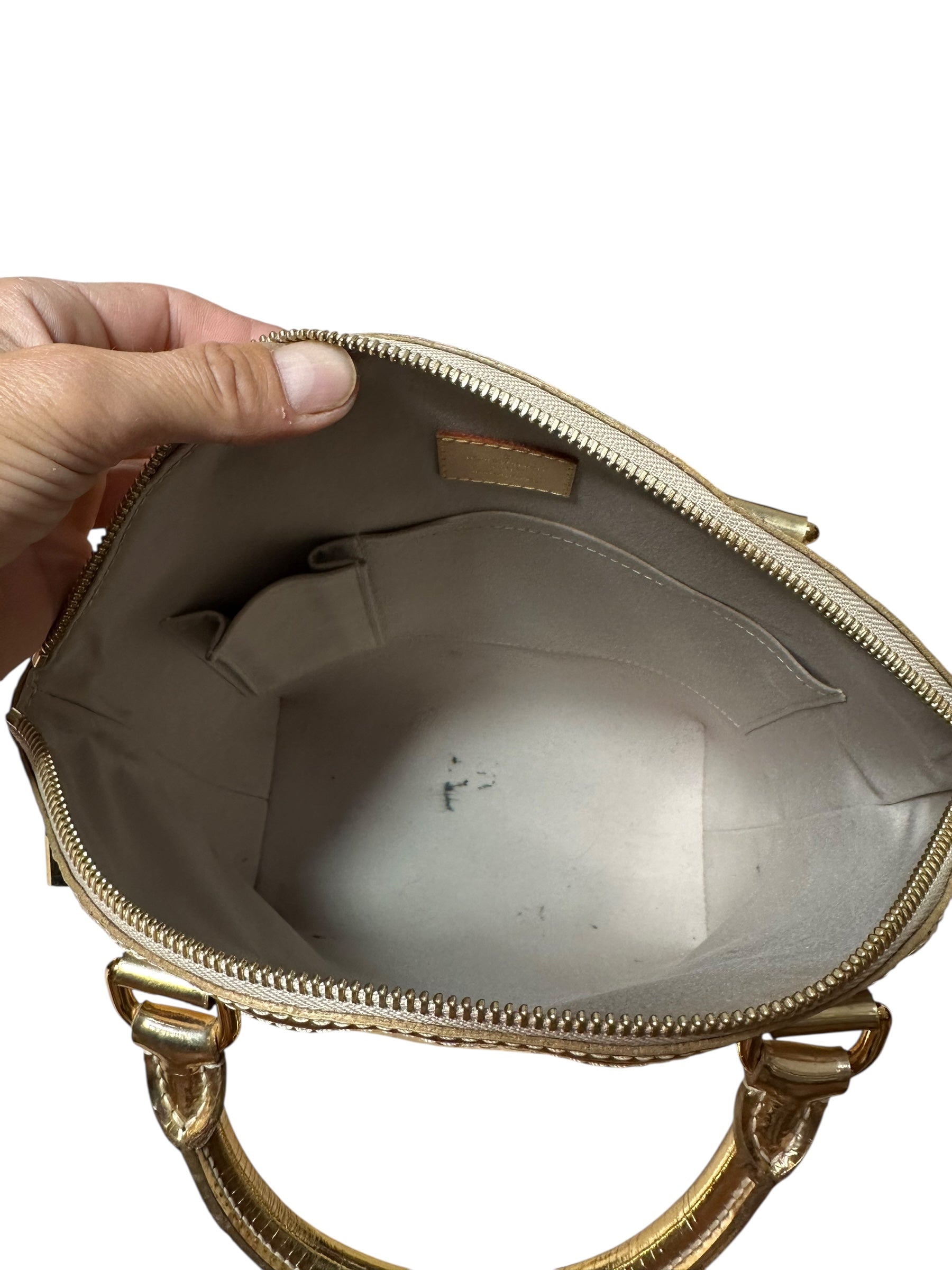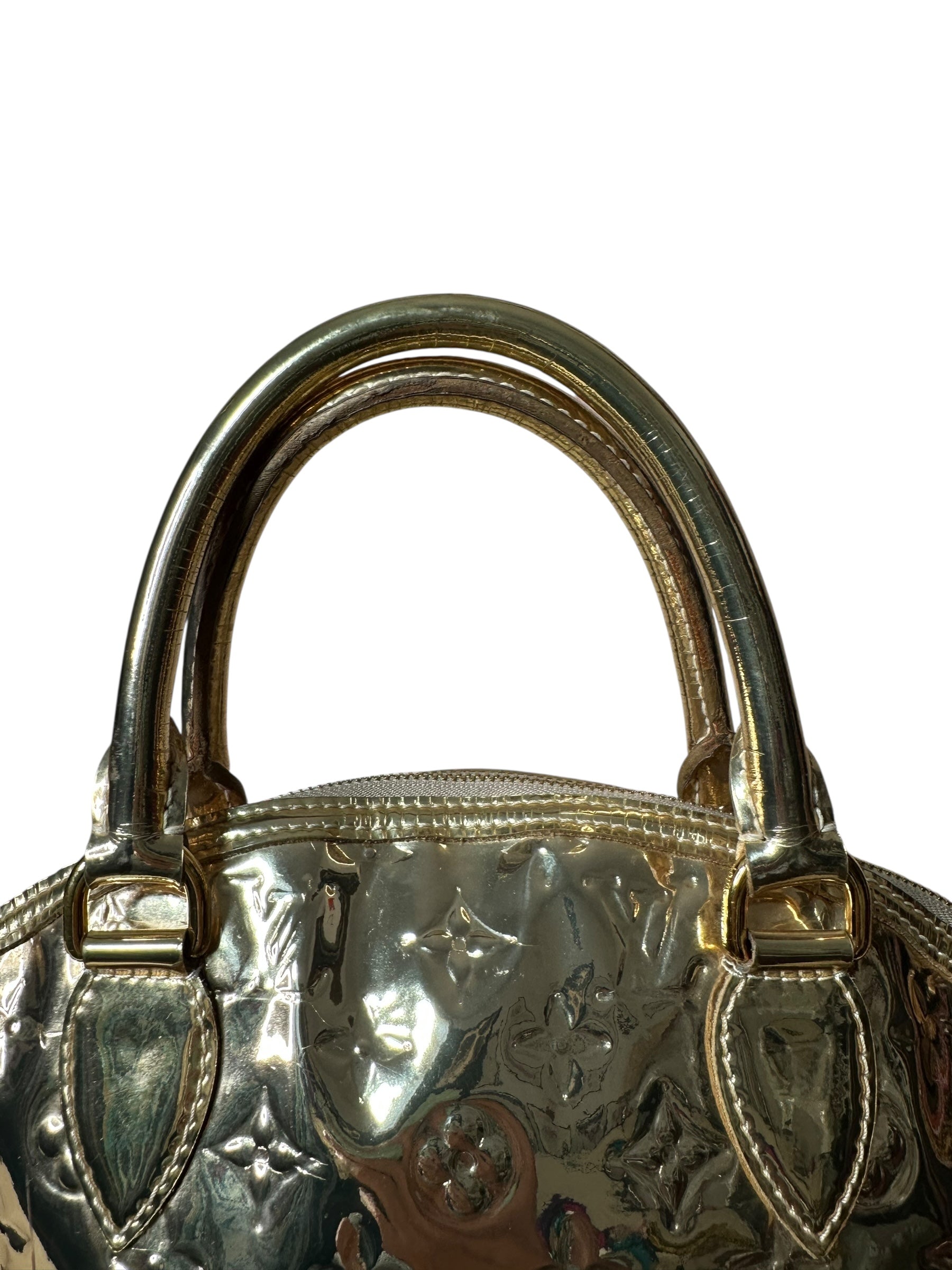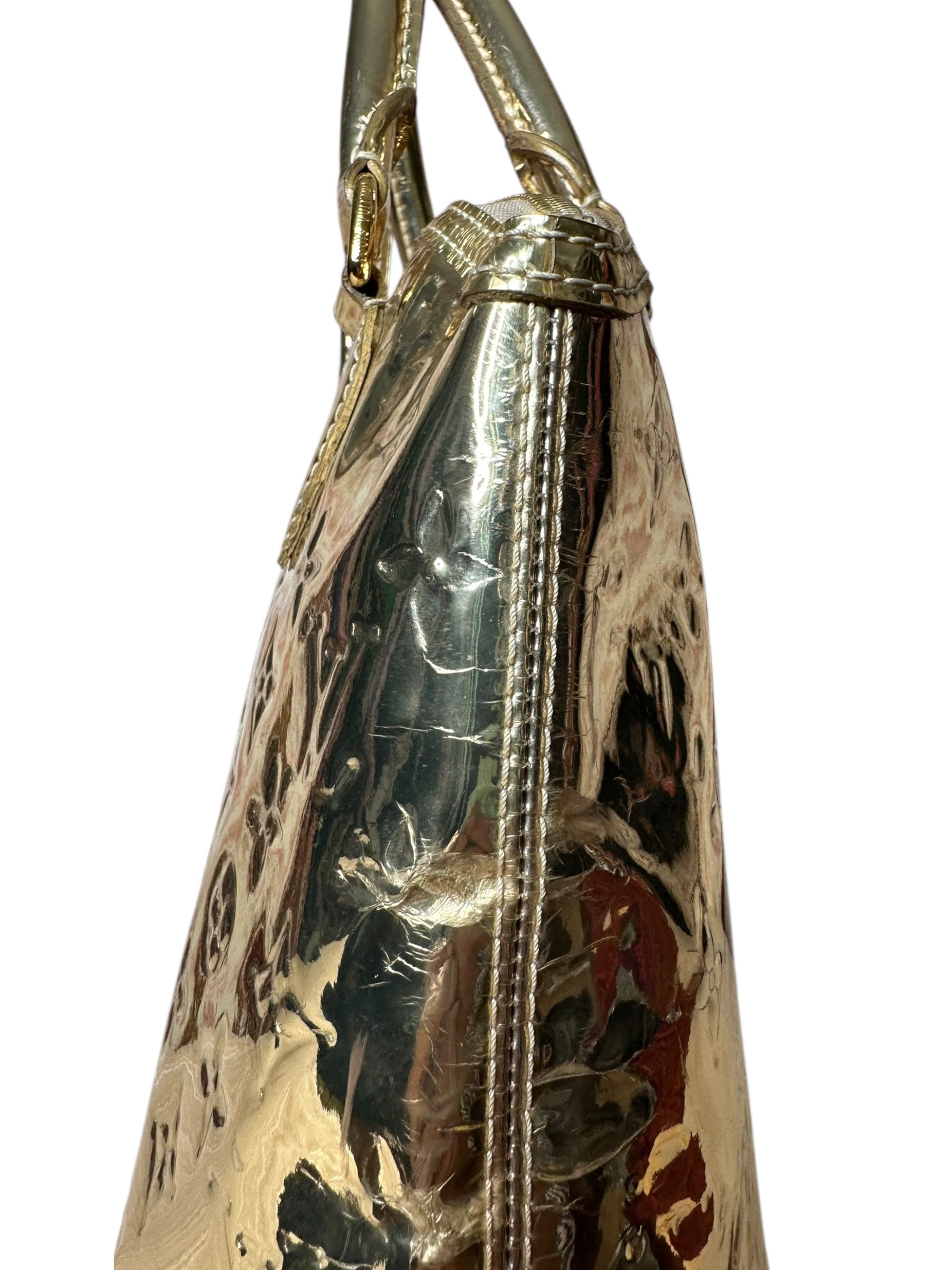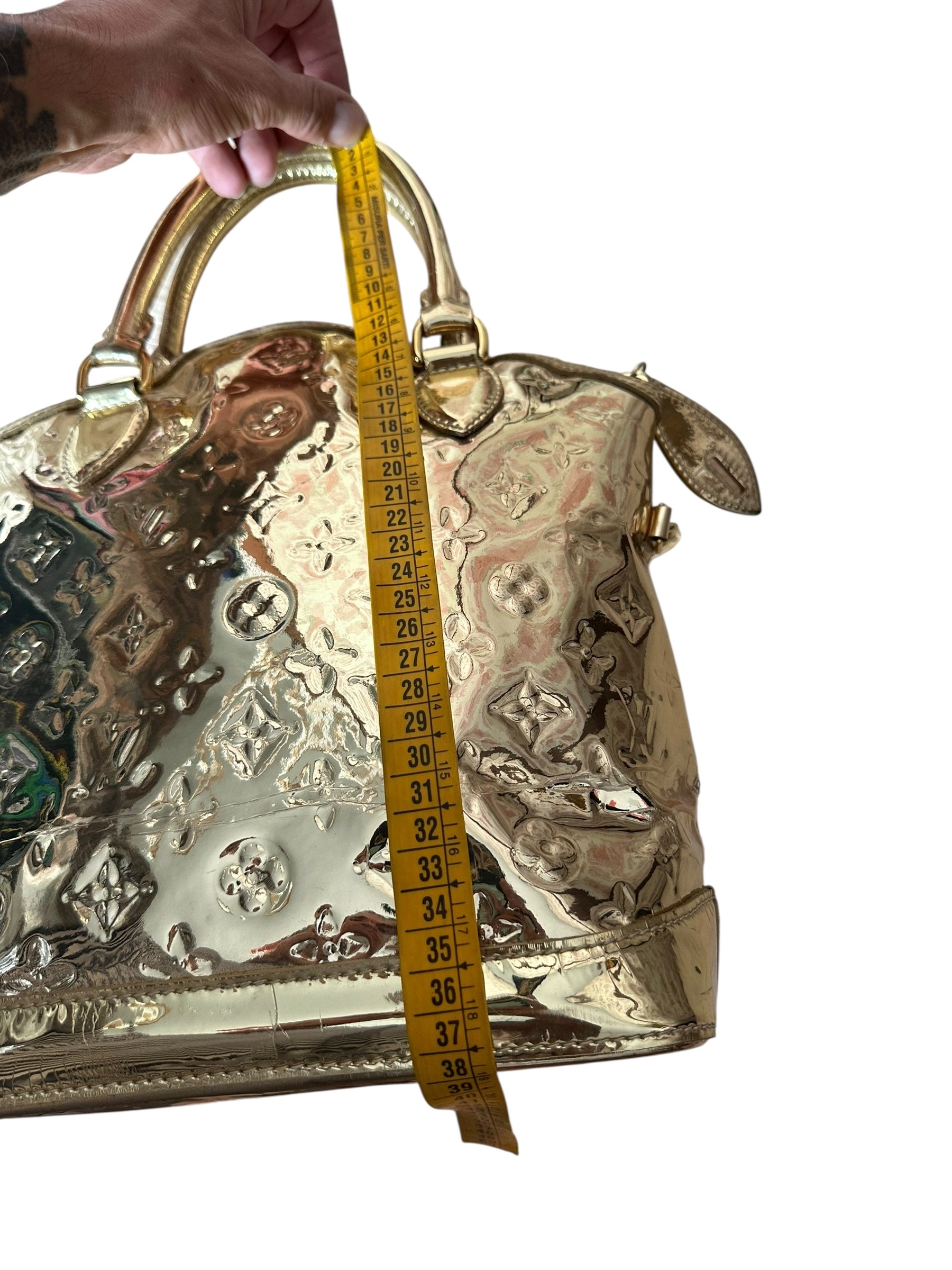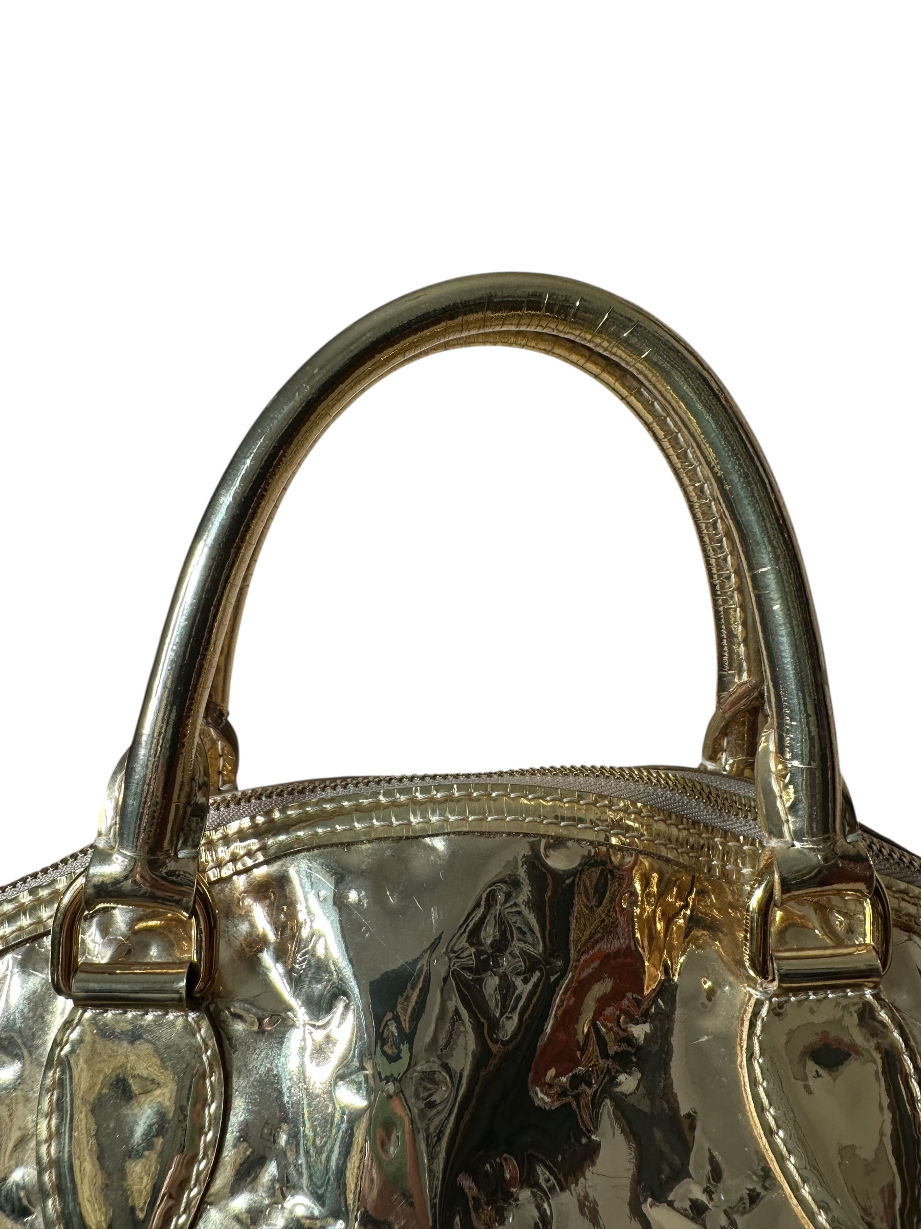 Materiale: Monogram verniciato lucido color oro, con dettagli in metallo dorato (lucchetto, anelli e zip)