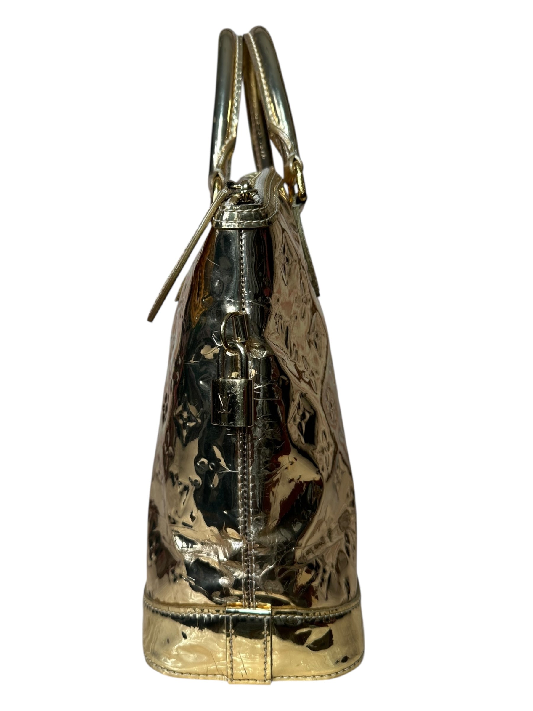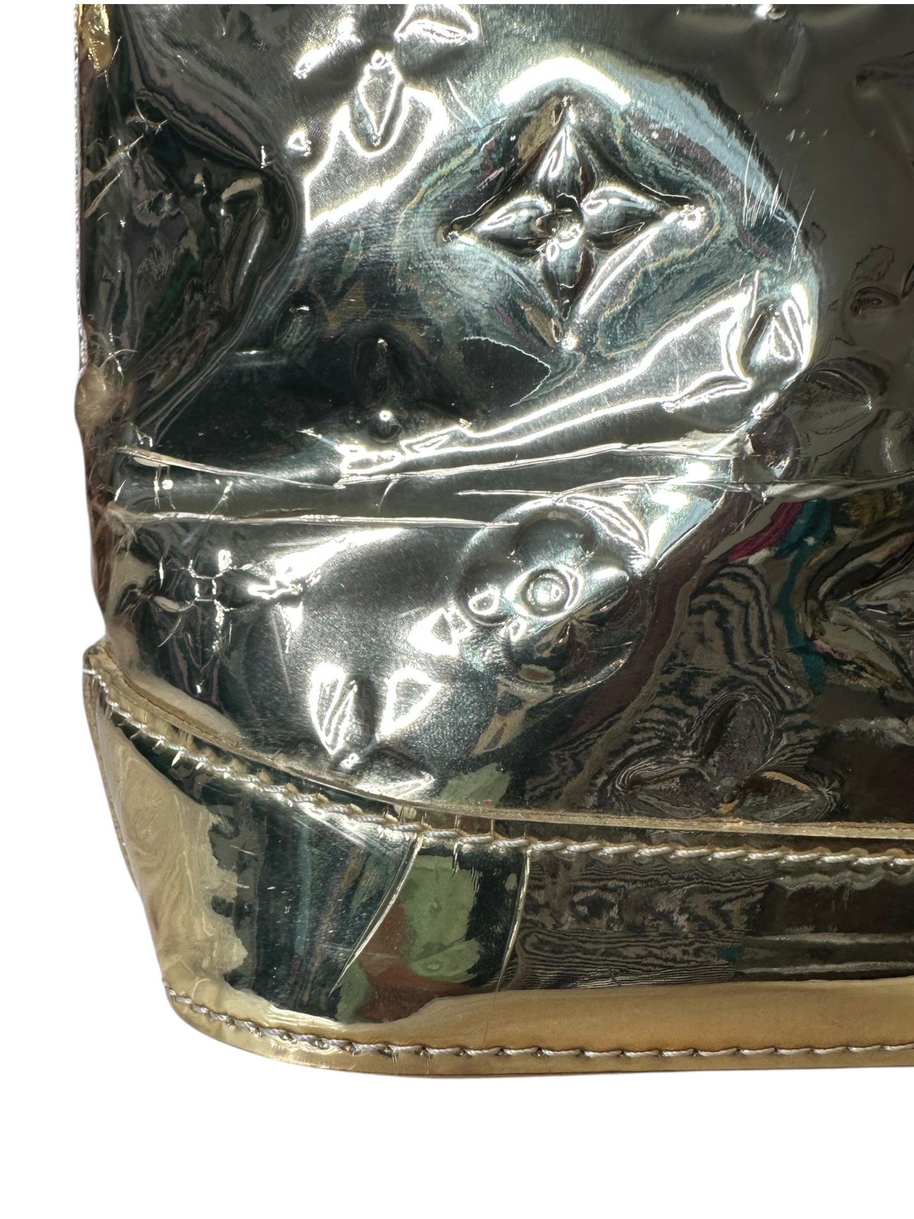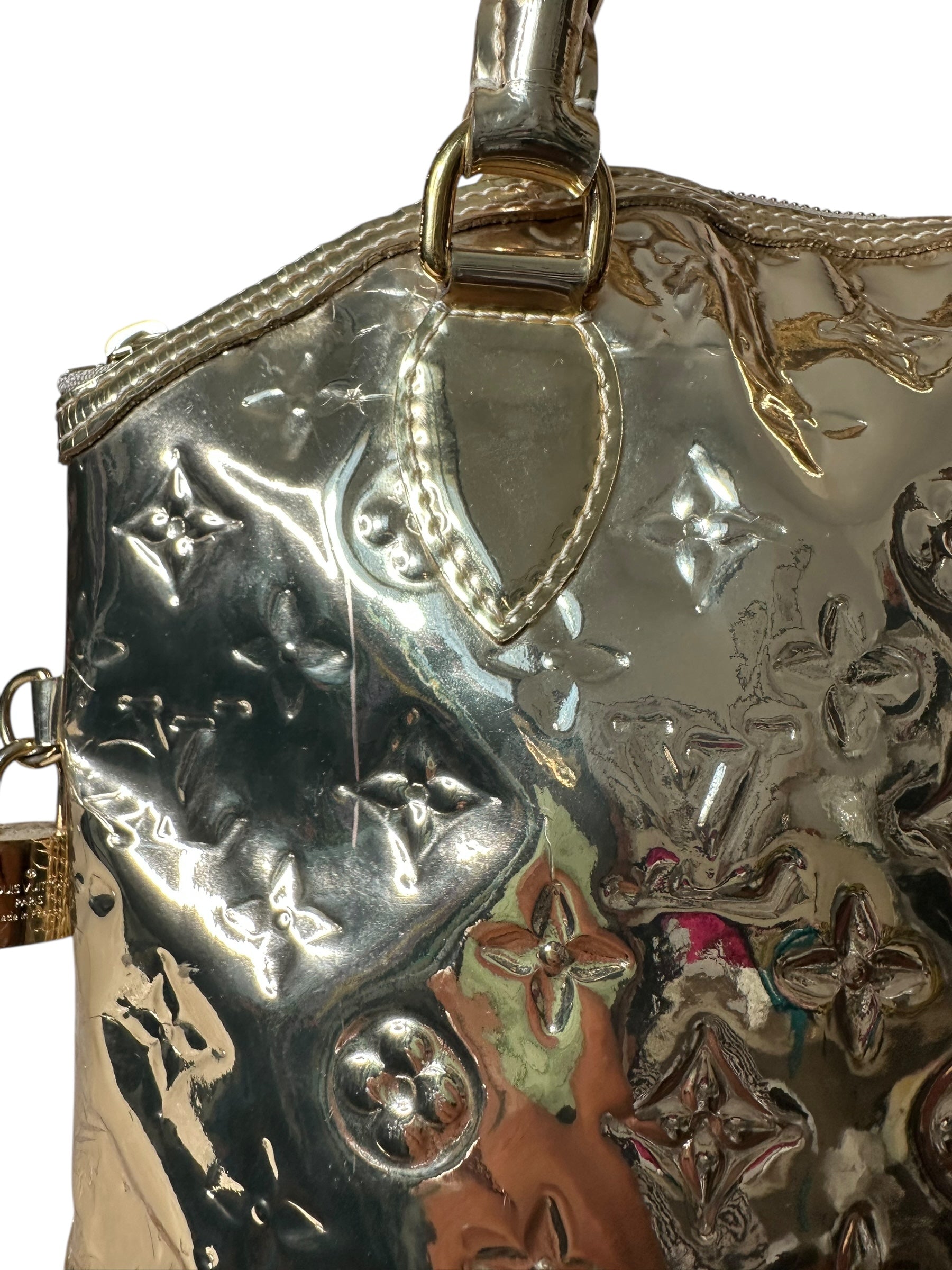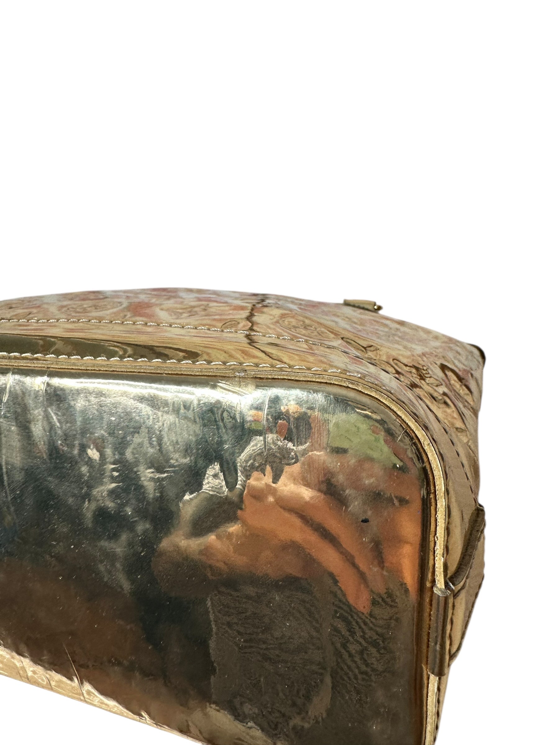Materiale: Monogram verniciato lucido color oro, con dettagli in metallo dorato (lucchetto, anelli e zip)