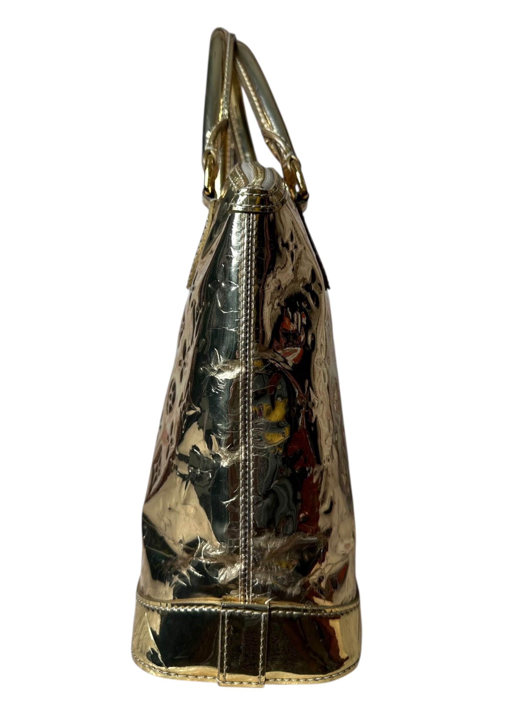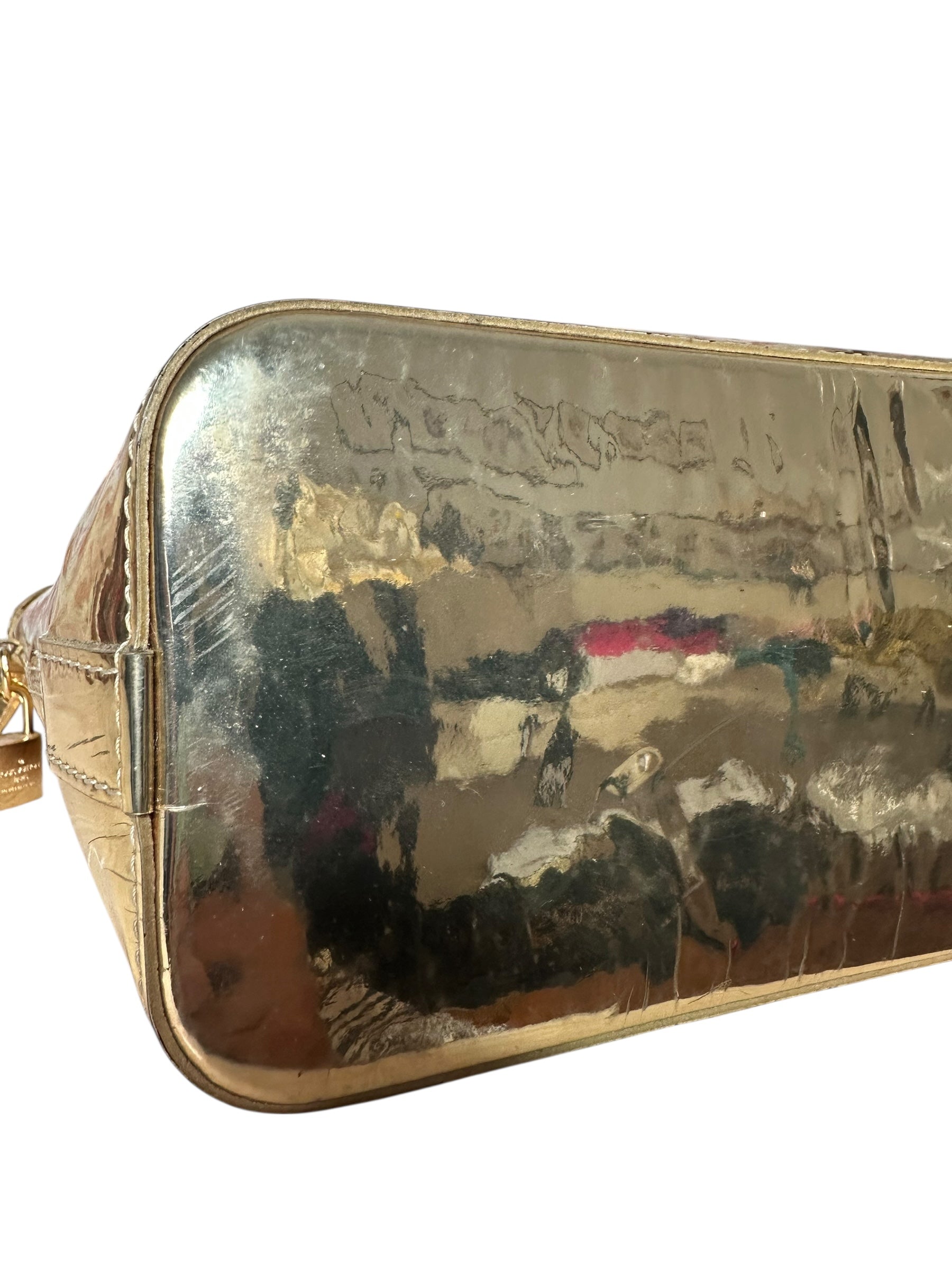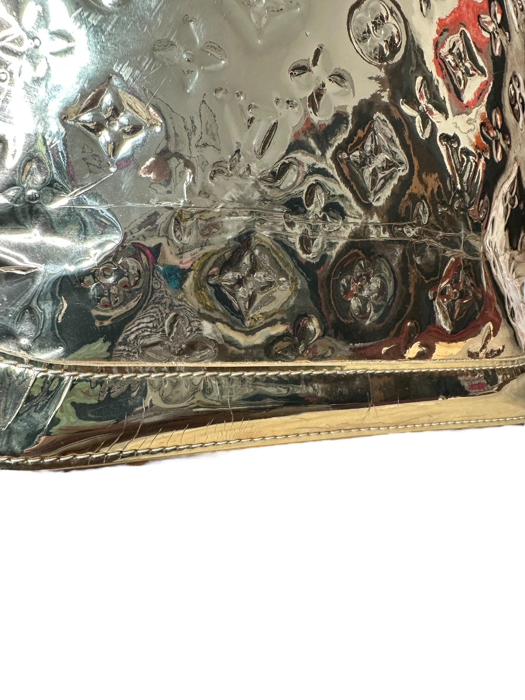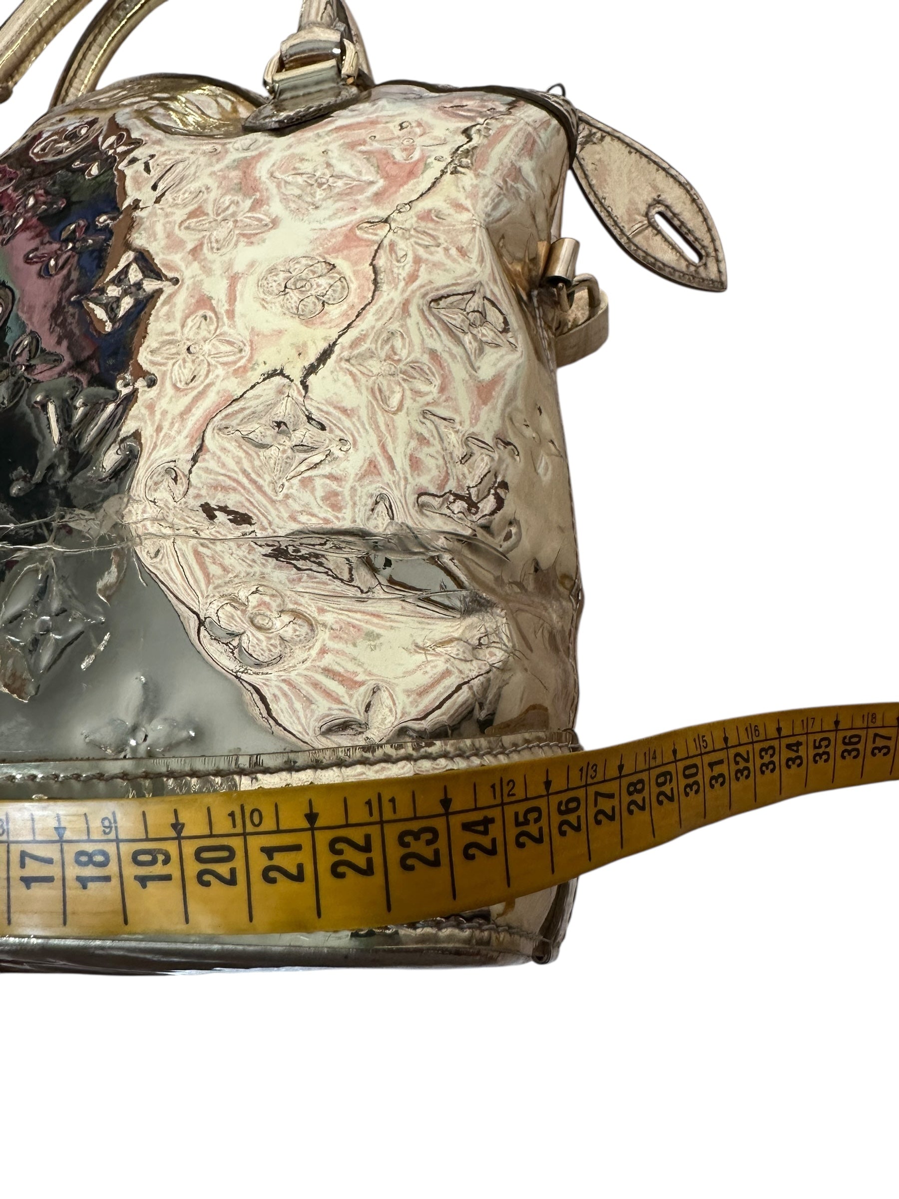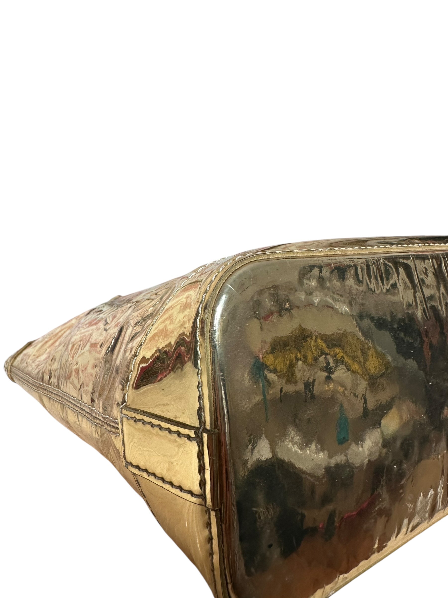 Materiale: Monogram verniciato lucido color oro, con dettagli in metallo dorato (lucchetto, anelli e zip)
