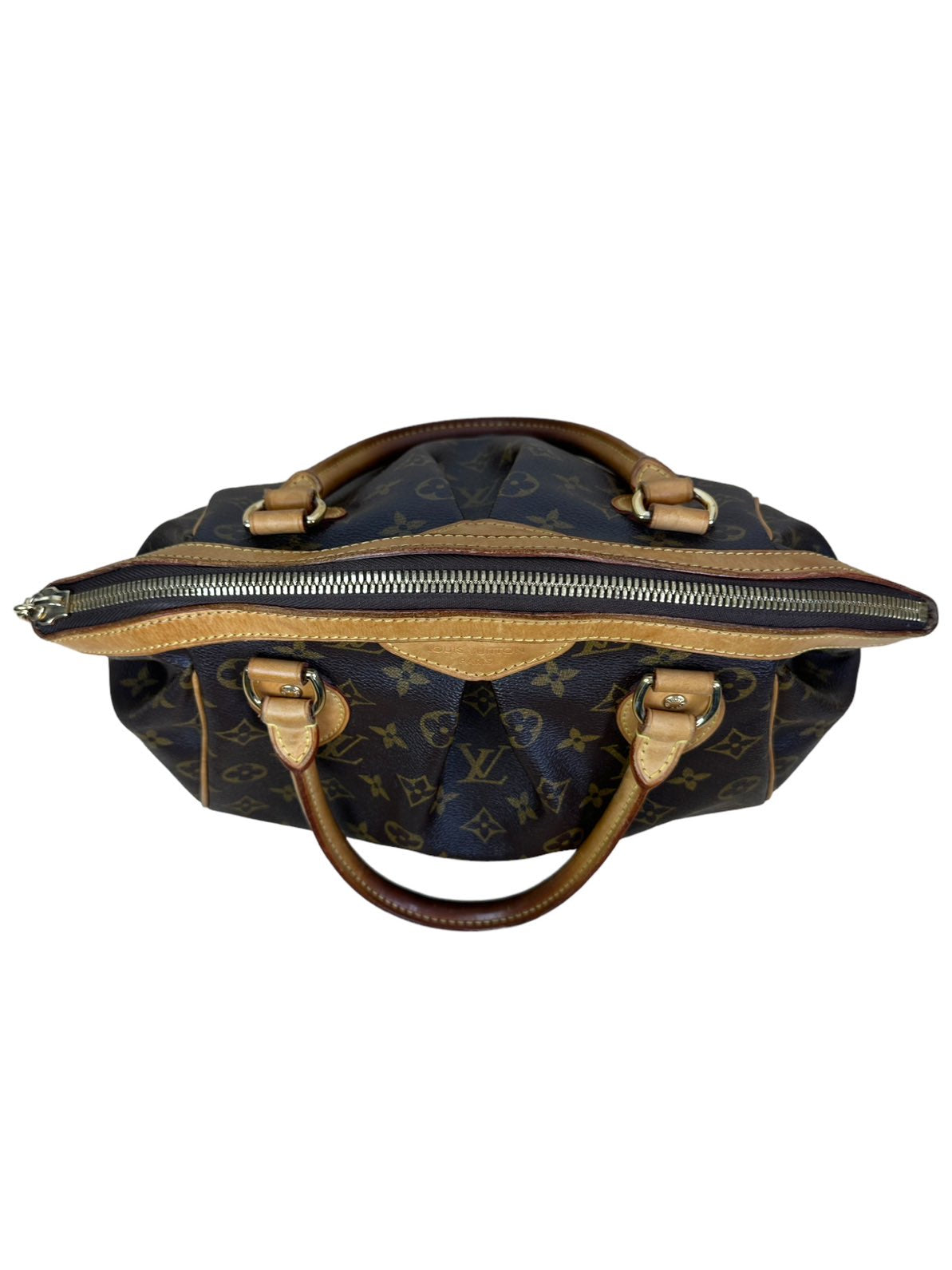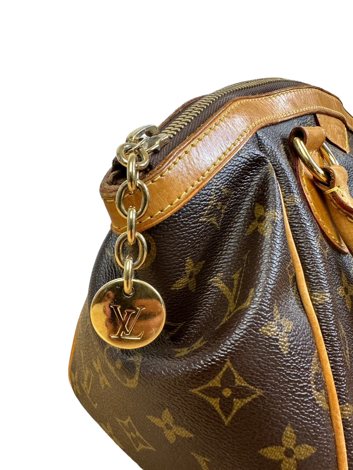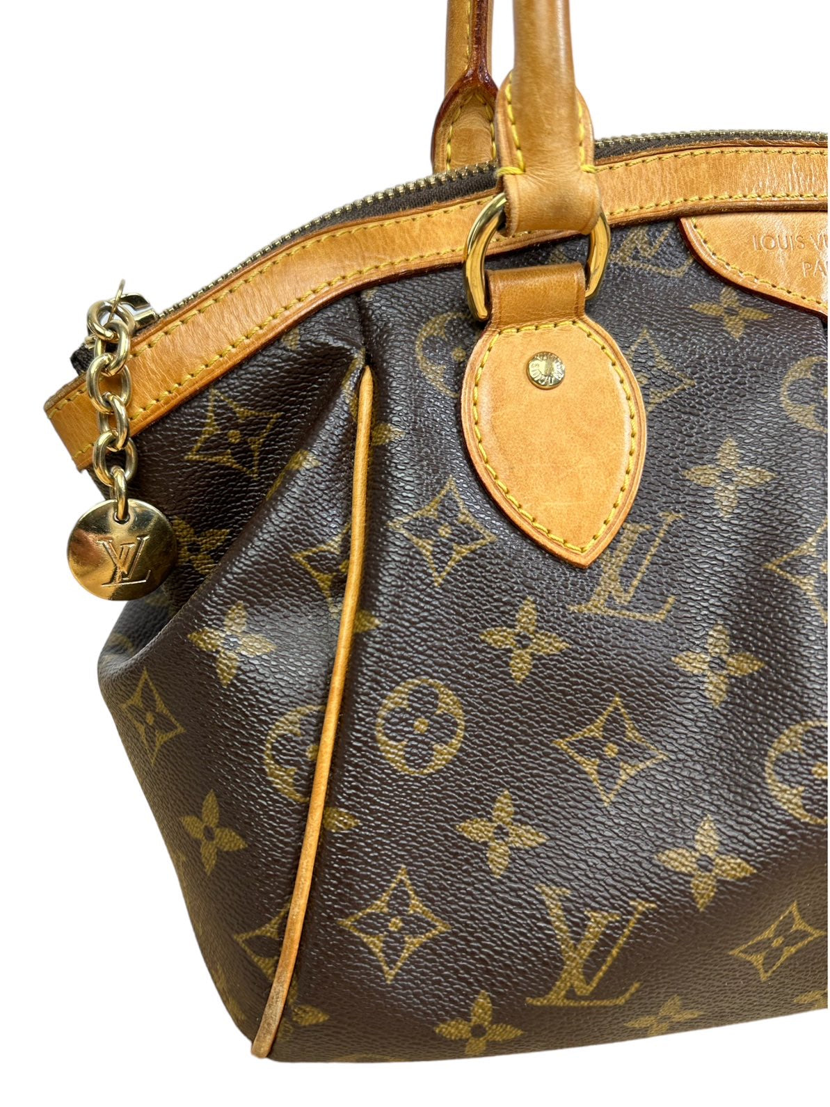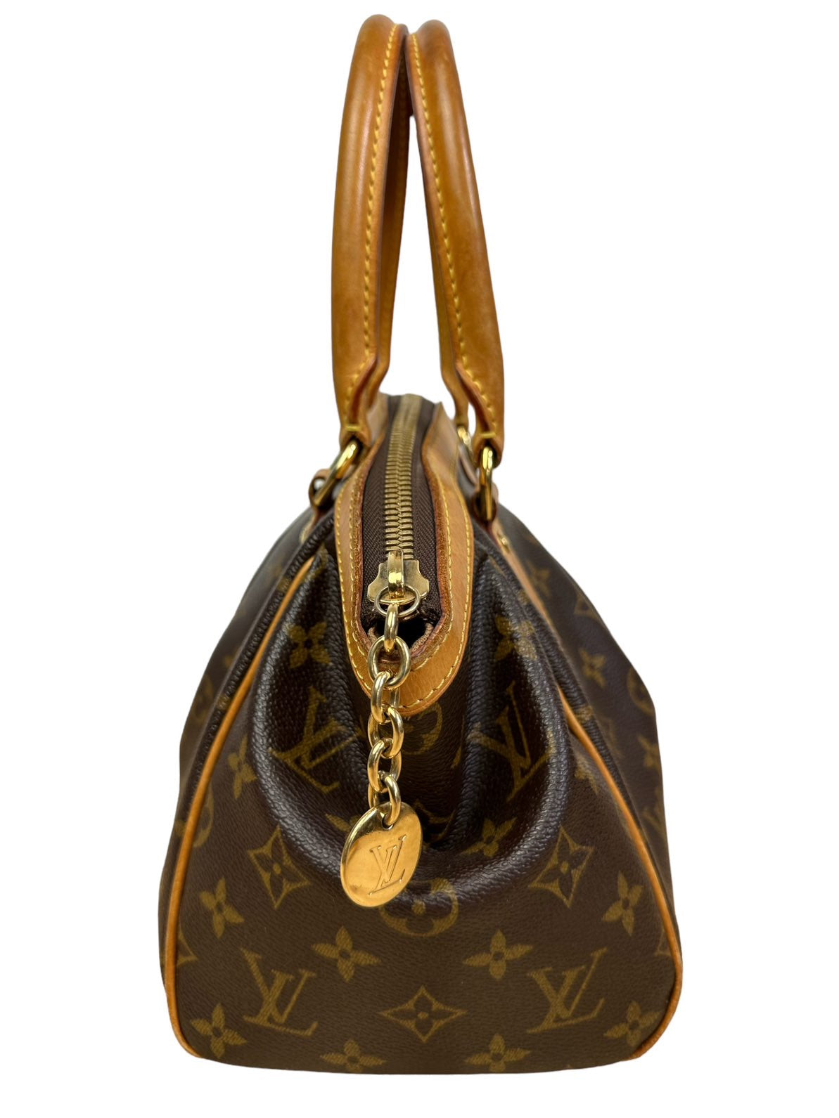 Louis Vuitton borsa vintage Tivoli in tela monogram con profili e manico in vacchetta con chiusura a zip e tirante con pendente a logo. Presenta lievi segni di usura sugli angoli e sulla parte dell’impugnatura del manico rimovibile da un laboratorio specializzato. Misura piccola.