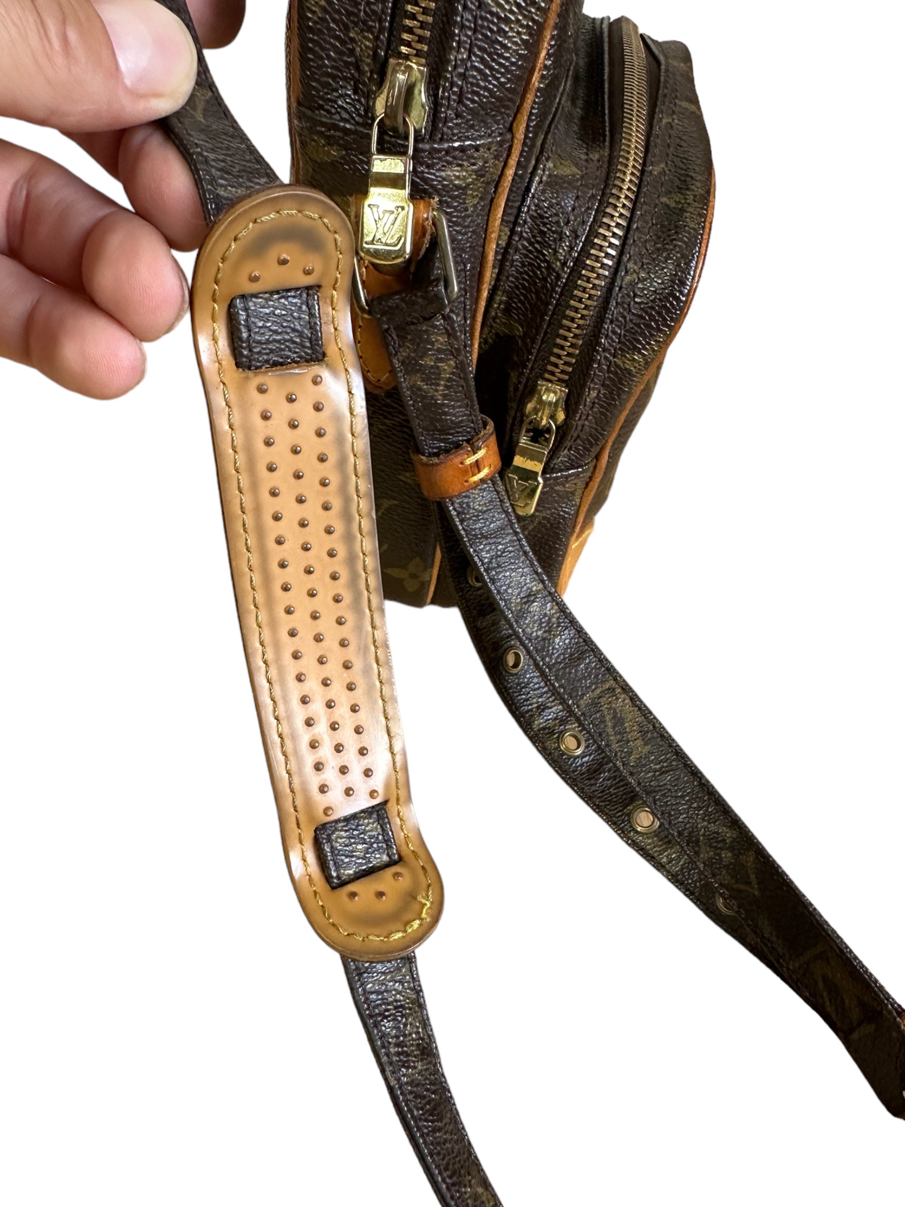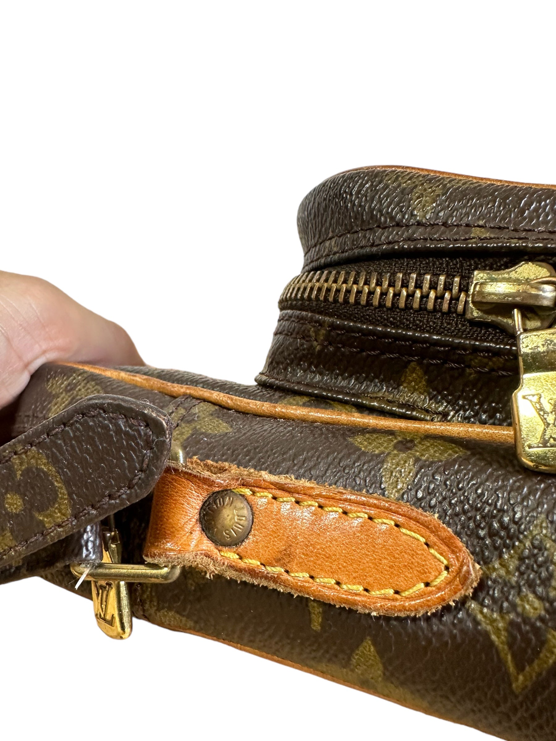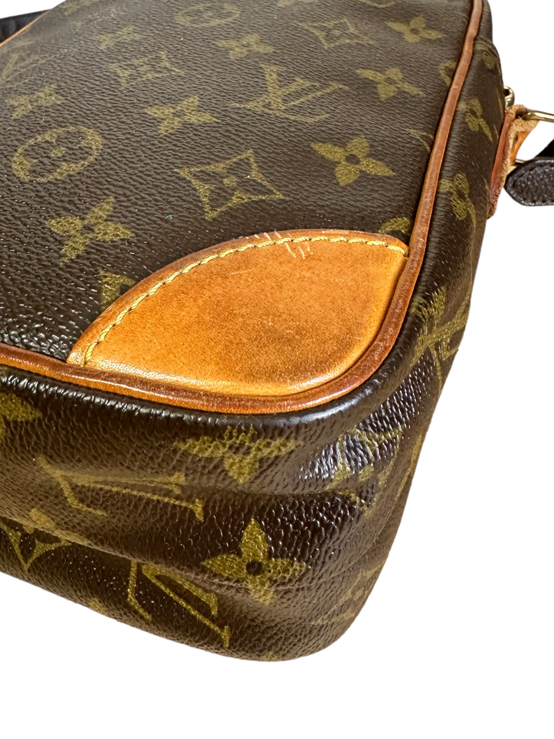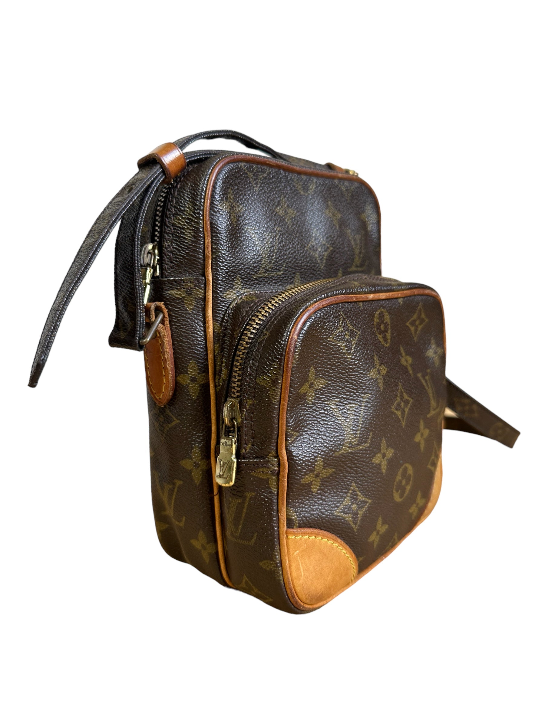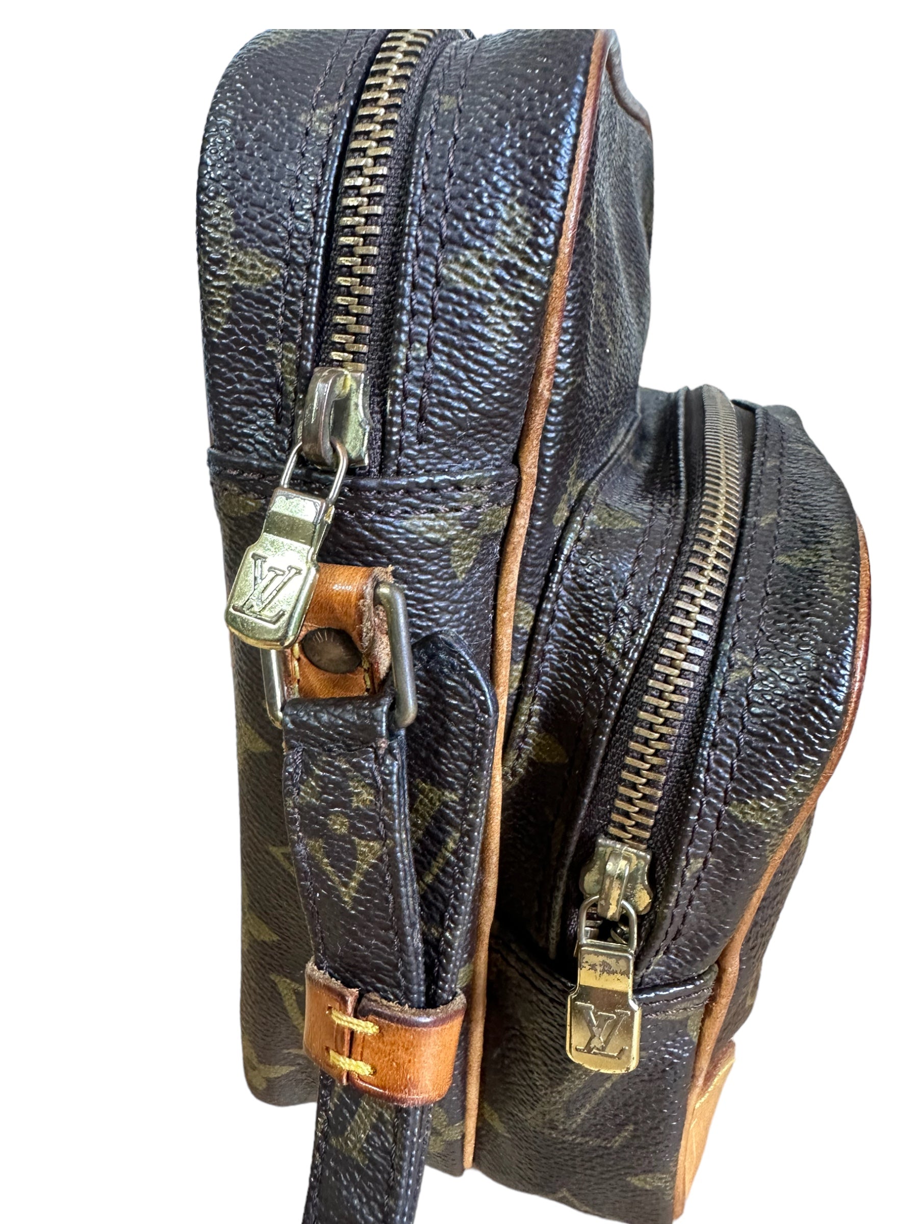 Louis Vuitton borsa vintage in tela monogram con tracolla regolabile e profili in vacchetta, dispone di due scomparti uno più ampio che può contenere un cellulare e una tasca applicata frontale. Lievi segni di usura sulla vacchetta e taschino interno vulcanizzato (vedi foto. Non viene spedito con dust bag.