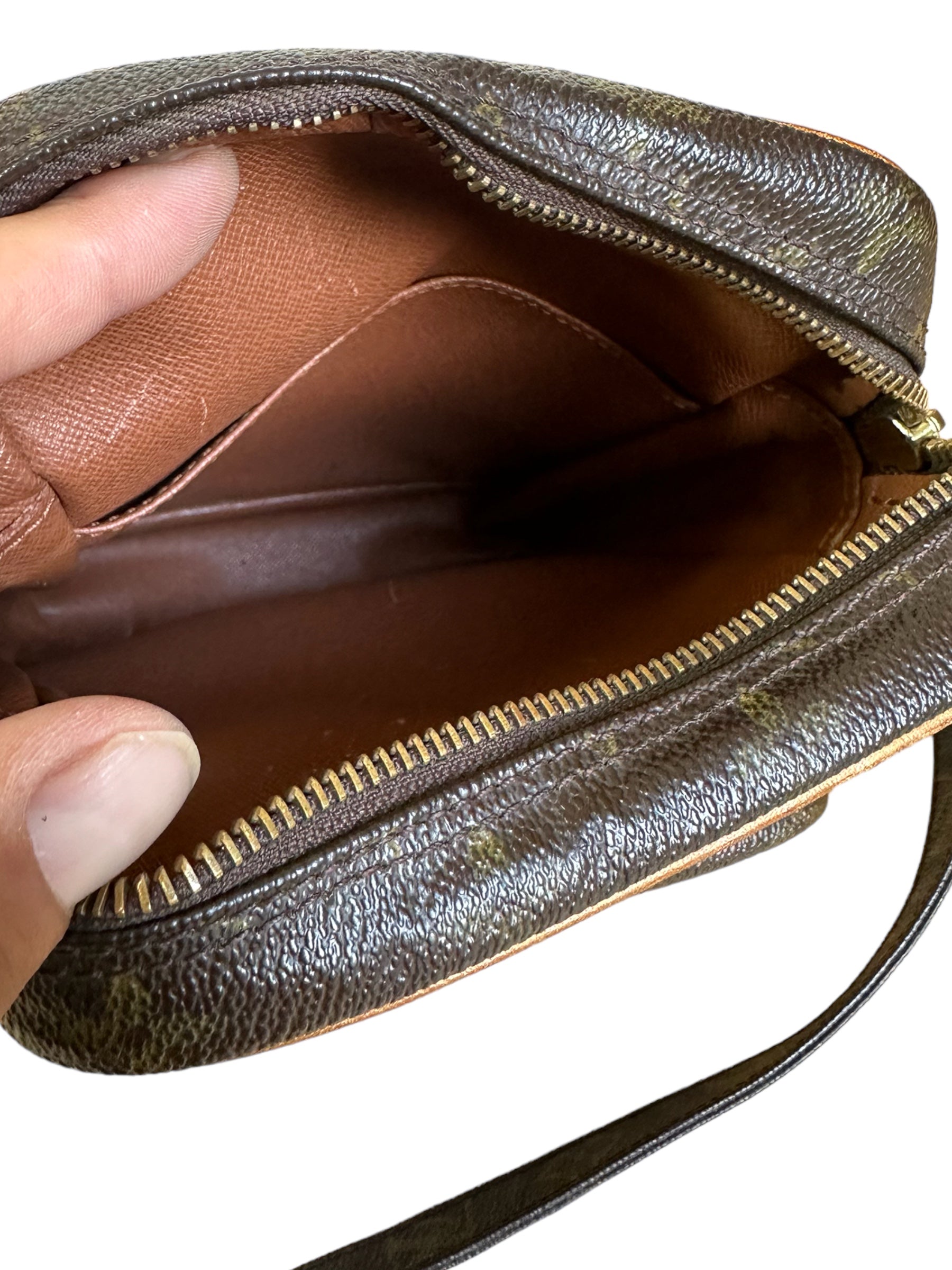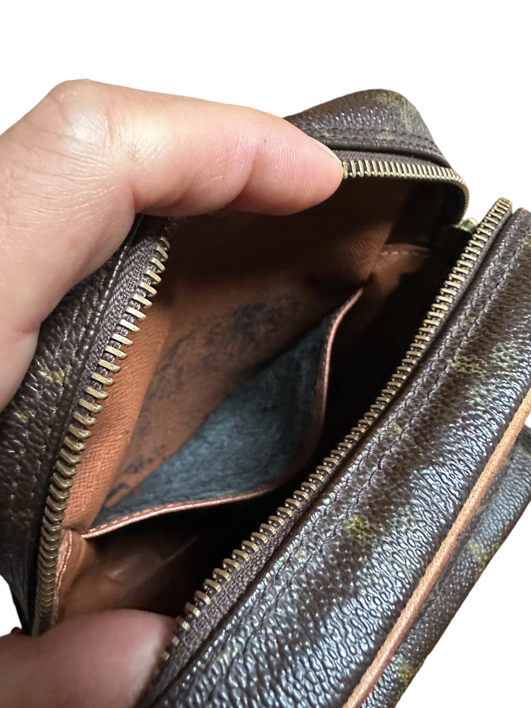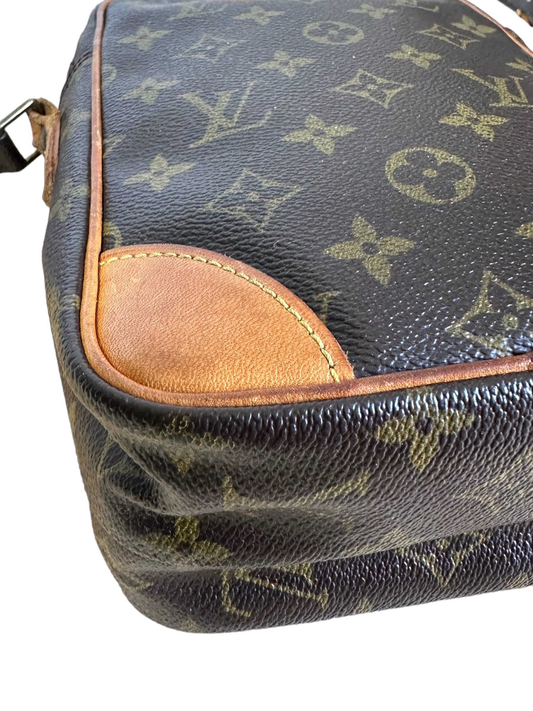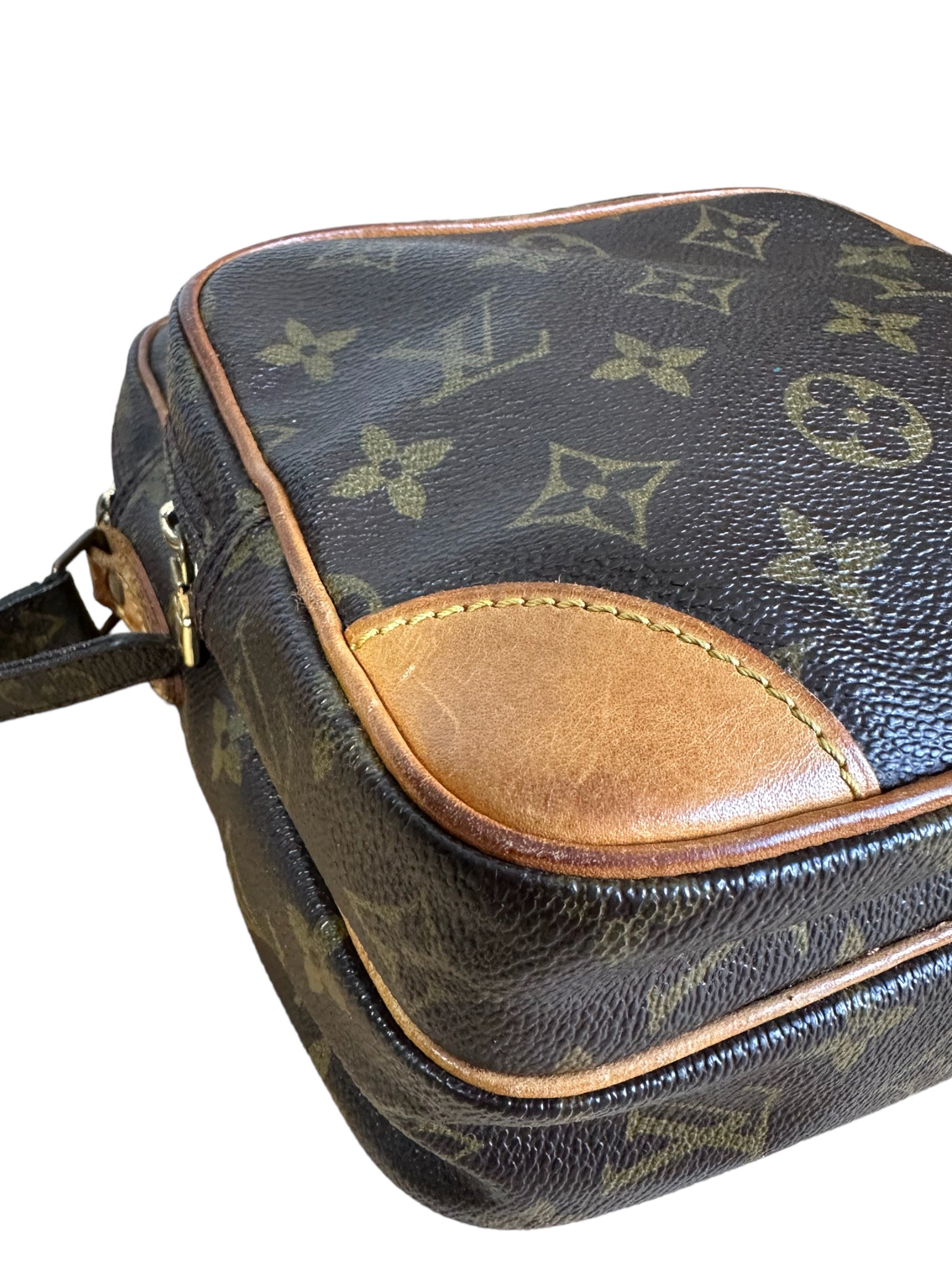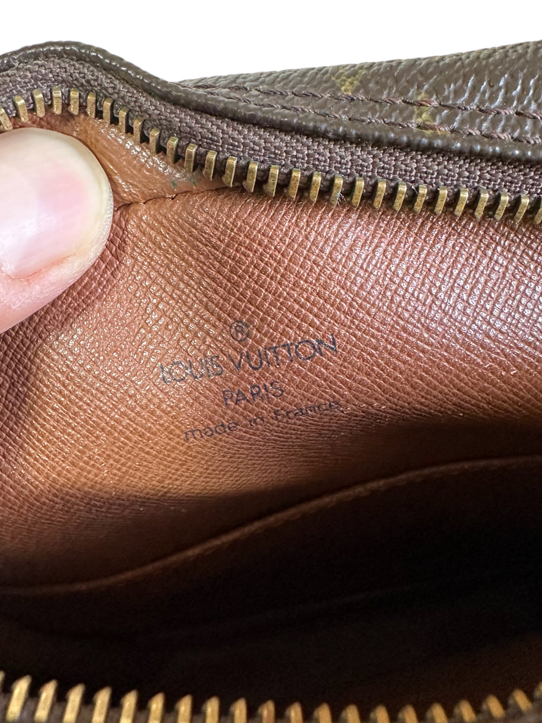 Louis Vuitton borsa vintage in tela monogram con tracolla regolabile e profili in vacchetta, dispone di due scomparti uno più ampio che può contenere un cellulare e una tasca applicata frontale. Lievi segni di usura sulla vacchetta e taschino interno vulcanizzato (vedi foto. Non viene spedito con dust bag.
