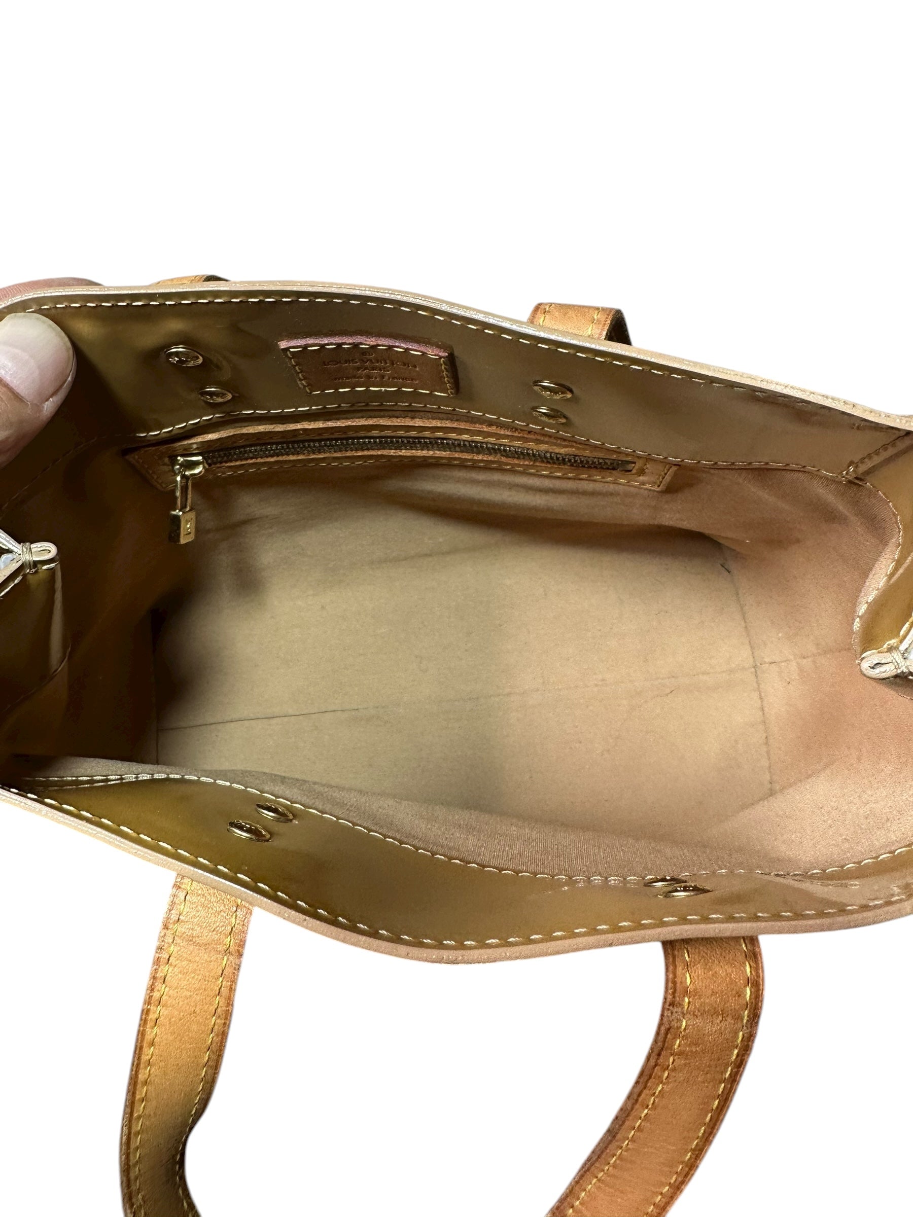 Borsa a mano in vernice Monogram Vernis color beige dorato con doppi manici in vacchetta naturale e finiture in metalleria dorata. Interno in tessuto tono su tono con tasca piatta chiusa da zip. Codice interno: MI0085.