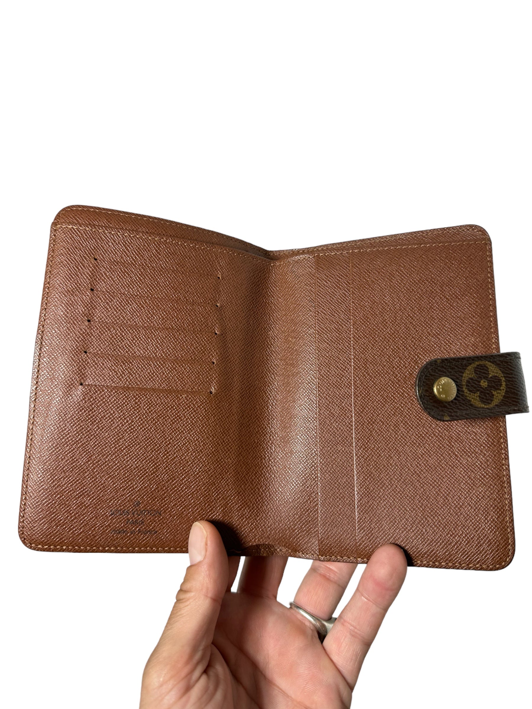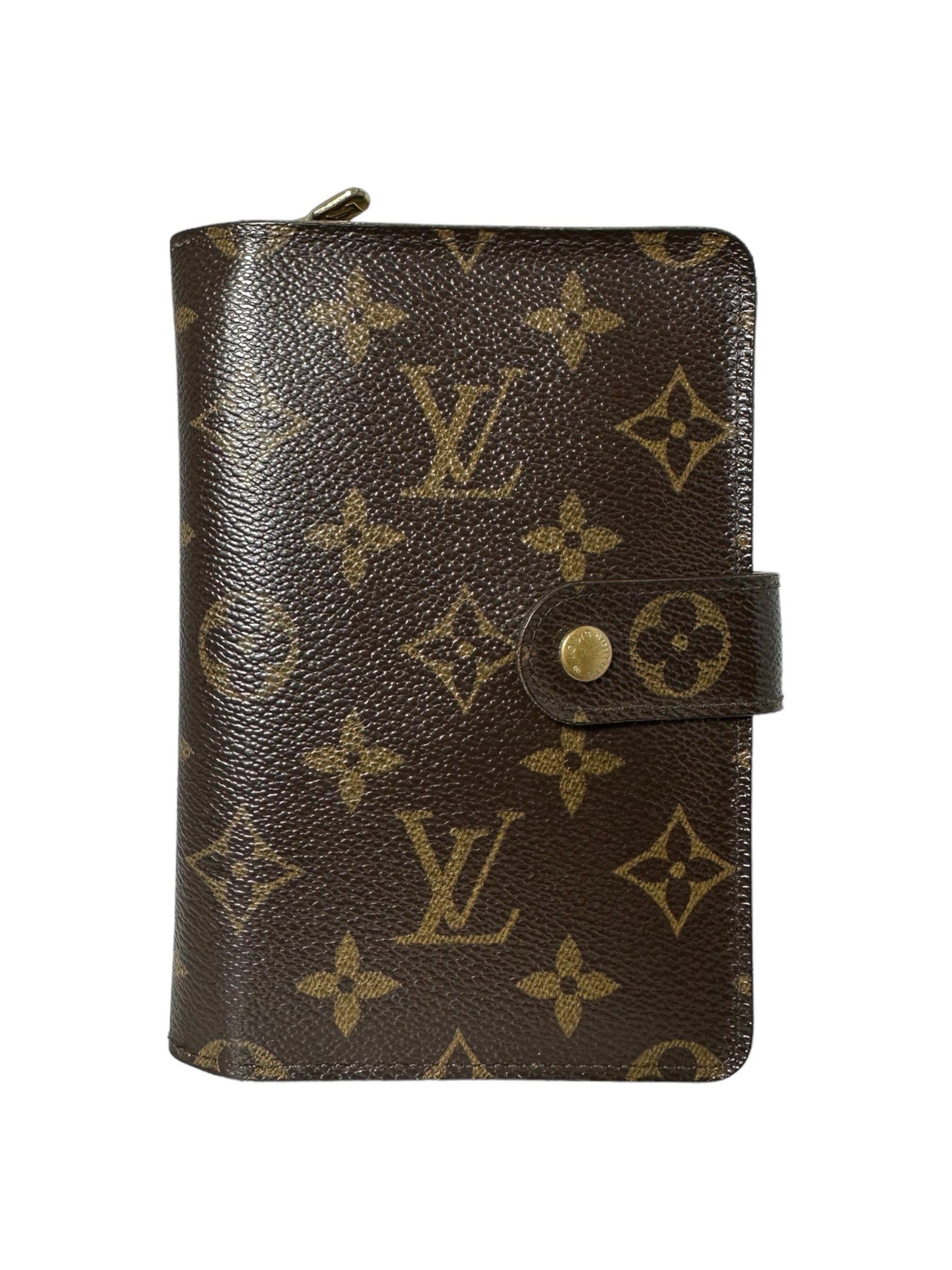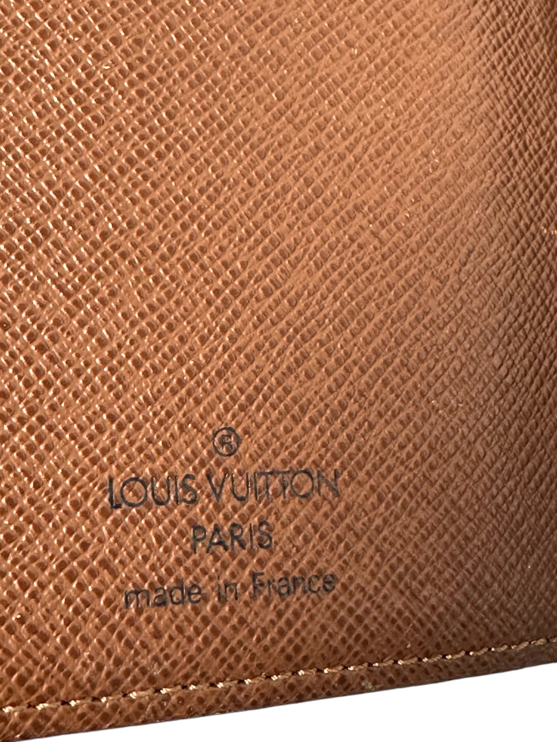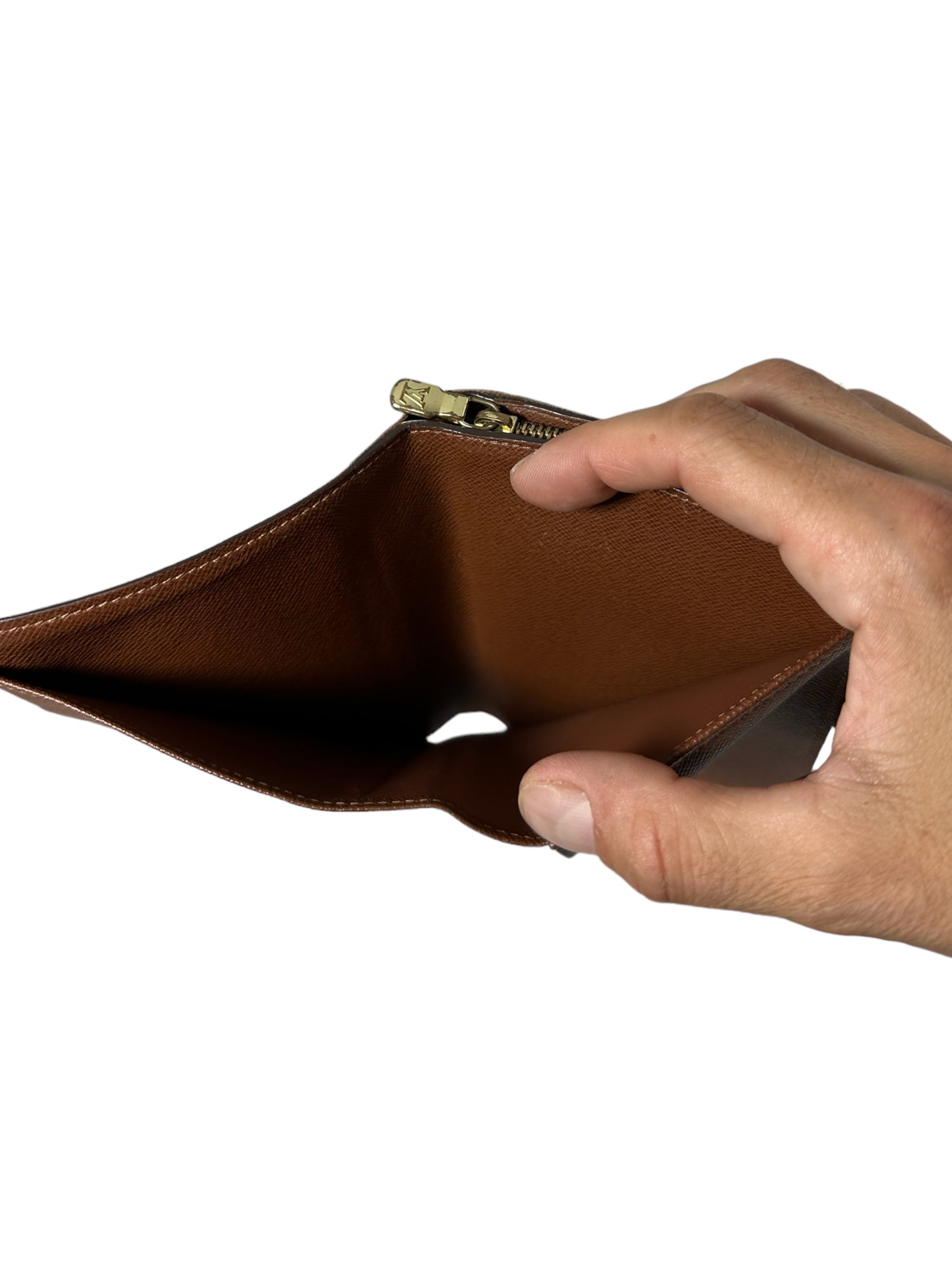 Louis Vuitton portafoglio vintage unisex in tela monogram a due scompartimenti che comprendono un portamonete con chiusura a zip in ottone (lievissimi segni di usura sul tirante), porta banconote e porta carte chiusi con bottoni a pressione. Non viene spedito con scatola originale e dust bag.