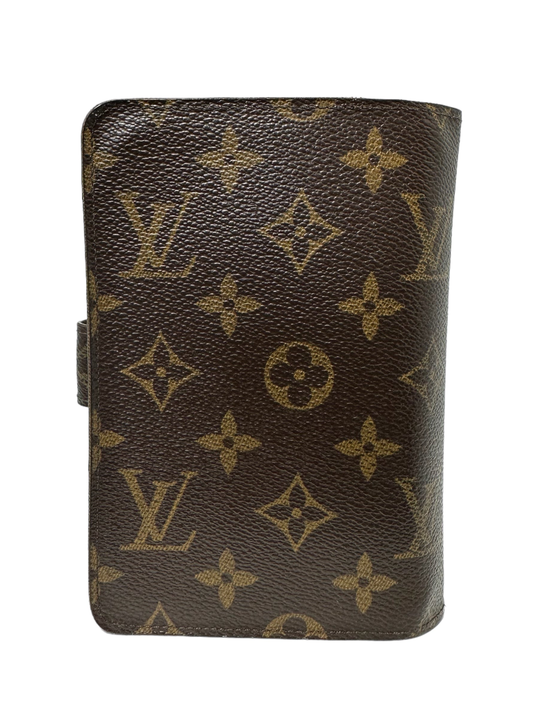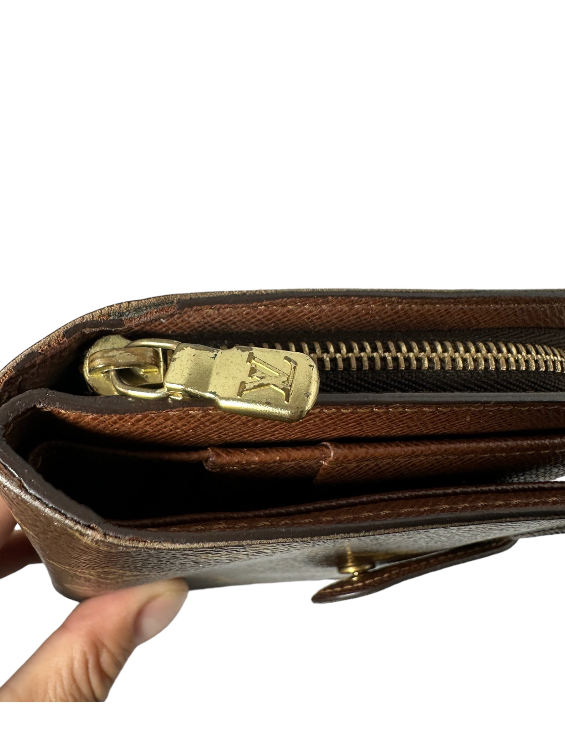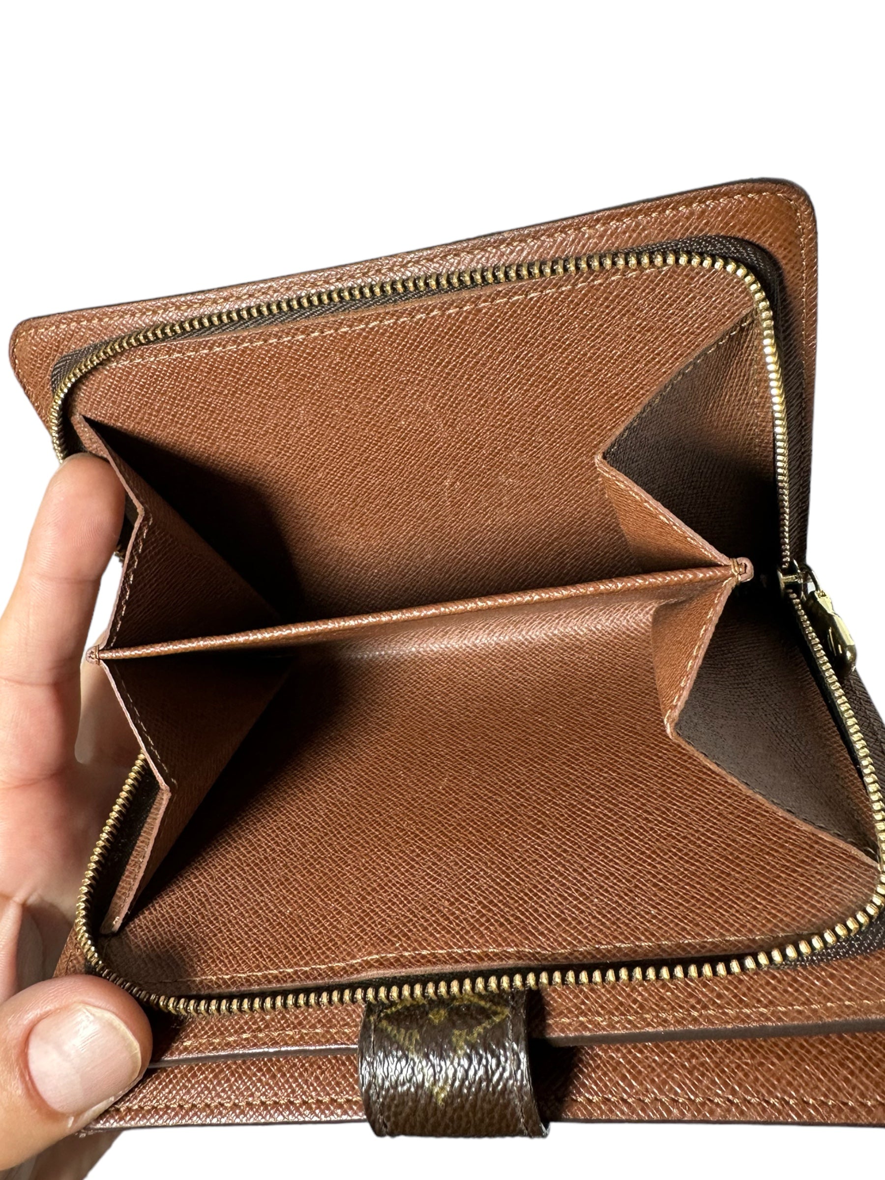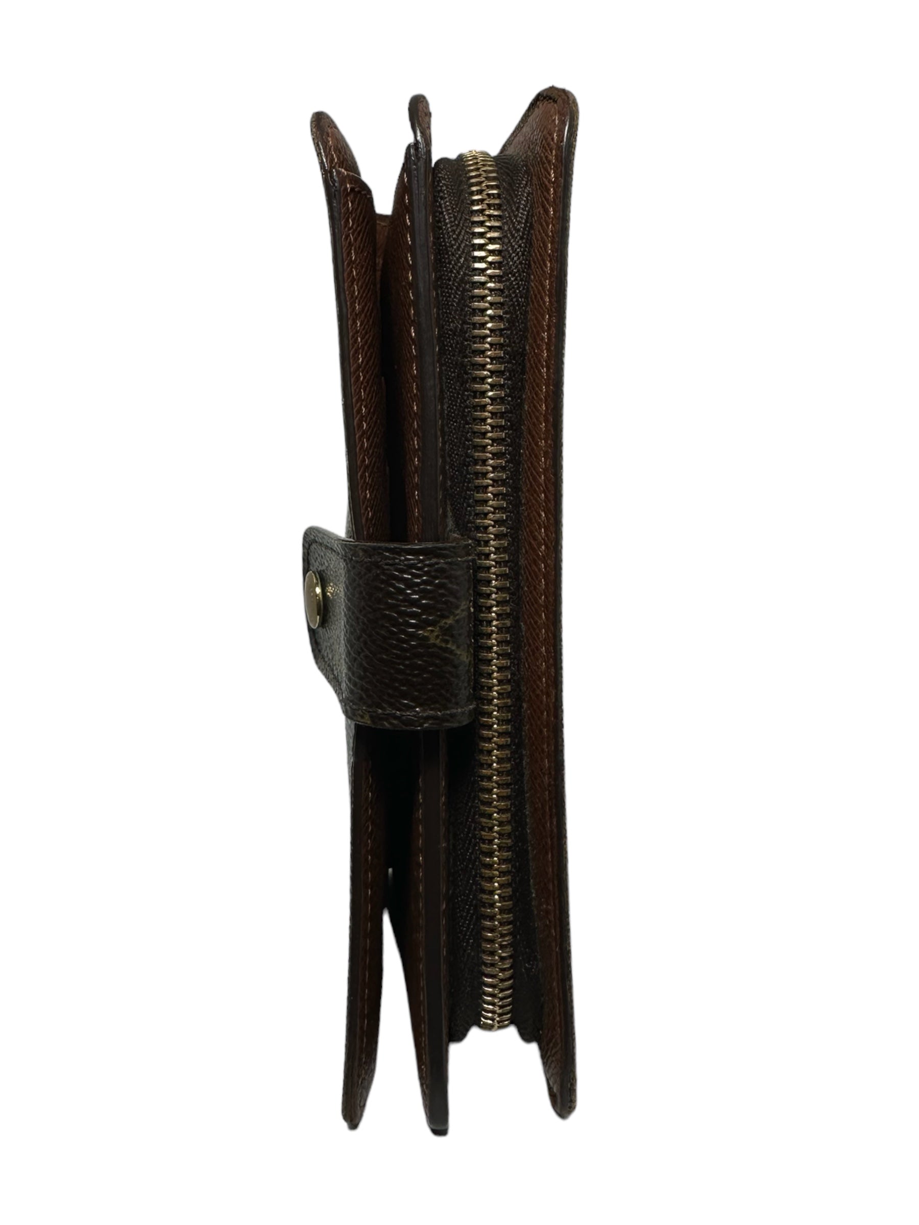Louis Vuitton portafoglio vintage unisex in tela monogram a due scompartimenti che comprendono un portamonete con chiusura a zip in ottone (lievissimi segni di usura sul tirante), porta banconote e porta carte chiusi con bottoni a pressione. Non viene spedito con scatola originale e dust bag.