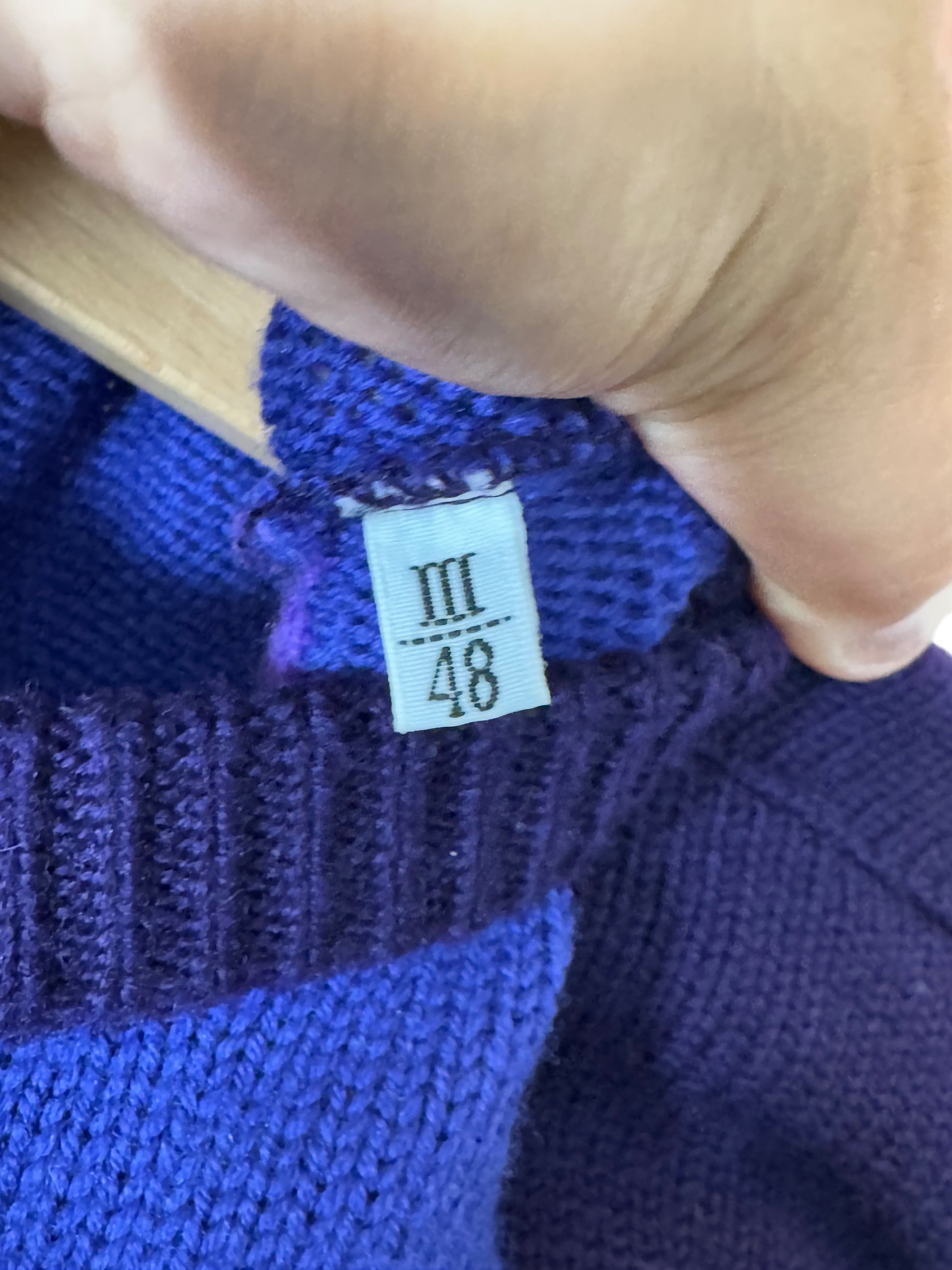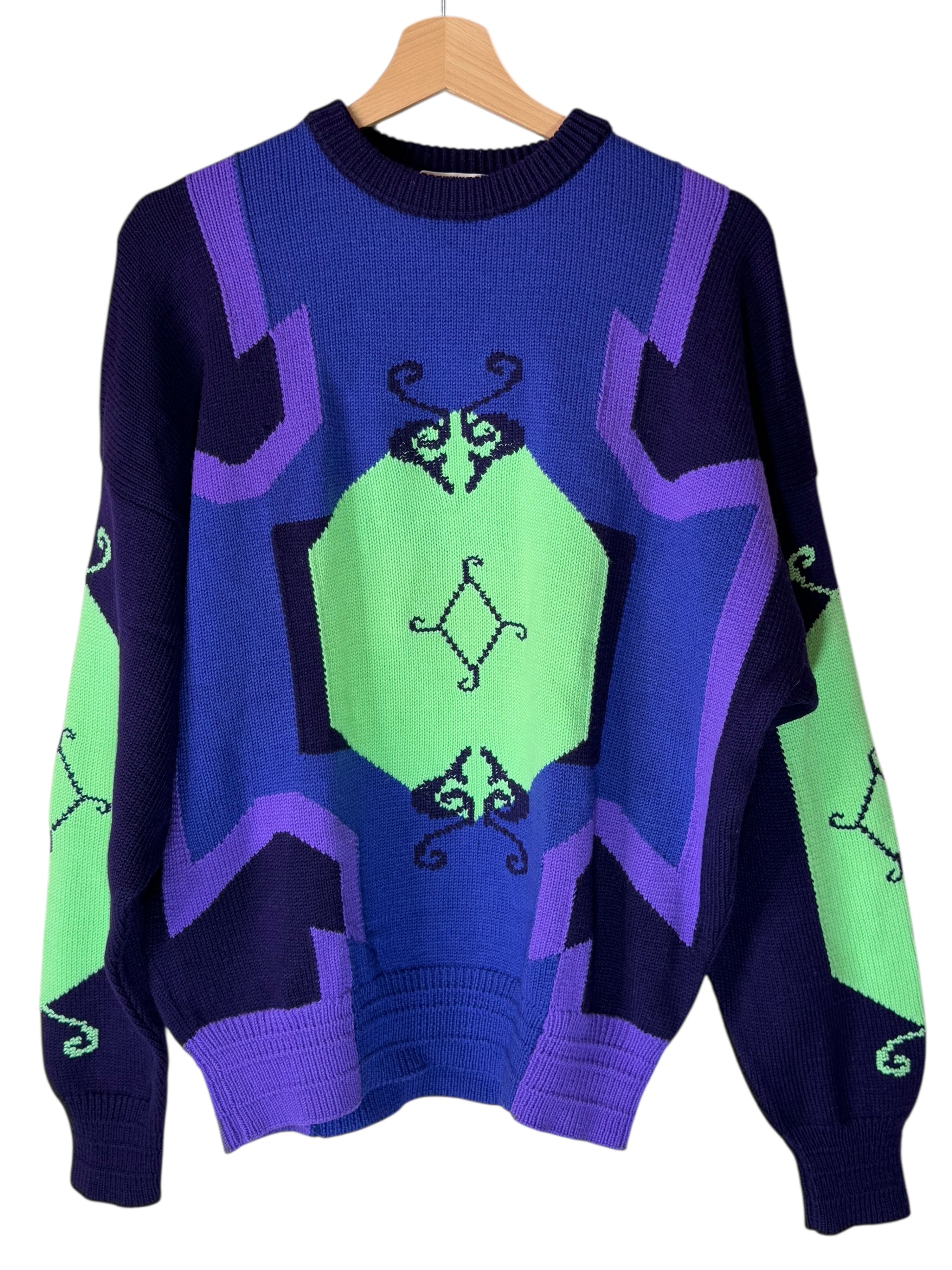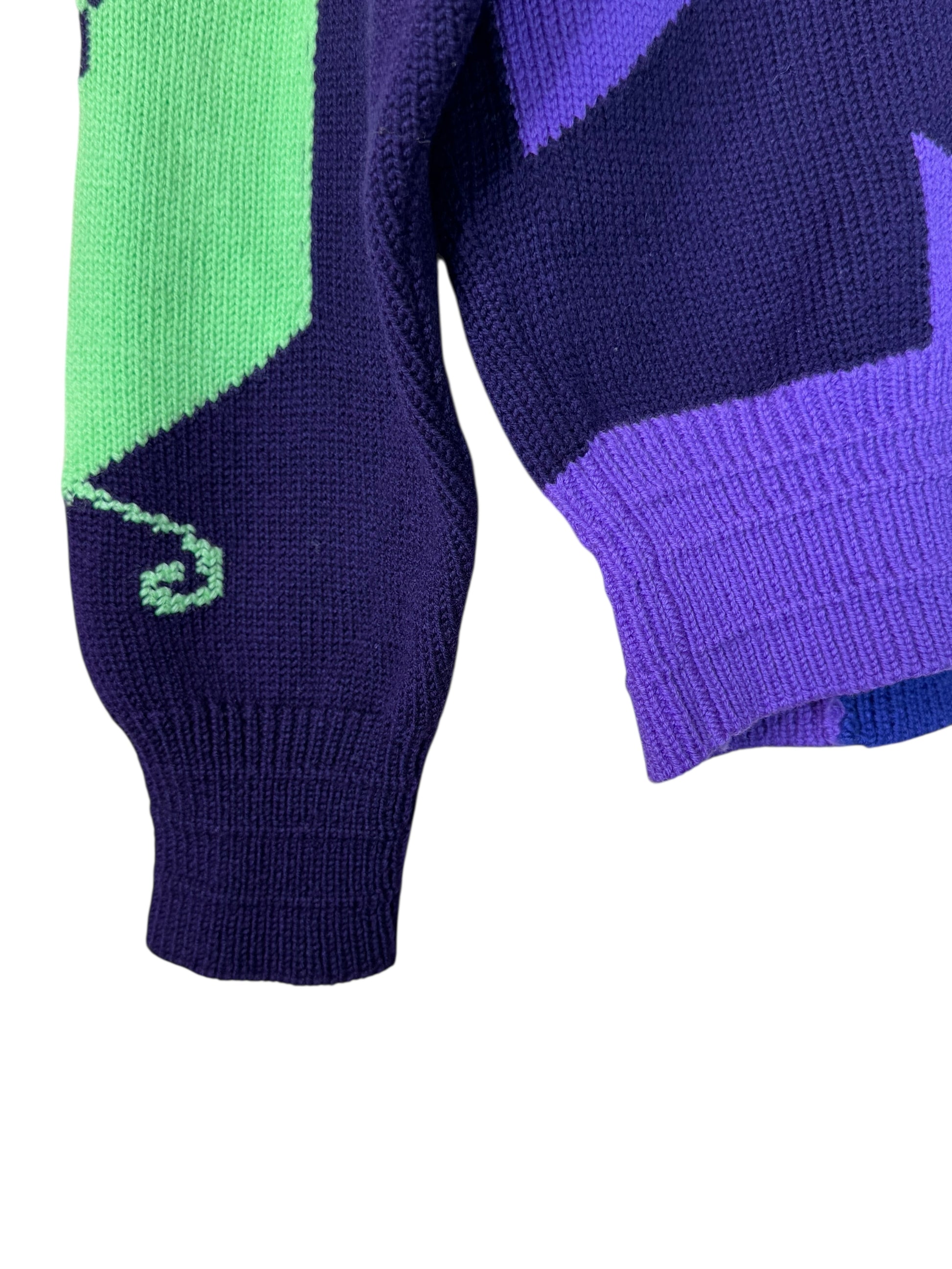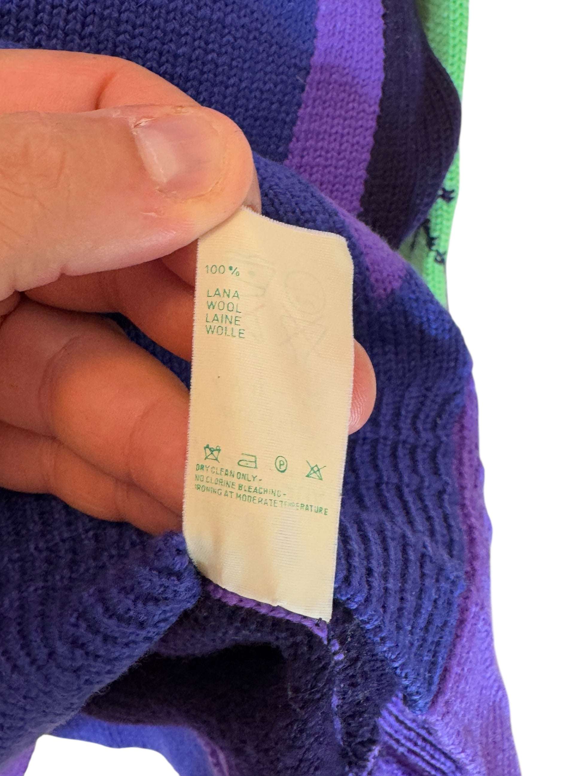 Raro maglione vintage Gianni Versace, realizzato in 100% lana vergine, con una grafica geometrica anni ’80/’90 in tonalità viola, verde e blu. Capo originale Made in Italy, etichetta Gianni Versace d’epoca, taglia 48 (vestibilità M/L). Ideale per collezionisti e appassionati di moda vintage di lusso.