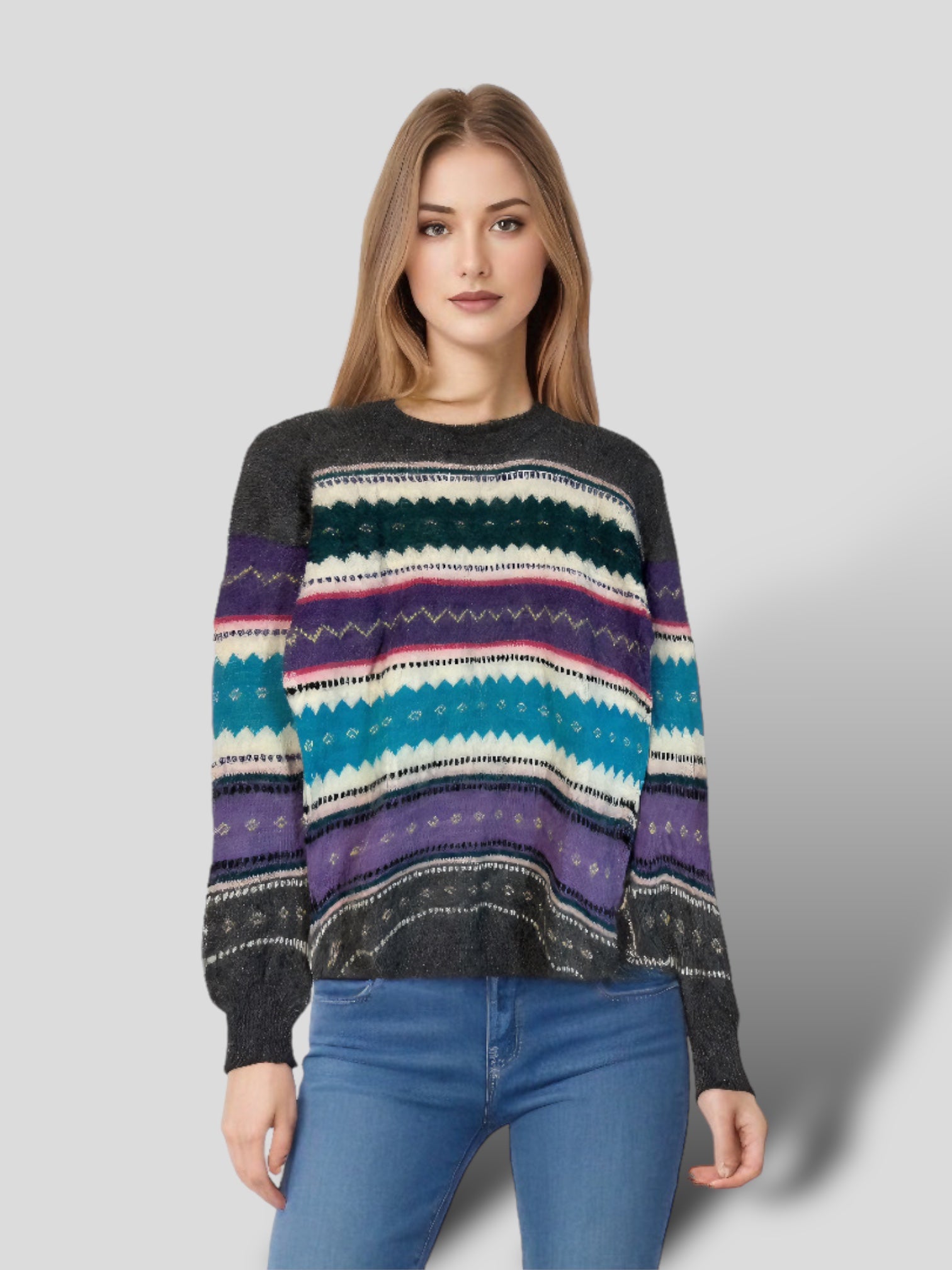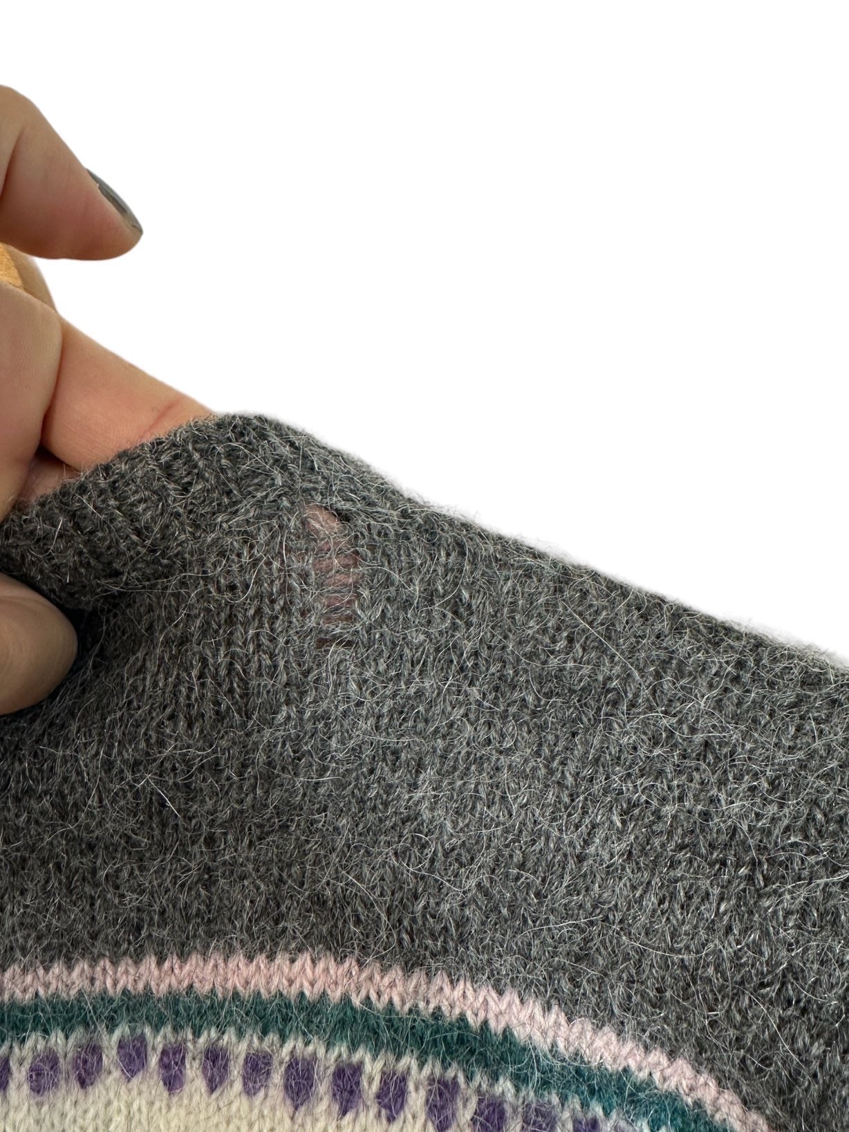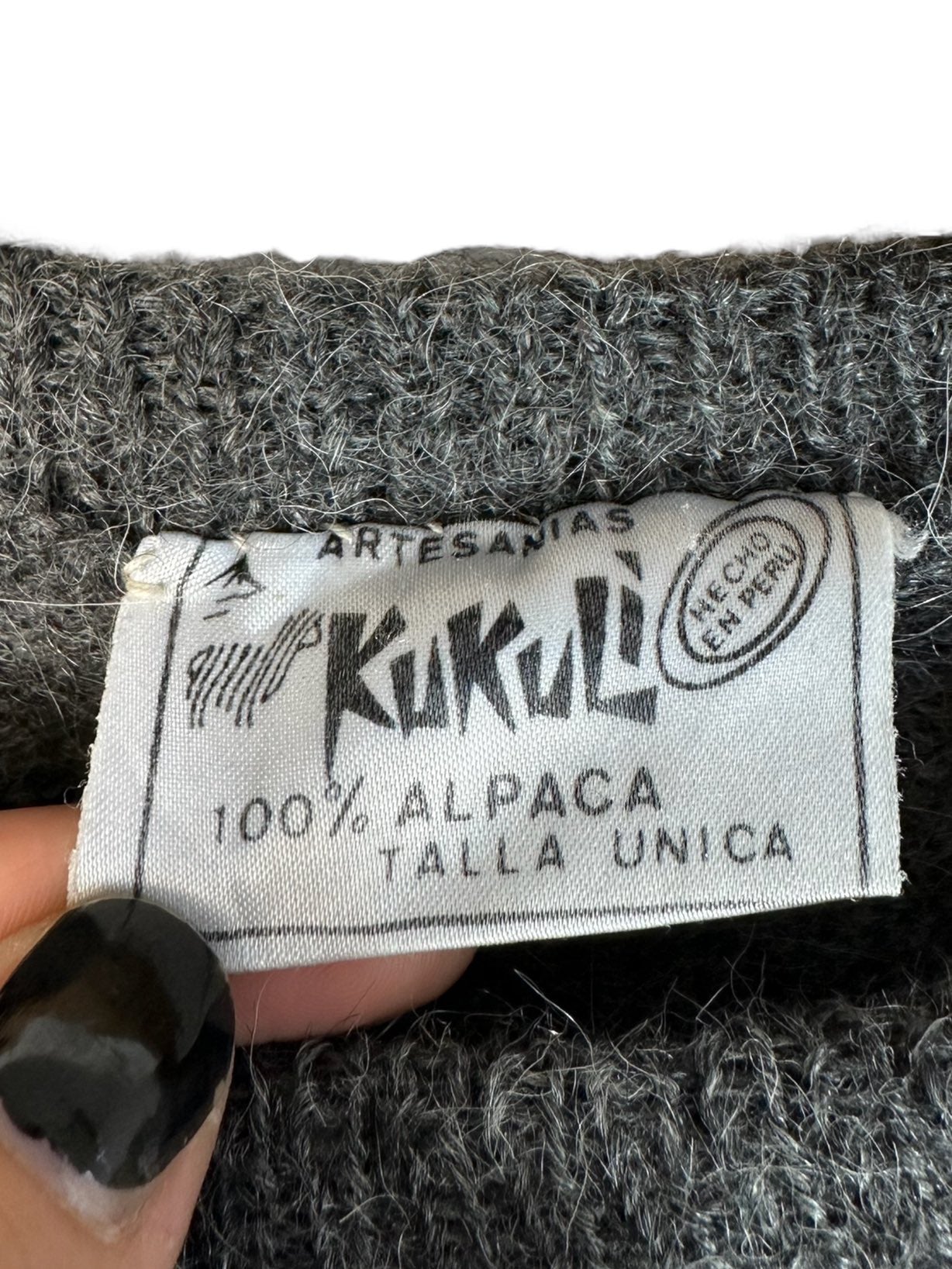 Maglione vintage made in Perù 100% alpaca girocollo a maniche lunghe con lavorazione a tre colori. Segno di usura nella parte posteriore all’altezza del collo. Tg. S