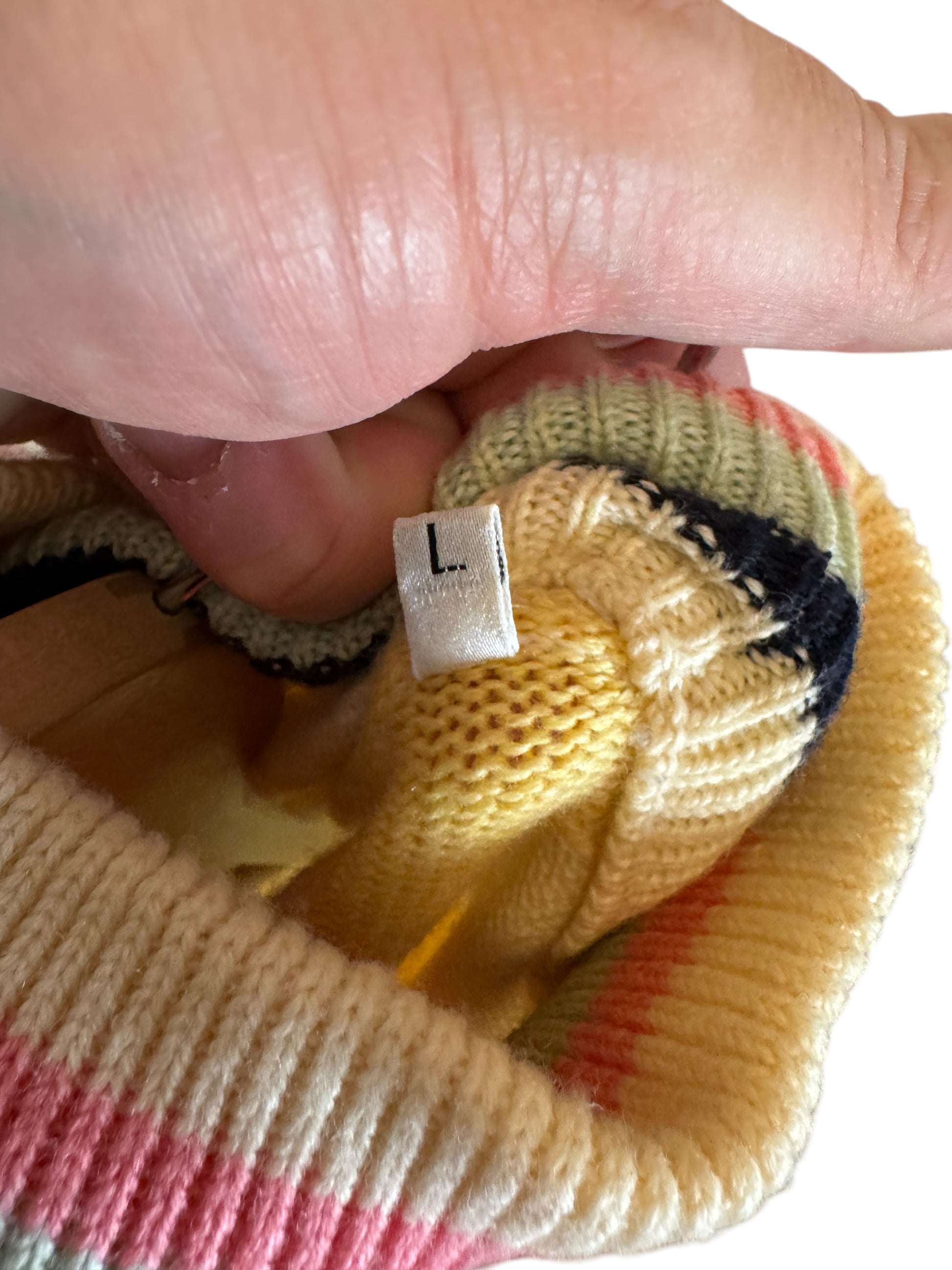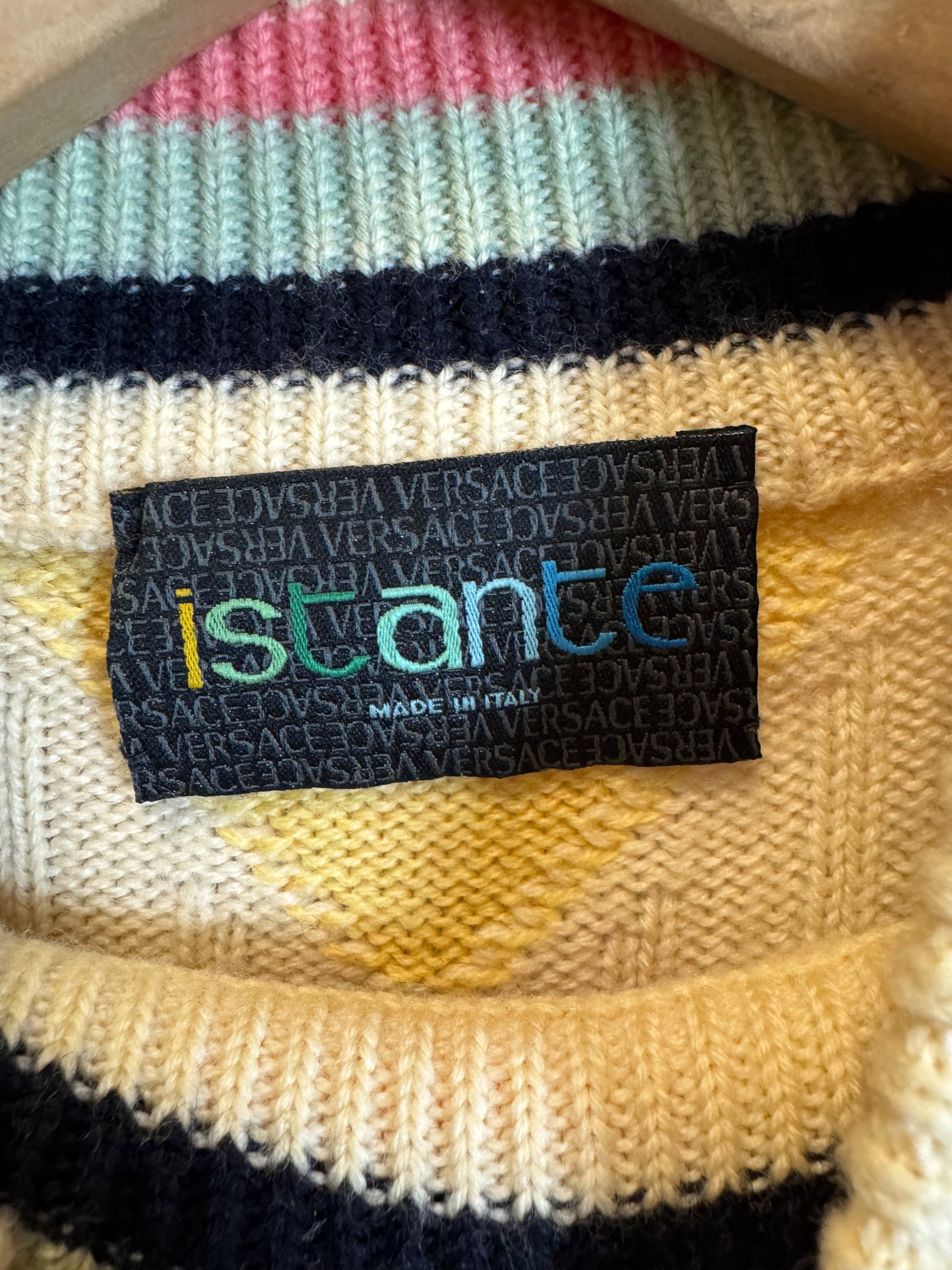 Maglione vintage firmato Versace Istante, realizzato in Italia. Questo capo unico si distingue per il suo design argyle con tonalità pastello (giallo, rosa, verde e azzurro) e righe multicolore su polsini e collo. Il tessuto in maglia presenta una lavorazione di alta qualità, tipica del brand. Taglia indicata L (50). Ideale per gli amanti dello stile retrò e per chi cerca capi esclusivi e raffinati.