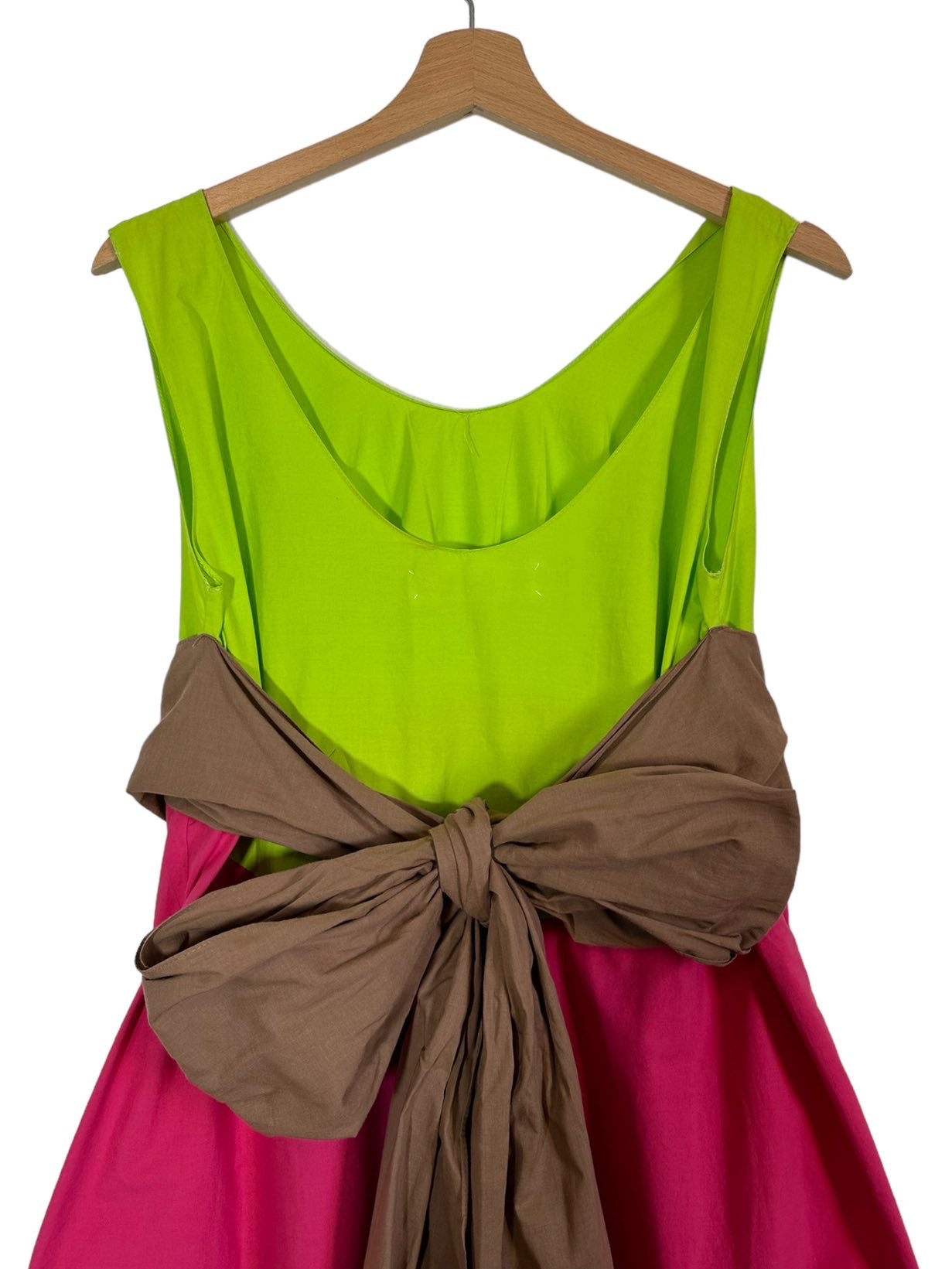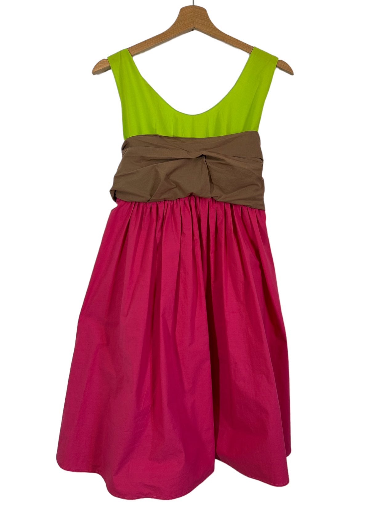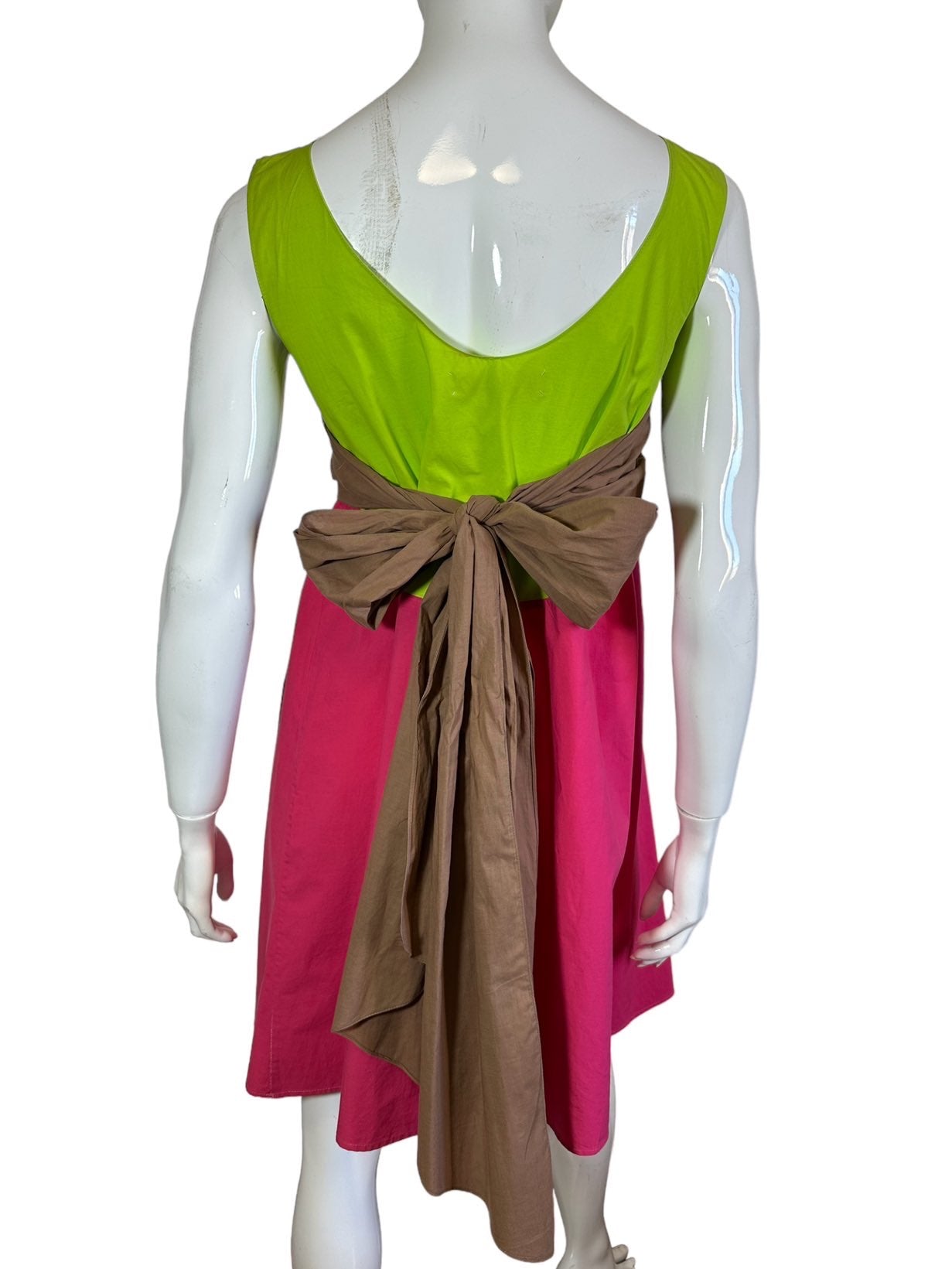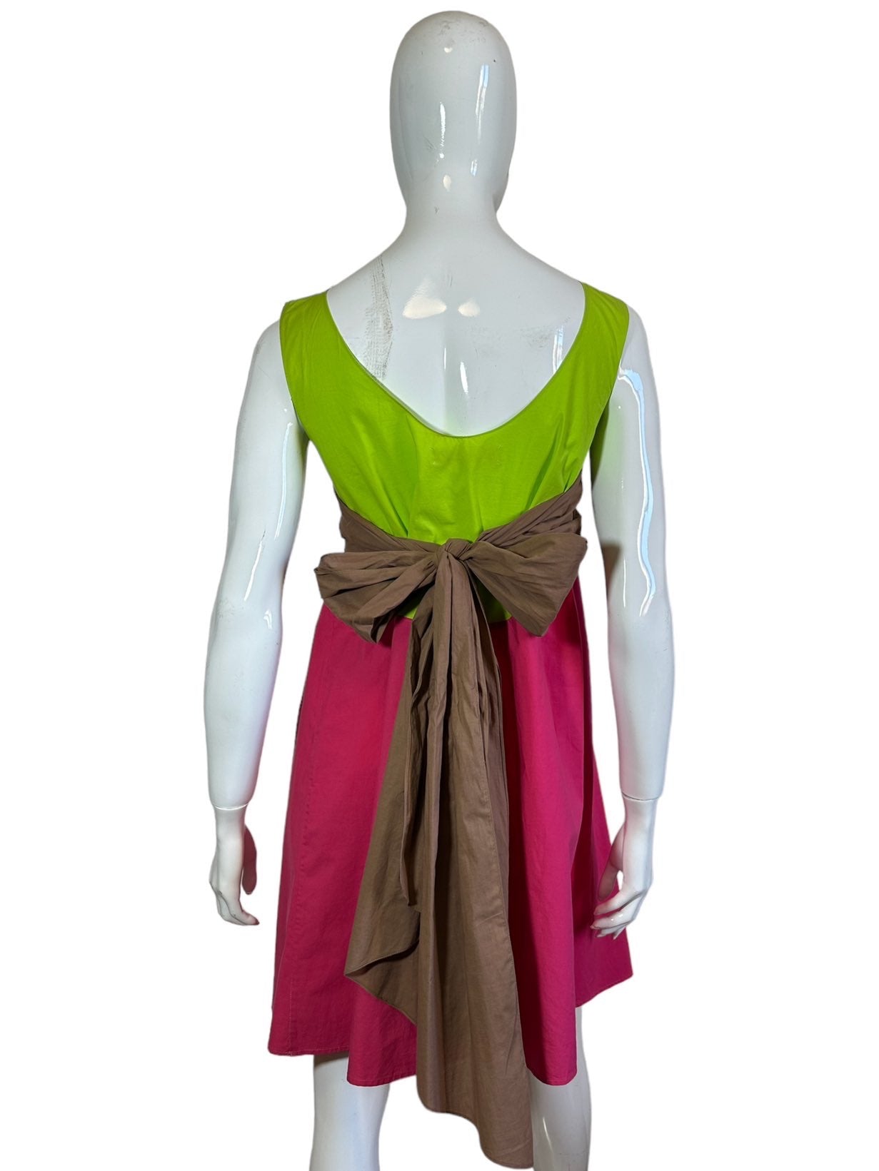 Marni abito 100% cotone fuxia, verde acido e marrone con inserto a fascia sul seno che va a formare un fiocco sulla schiena. Lieve segno di usura sul retro. Tg. 42