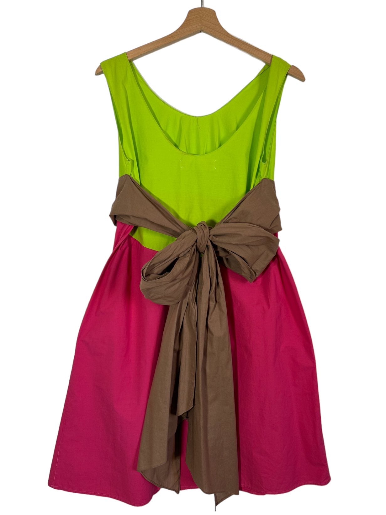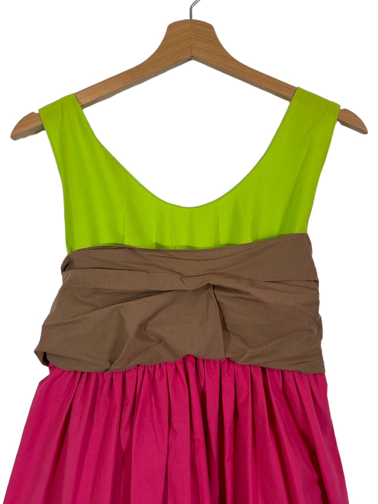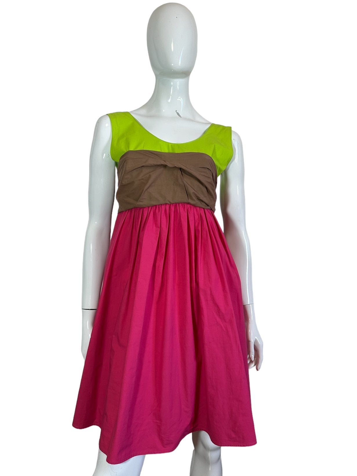 Marni abito 100% cotone fuxia, verde acido e marrone con inserto a fascia sul seno che va a formare un fiocco sulla schiena. Lieve segno di usura sul retro. Tg. 42