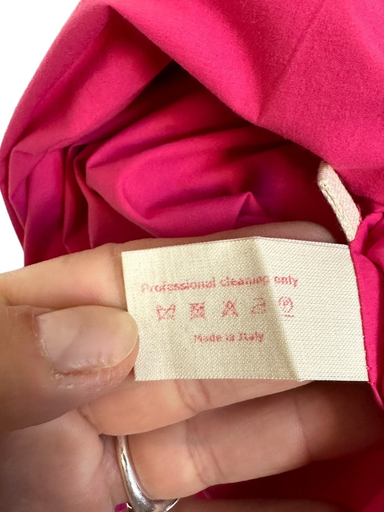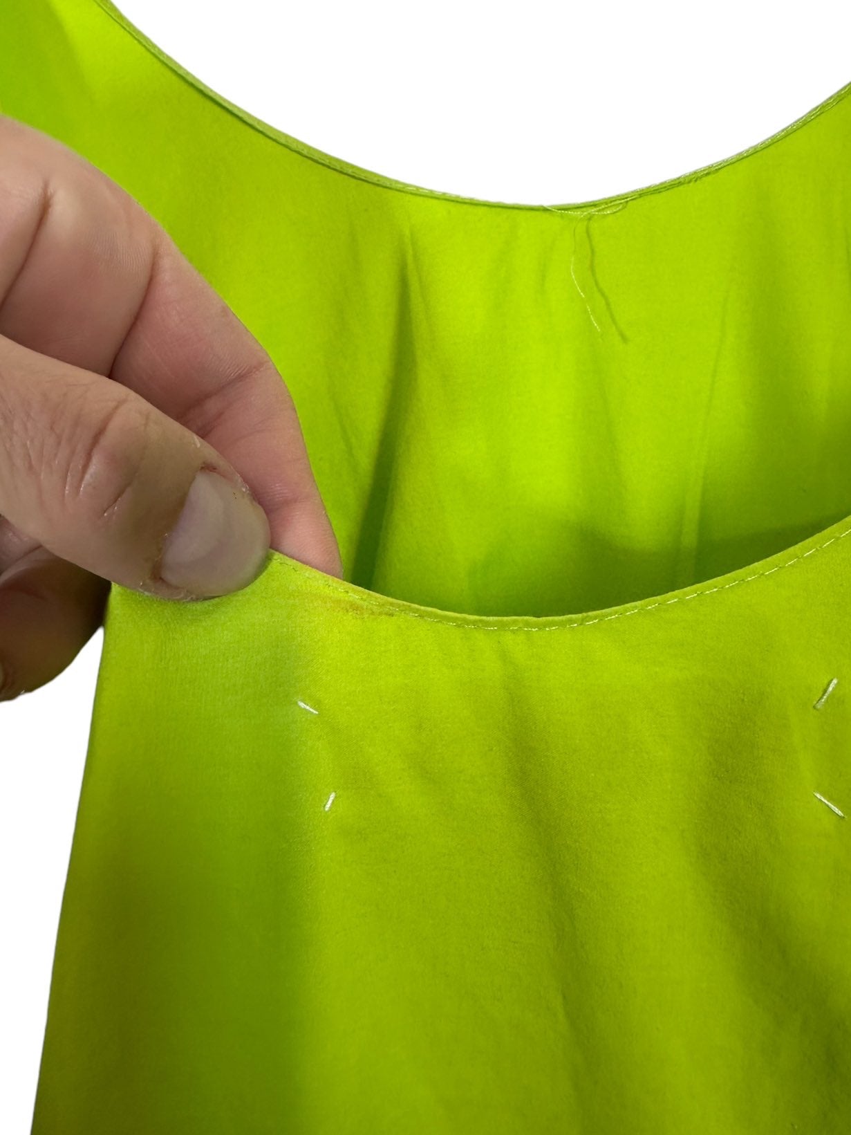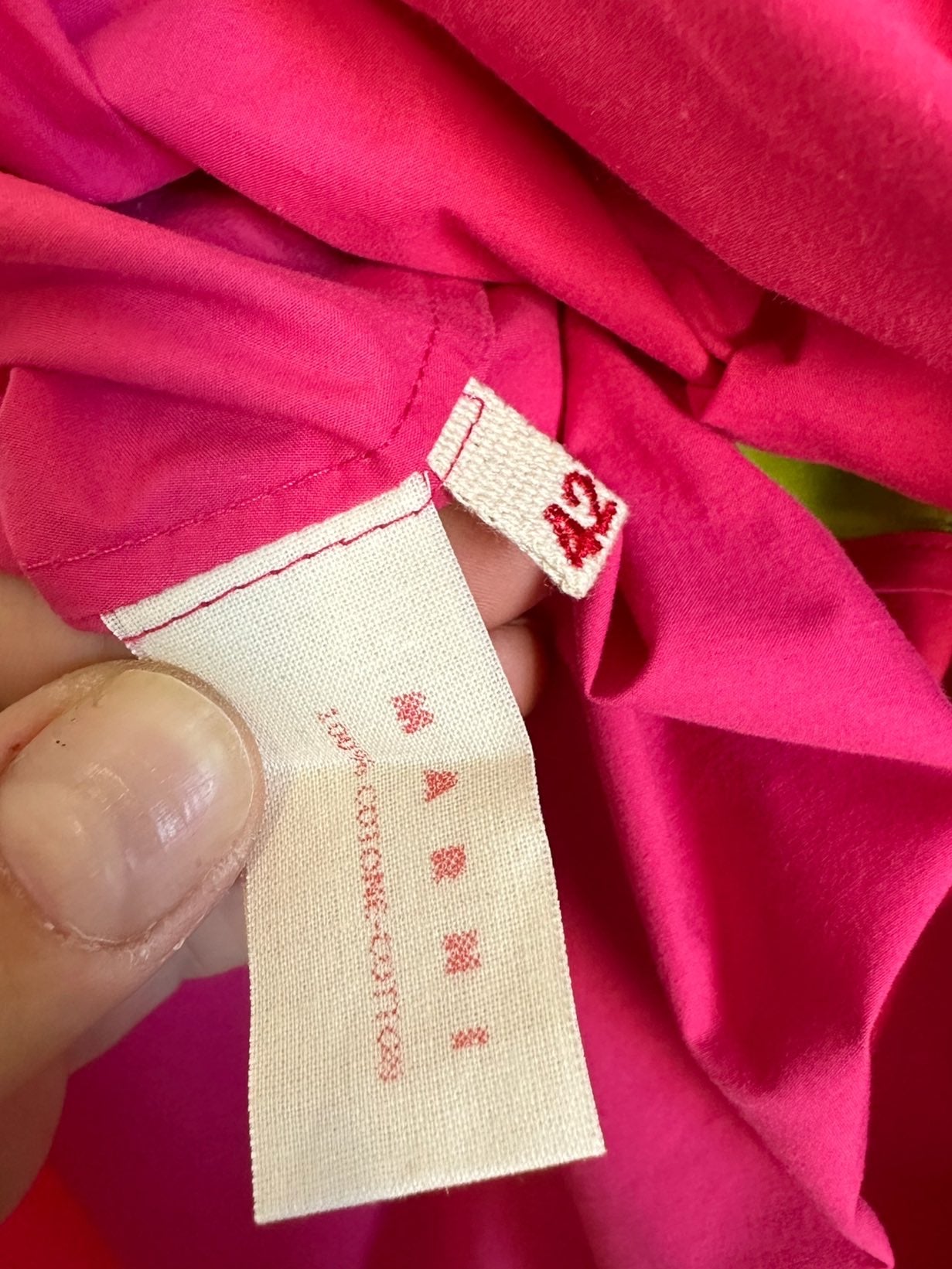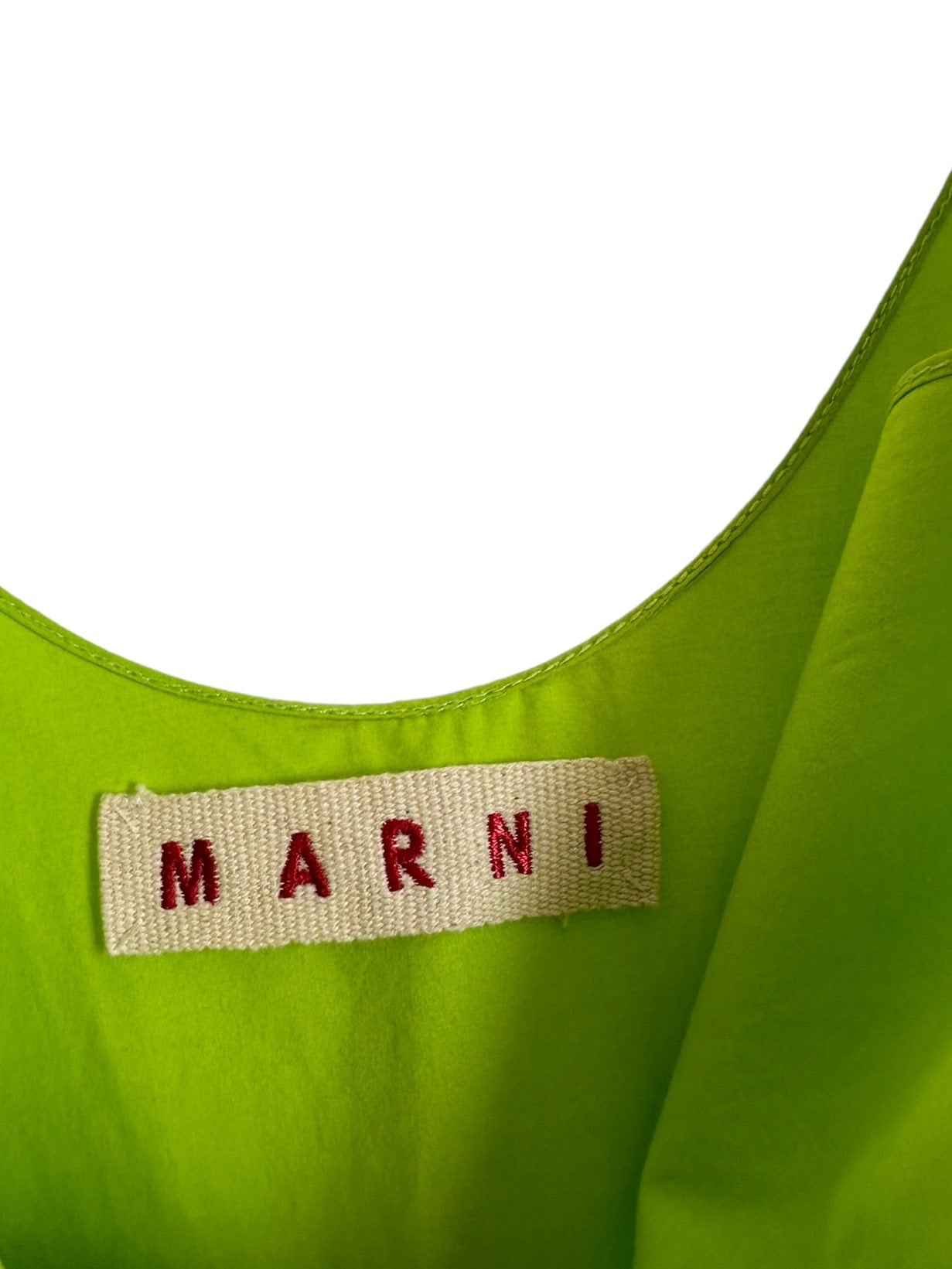 Marni abito 100% cotone fuxia, verde acido e marrone con inserto a fascia sul seno che va a formare un fiocco sulla schiena. Lieve segno di usura sul retro. Tg. 42