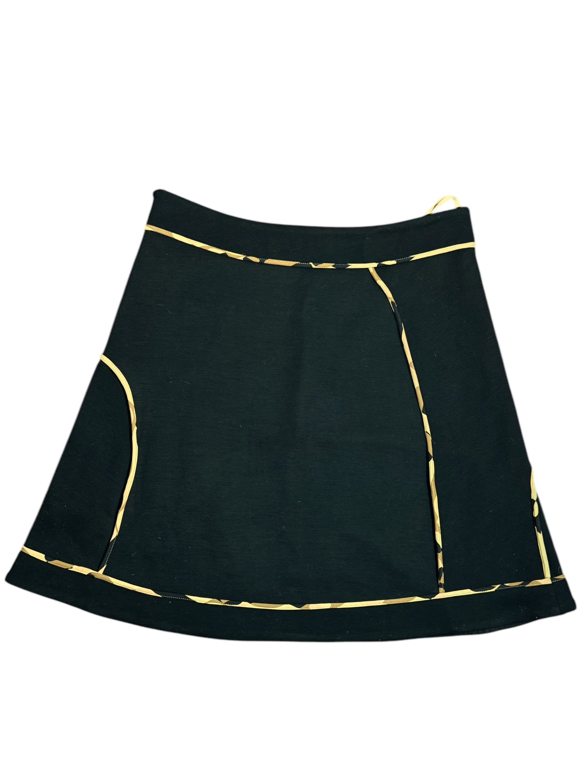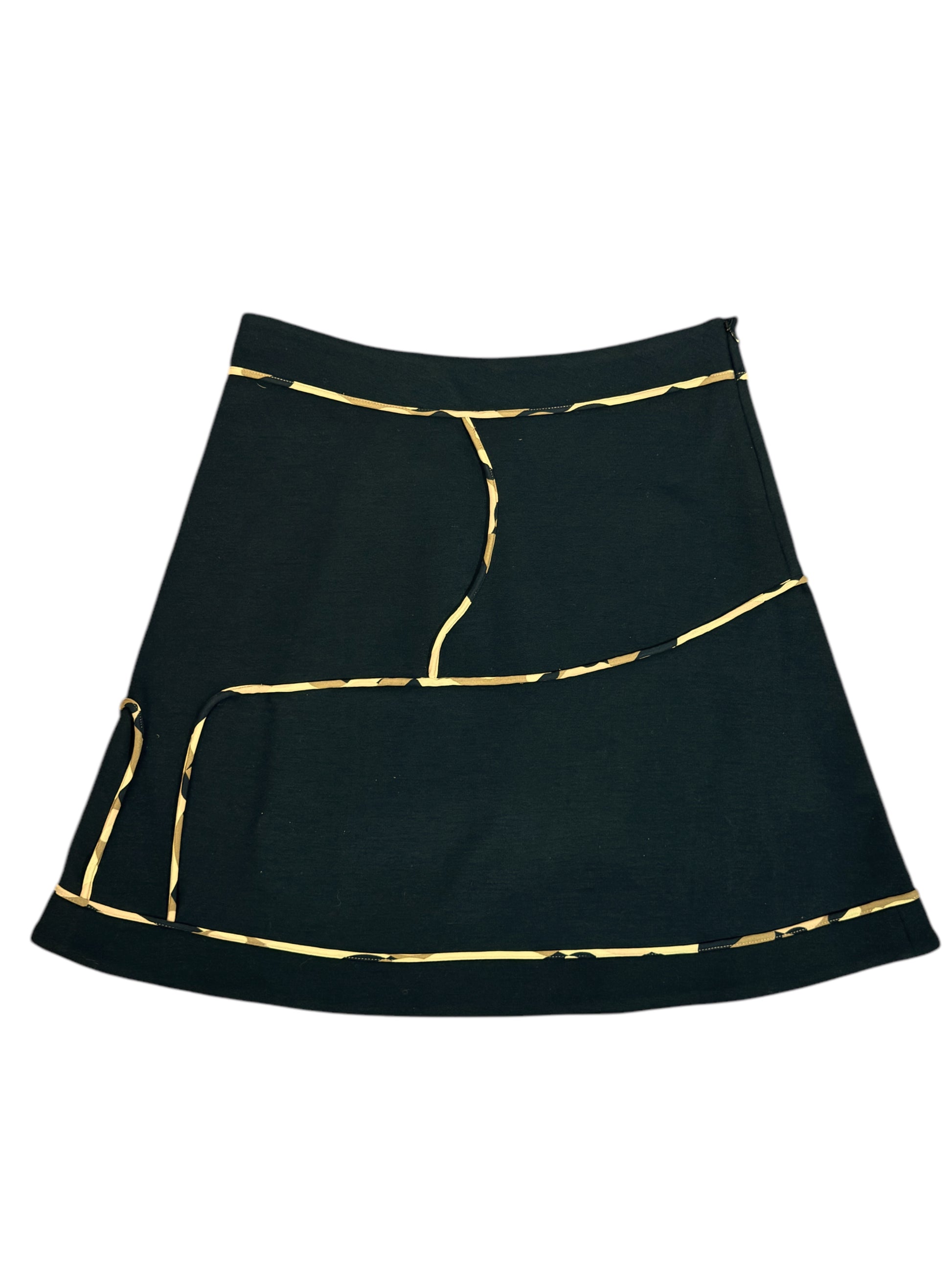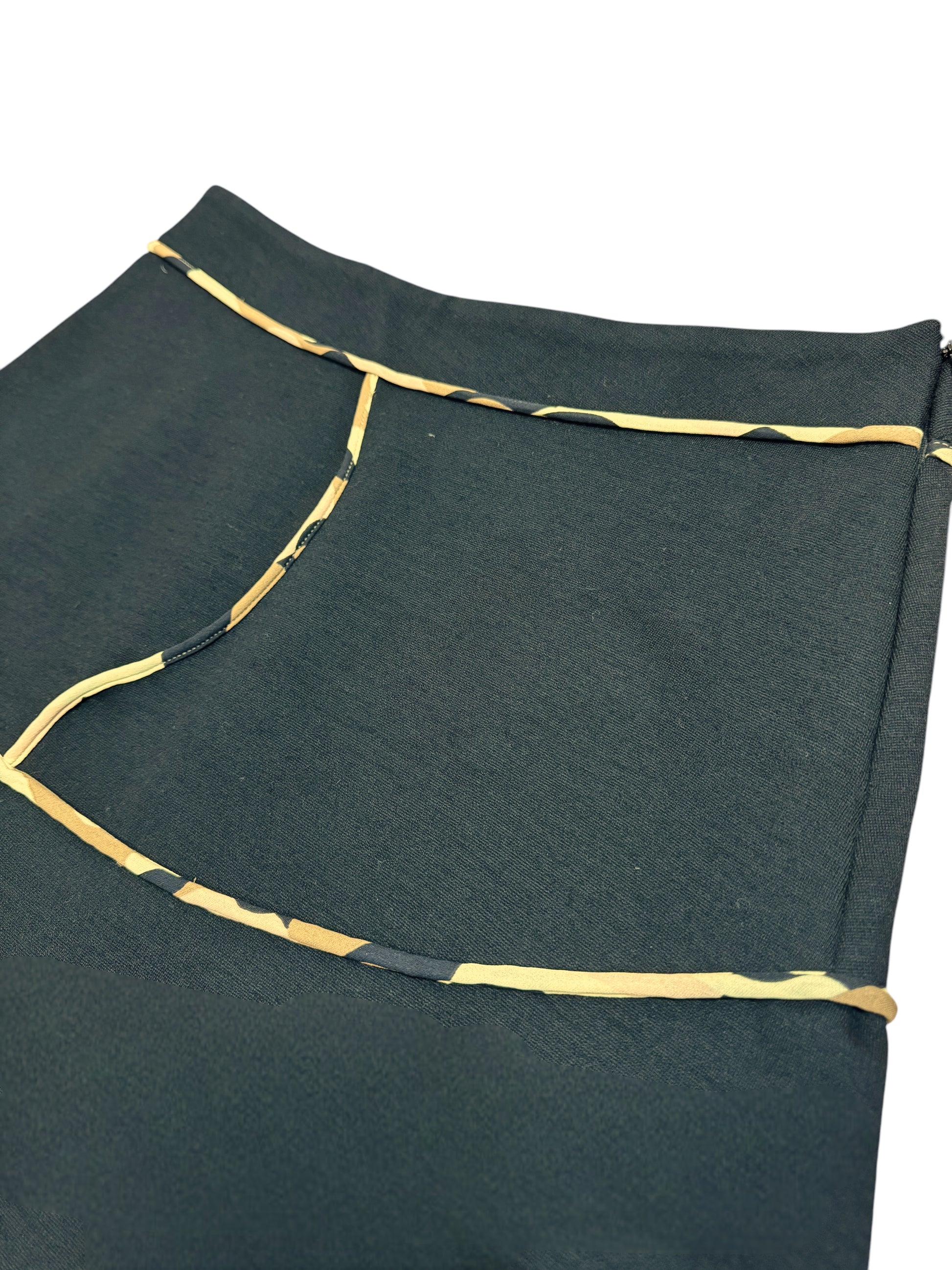 Gonna vintage firmata Marni, realizzata in lana di alta qualità. Il design strutturato presenta linee geometriche in tessuto stampato militare a contrasto che aggiungono un tocco grafico ed elegante. La chiusura laterale con cerniera invisibile garantisce una vestibilità perfetta, mentre la silhouette svasata dona movimento al capo.