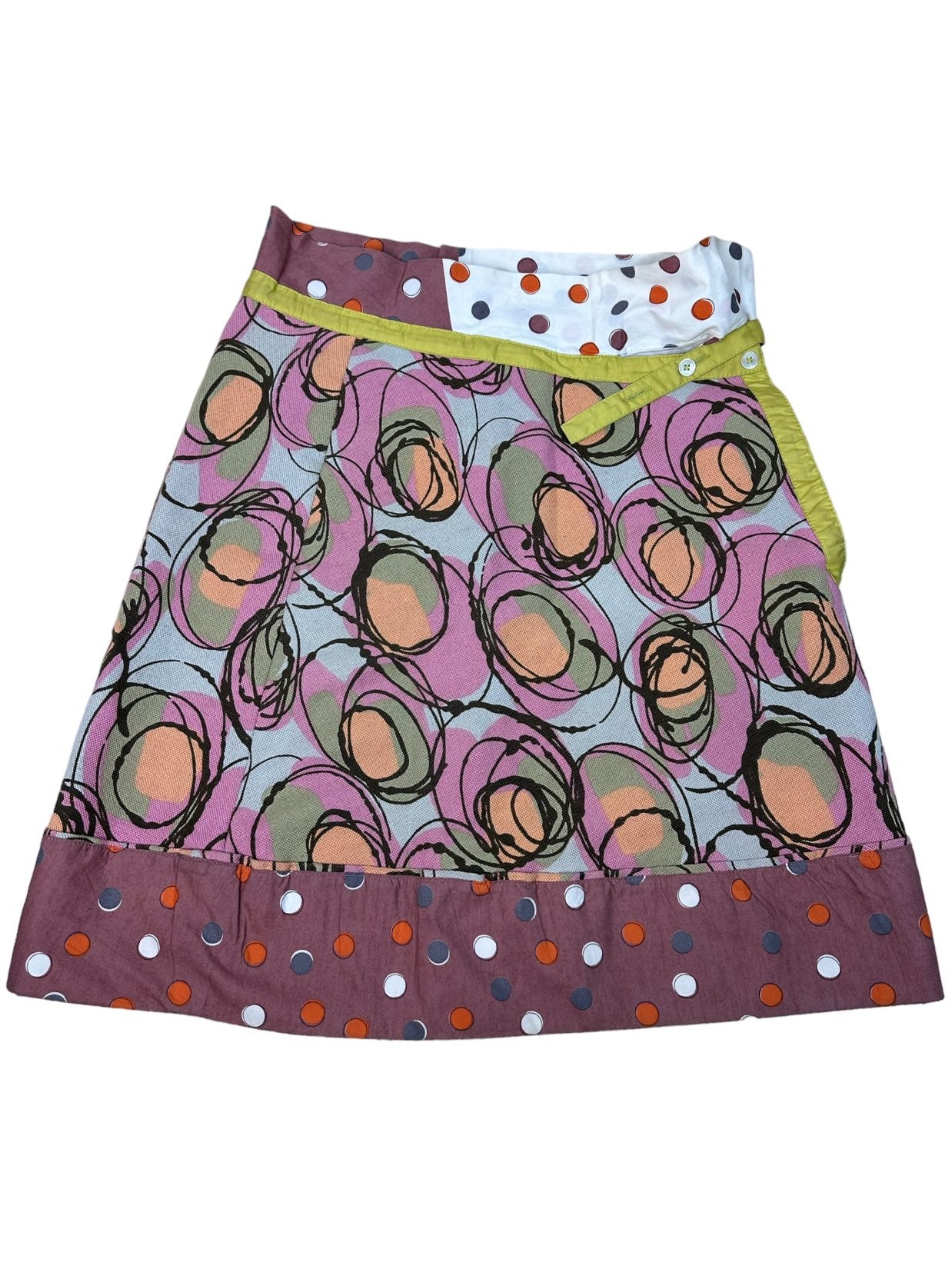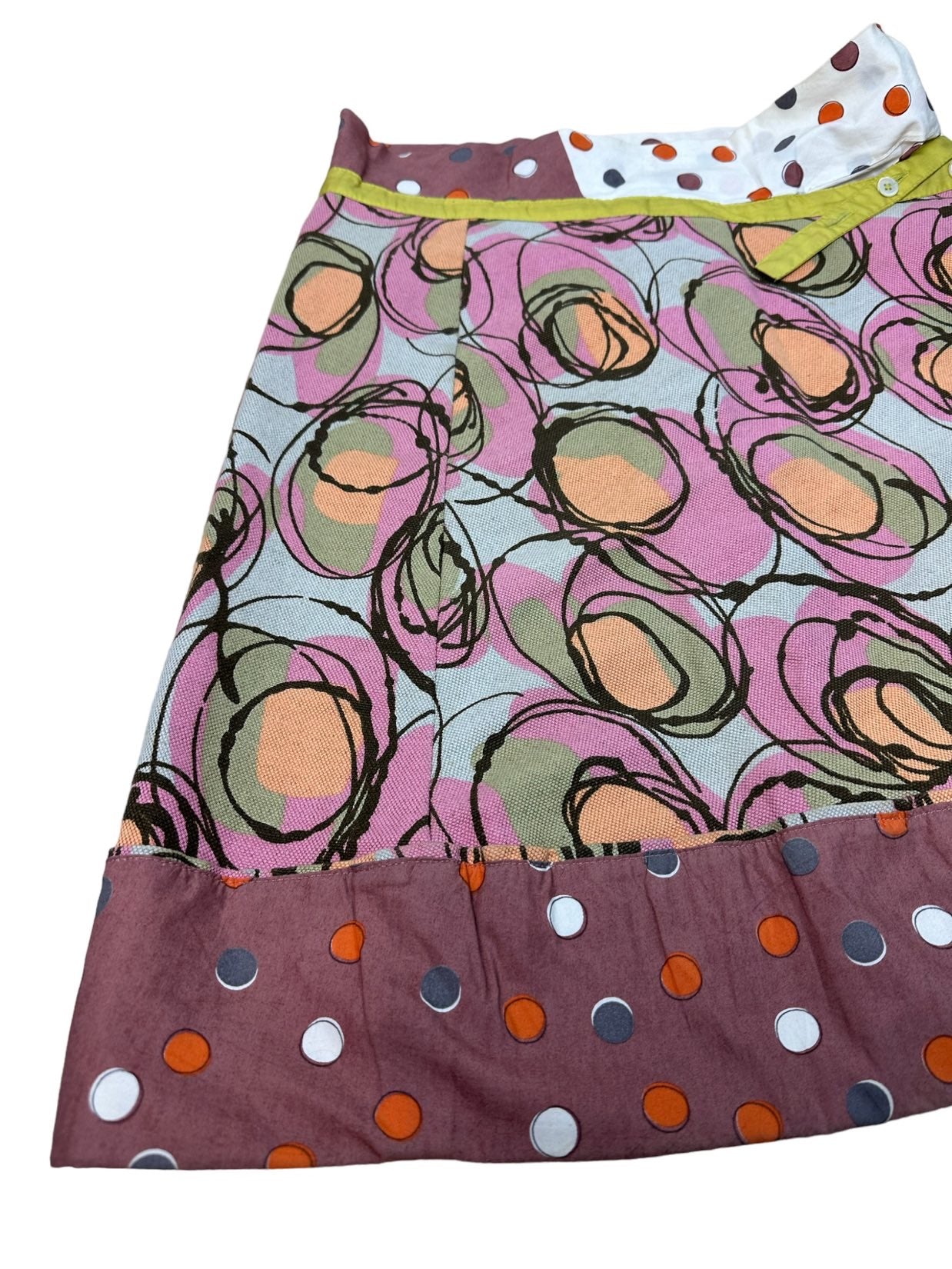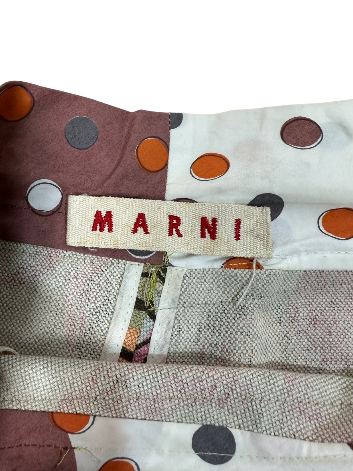 Marni gonna vintage in lino e tela di cotone con stampa a pois e astratta multicolor, arricciatura sul giro vita regolabile da inserto in tessuto con asola e bottone. Vestibilità svasata. Tg.44