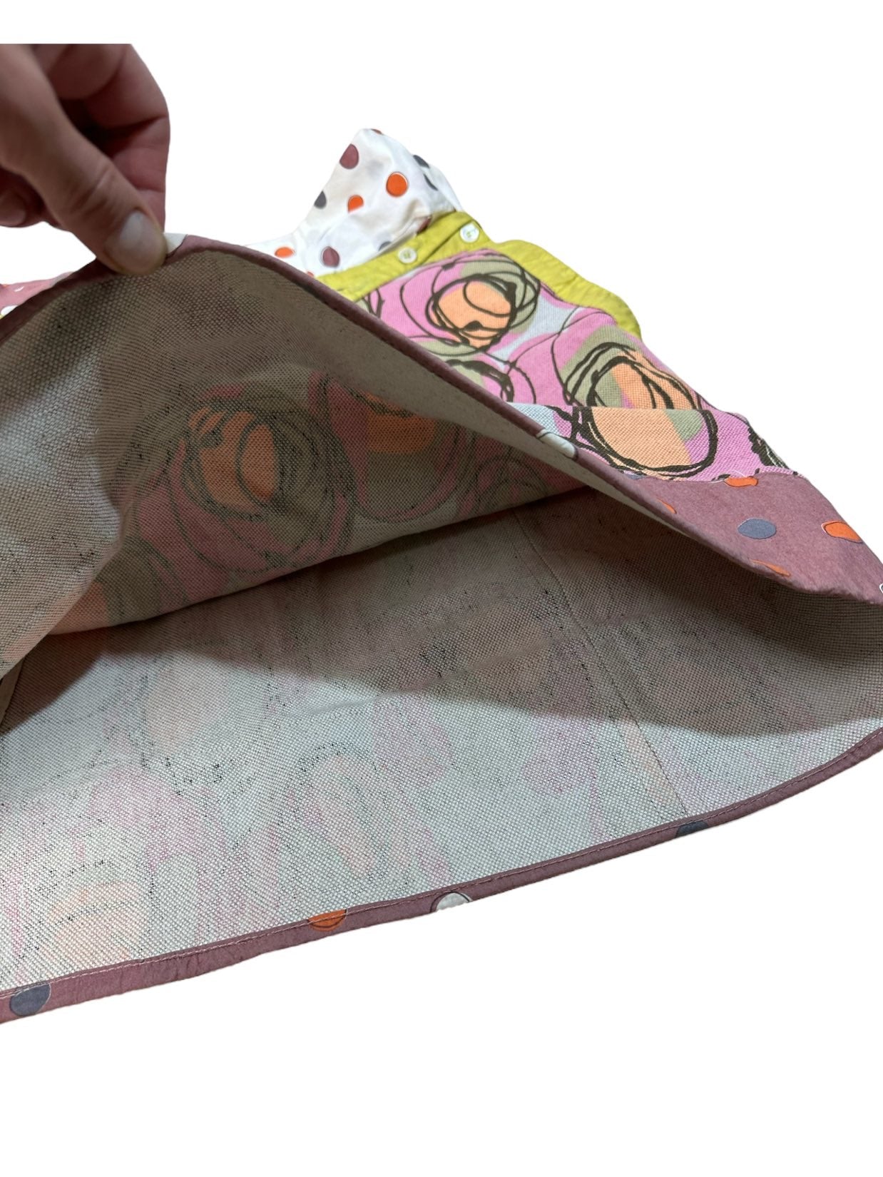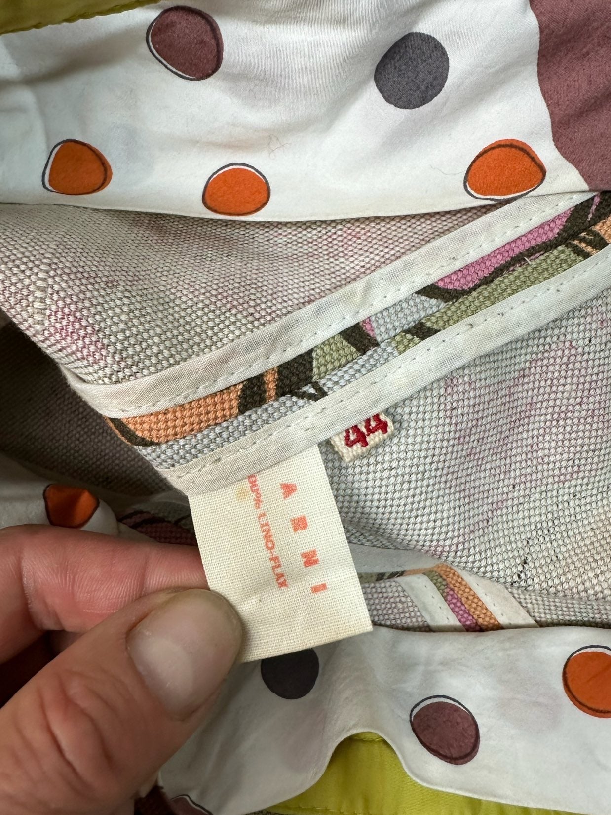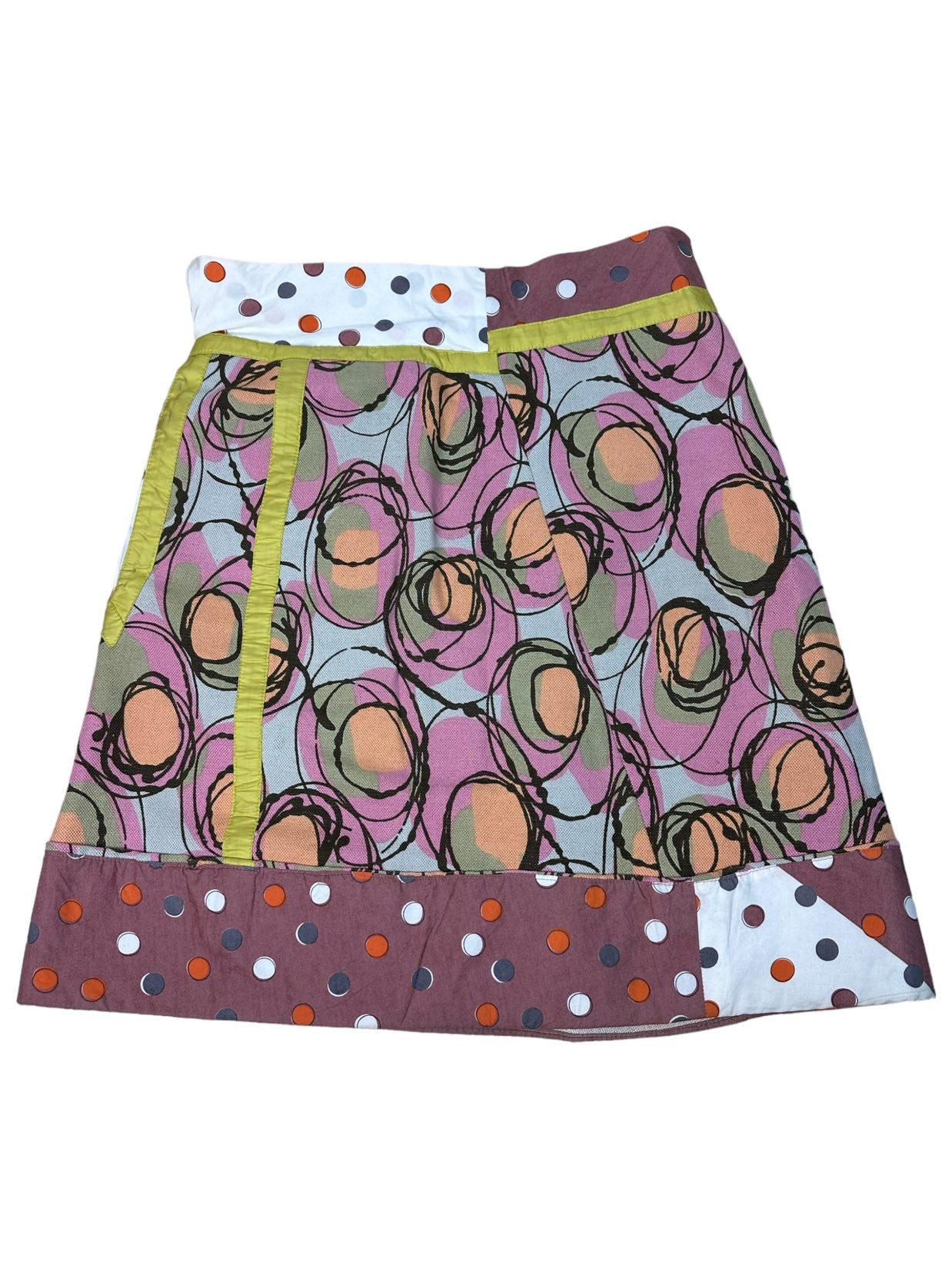 Marni gonna vintage in lino e tela di cotone con stampa a pois e astratta multicolor, arricciatura sul giro vita regolabile da inserto in tessuto con asola e bottone. Vestibilità svasata. Tg.44
