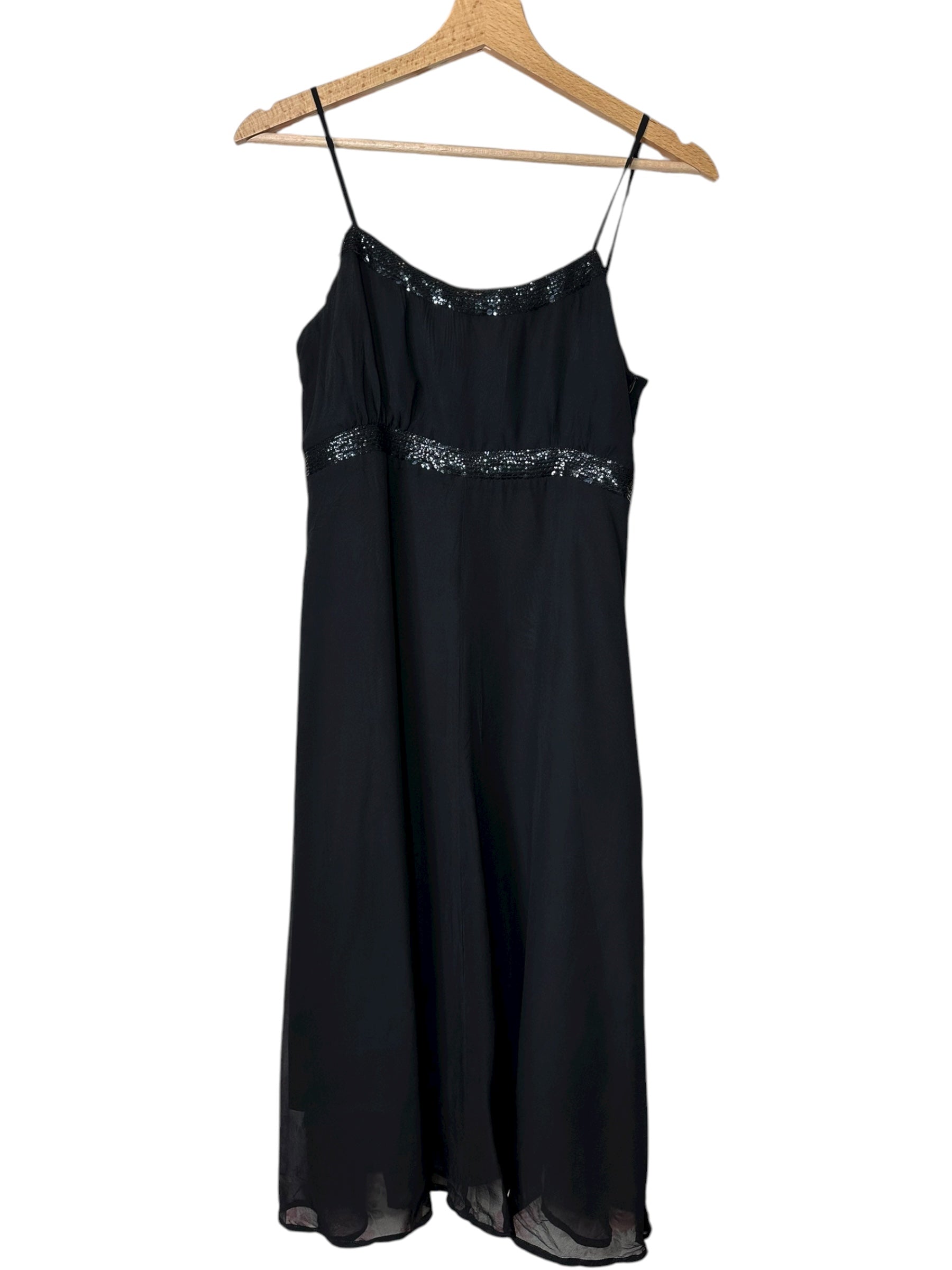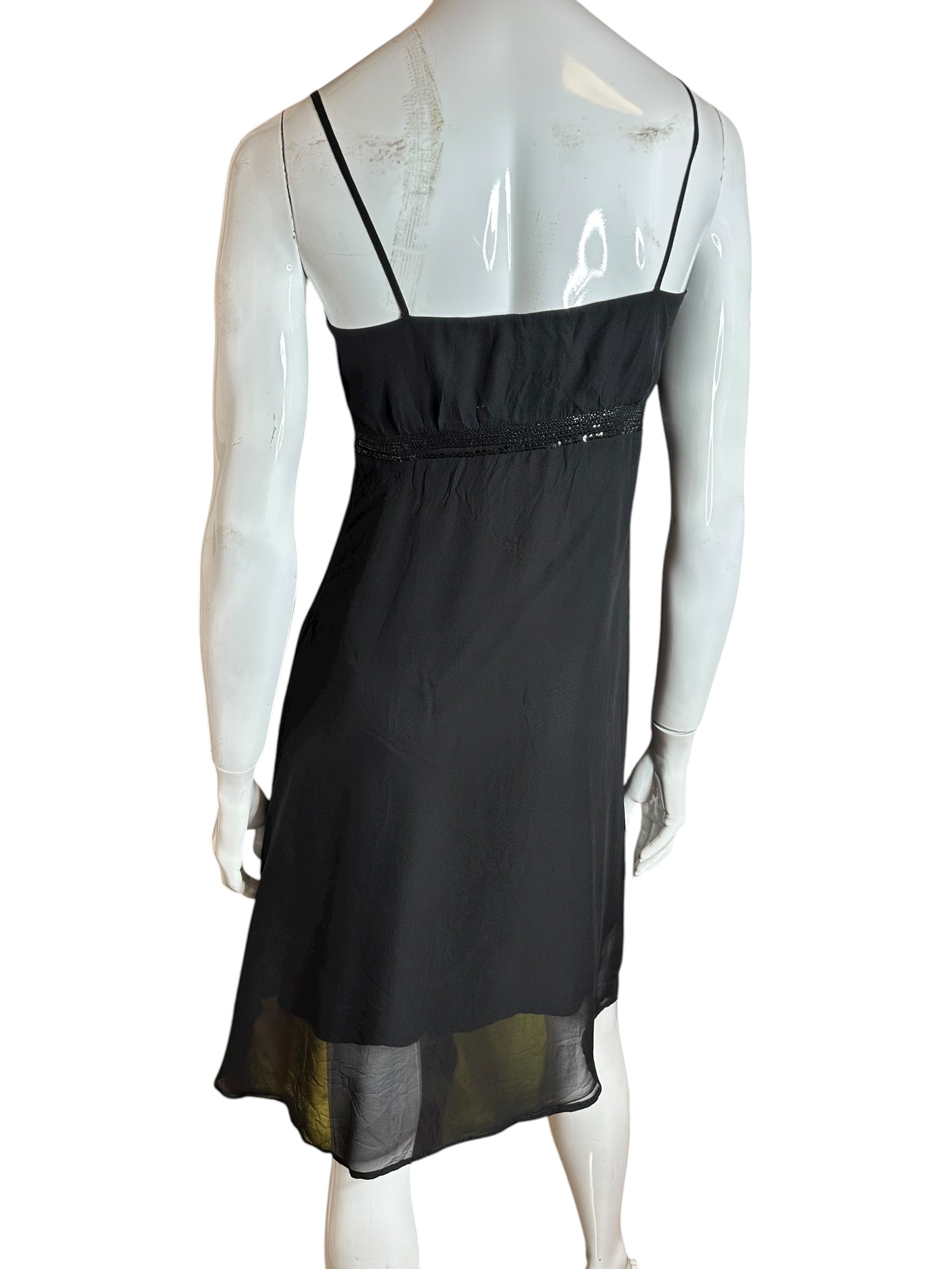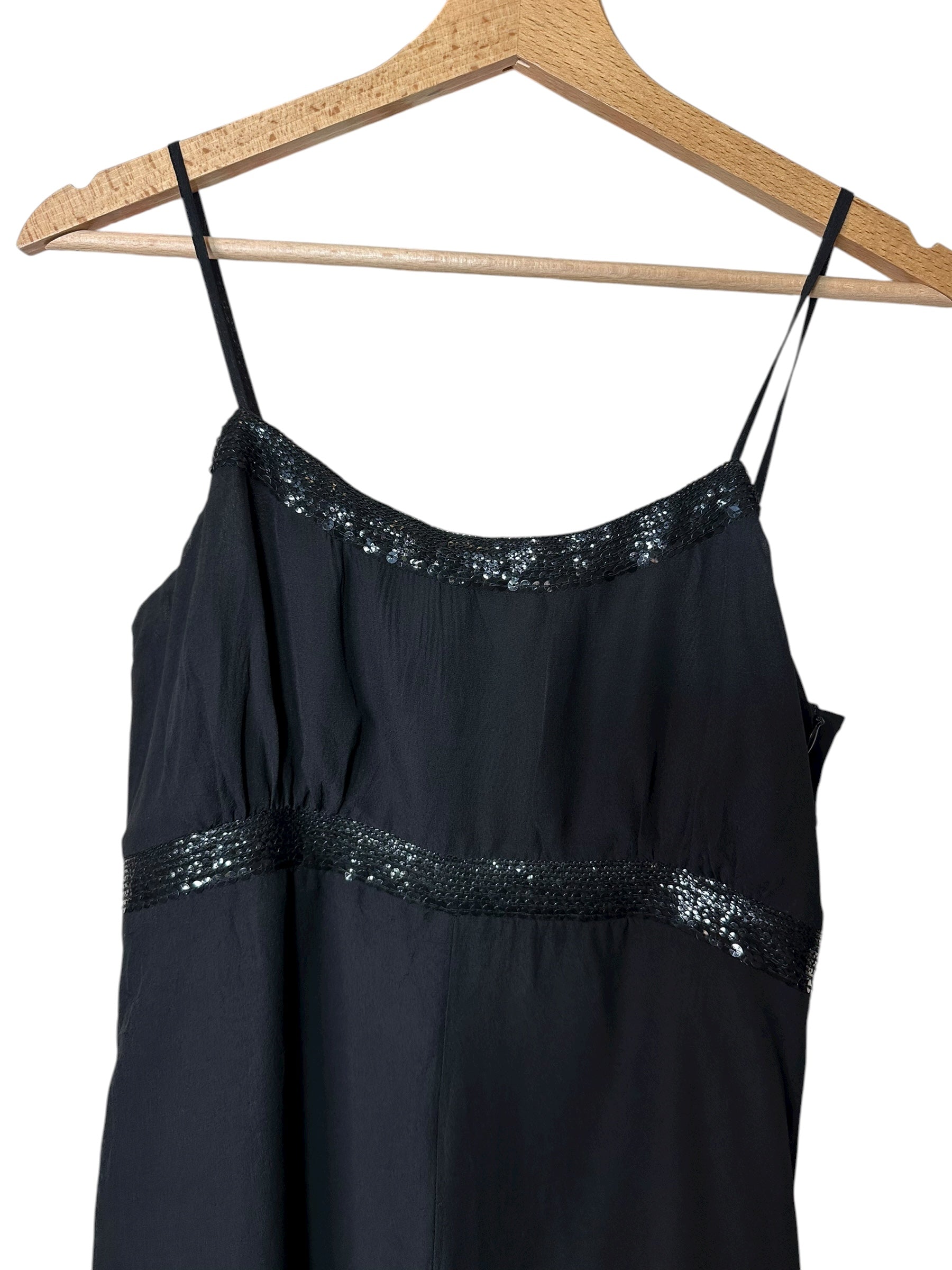 Elegante abito vintage Max & Co. realizzato in 100% seta nera, caratterizzato da spalline sottili, scollo dritto e raffinati inserti in paillettes nere sia lungo il décolleté sia sotto il seno.