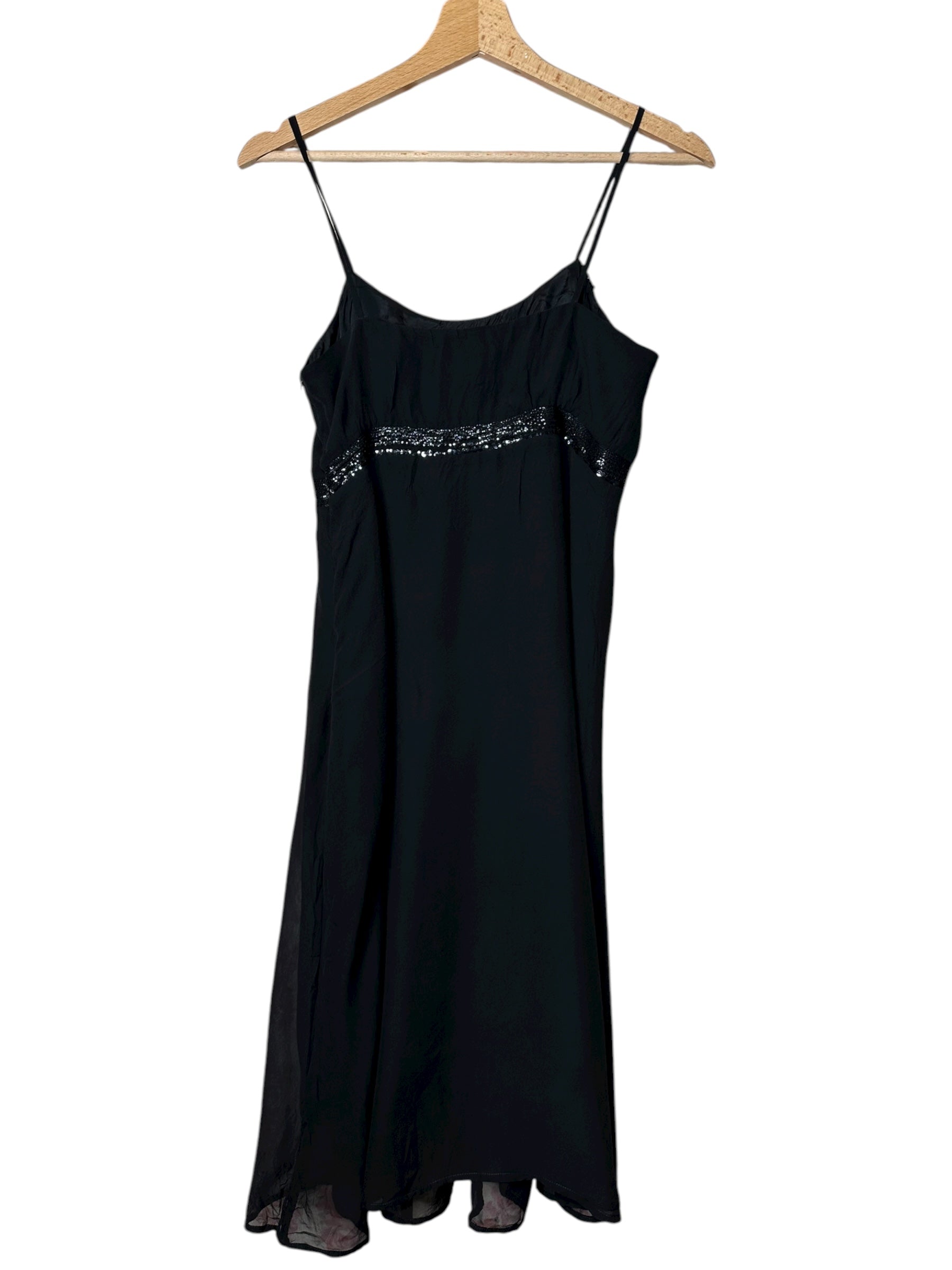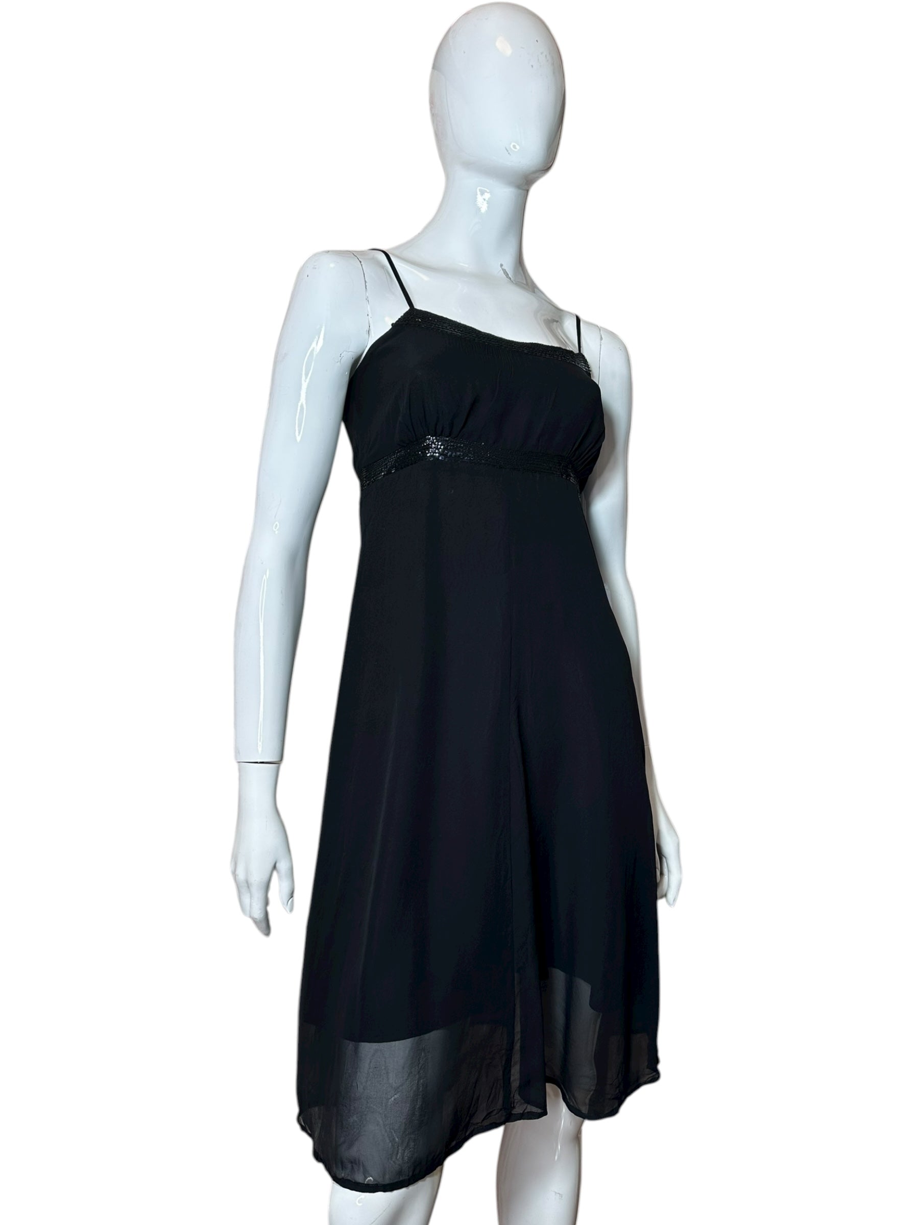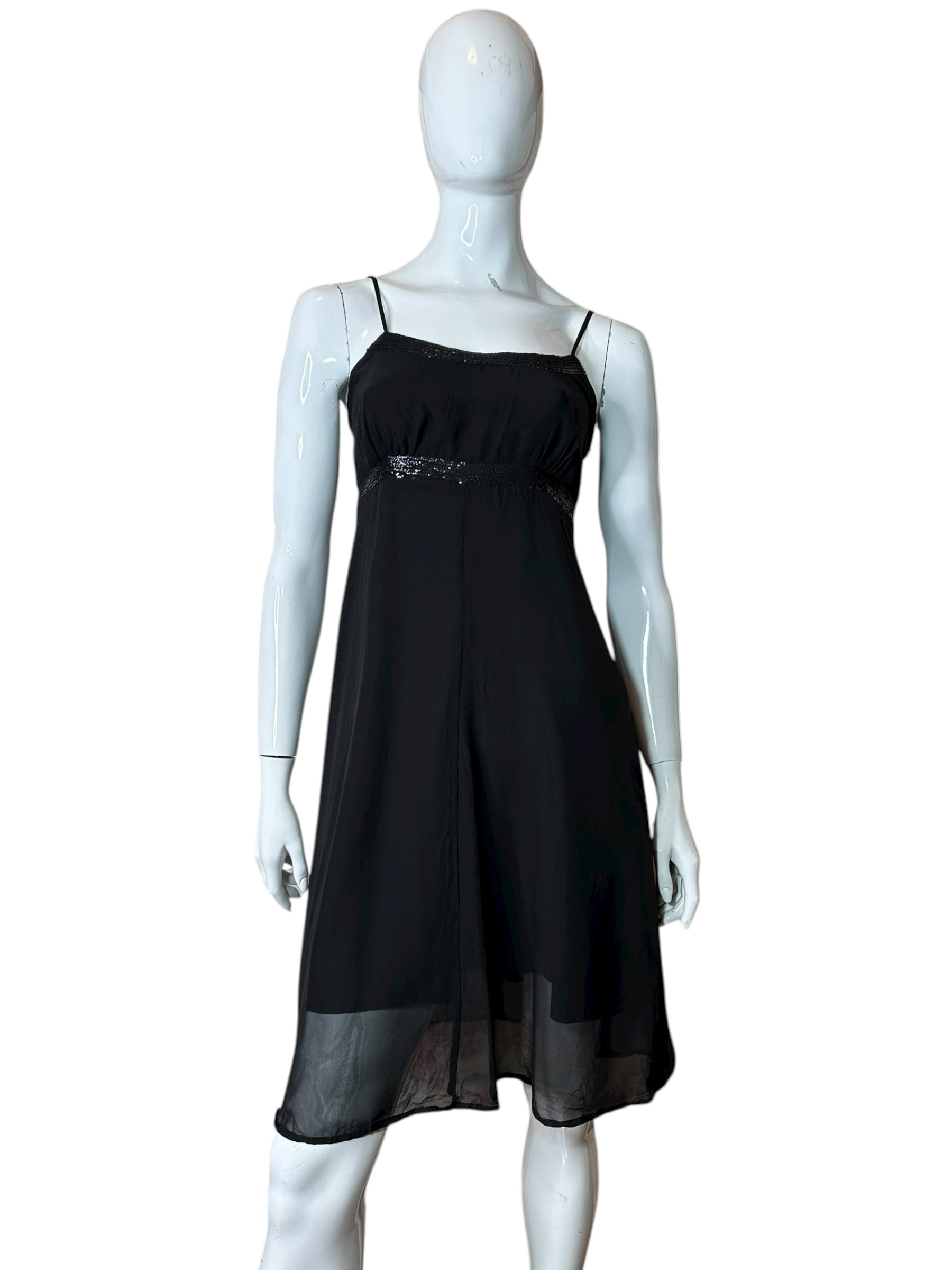 Elegante abito vintage Max & Co. realizzato in 100% seta nera, caratterizzato da spalline sottili, scollo dritto e raffinati inserti in paillettes nere sia lungo il décolleté sia sotto il seno.