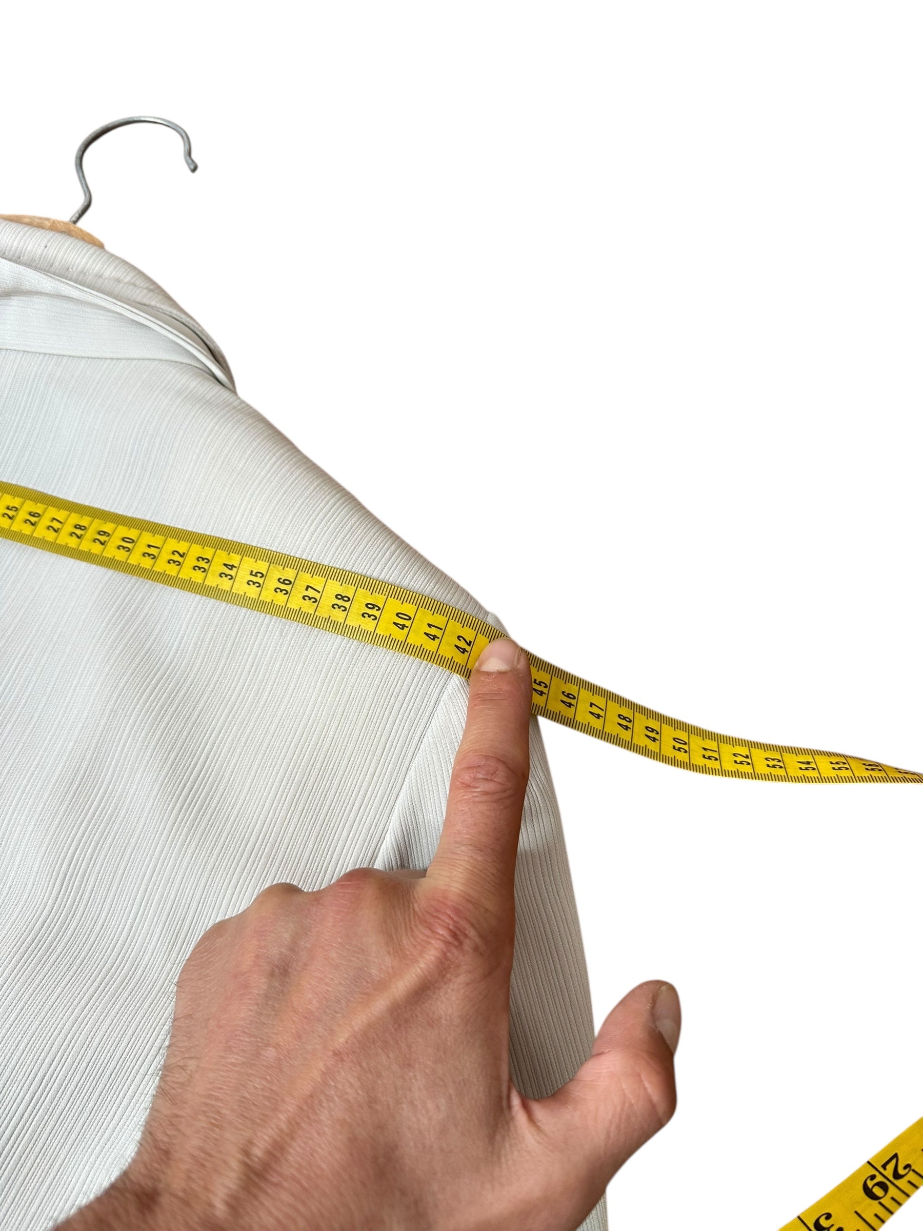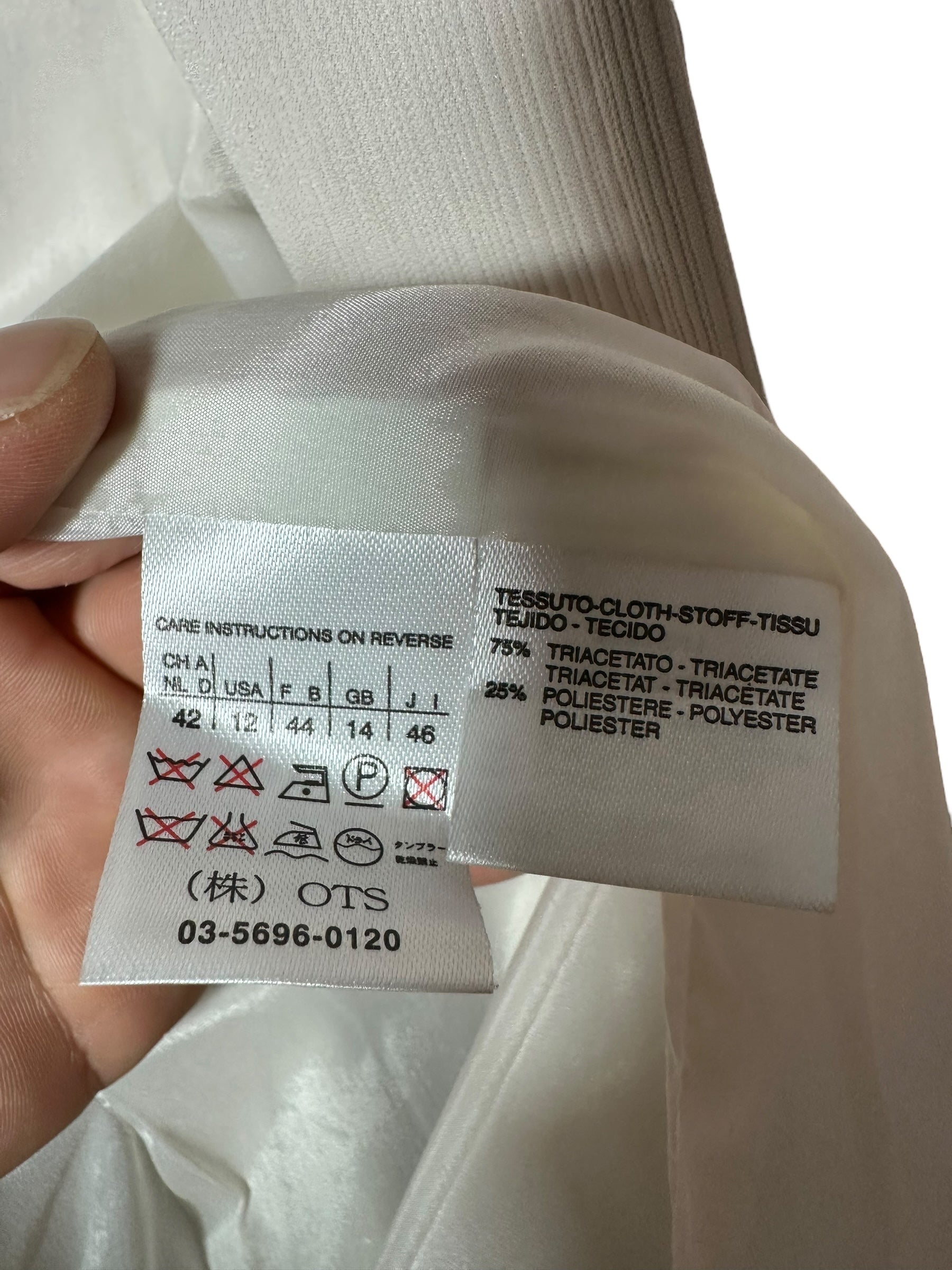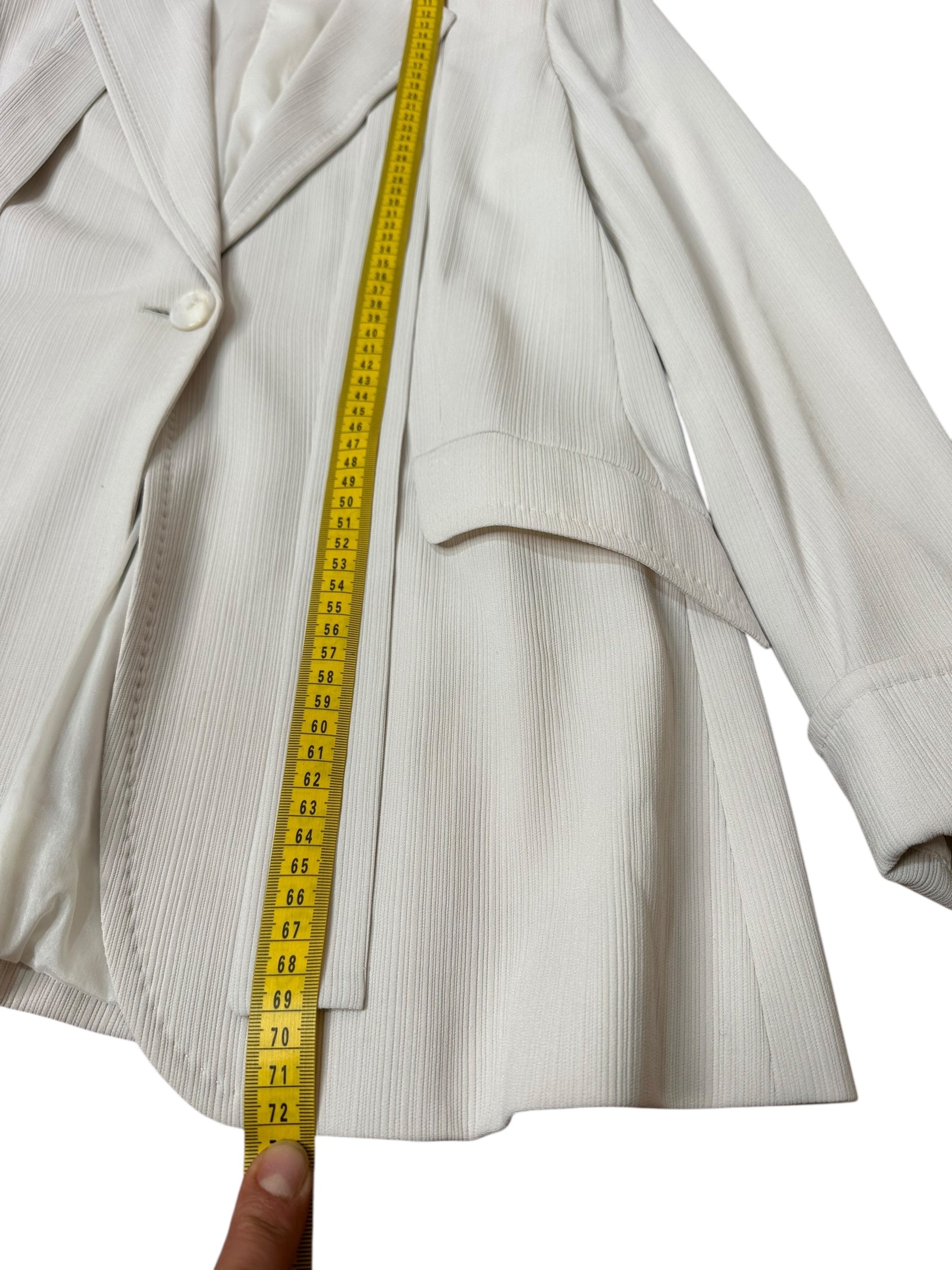 Raffinato blazer vintage Max Mara Made in Italy, realizzato in un elegante tessuto a mini costine verticali tono su tono, che conferisce al capo un effetto gessato sottile e tridimensionale. La composizione — 75% triacetato e 25% poliestere — dona al tessuto una mano fluida, fresca e leggermente lucente, ideale per un capo dalla linea morbida ma strutturata.