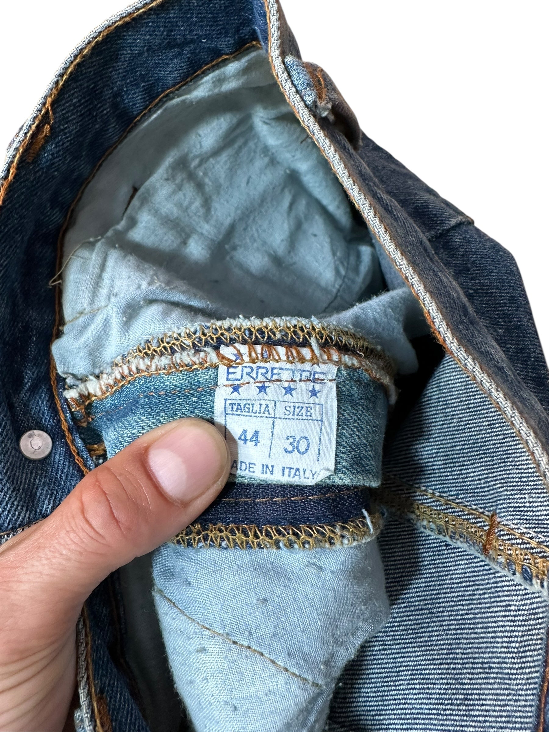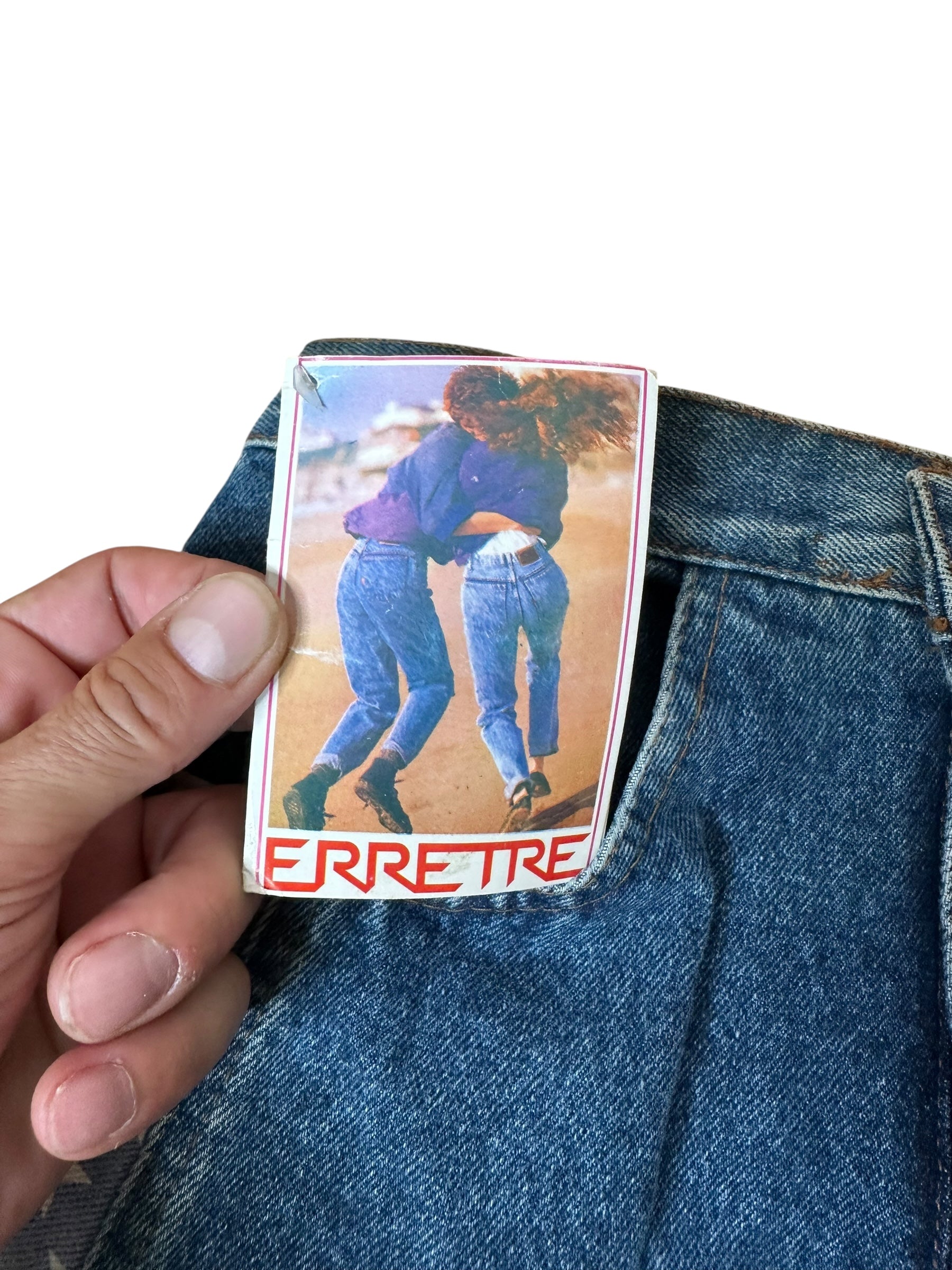 Iconico pezzo d’archivio anni ’90 prodotto da Erretre by Oliva, realizzato in Italia in 100% cotone. Questa minigonna a tubino in denim blu presenta sui fianchi inserti in tessuto stampato con la bandiera americana (stelle e strisce) e tasche anteriori integrate. Linea dritta con piccolo spacco posteriore e chiusura con zip laterale invisibile.