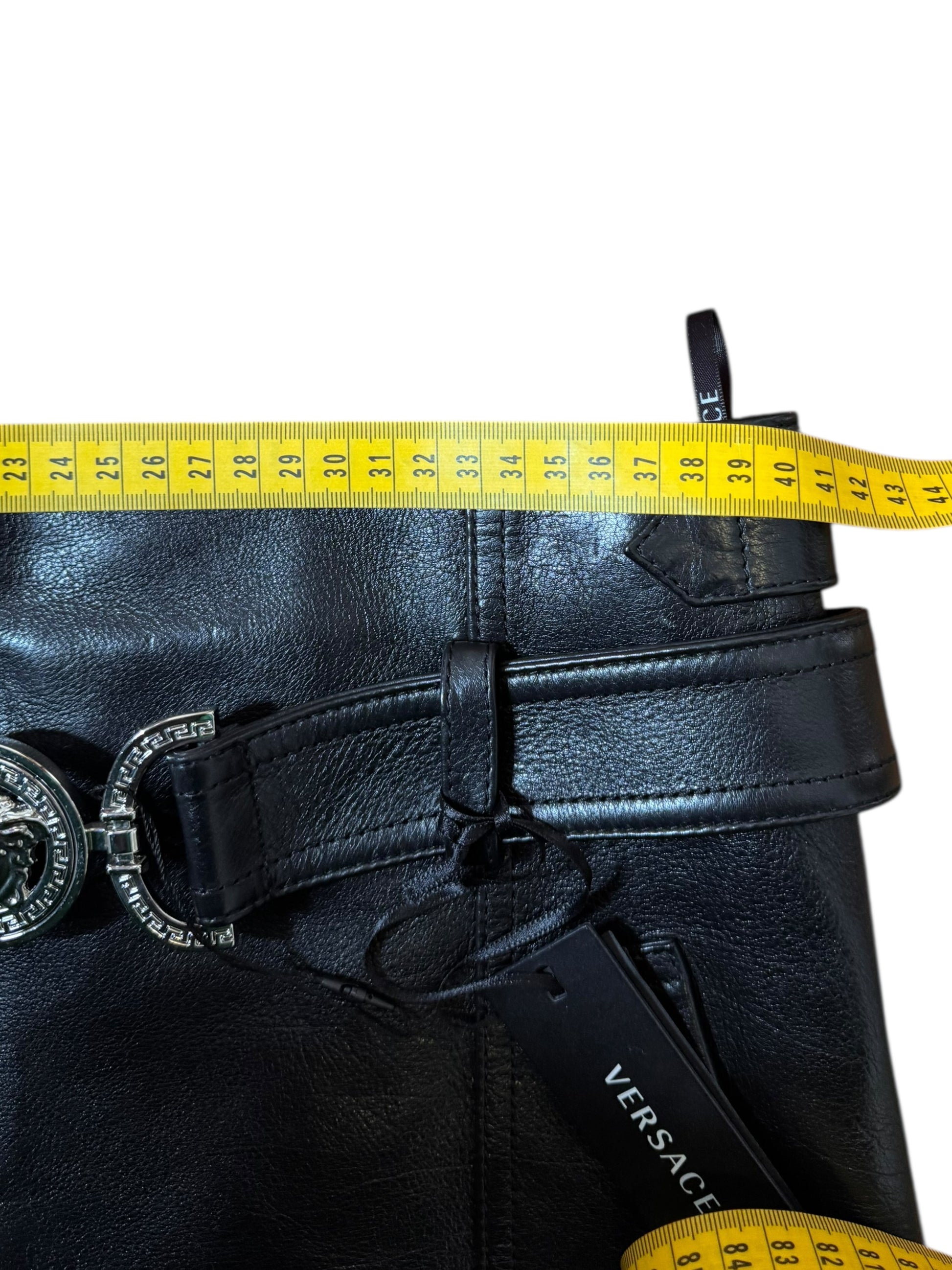 Minigonna Versace da donna realizzata in 100% pelle di vitello nera, con struttura sartoriale e finiture di alto livello. Modello a vita alta con cintura integrata e chiusura frontale con zip e iconico dettaglio Medusa in metallo. Tasche laterali a filetto, pannelli cuciti per una vestibilità definita.