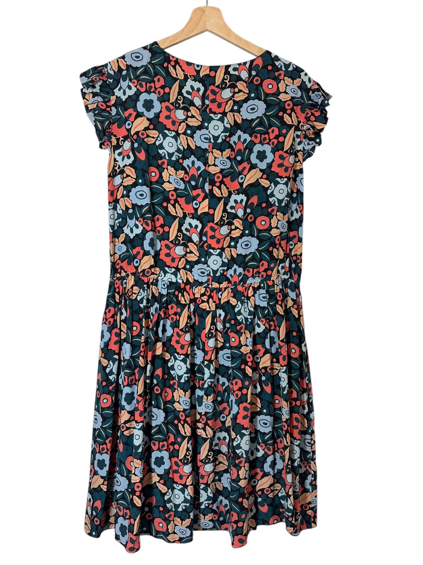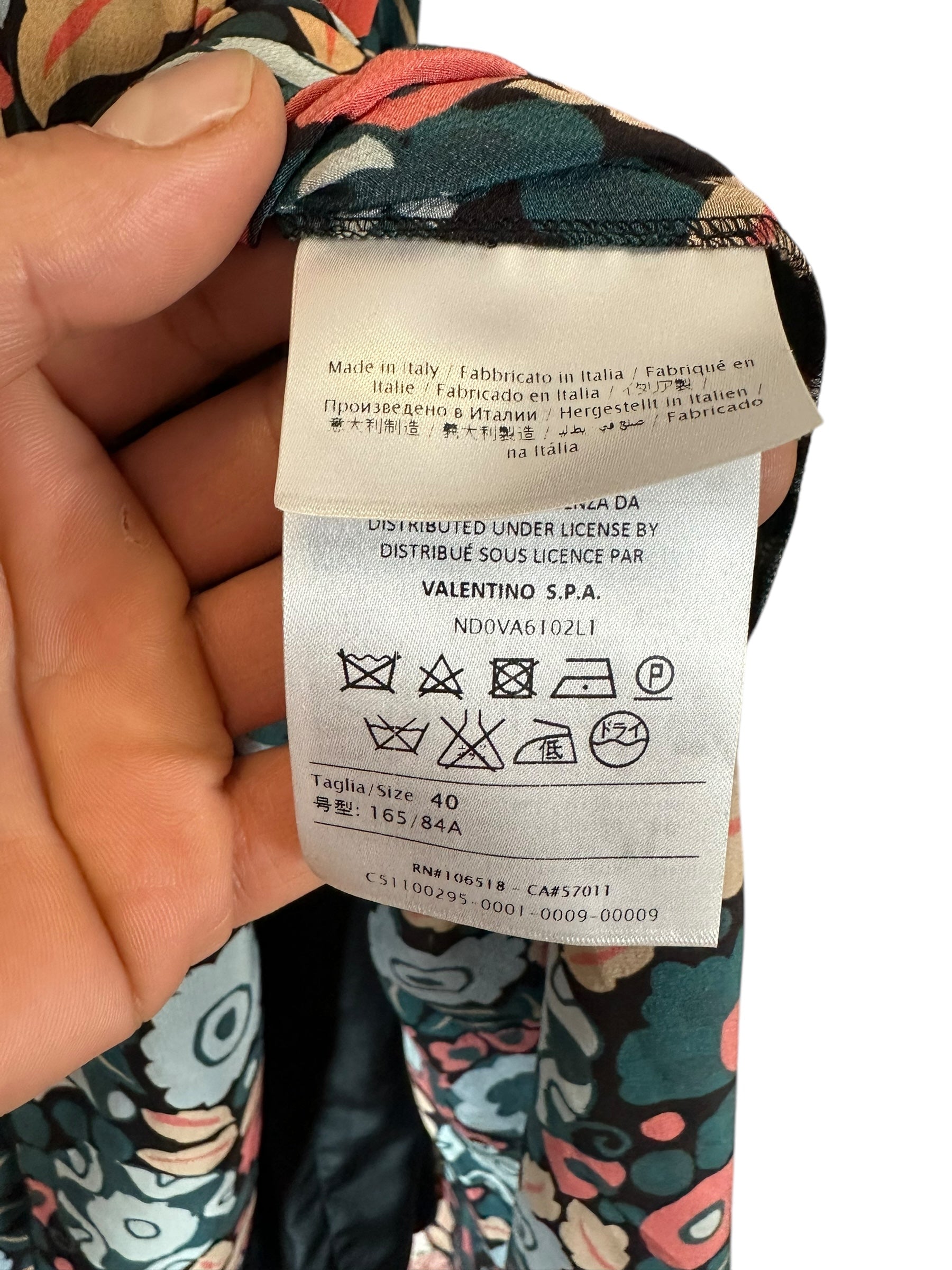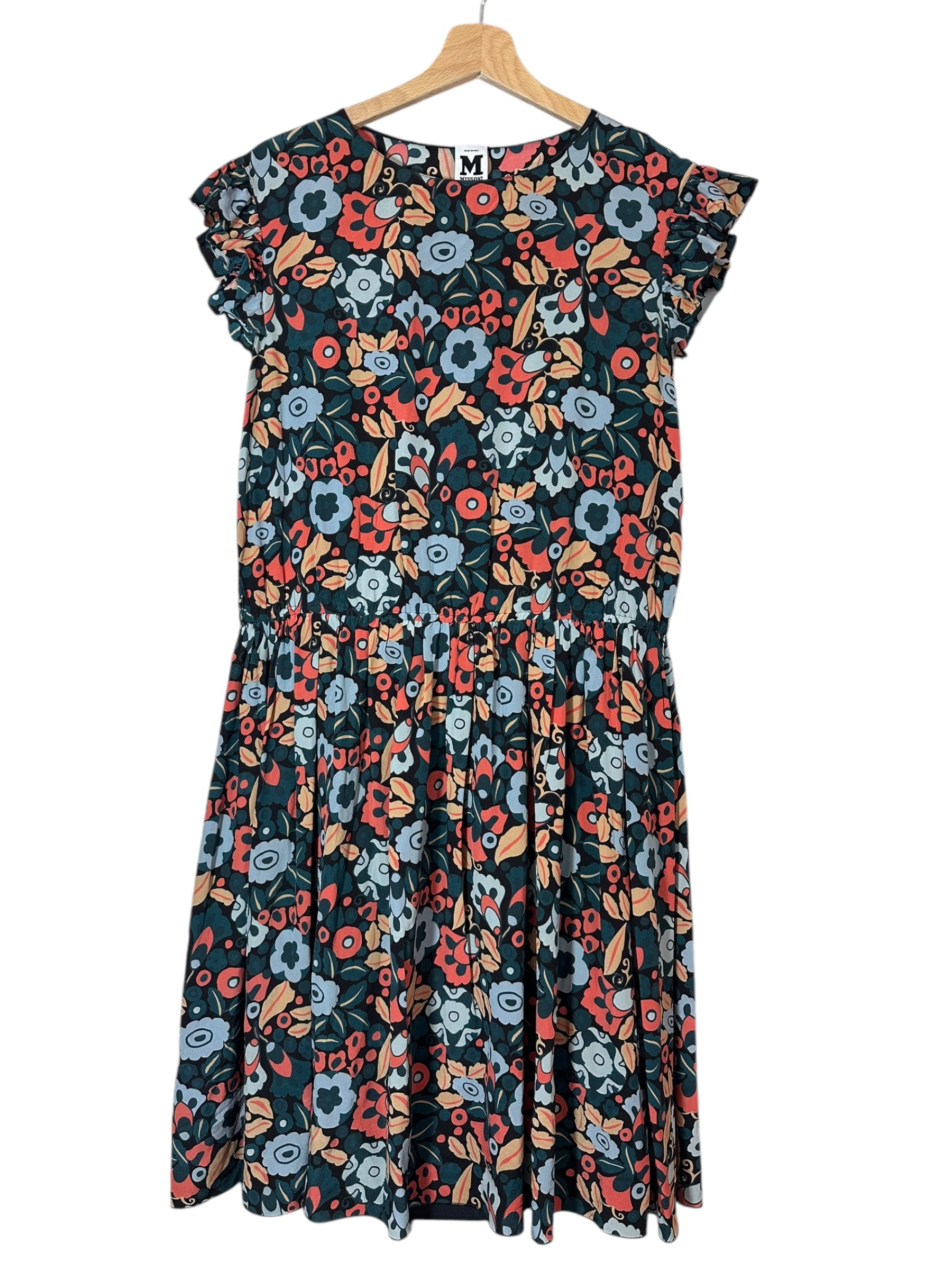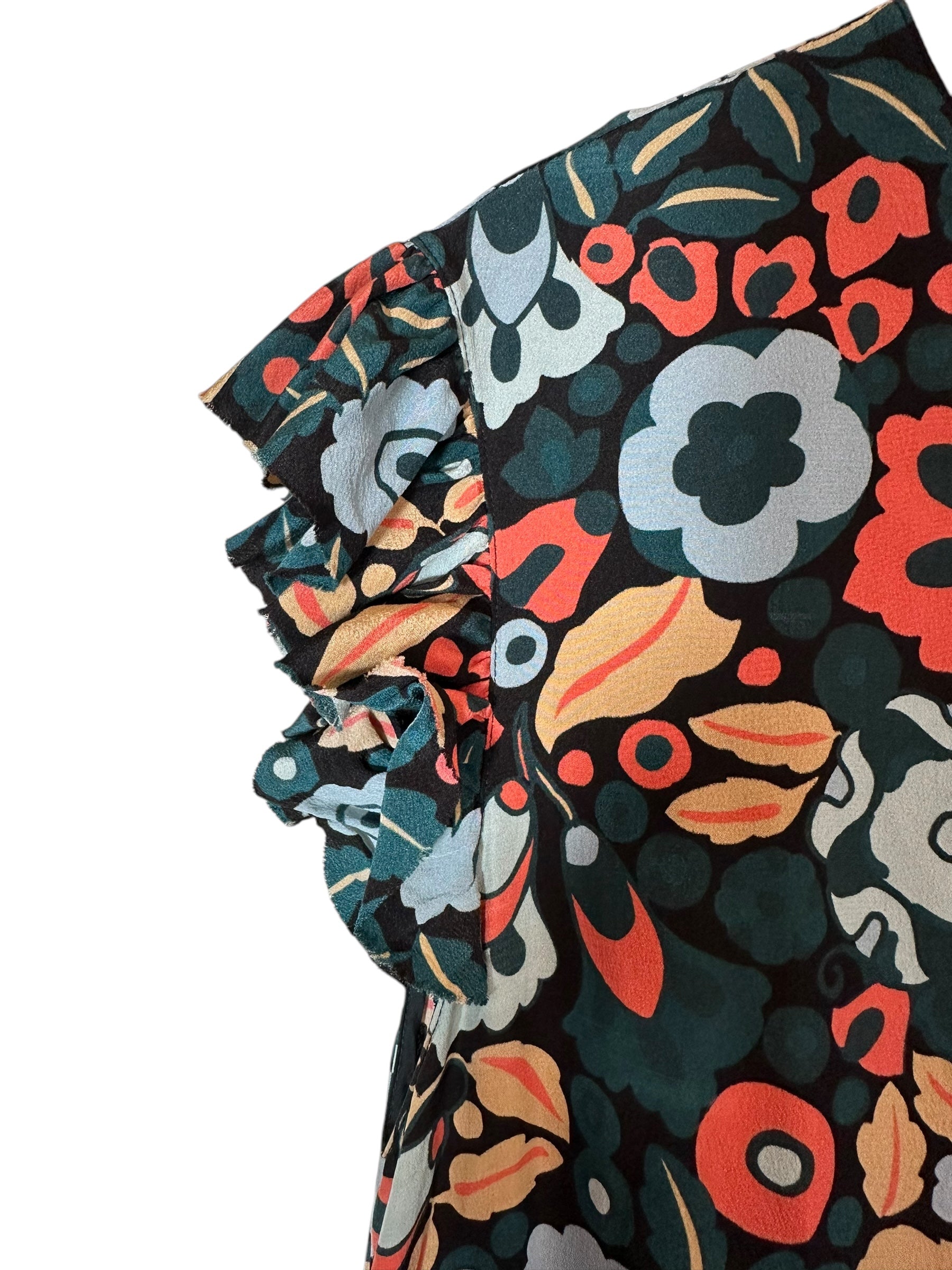 Un capo fresco, femminile e intriso del tipico spirito grafico Missoni. Questo abito corto in pura seta si distingue per la stampa floreale vivace su base nera, con toni di corallo, azzurro, verde e avorio. Il modello ha una linea morbida e svasata, con gonna arricciata e maniche corte con rouches che aggiungono movimento e delicatezza.