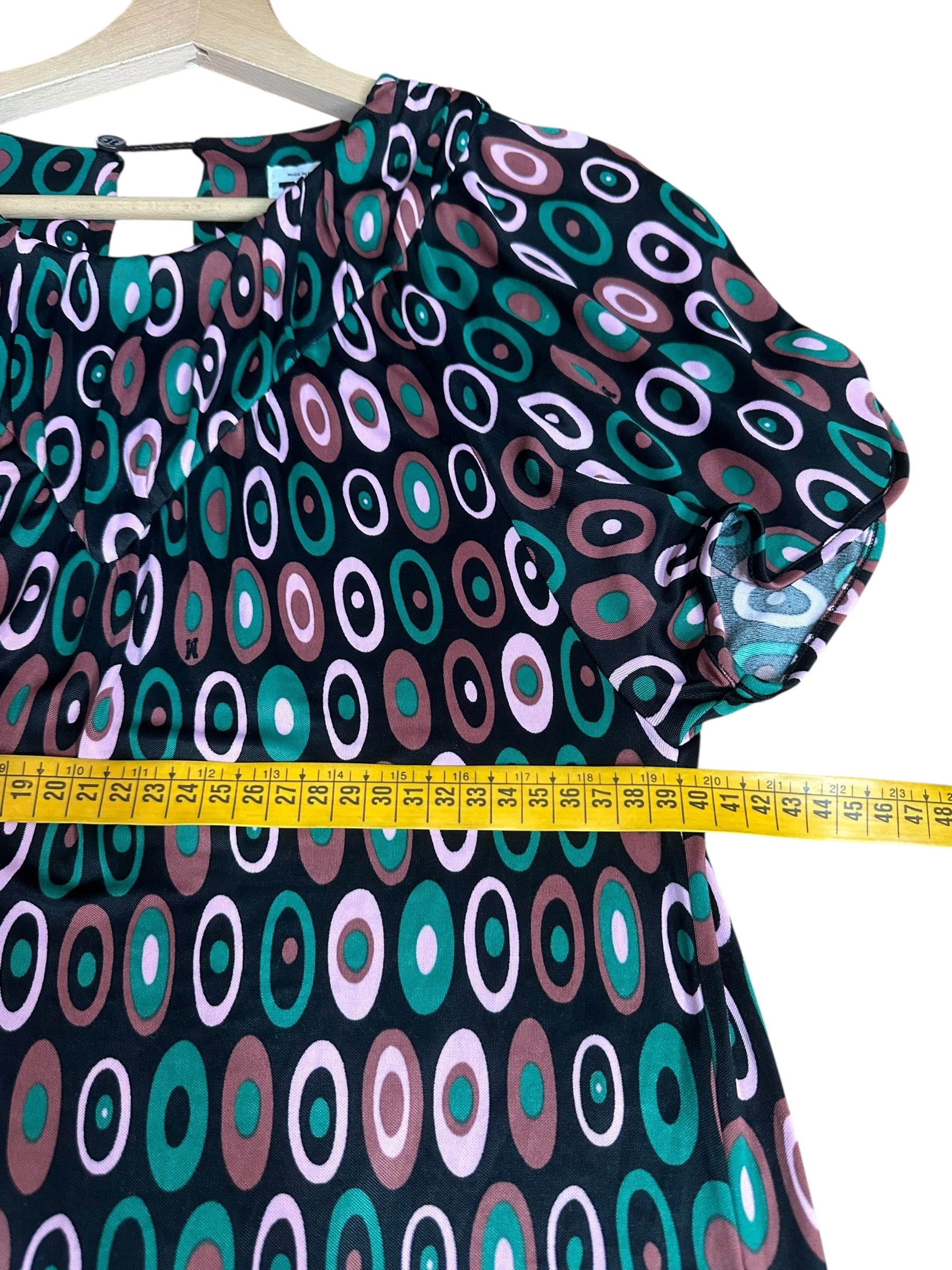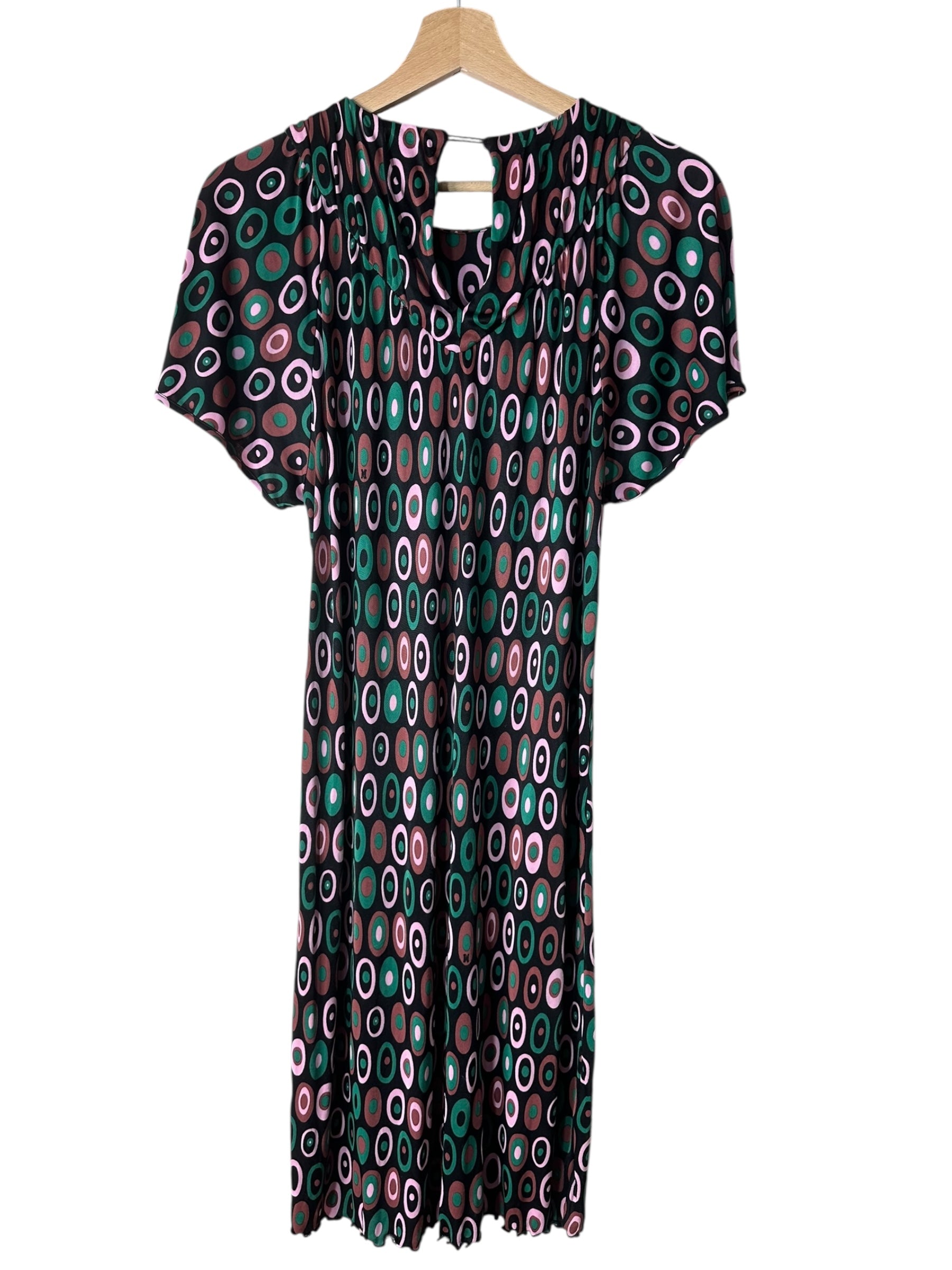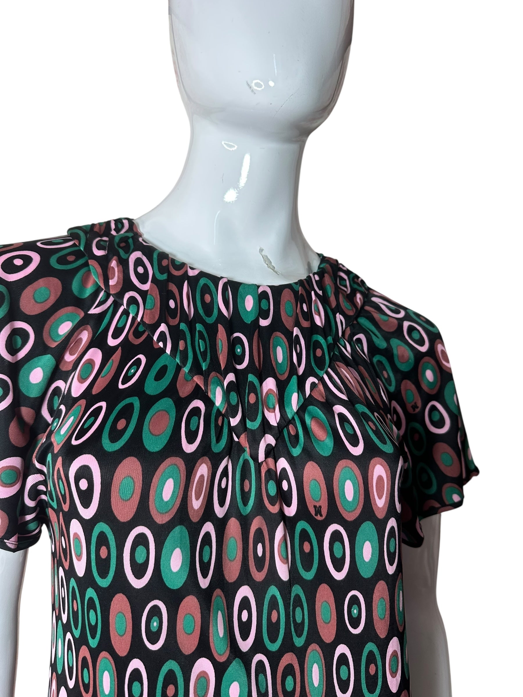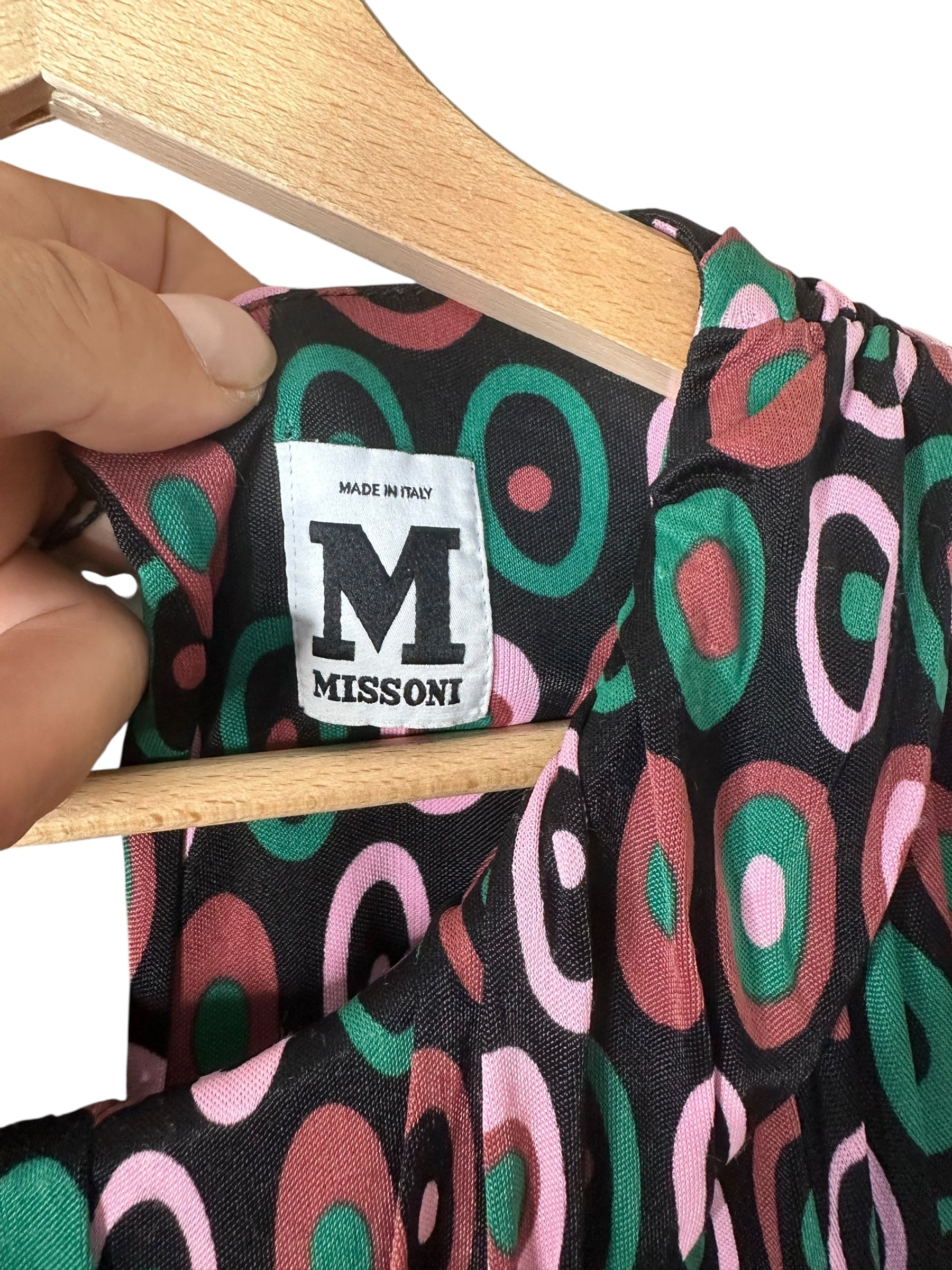 Abito corto vintage della linea M MISSONI, realizzato in 100% viscosa leggera e fluida, con una stampa ovale a motivo multicolore nei toni del verde, rosa e marrone su base nera. Il modello presenta maniche corte leggermente svasate, scollo tondo arricciato con delicata lavorazione a piegoline e chiusura posteriore con piccolo bottone e apertura a goccia. La linea è dritta, con orlo ondulato effetto merlettato realizzato tramite finitura overlock.