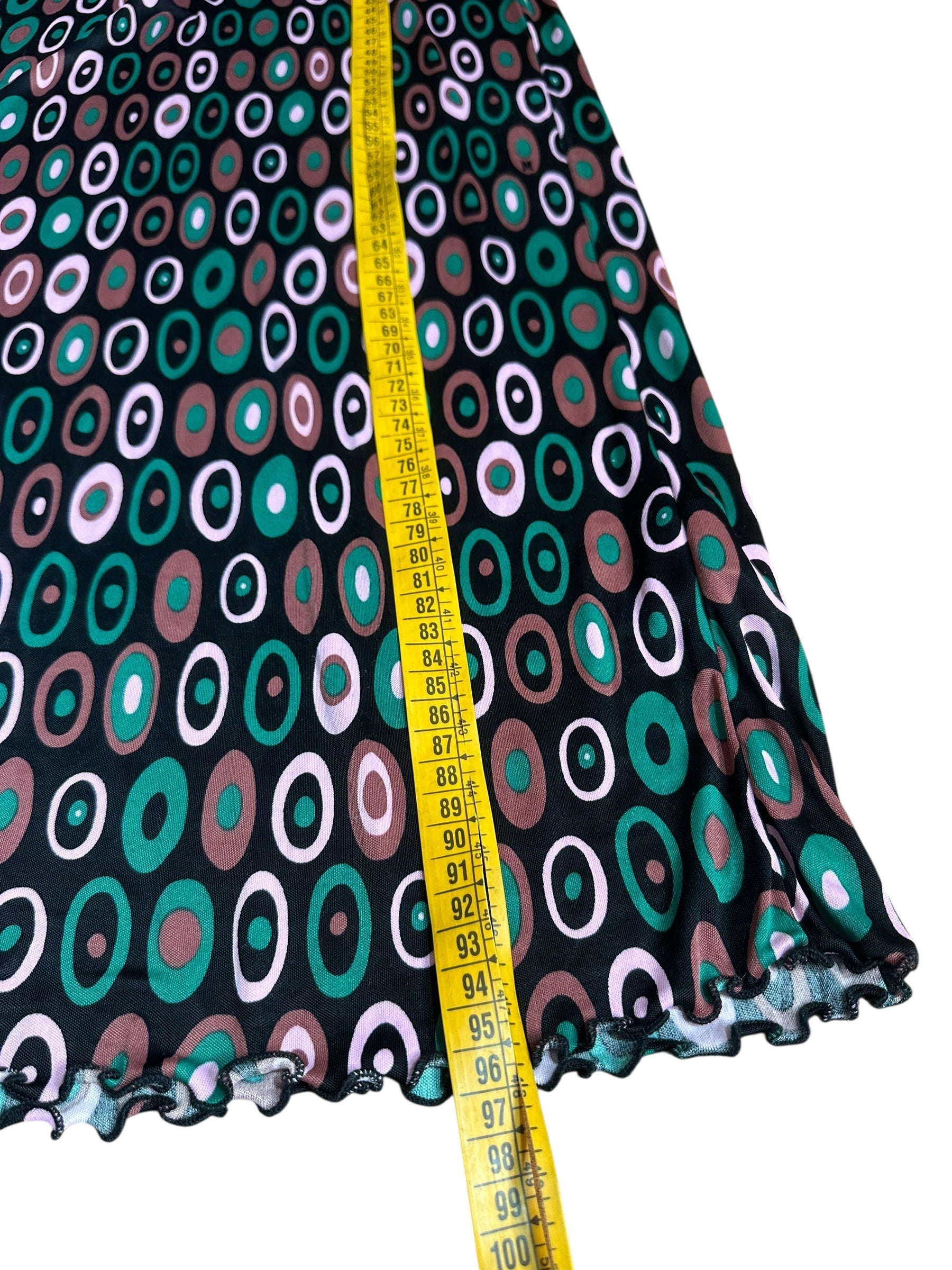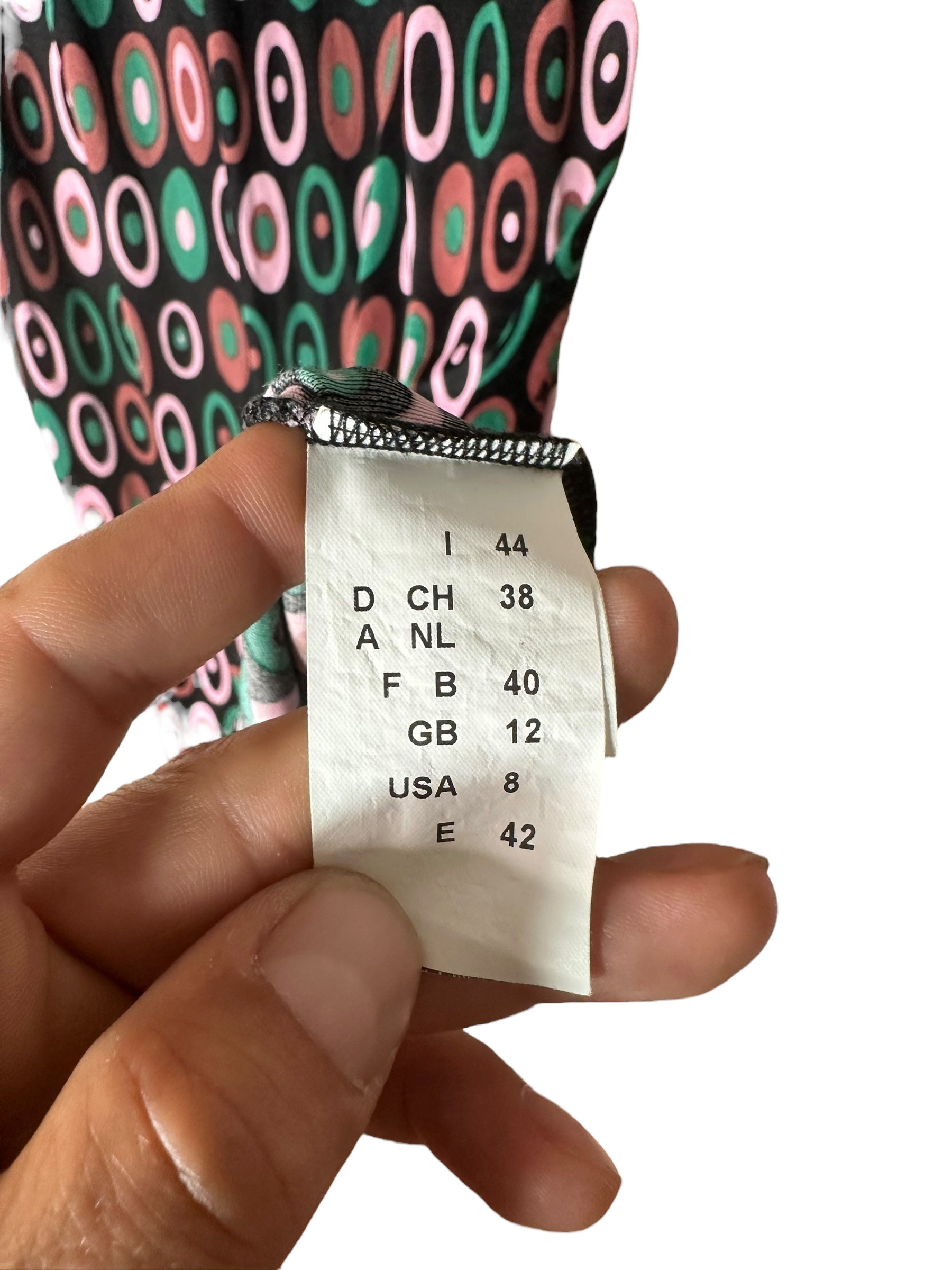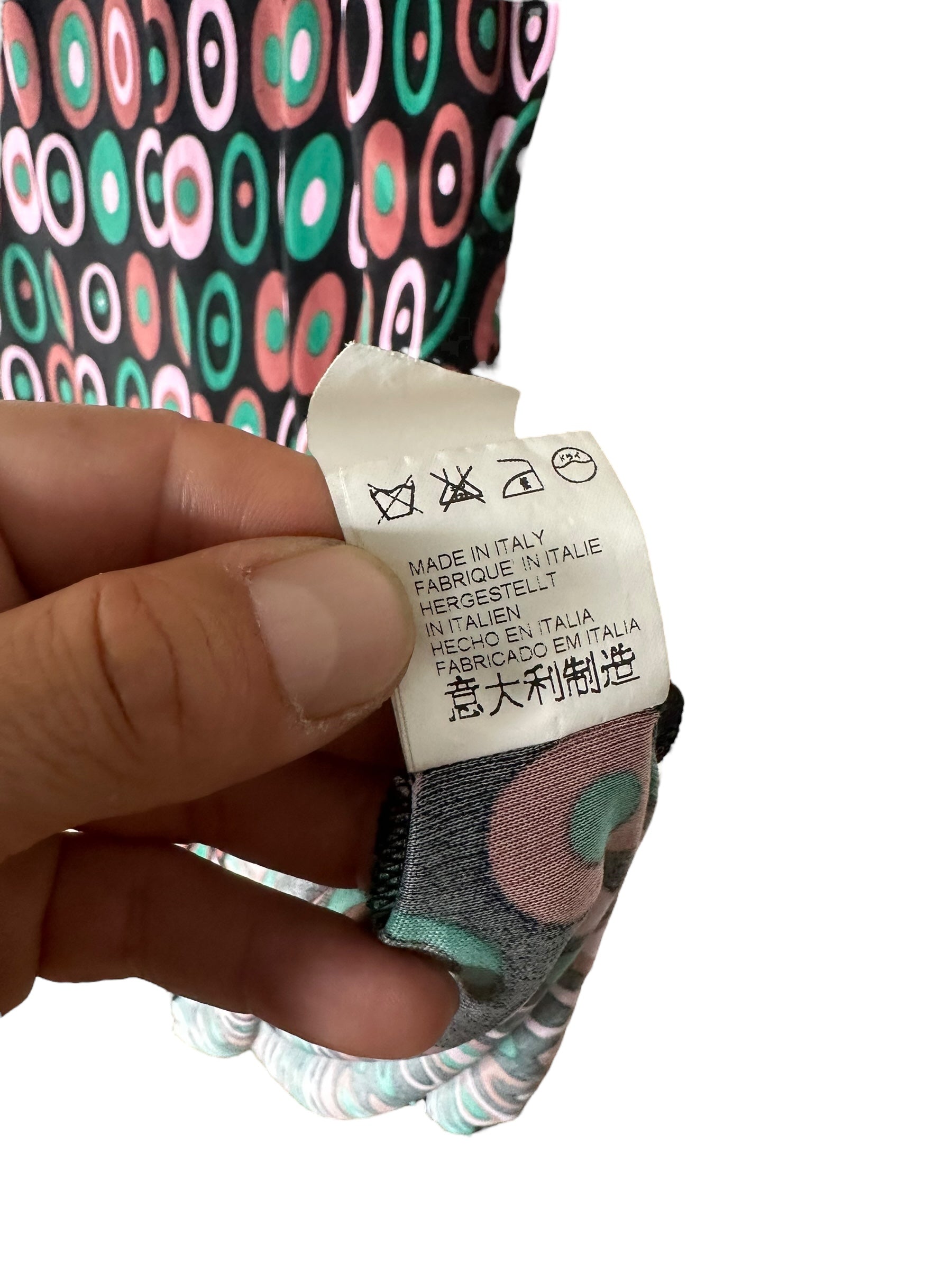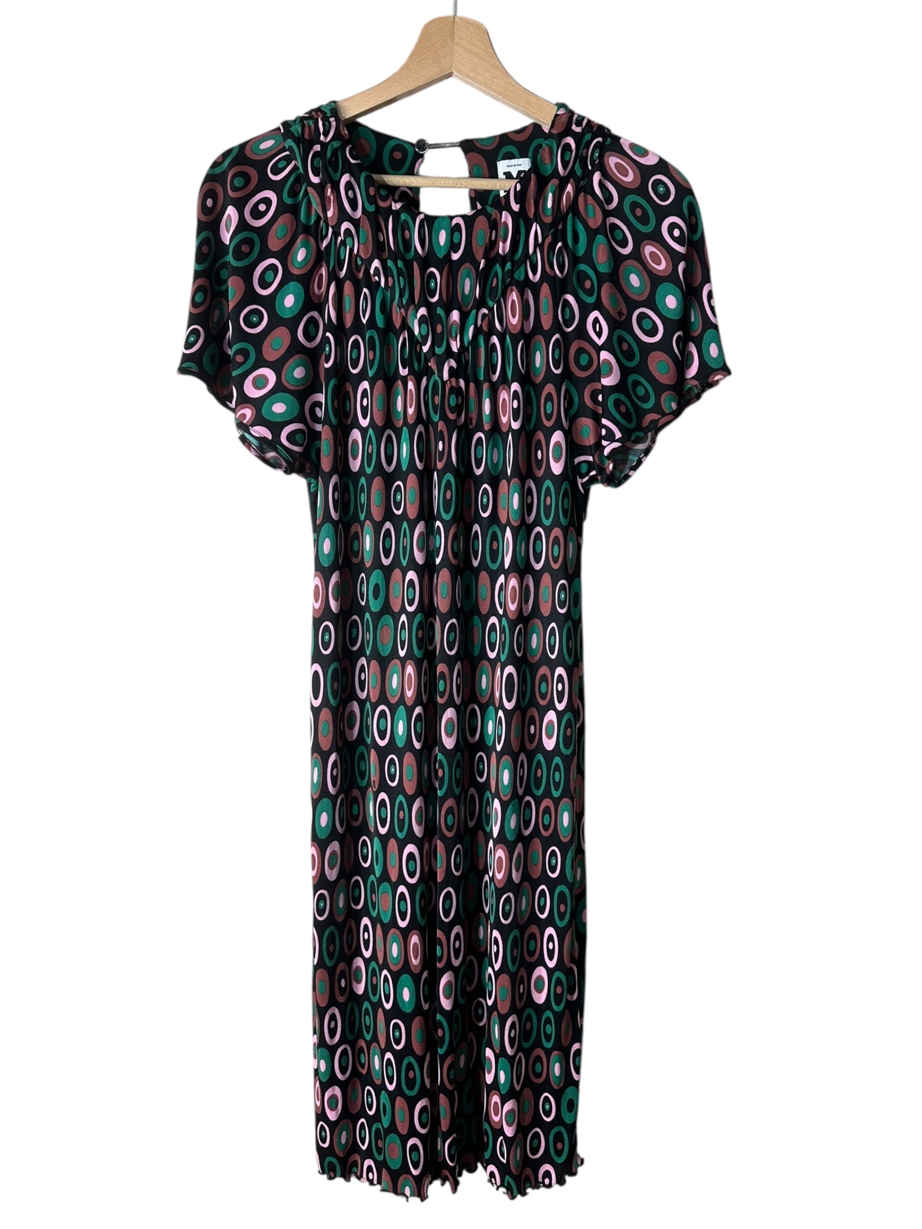 Abito corto vintage della linea M MISSONI, realizzato in 100% viscosa leggera e fluida, con una stampa ovale a motivo multicolore nei toni del verde, rosa e marrone su base nera. Il modello presenta maniche corte leggermente svasate, scollo tondo arricciato con delicata lavorazione a piegoline e chiusura posteriore con piccolo bottone e apertura a goccia. La linea è dritta, con orlo ondulato effetto merlettato realizzato tramite finitura overlock.