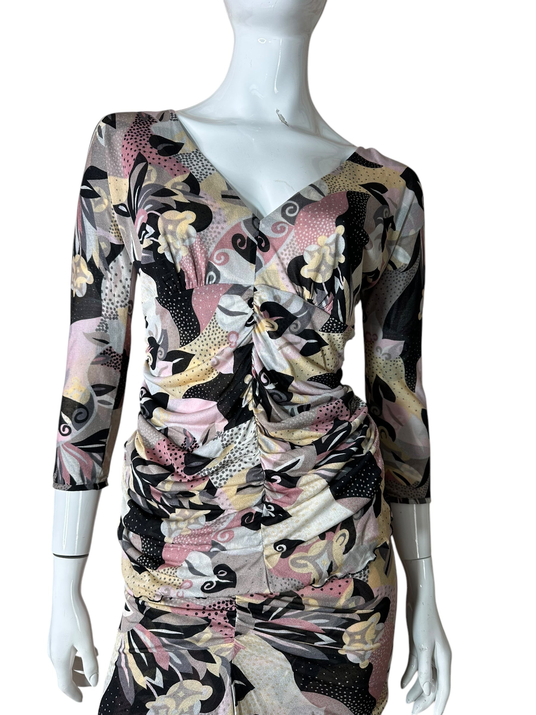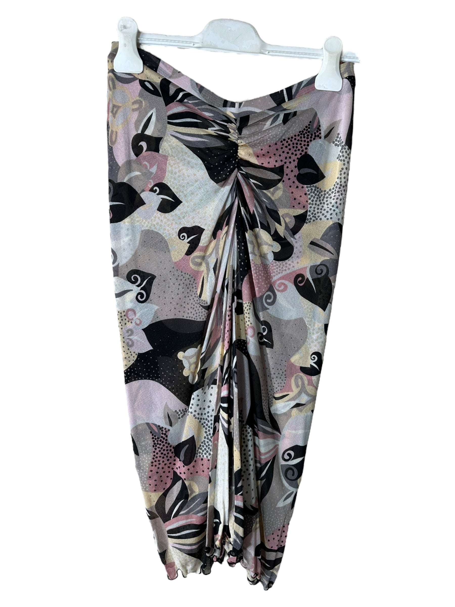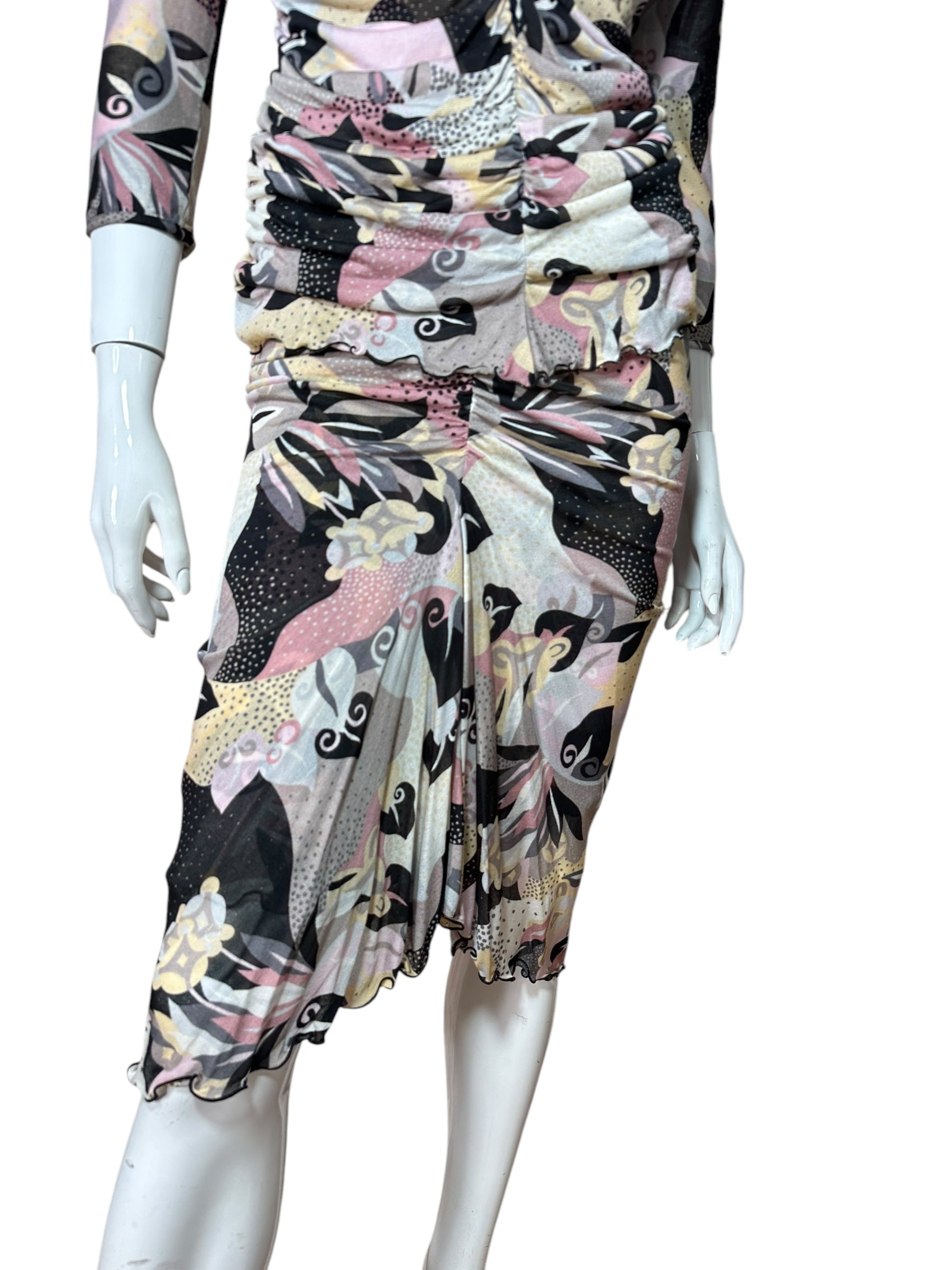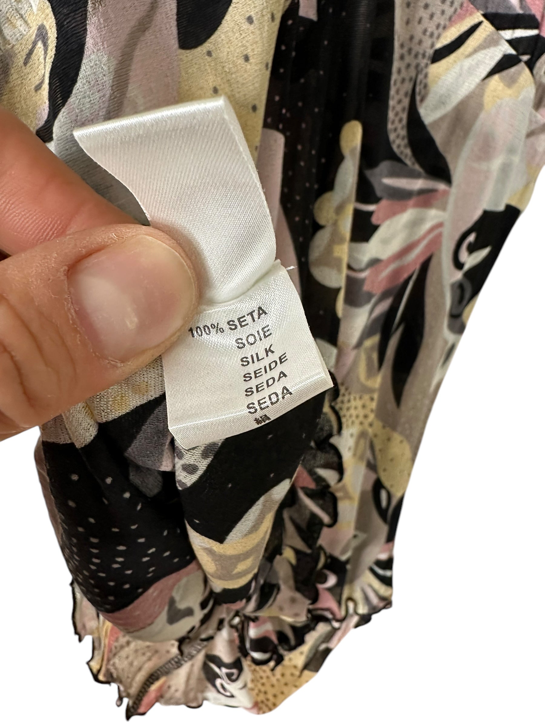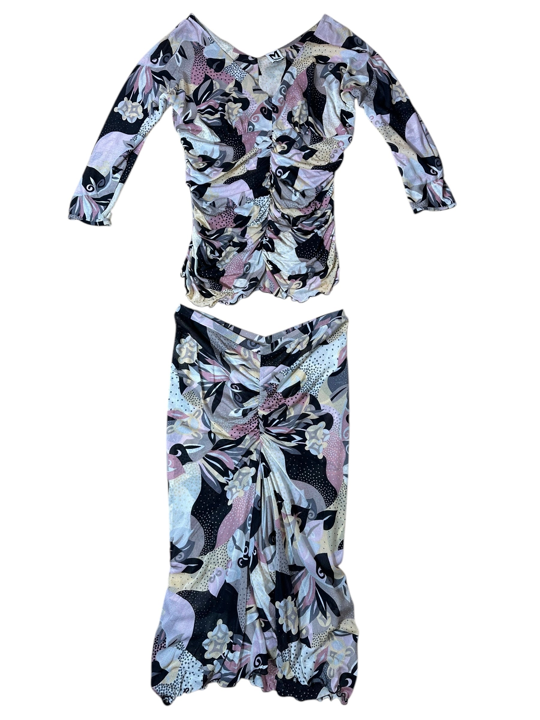 Elegante completo firmato Missoni, composto da top a maniche tre quarti e gonna lunga, entrambi realizzati in leggerissima seta 100%. Il capo presenta una fantasia astratta nei toni del rosa cipria, nero, panna e grigio, arricchita da inserti a pois e motivi floreali stilizzati, tipici dell’estetica Missoni.