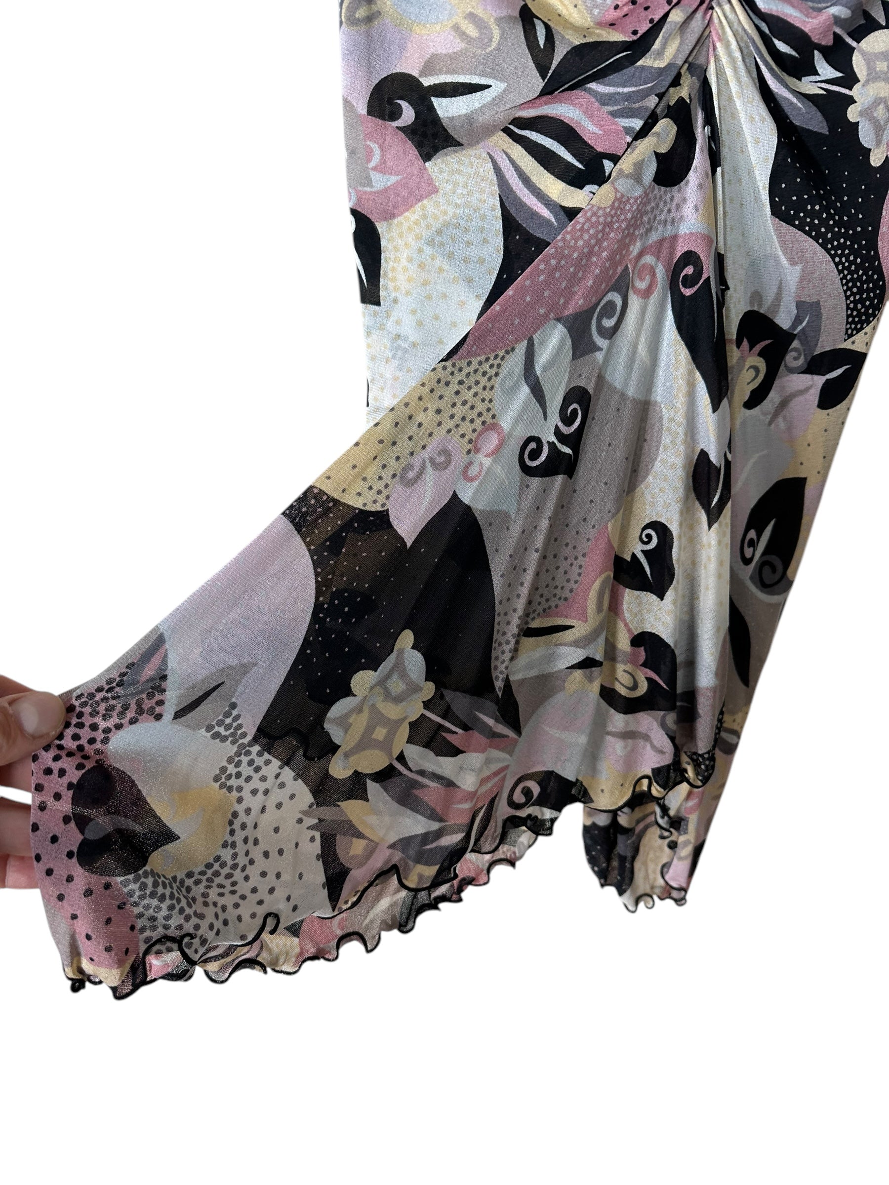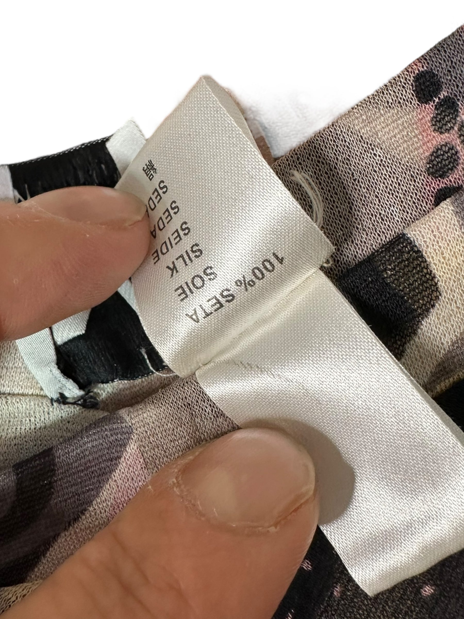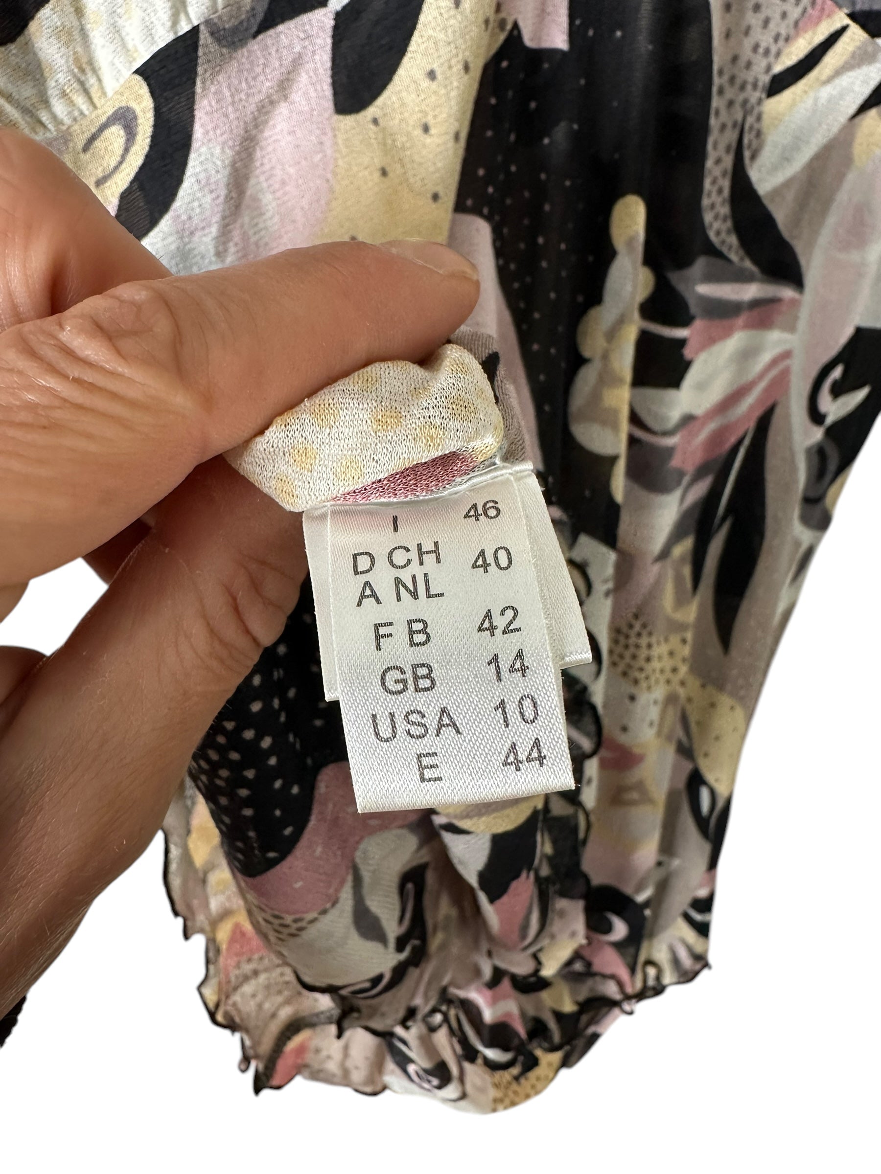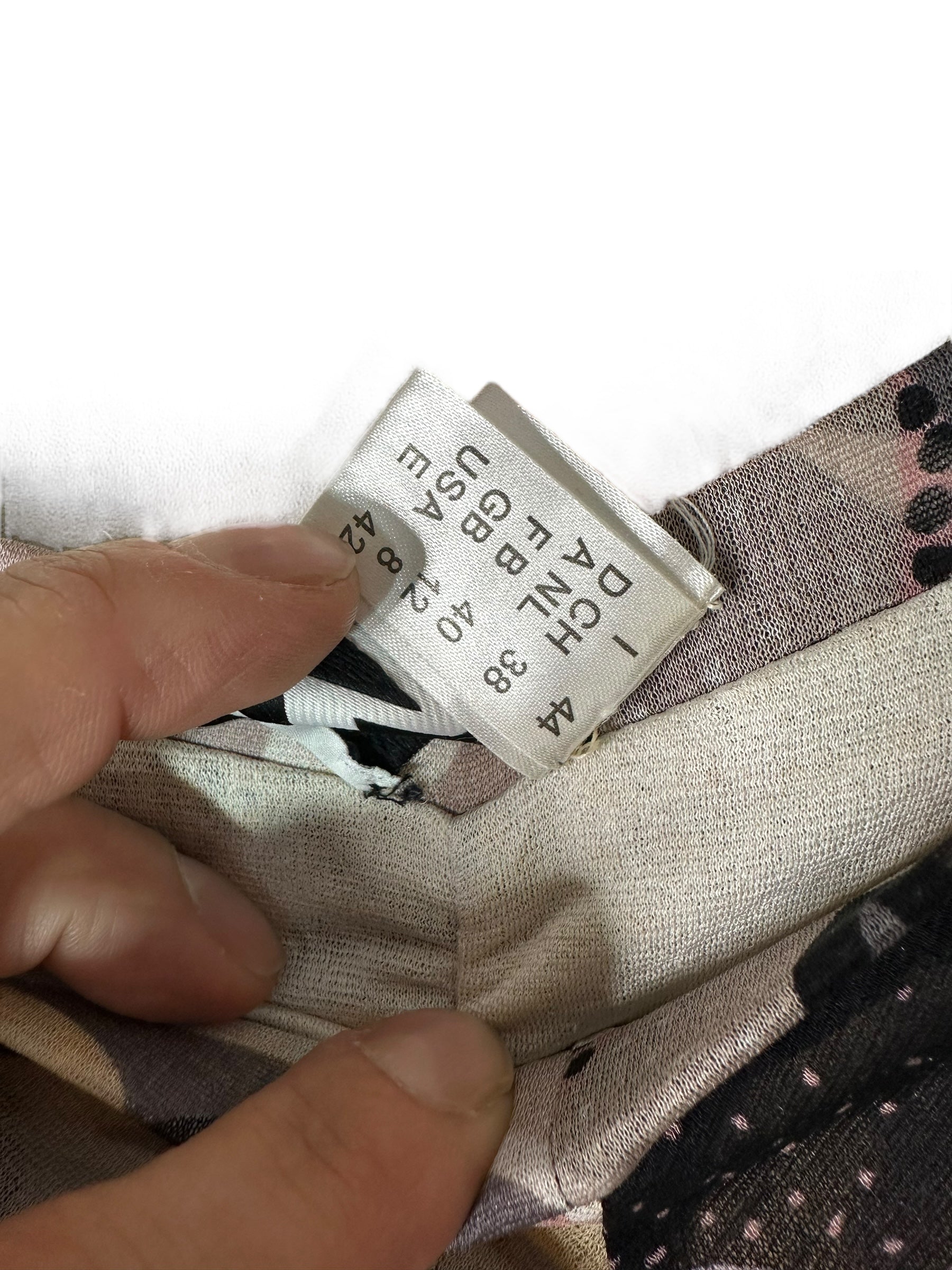 Elegante completo firmato Missoni, composto da top a maniche tre quarti e gonna lunga, entrambi realizzati in leggerissima seta 100%. Il capo presenta una fantasia astratta nei toni del rosa cipria, nero, panna e grigio, arricchita da inserti a pois e motivi floreali stilizzati, tipici dell’estetica Missoni.