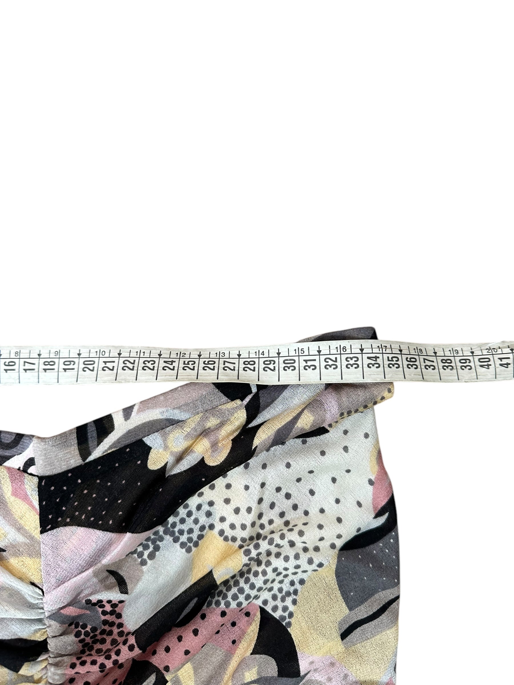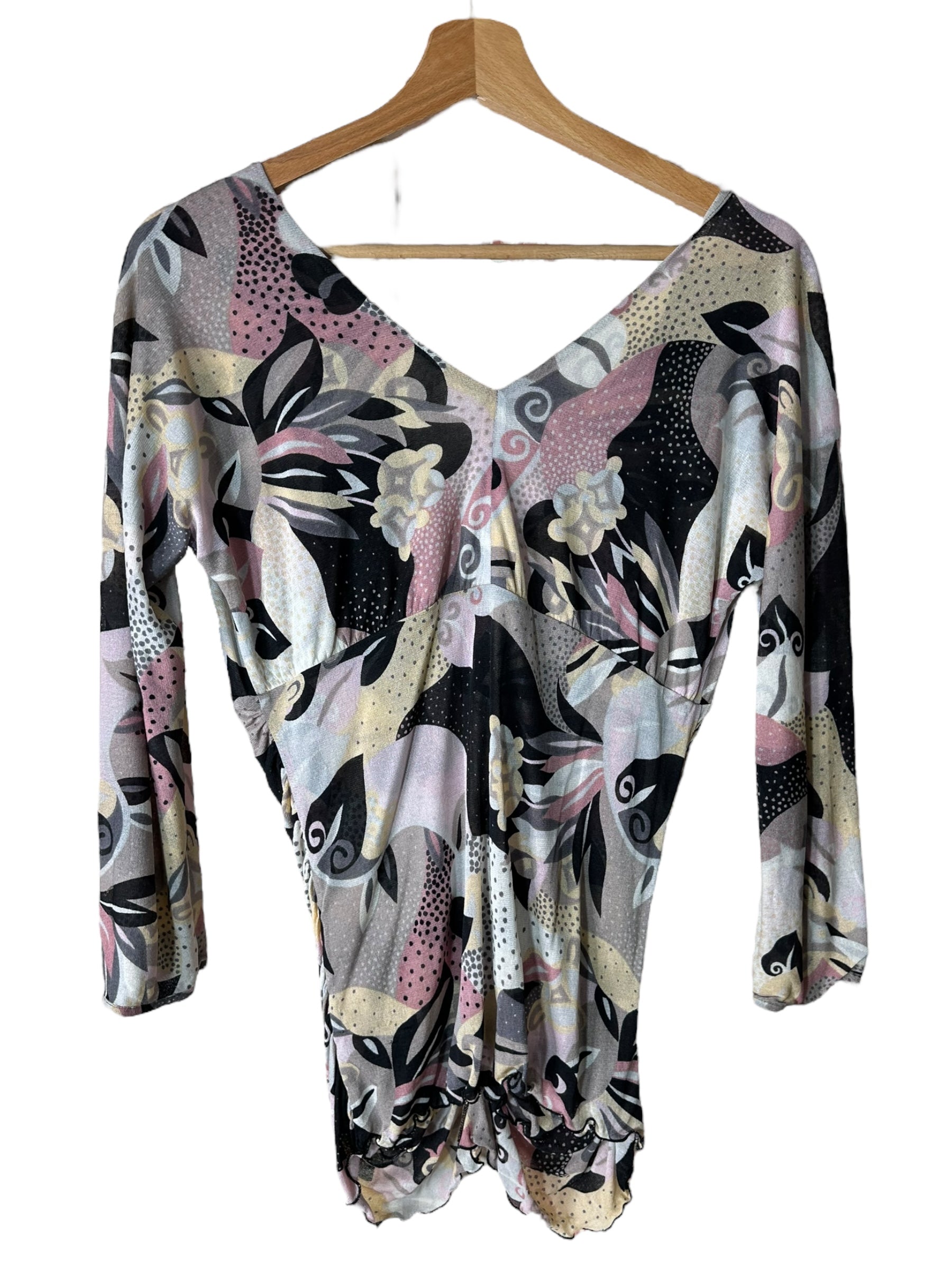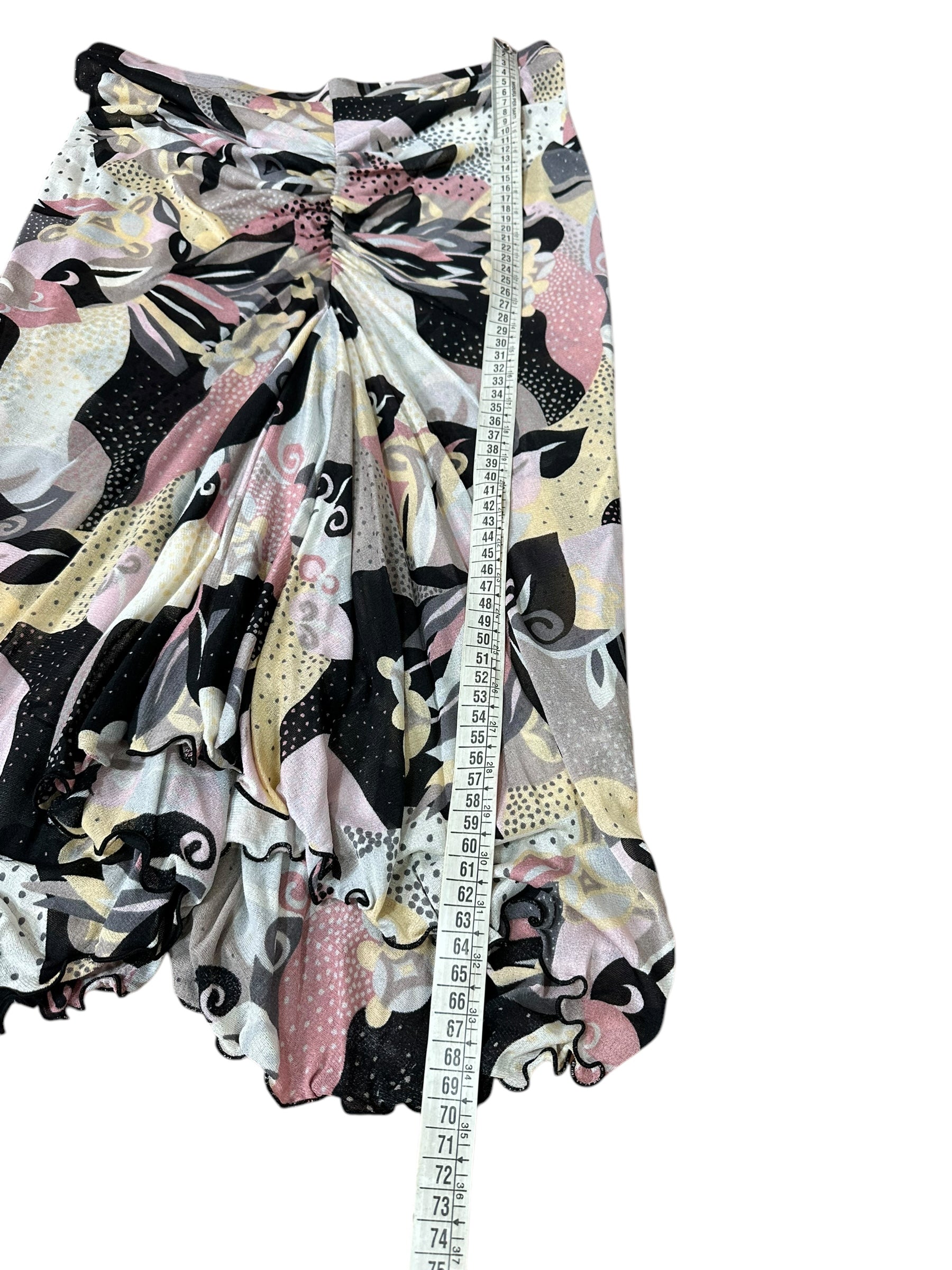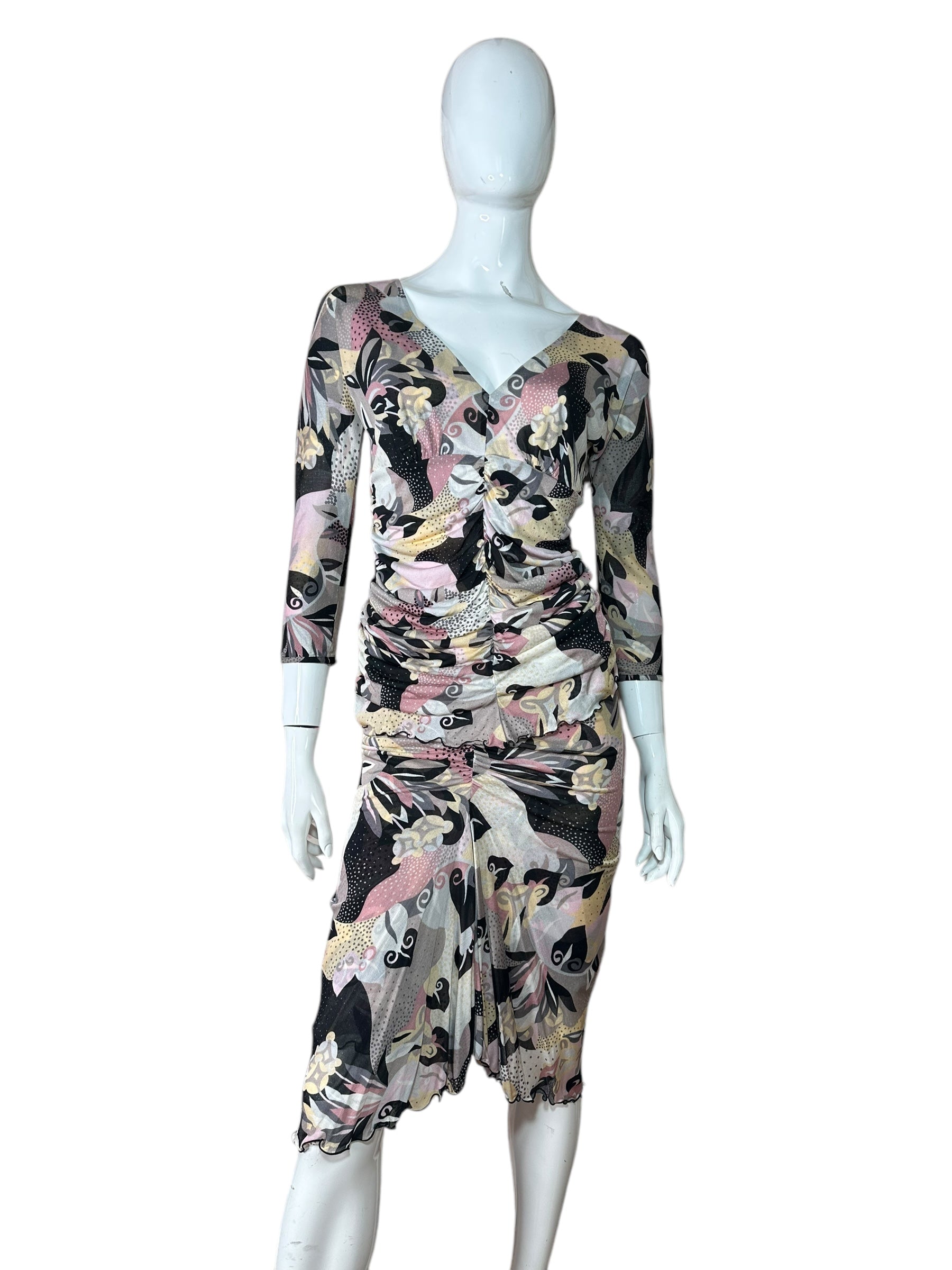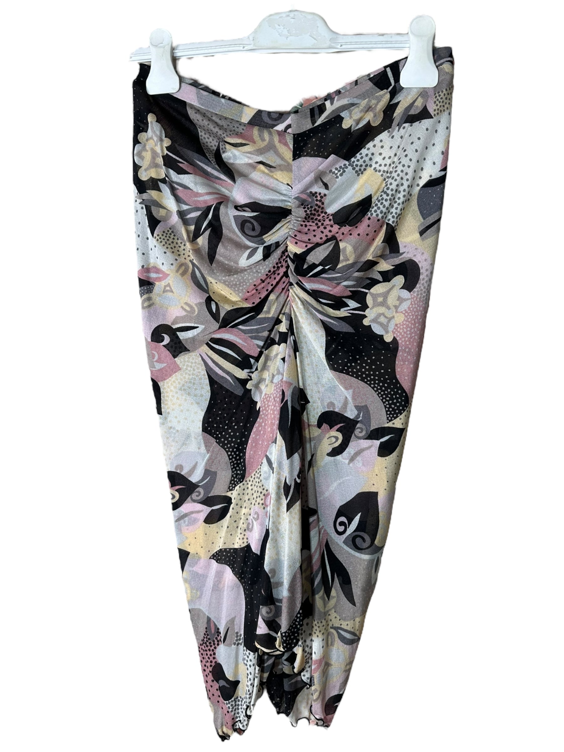 Elegante completo firmato Missoni, composto da top a maniche tre quarti e gonna lunga, entrambi realizzati in leggerissima seta 100%. Il capo presenta una fantasia astratta nei toni del rosa cipria, nero, panna e grigio, arricchita da inserti a pois e motivi floreali stilizzati, tipici dell’estetica Missoni.