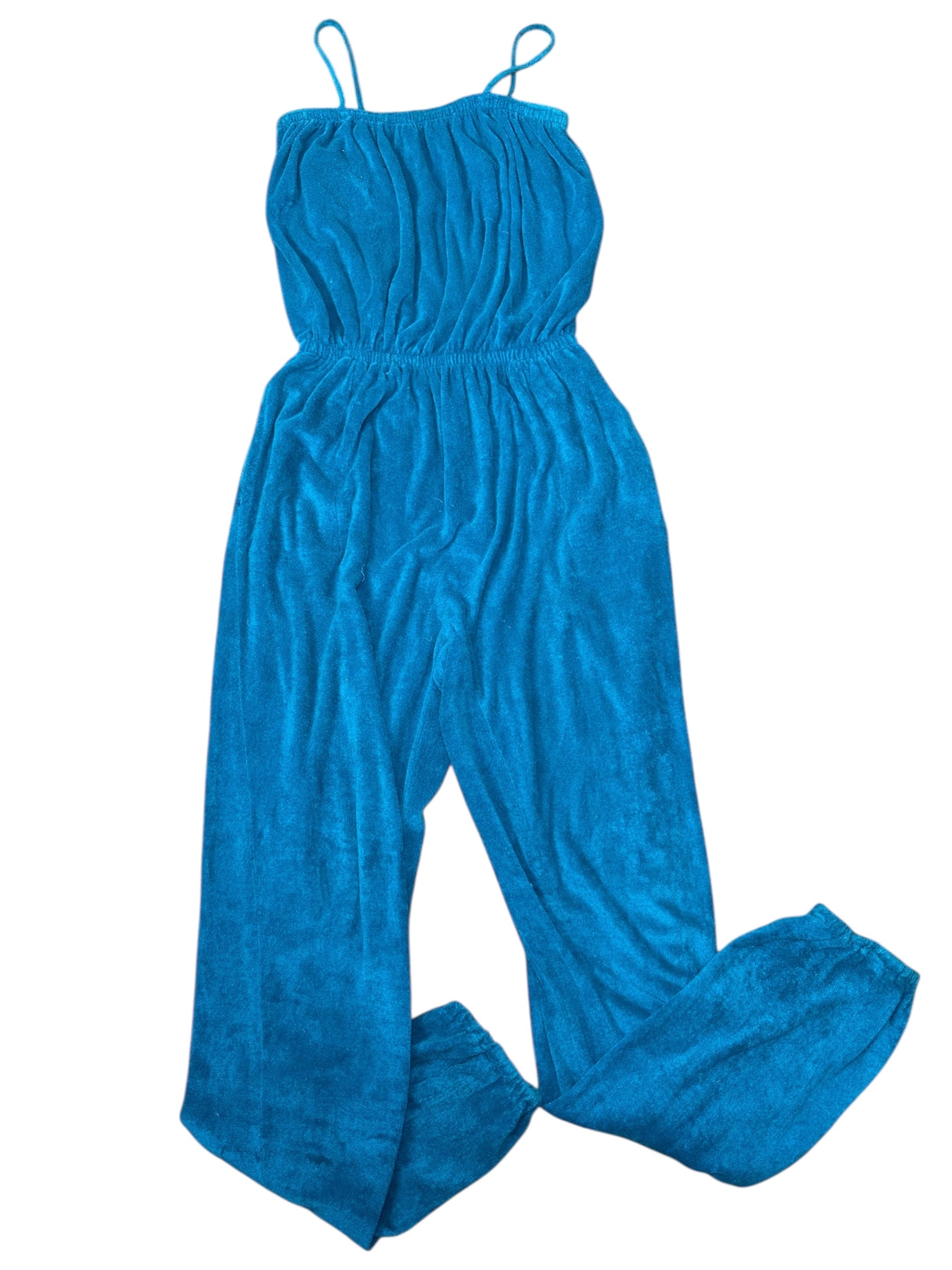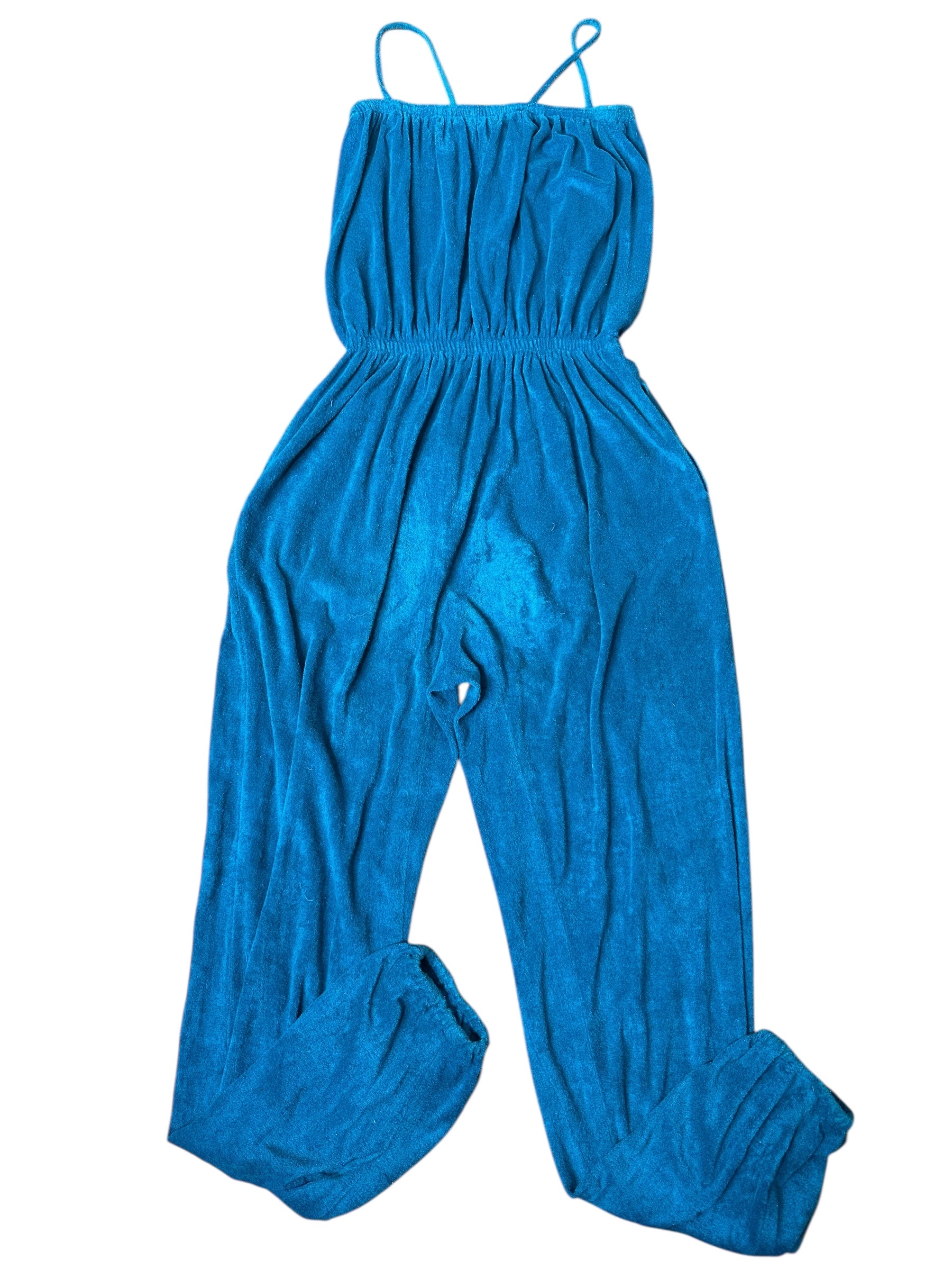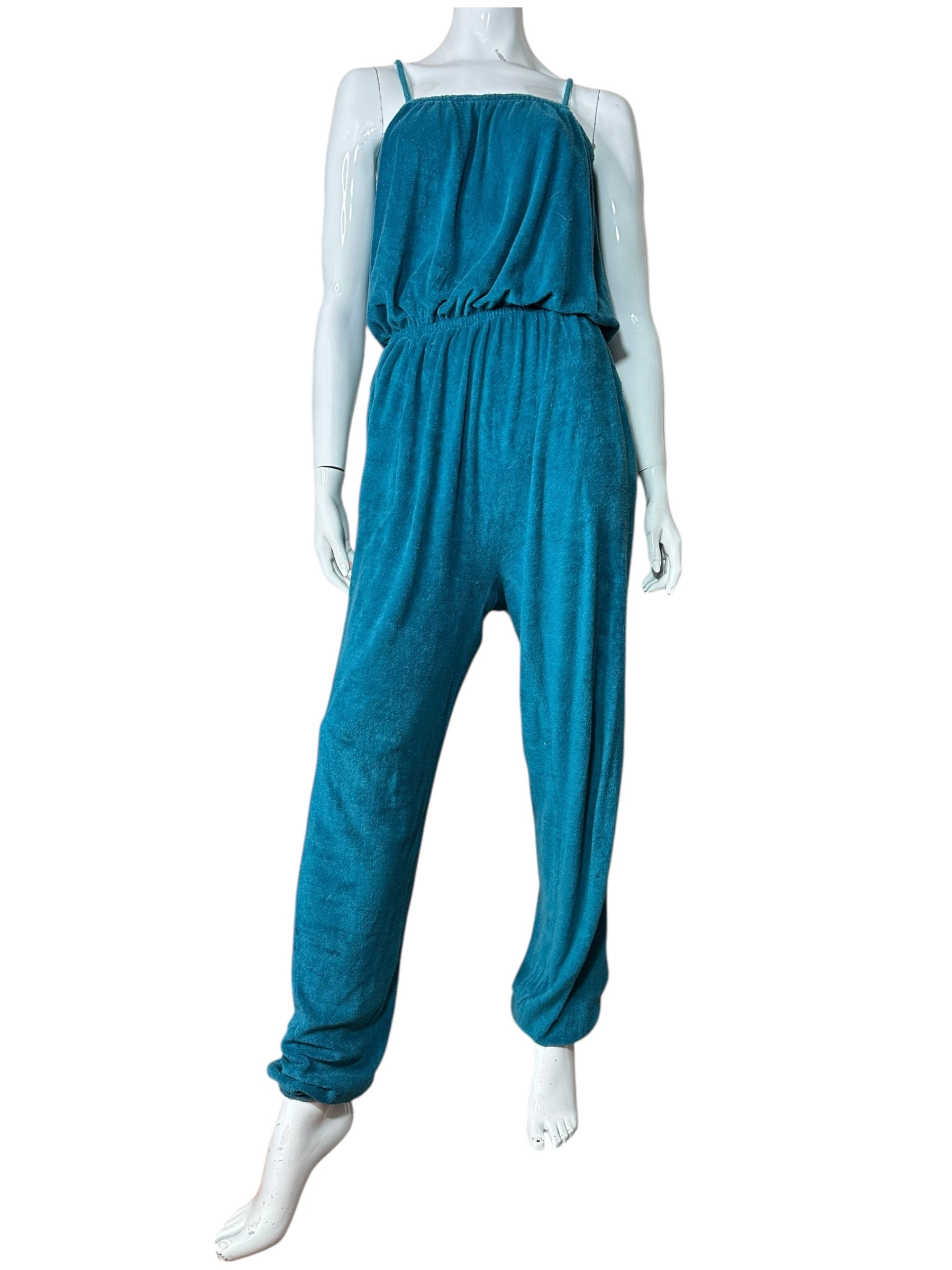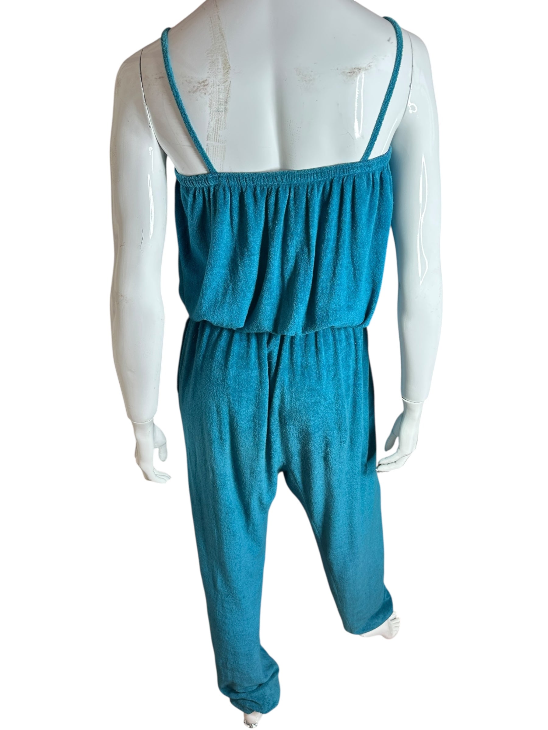Tuta lunga vintage firmata Missoni, realizzata in morbido cotone effetto spugna stretch, dal tipico stile rilassato e fluido. Il capo presenta una linea comoda con corpino blusante, spalline sottili, elastico in vita e pantalone morbido con fondo leggermente arricciato. Il colore, un intenso verde-petrolio, dona profondità e carattere a un capo perfetto per l’estate o il tempo libero.