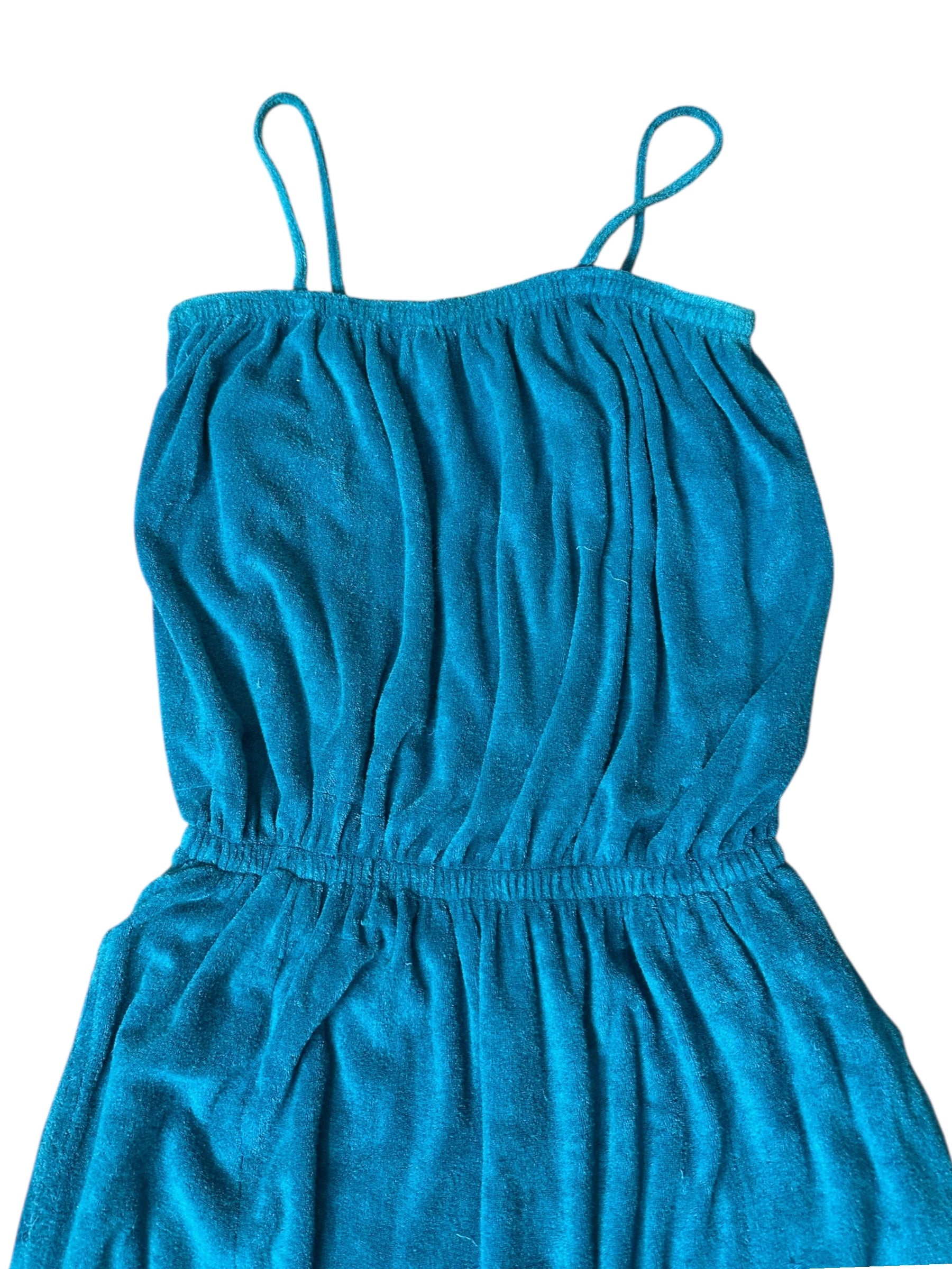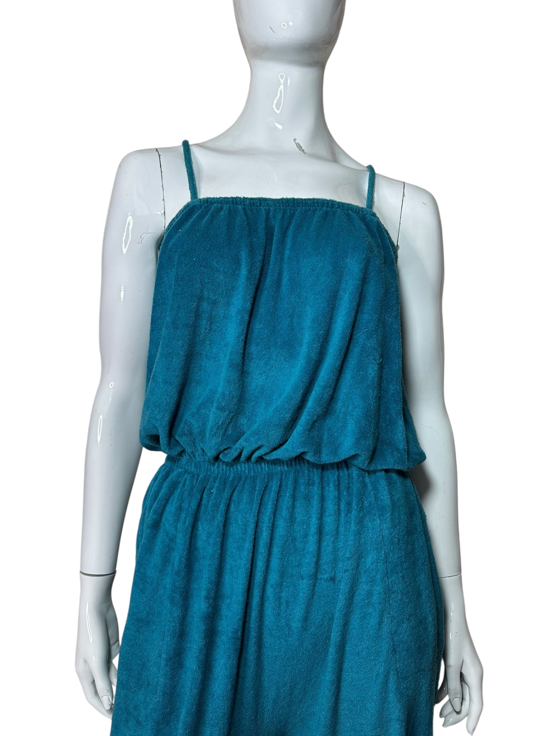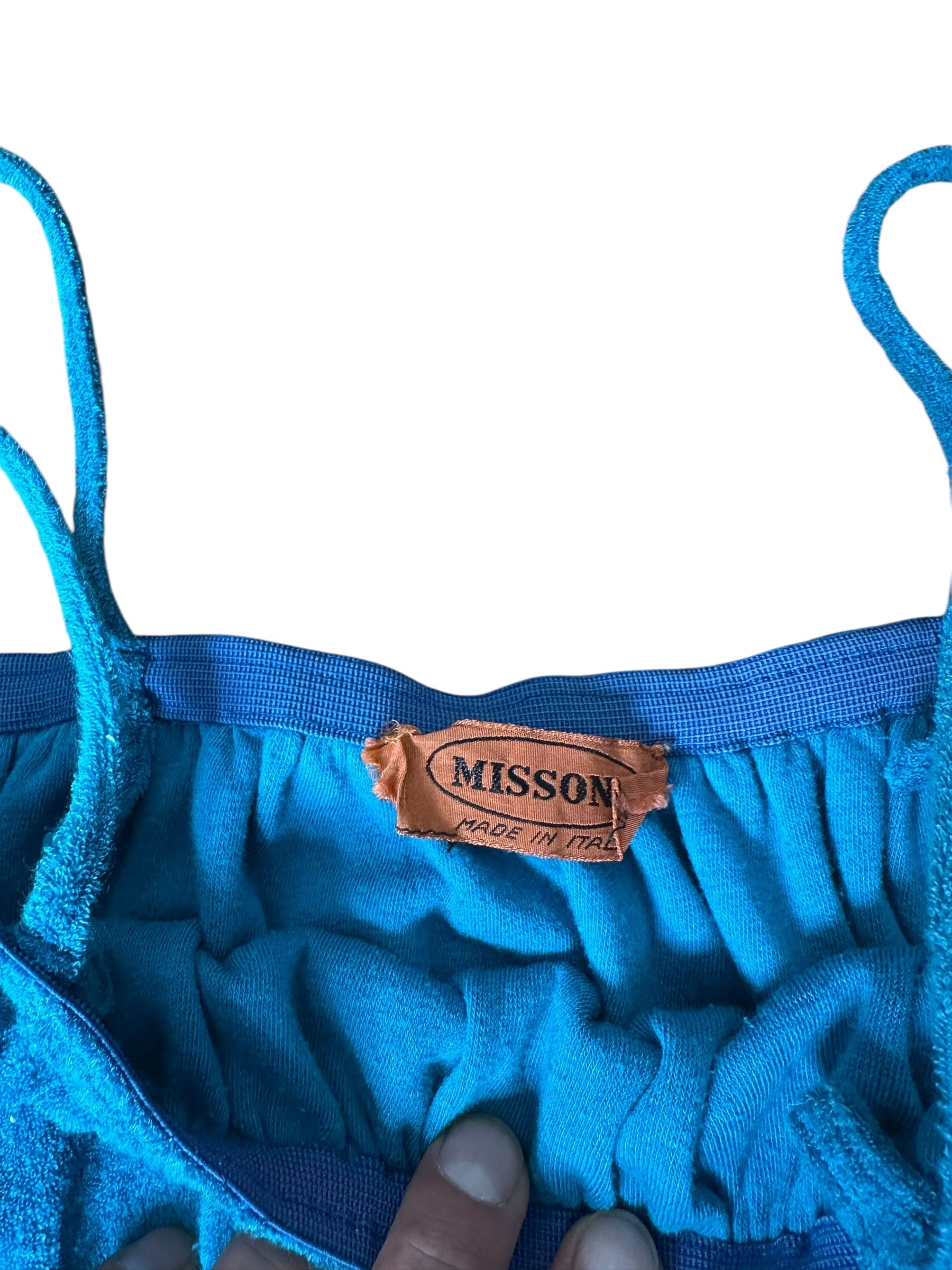 Tuta lunga vintage firmata Missoni, realizzata in morbido cotone effetto spugna stretch, dal tipico stile rilassato e fluido. Il capo presenta una linea comoda con corpino blusante, spalline sottili, elastico in vita e pantalone morbido con fondo leggermente arricciato. Il colore, un intenso verde-petrolio, dona profondità e carattere a un capo perfetto per l’estate o il tempo libero.