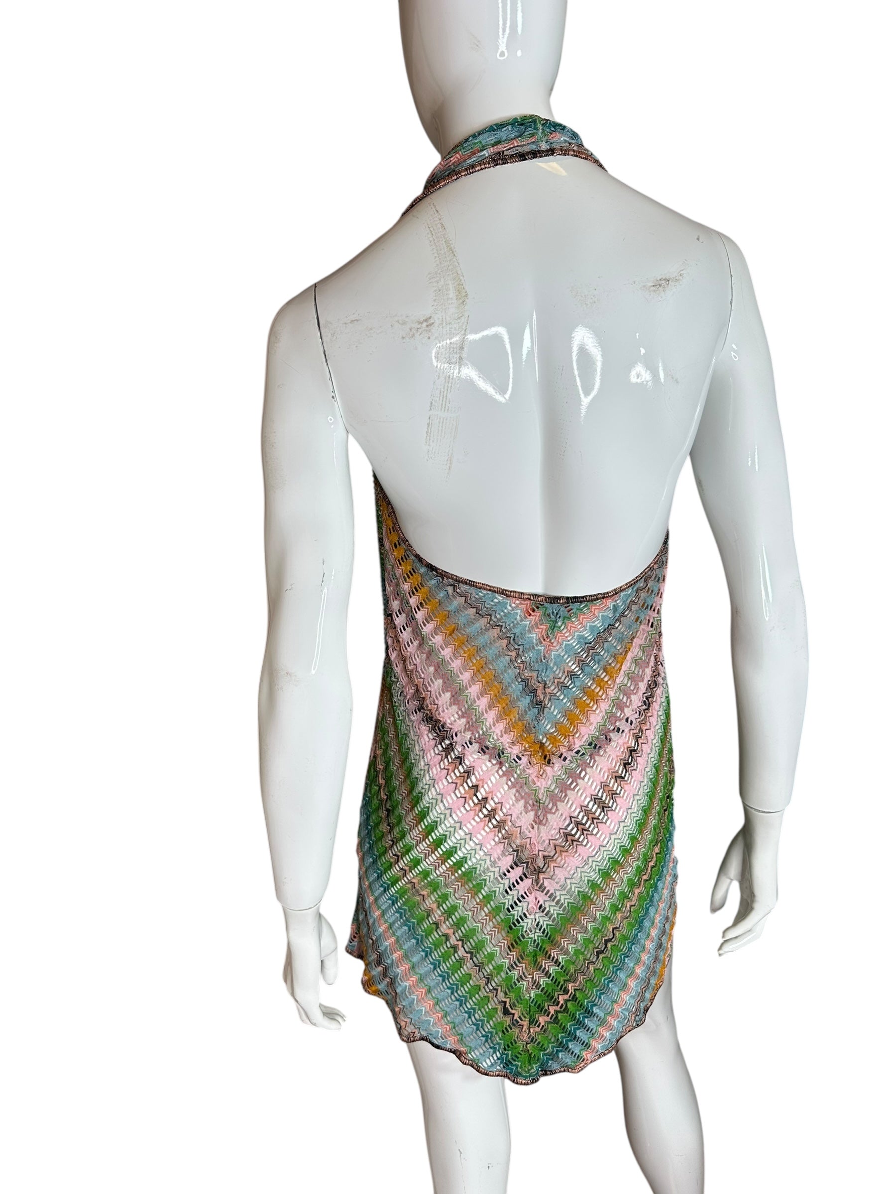 Elegante e vivace mini-abito Missoni Mare, realizzato nell’iconico punto fiamma della maison, con filati multicolore che spaziano dal verde al rosa, all’azzurro e al giallo.