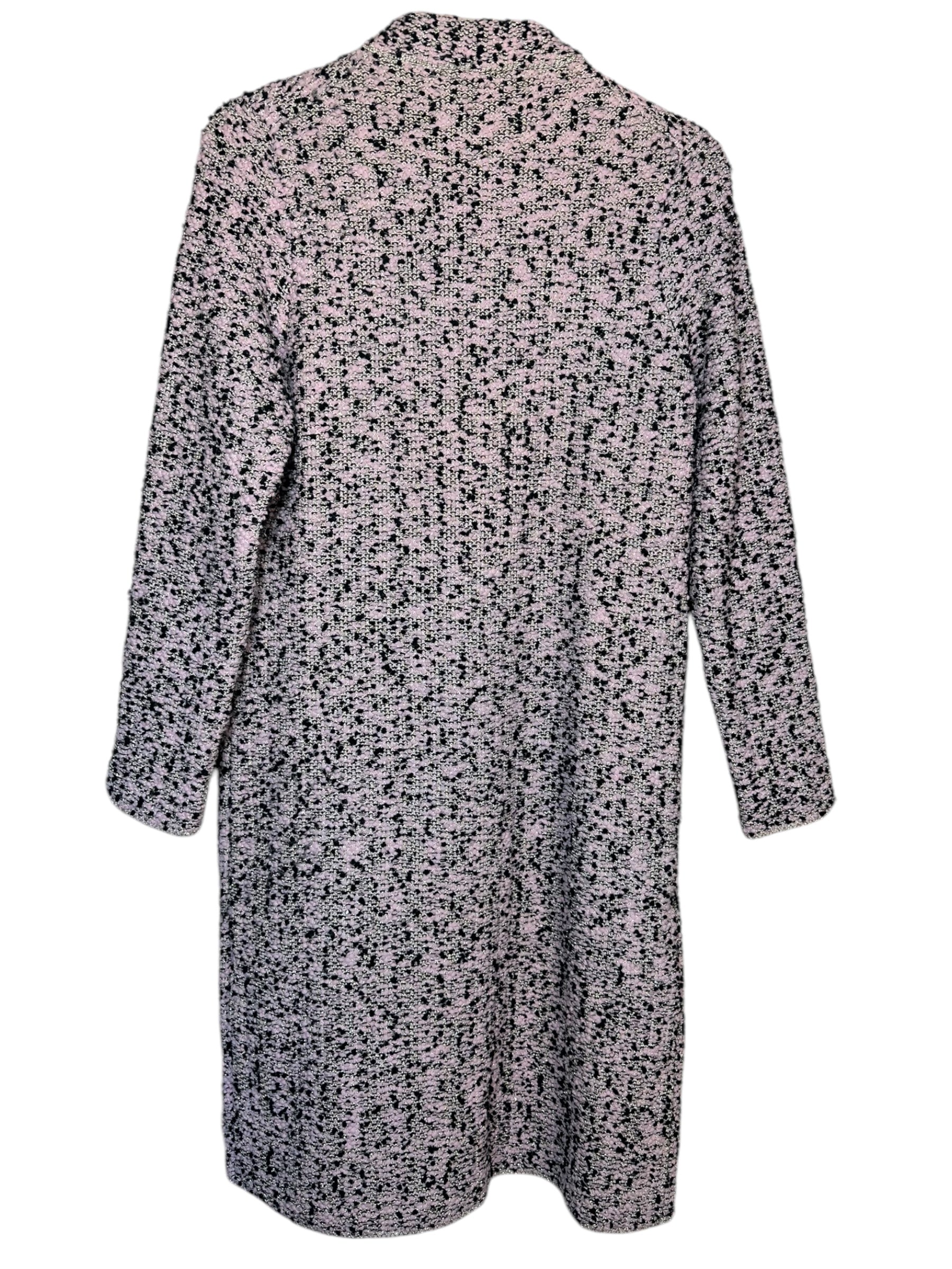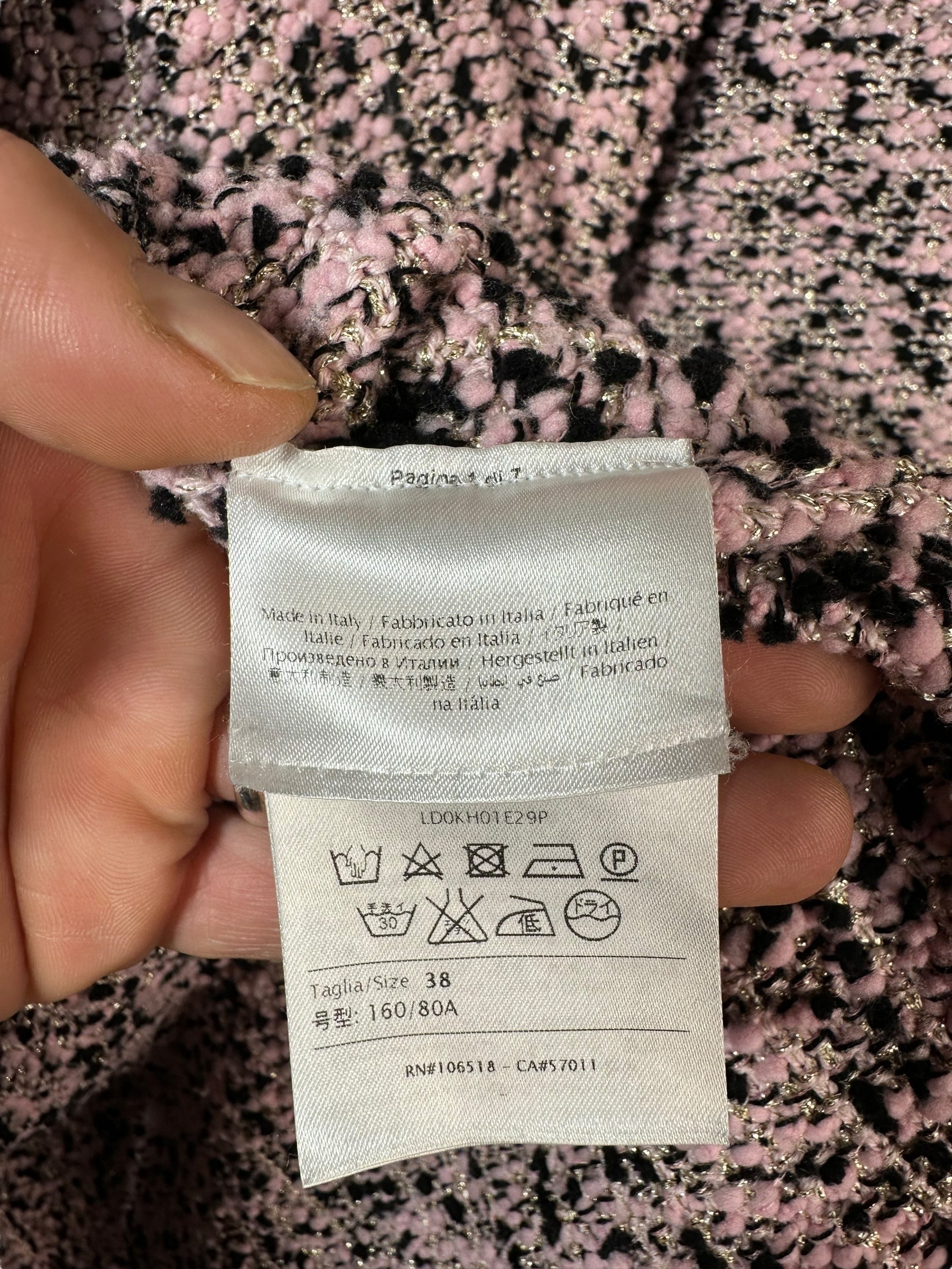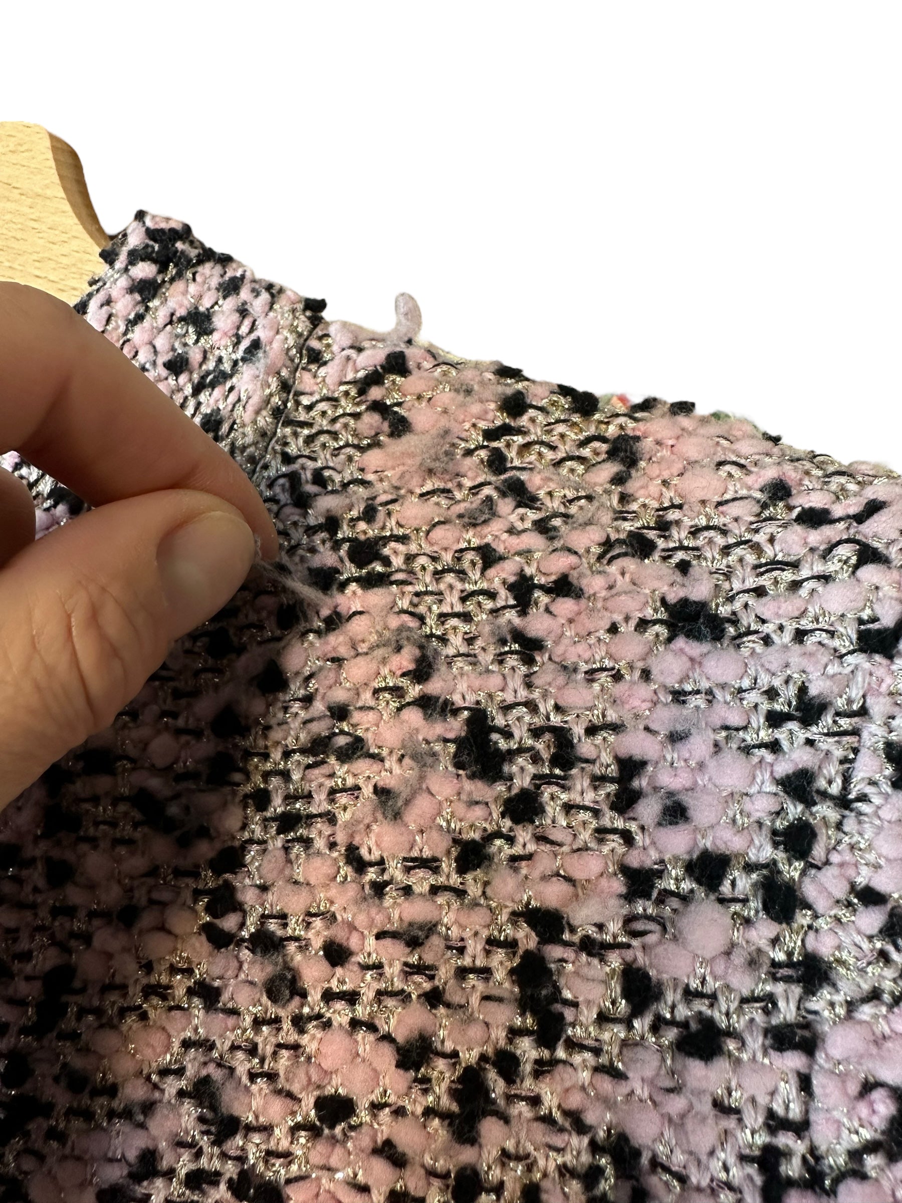 • Il cardigan presenta un mix di tonalità rosa pallido, nero e accenti metallici dorati, con un effetto mélange che aggiunge profondità al tessuto.