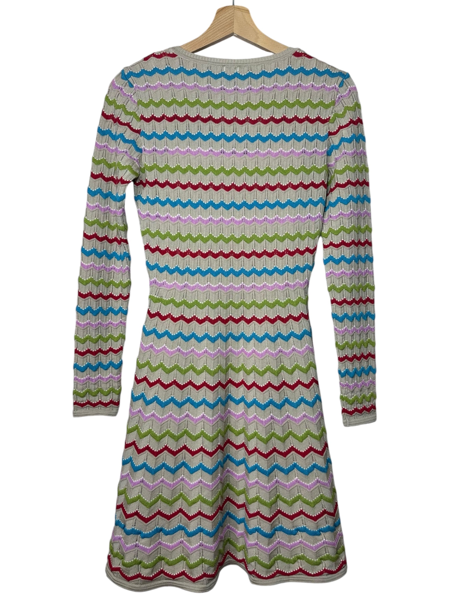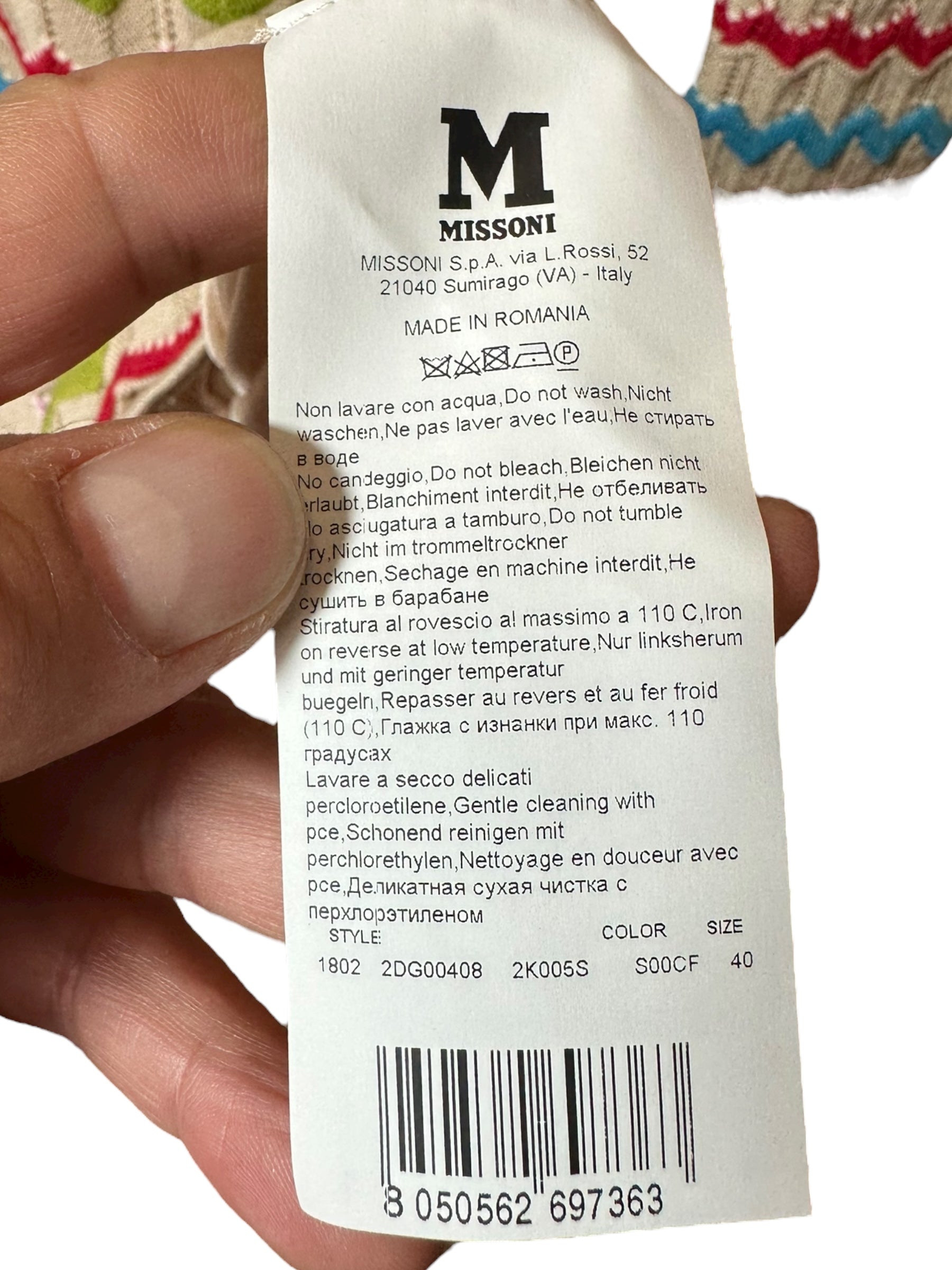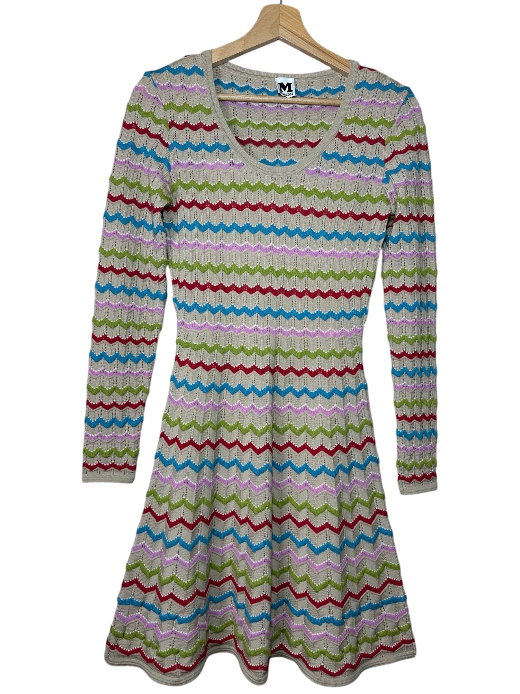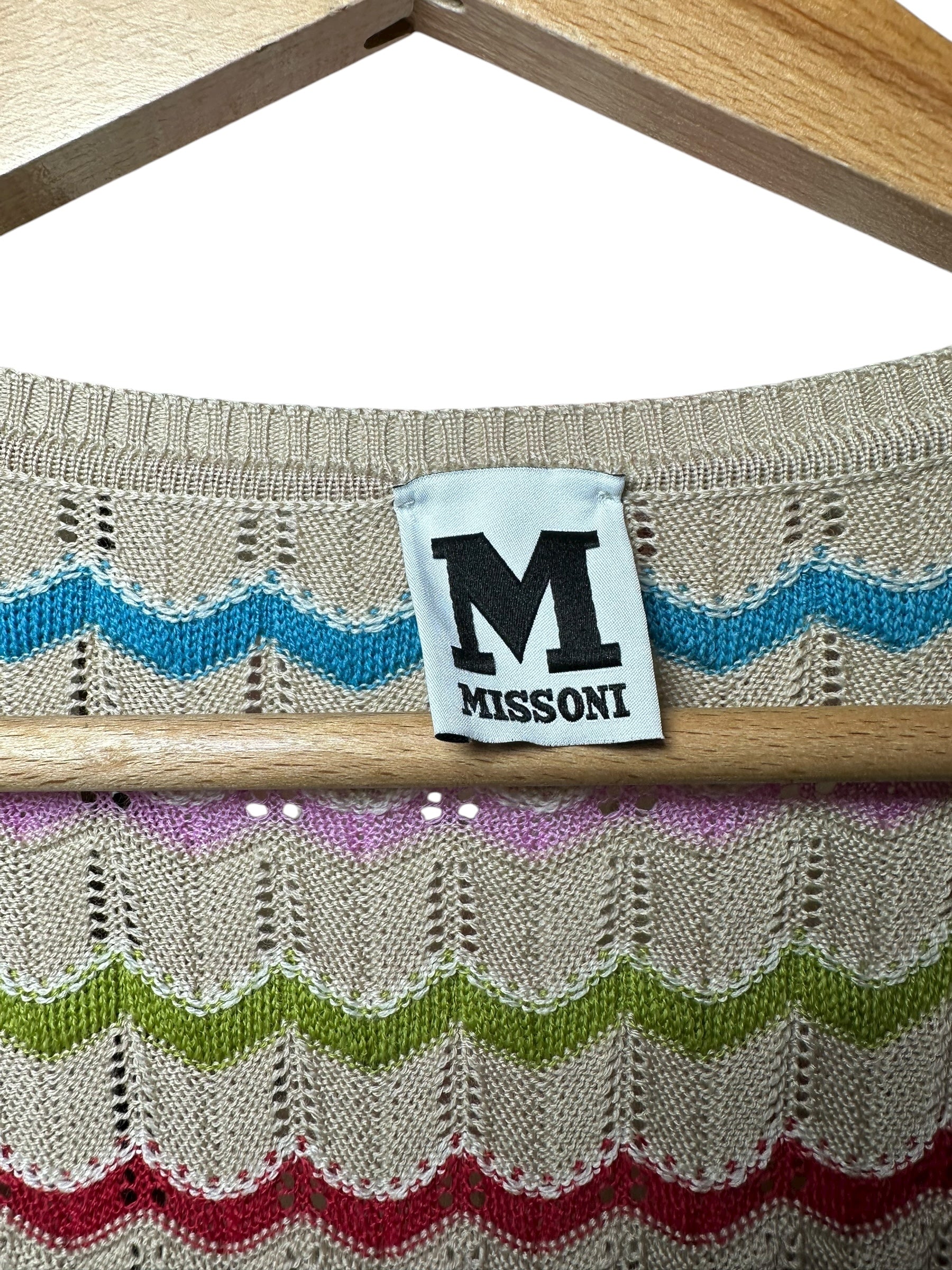 Elegante e iconico mini-abito firmato M Missoni, realizzato in un pregiato tessuto a maglia lavorata con l’inconfondibile pattern a zig-zag multicolore.