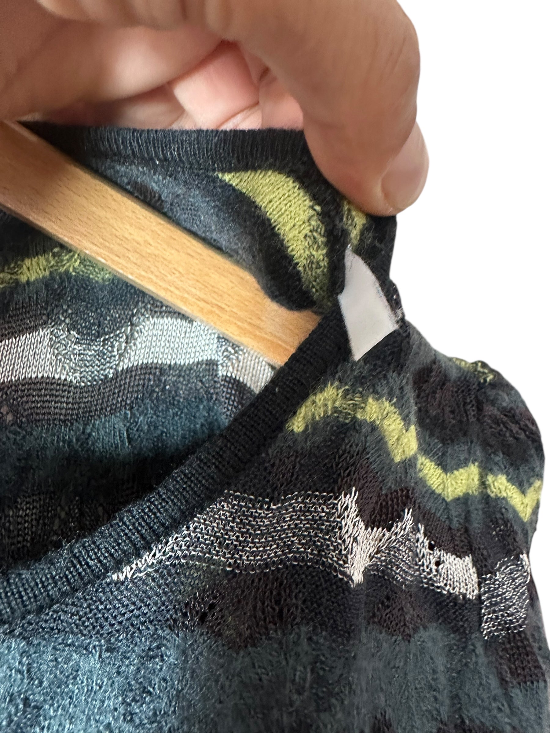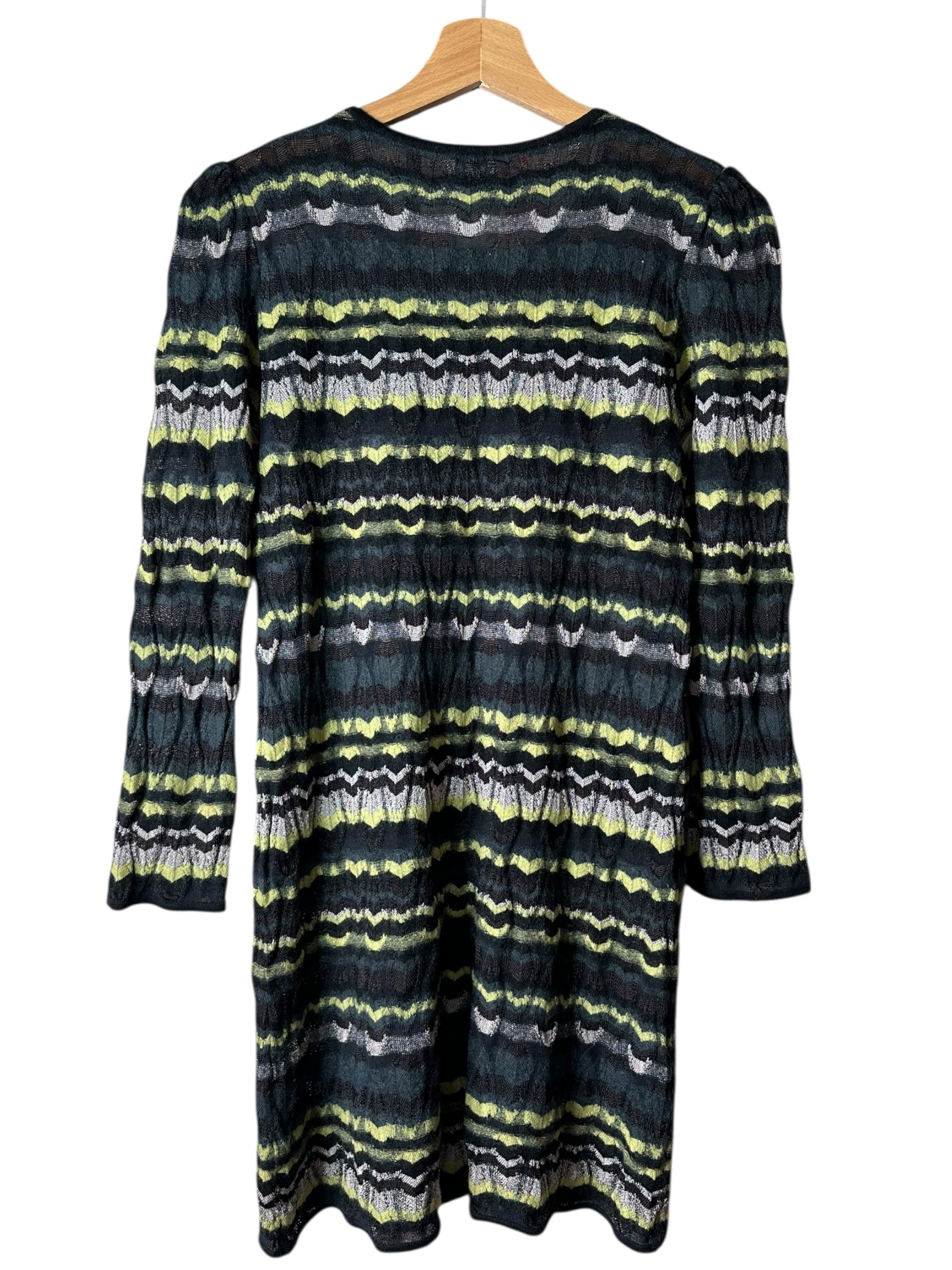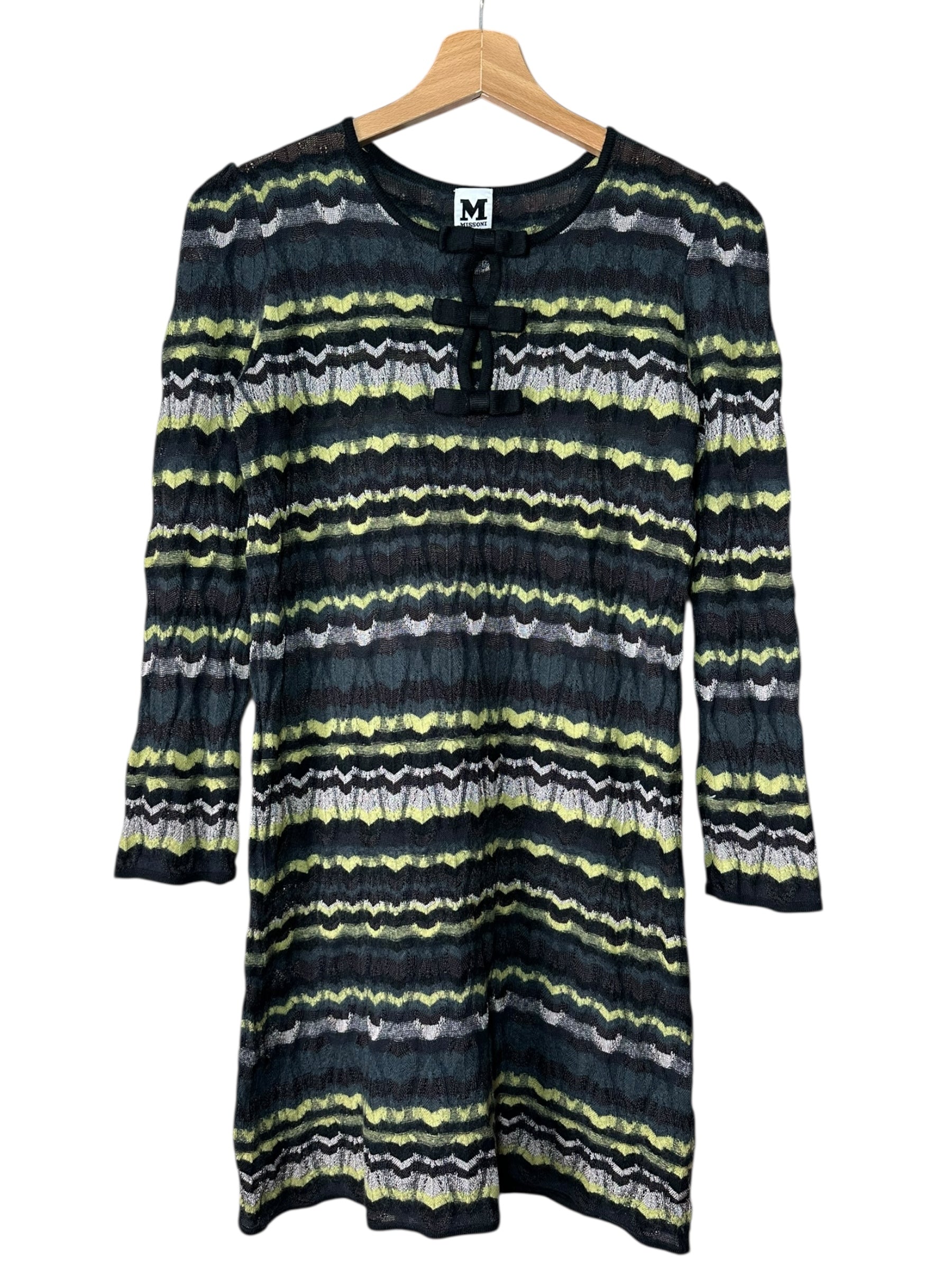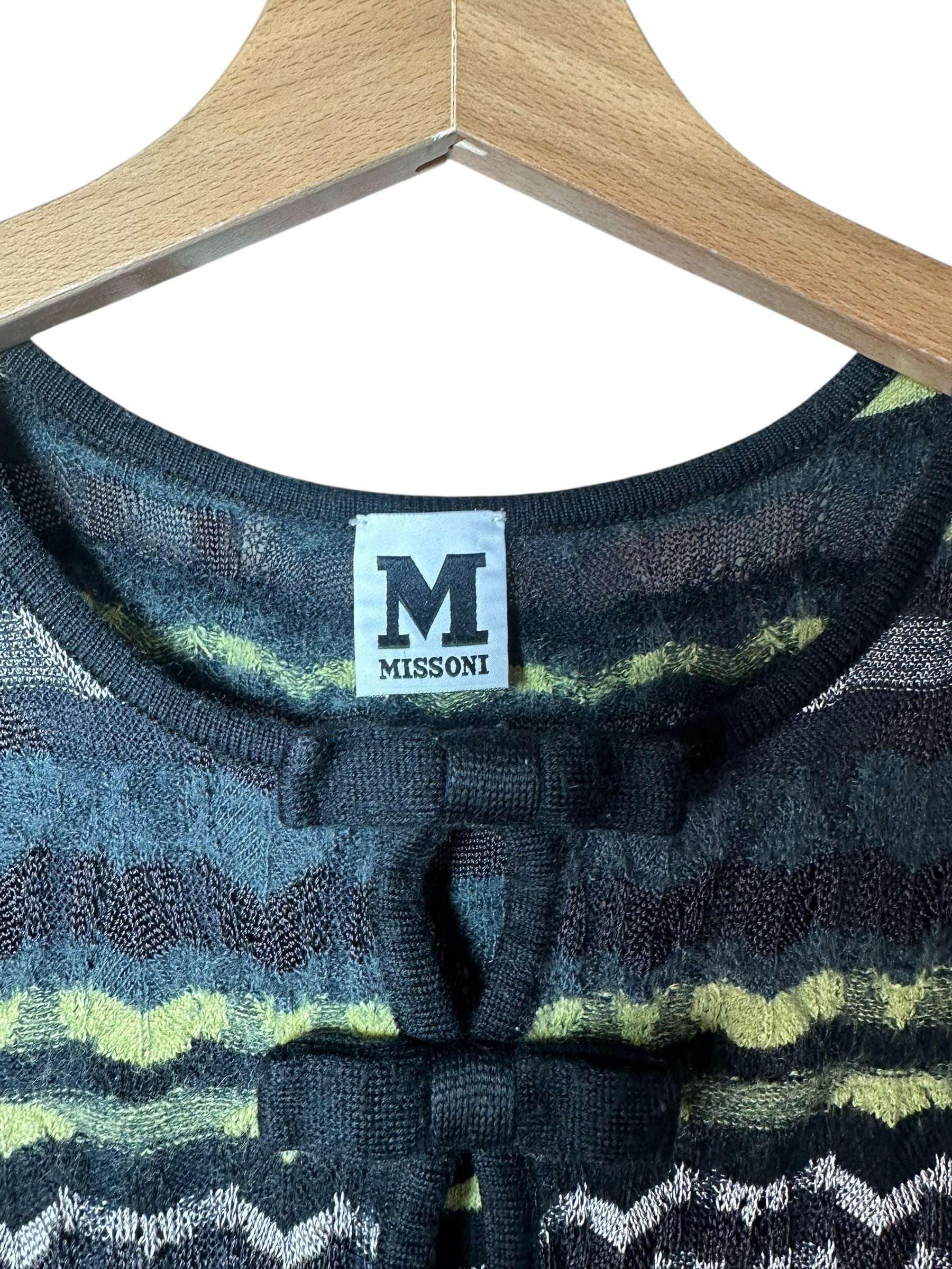 Mini abito vintage Missoni in lanetta misto viscosa, caratterizzato dall’iconica lavorazione a zig-zag multicolore nei toni del nero, verde lime e grigio. Il modello presenta scollo tondo con tre aperture verticali impreziosite da fiocchetti applicati e maniche lunghe. La linea aderente esalta la figura, mentre la lunghezza mini lo rende perfetto sia per un look quotidiano che per un’occasione serale.