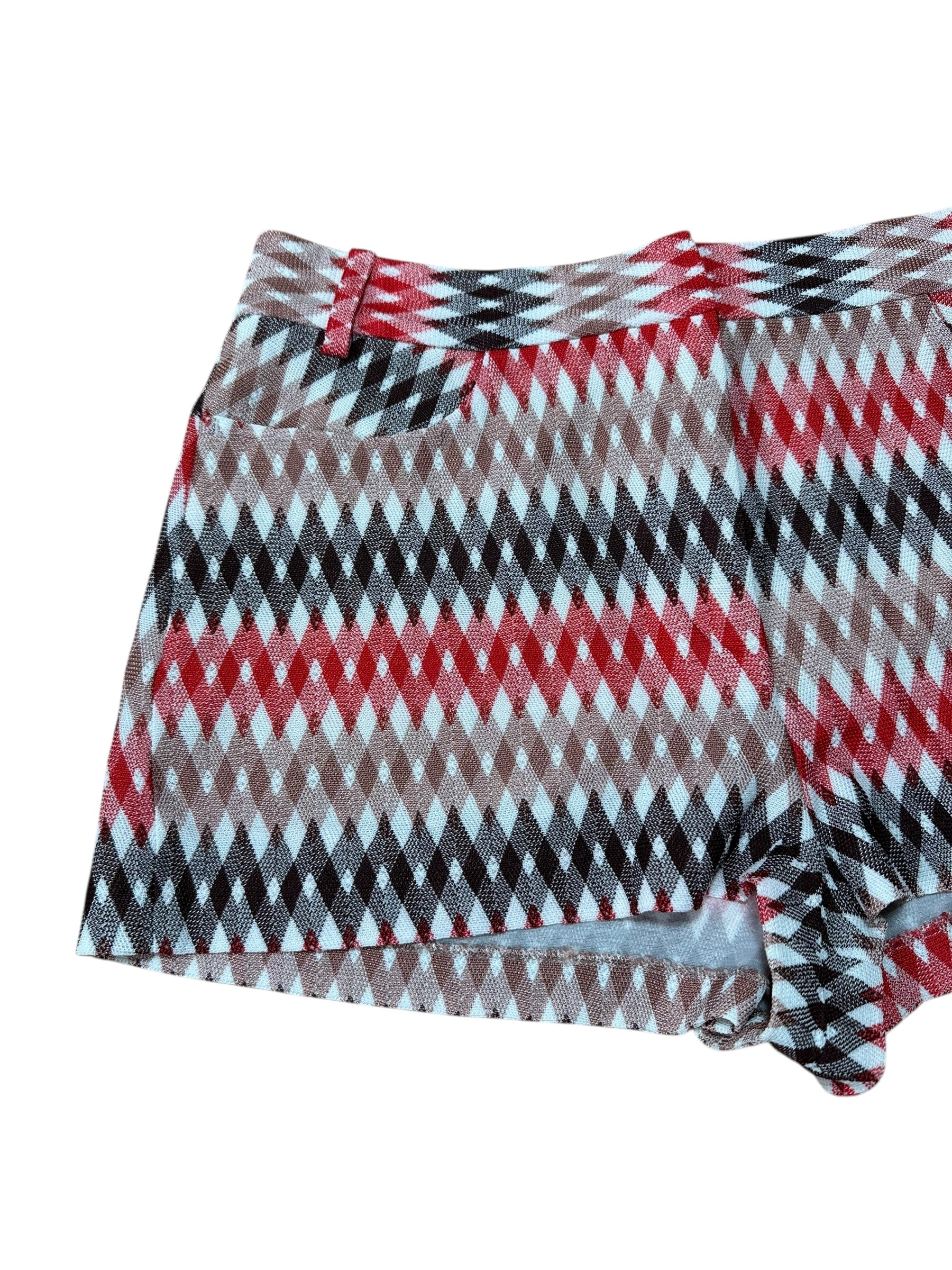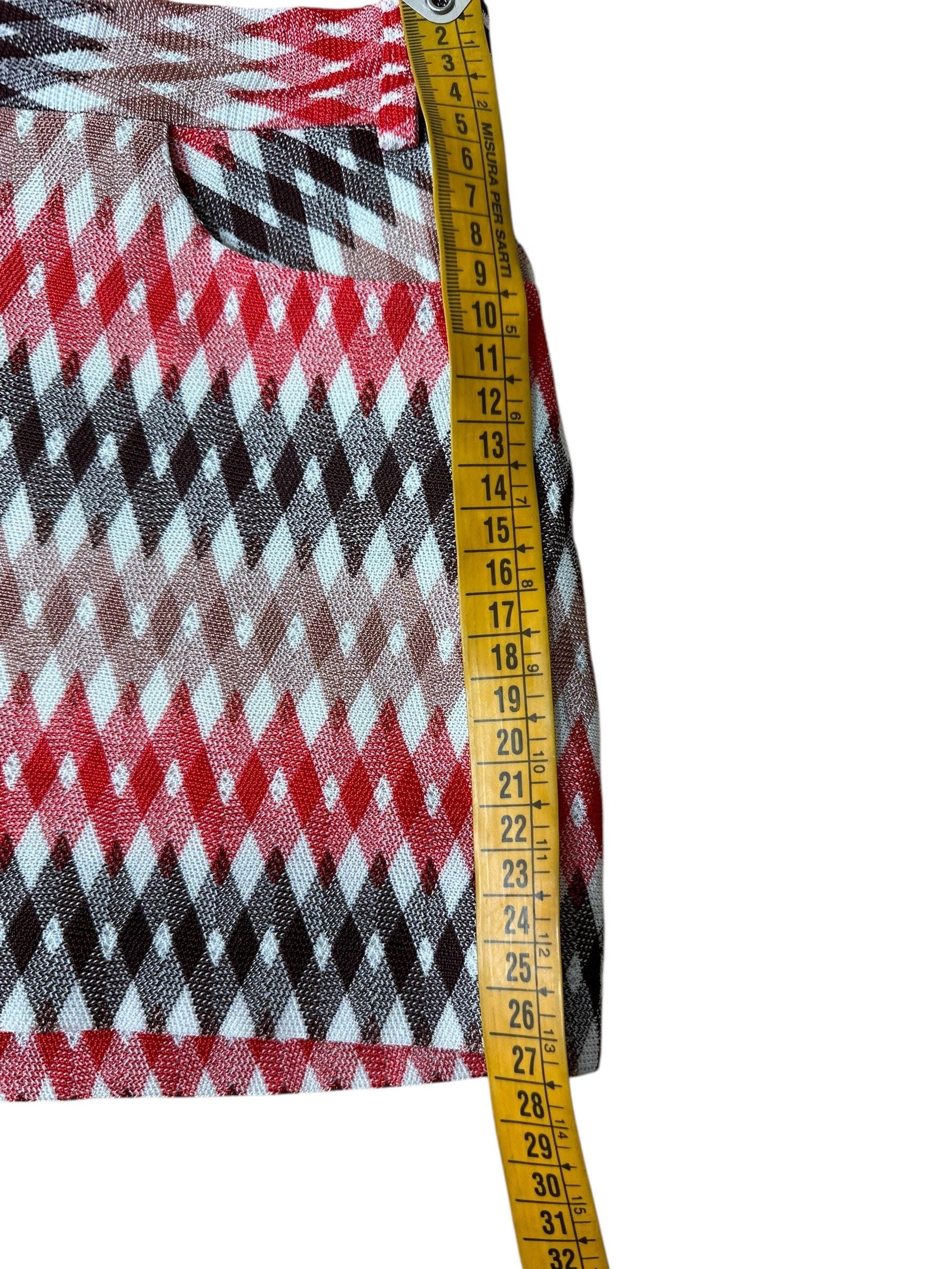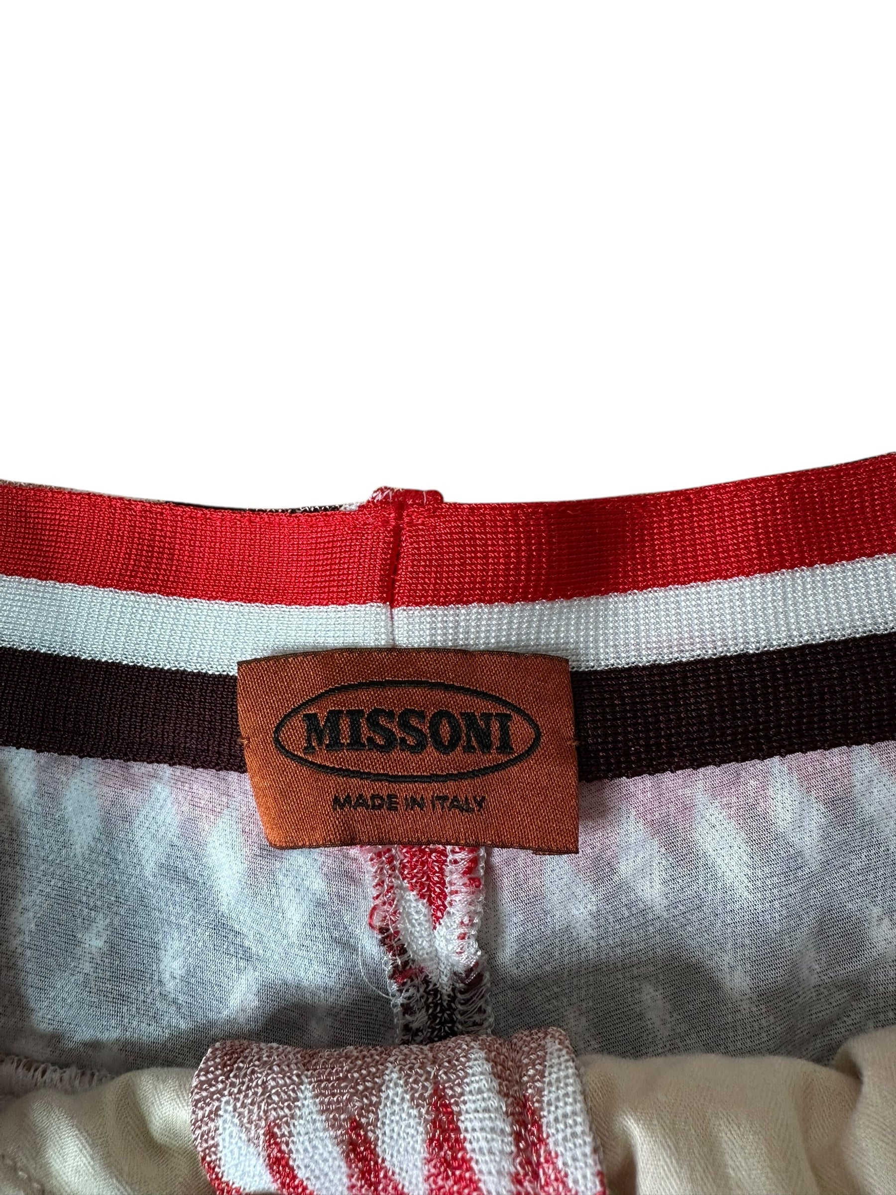 Shorts vintage a vita alta firmati Missoni, realizzati in un tessuto lavorato a maglia leggera e flessibile, con caratteristica fantasia a rombi nei toni del rosso, nero, beige e bianco. Il modello presenta due tasche anteriori applicate e passanti per cintura.