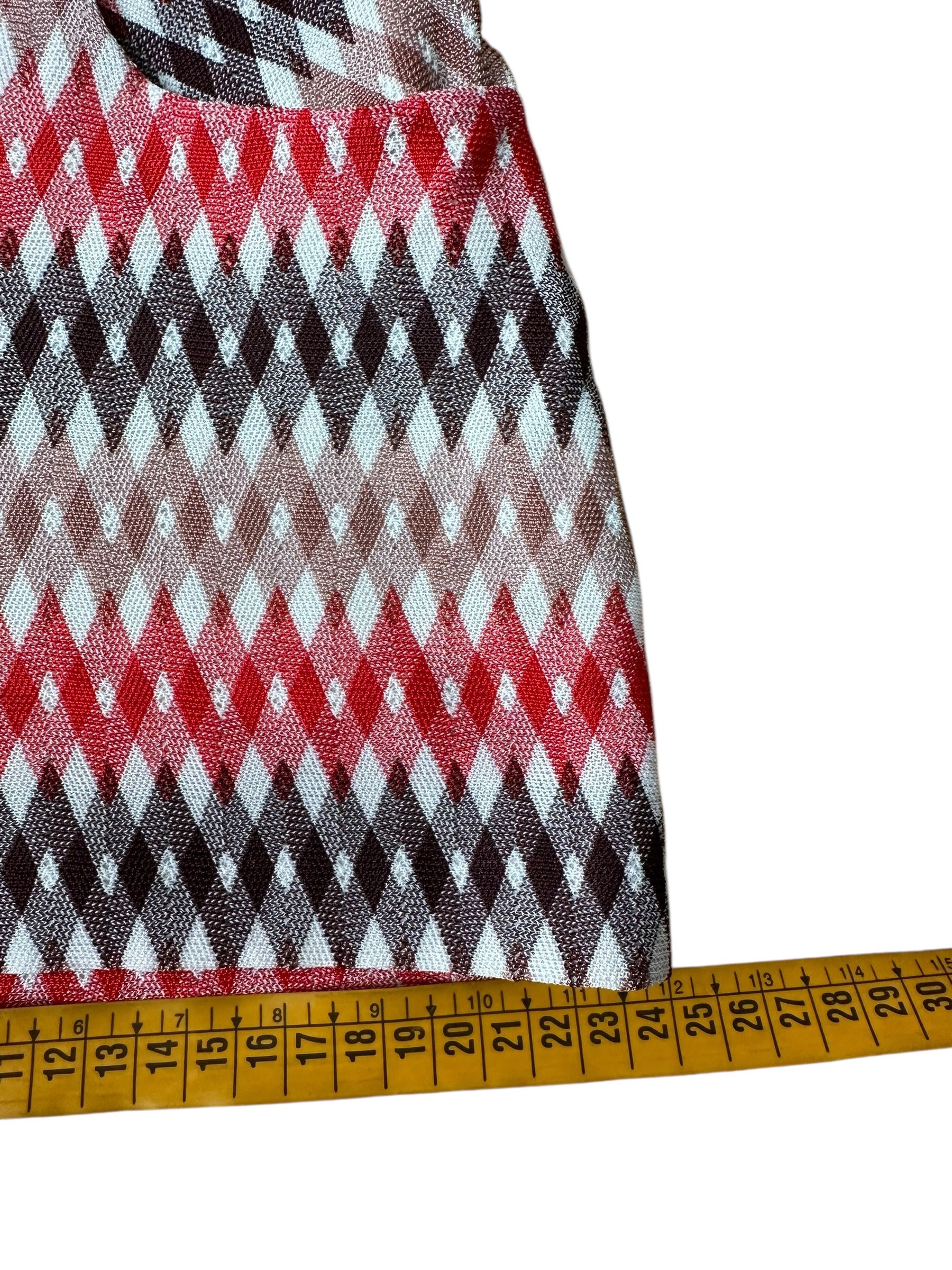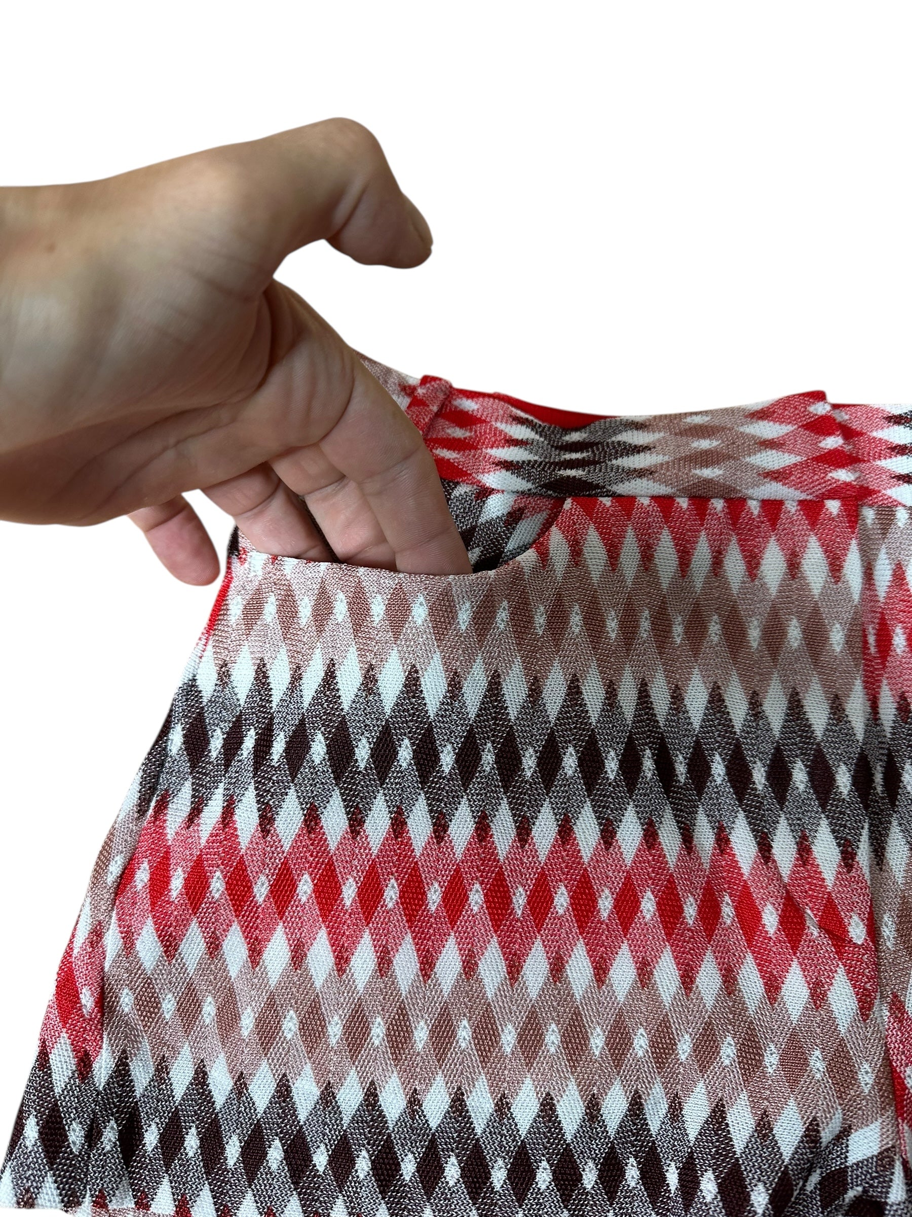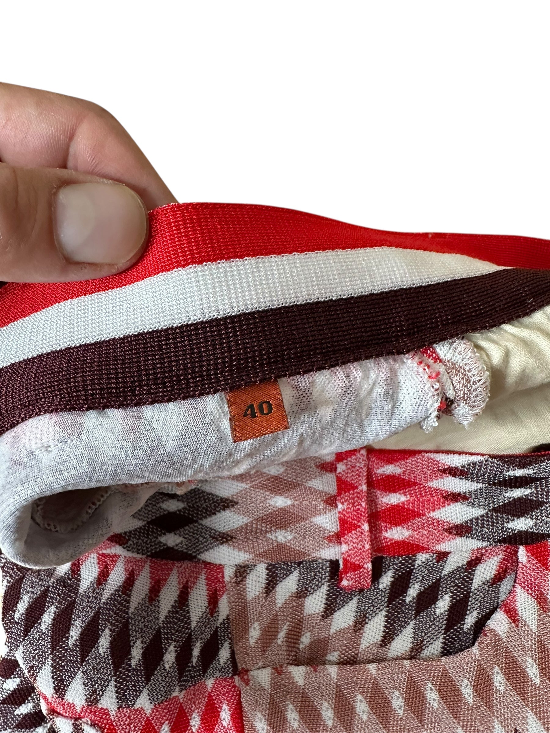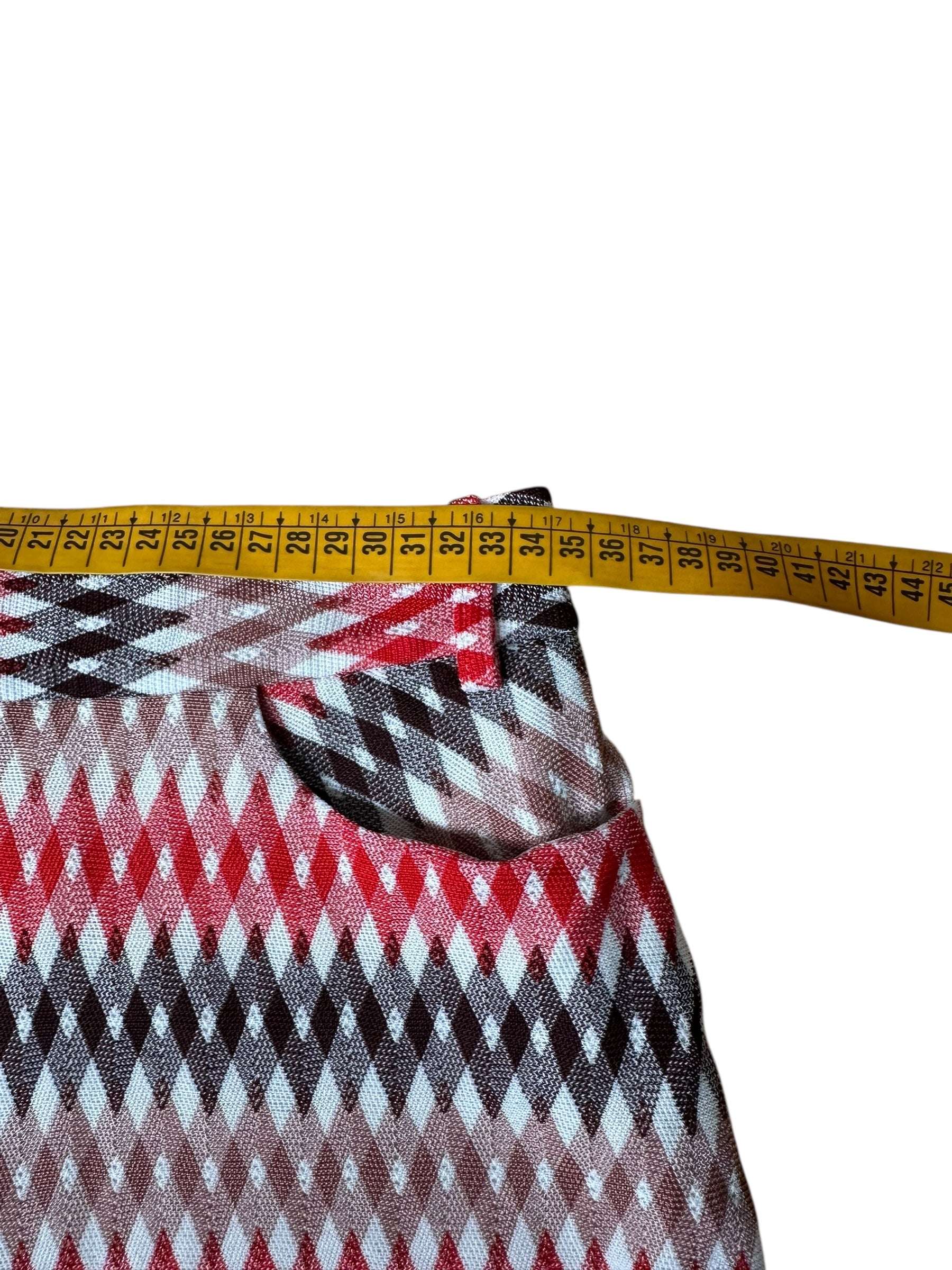 Shorts vintage a vita alta firmati Missoni, realizzati in un tessuto lavorato a maglia leggera e flessibile, con caratteristica fantasia a rombi nei toni del rosso, nero, beige e bianco. Il modello presenta due tasche anteriori applicate e passanti per cintura.