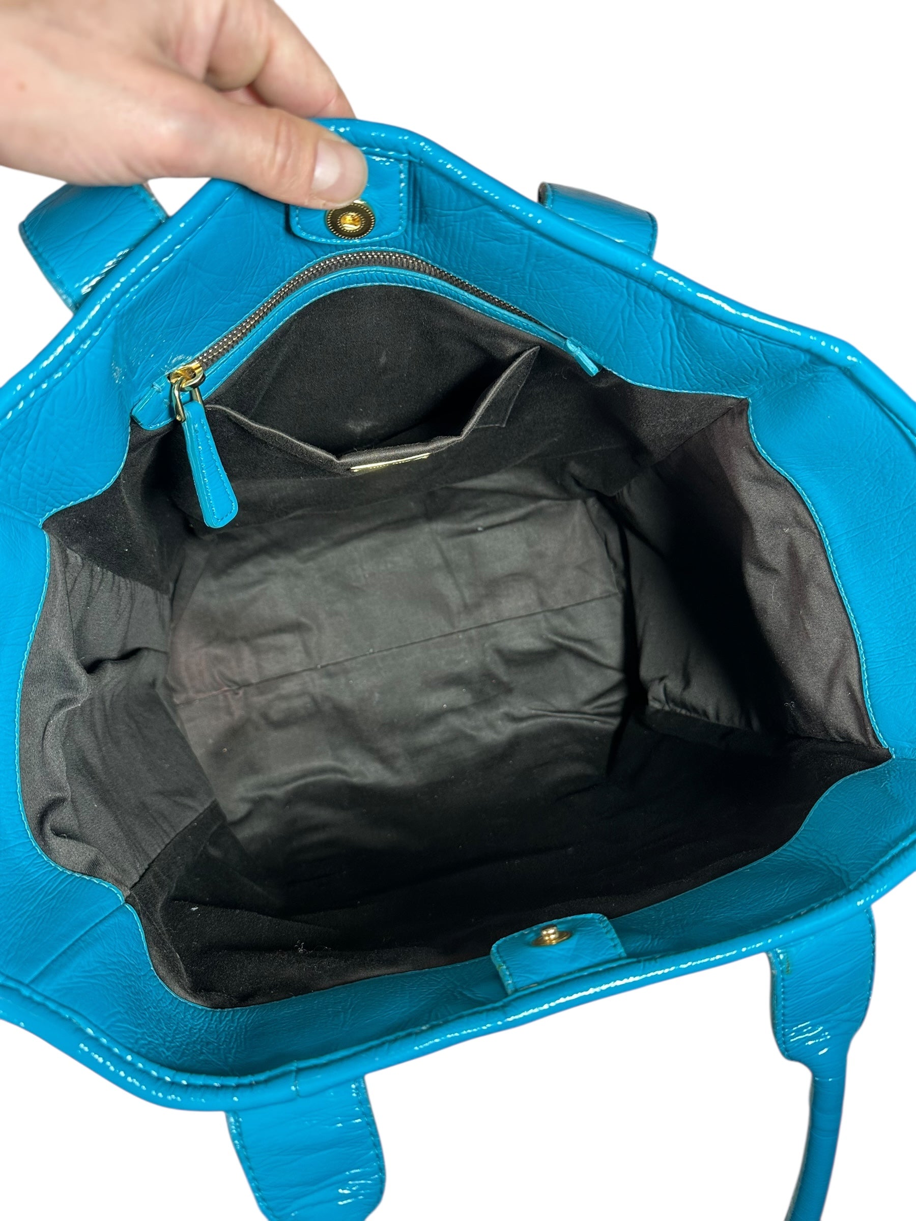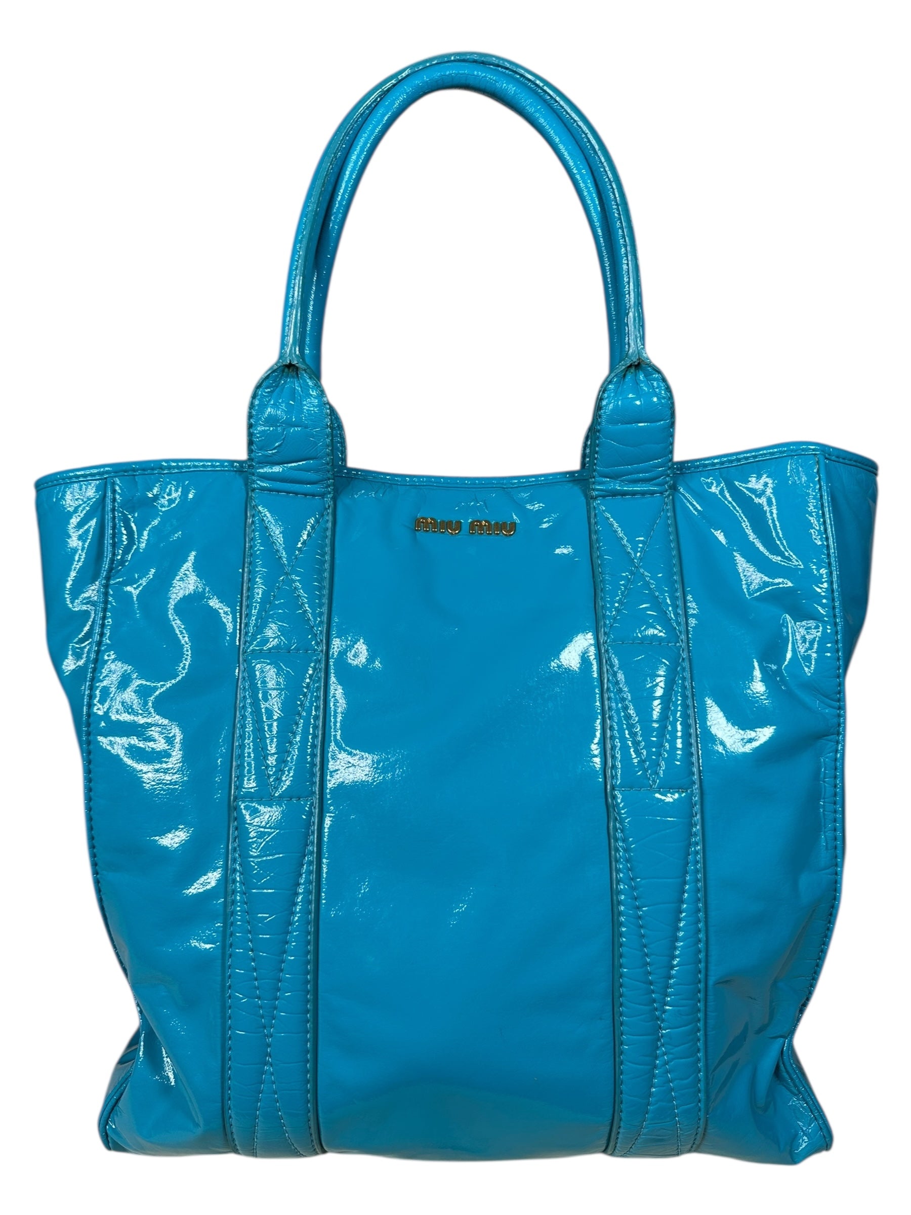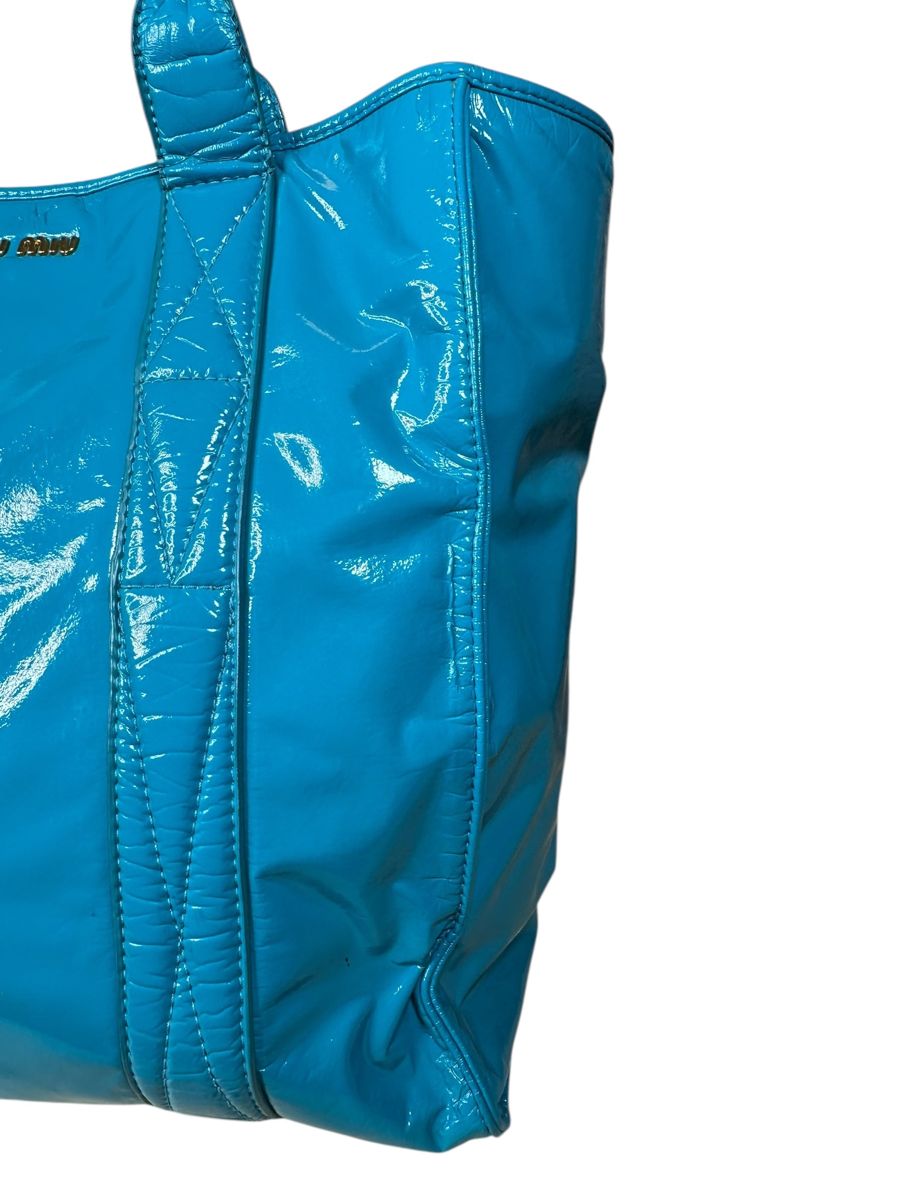 Borsa vintage Miu Miu in pelle verniciata azzurra, caratterizzata da una finitura lucida e da una struttura morbida ma ben definita. Modello shopper capiente, impreziosito dal logo Miu Miu in metallo dorato sul fronte e da manici doppi per una portabilità comoda a spalla o a mano.