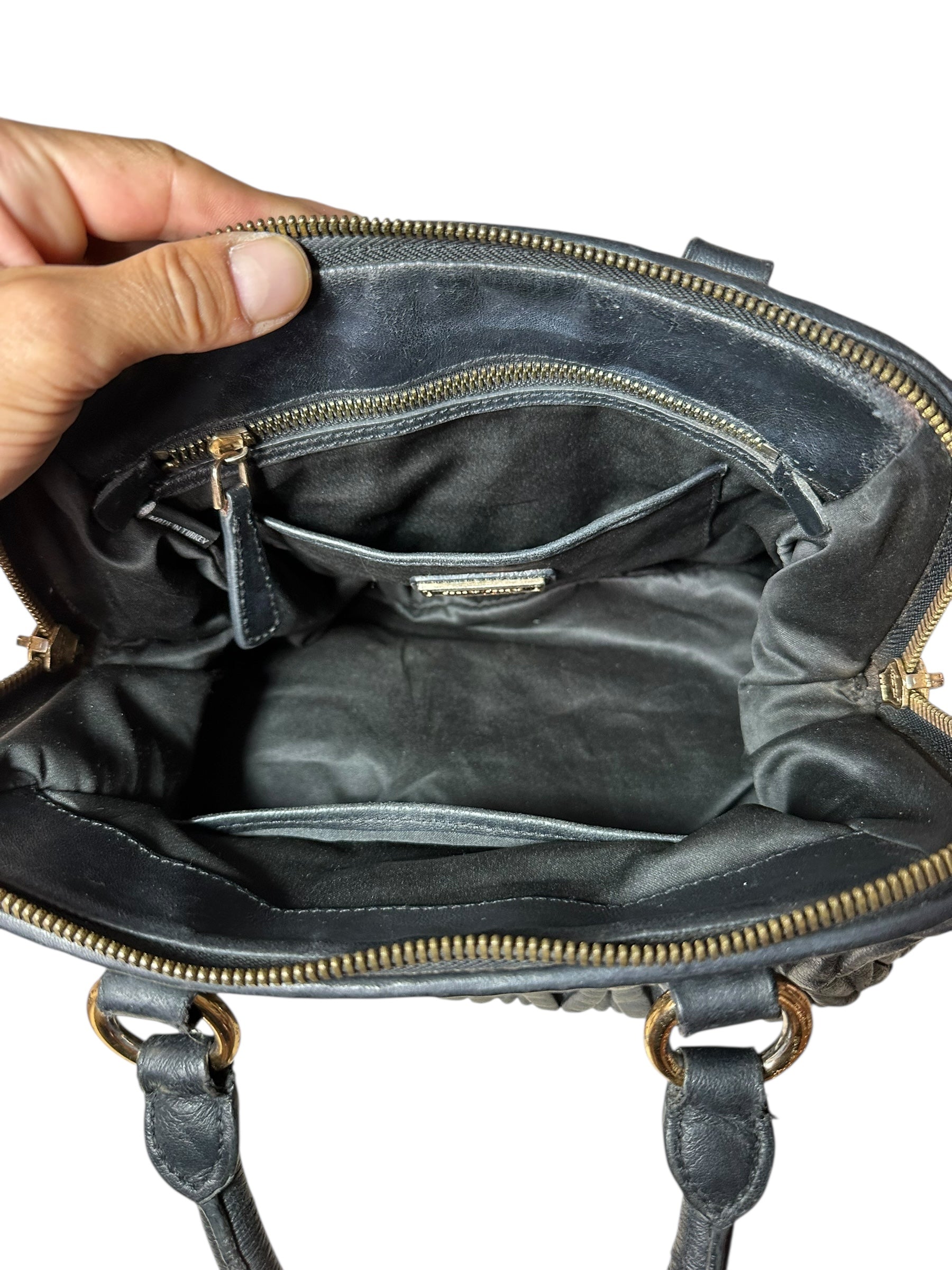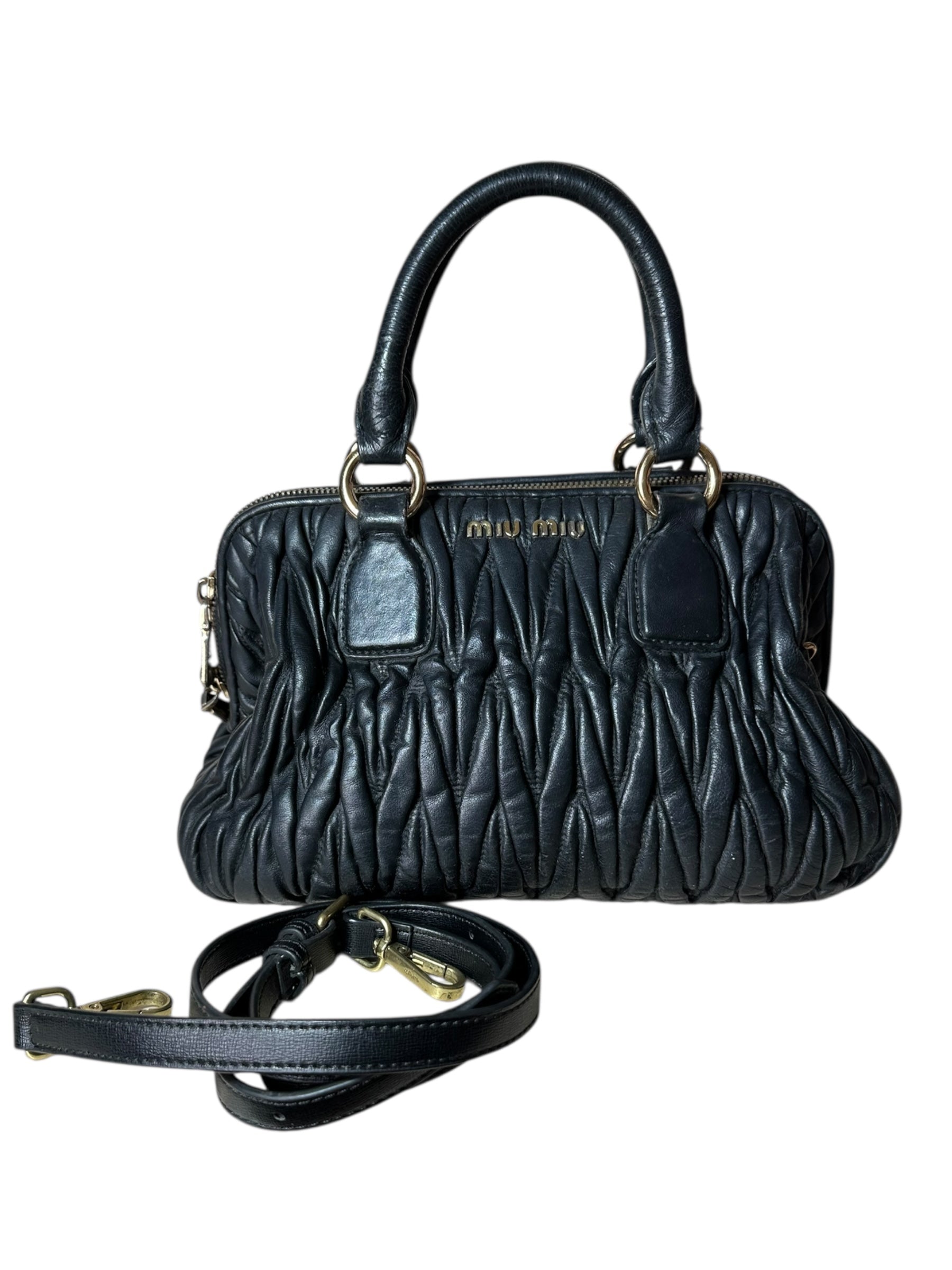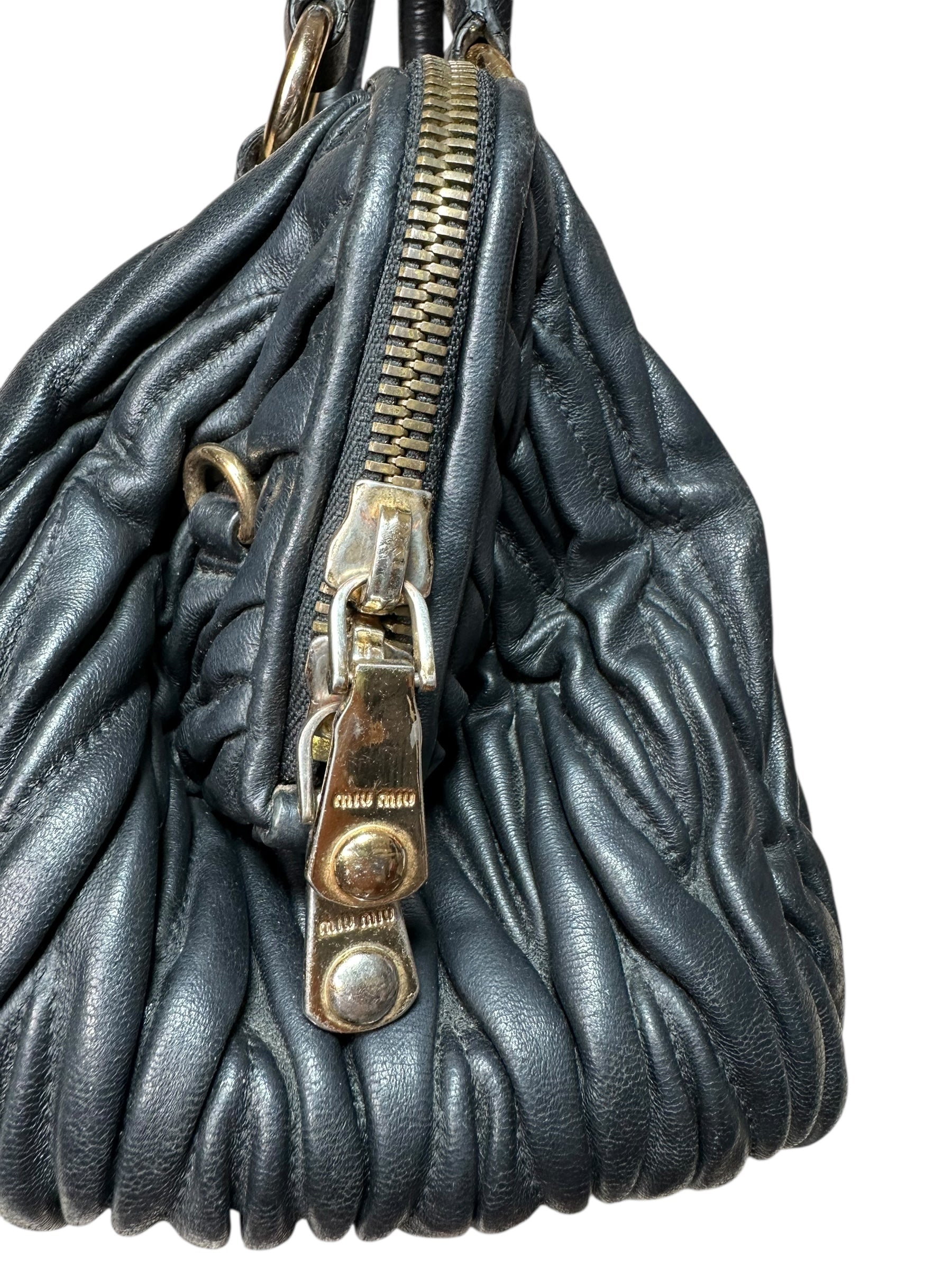 Elegante e strutturata, questa borsa Miu Miu in pelle nera matelassé unisce l’estetica iconica del brand a una forma compatta ma capiente. Dotata di manici rigidi e doppia zip con cursori, va segnalato che uno dei due cursori scorre ma non chiude la zip, mentre l’altro funziona perfettamente e consente la chiusura completa della borsa. È inclusa una tracolla in pelle nera (non originale), che permette di portarla anche a spalla.