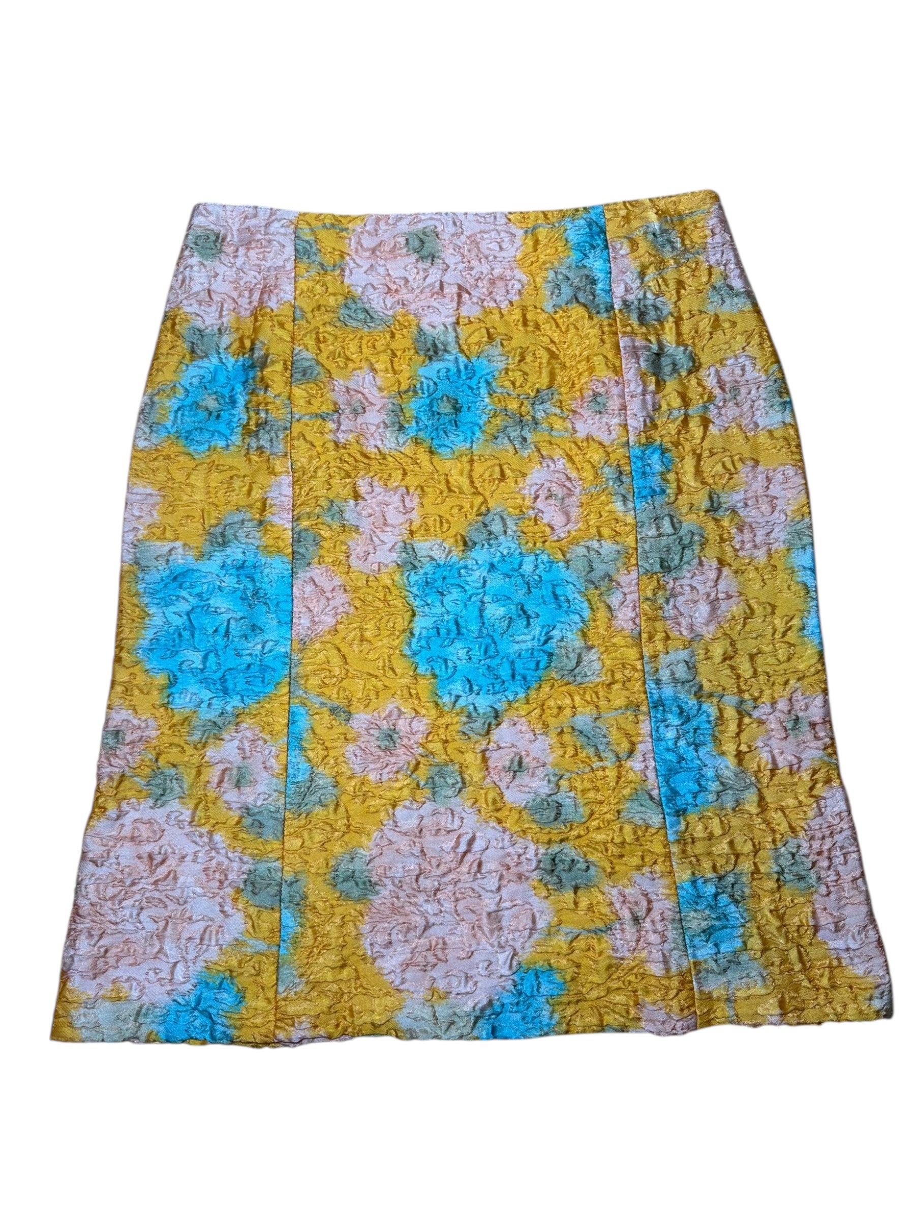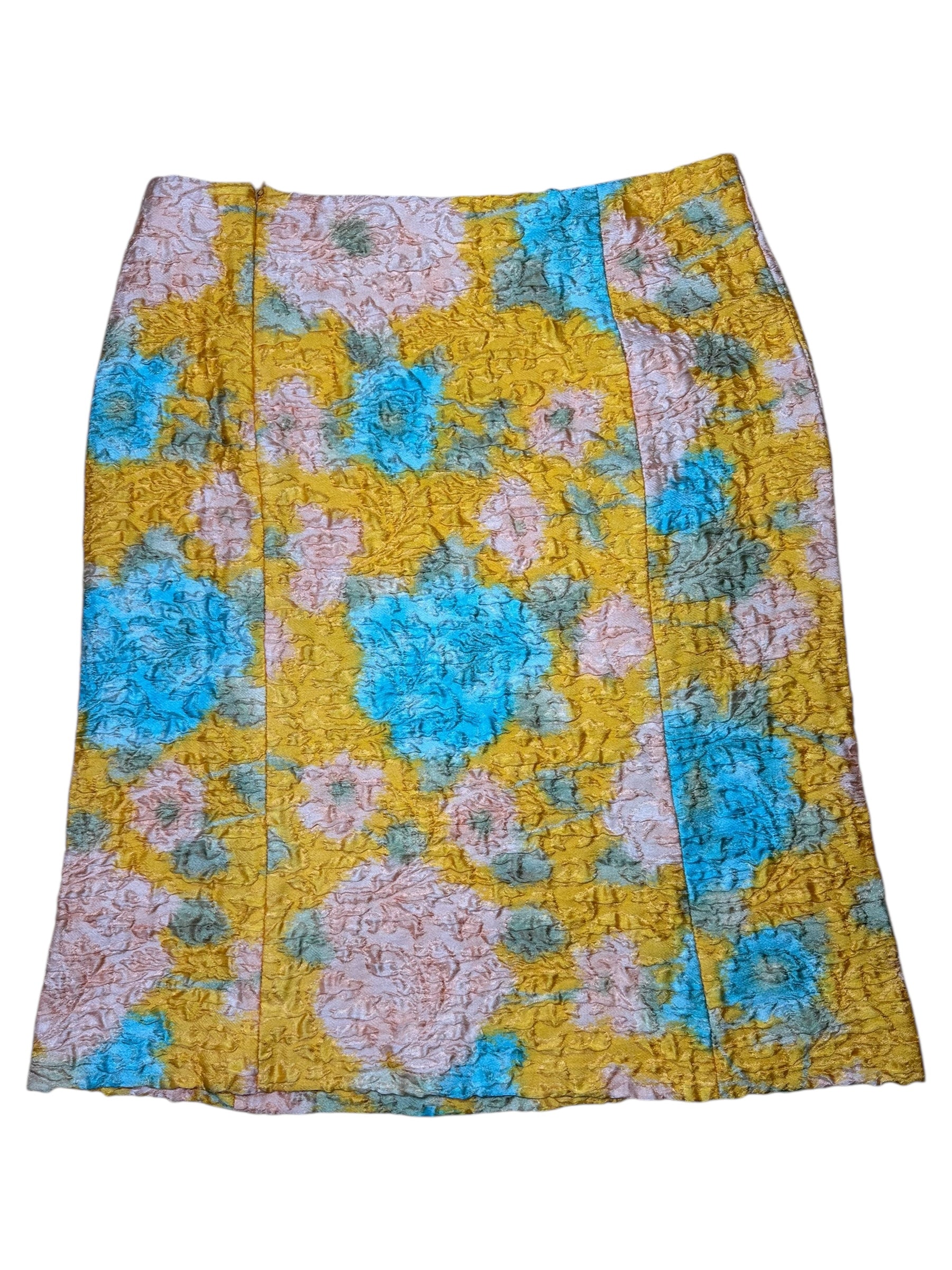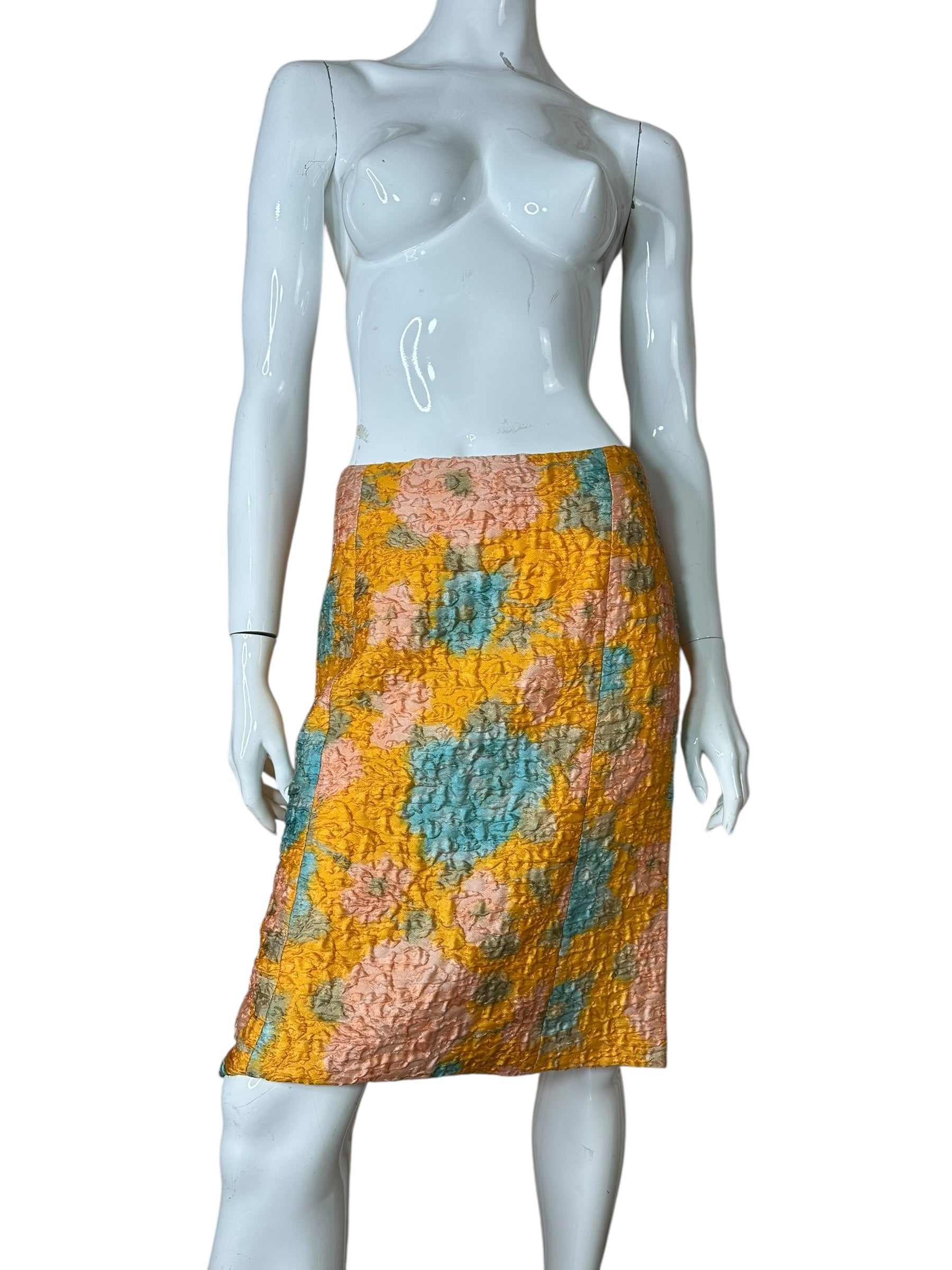 Gonna vintage Miu Miu dalla linea leggermente svasata, realizzata in un prezioso tessuto operato composto al 64% da seta e al 36% da nylon. La lavorazione tridimensionale crea un effetto stropicciato a rilievo che arricchisce la fantasia floreale nei toni pastello di giallo senape, azzurro, rosa cipria e verde salvia. Modello a vita alta con zip posteriore nascosta e cuciture verticali che slanciano la silhouette. Non è foderata, ma la consistenza del tessuto garantisce una buona coprenza.